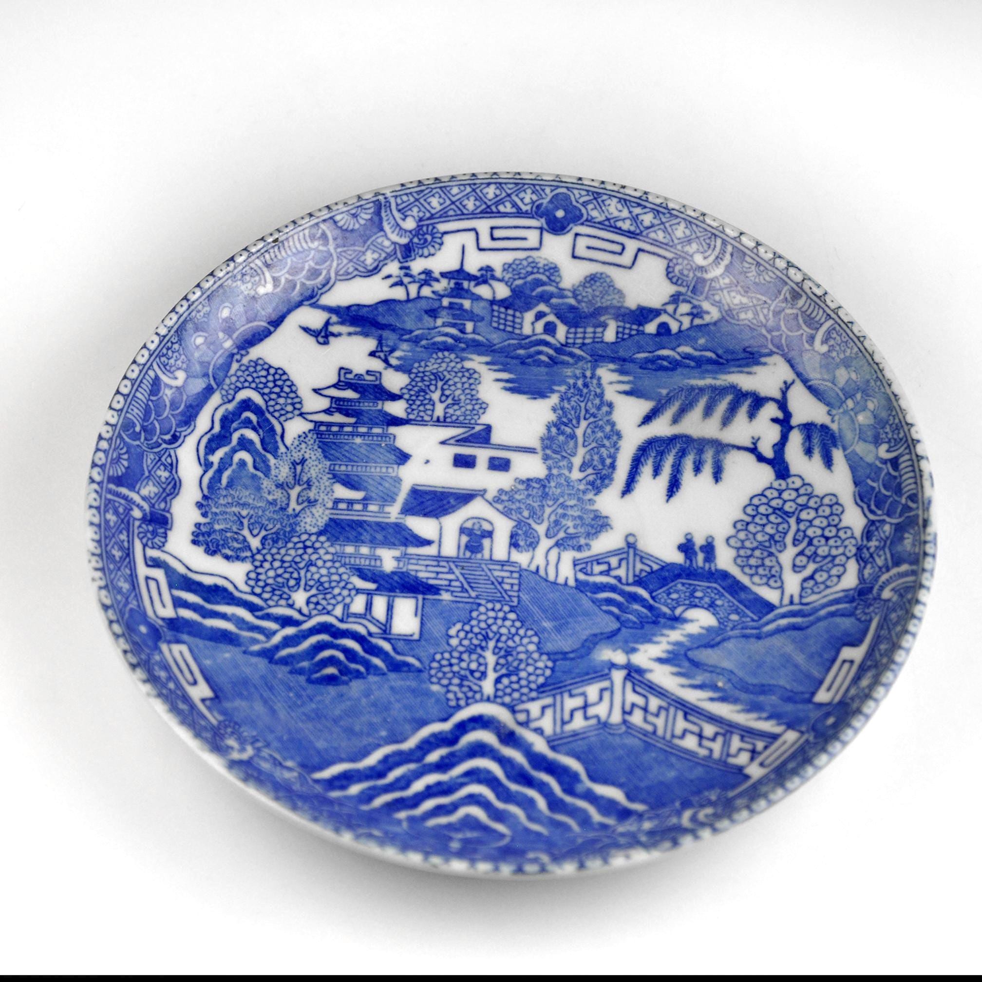 This little plate has that familiar blue-and-white look we all recognize, but it tells its own story. Made in Japan, this is a Willow-style plate—not the strict, traditional Blue Willow pattern with the two birds and set storyline. Instead, it’s a Japanese interpretation, with extra buildings, a different bridge placement, and a more scenic feel. Pieces like this were made for everyday homes, meant to be used and enjoyed, not just admired from a shelf.