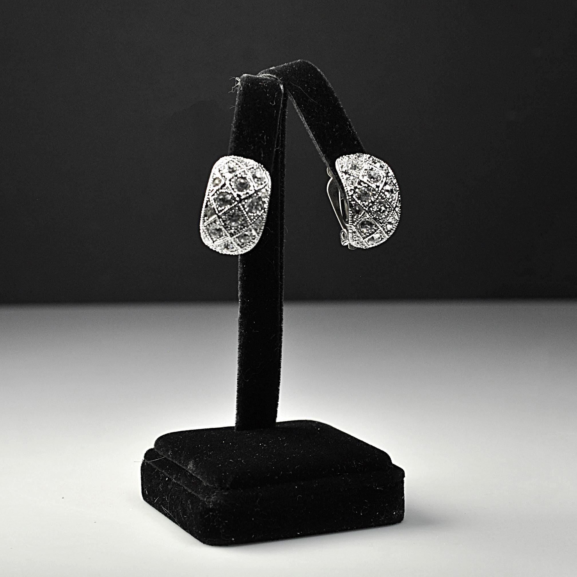 There’s something about old rhinestones that modern ones never quite get right — the way they catch the light, softer but deeper, like candlelight instead of a spotlight. These vintage clip-on earrings have that kind of shine. They’re domed and generously set with clear rhinestones arranged in a diamond lattice pattern, all nestled into a silver-tone setting with lovely texture and detail. Every stone is present, bright, and secure. No dullness, no clouding — just good, honest sparkle. They’re clip-ons, made back when comfort mattered. The clips work exactly as they should and still have their original rubber ear guards attached, which is something you don’t often see anymore. They sit well on the ear without pinching. Unmarked, as many quality vintage pieces are, but well-made and substantial in the hand — not flimsy, not lightweight. These were meant to be worn and enjoyed, not tossed aside after a season. Perfect for dressing up a simple outfit, adding a little glamour for evening, or for anyone who loves vintage jewelry. A classic pair that feels just as right today as it did decades ago.