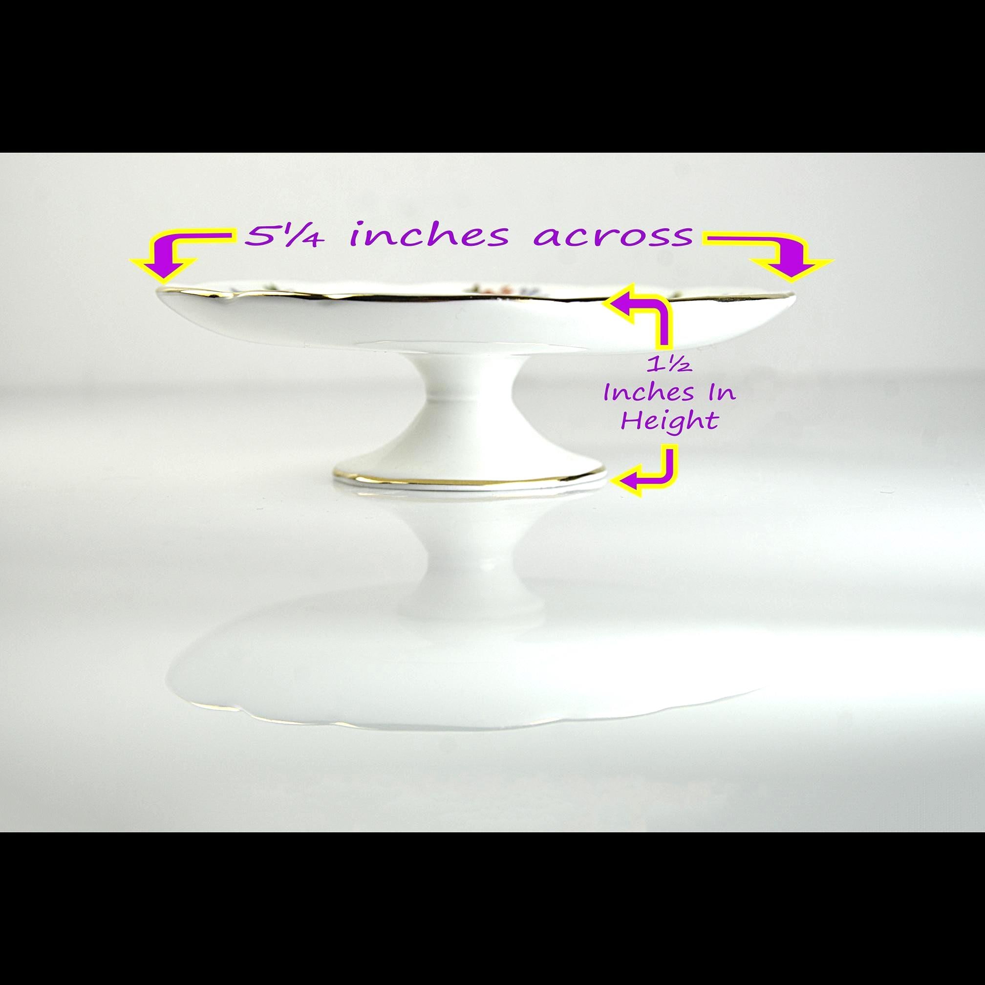 Made by Aynsley in England, this bone china pedestal dish is done in the Gaiety pattern, with scattered floral sprigs and soft gold trim along the rim and foot. It’s light in the hand, beautifully balanced, and just the right size for candies, mints, nuts, or a few wrapped chocolates on the table. This is the kind of dish that would have sat out for company—nothing fancy, just good taste. The bone china has that soft glow Aynsley does so well, and the gold trim hasn’t been rubbed down or worn away. A simple, useful piece that still feels special—perfect for a tea table, vanity, or a small gift for someone who appreciates classic English china.