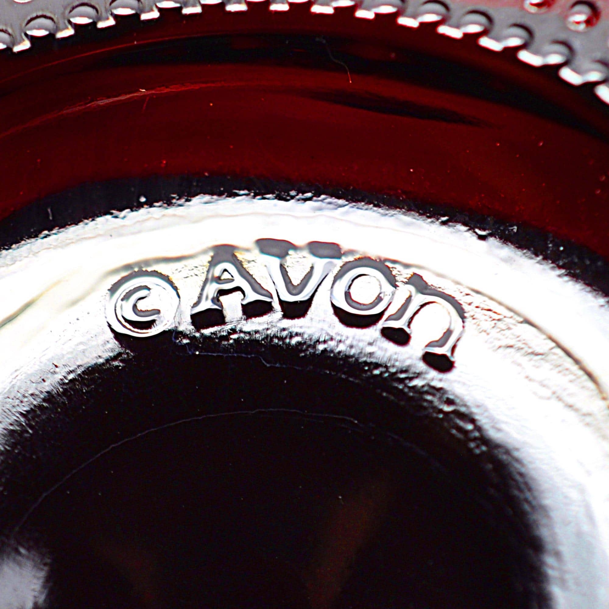 There’s just something about Avon’s old ruby glass that feels like it should live in a sideboard next to the good linens. This little footed tumbler is from Avon’s 1876 Cape Cod line—the pattern with all the diamonds, loops, and that deep red that glows like garnet when the light hits it. They sold these as tumblers back in the late ‘70s and ‘80s, but folks use them for just about anything now… as a sugar bowl on the breakfast table, votive candles at Christmas, or corralling teaspoons and more. Whether you’re replacing one from a set, starting fresh, or just like a bit of old-fashioned red glass on the shelf, this one will suit you fine.