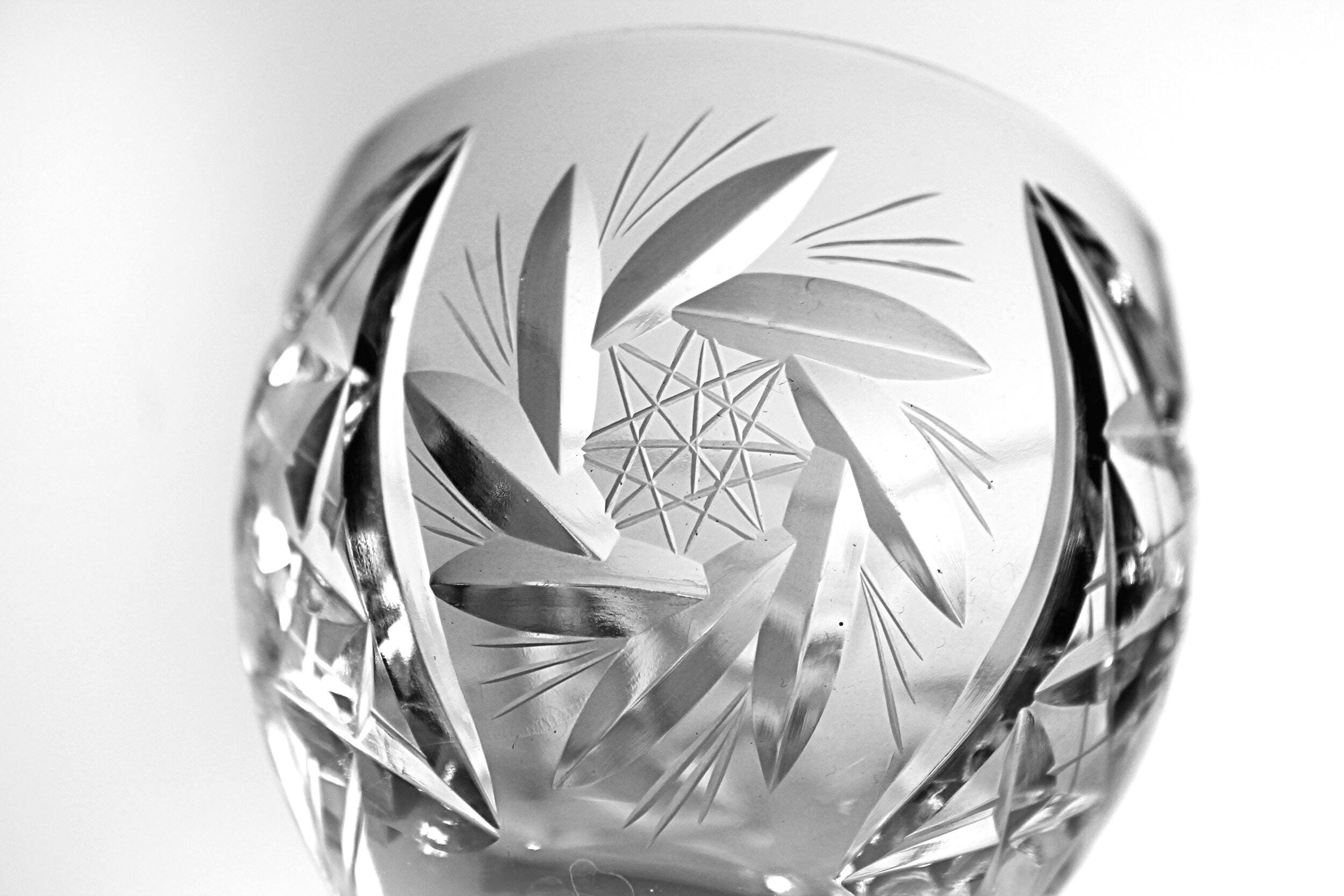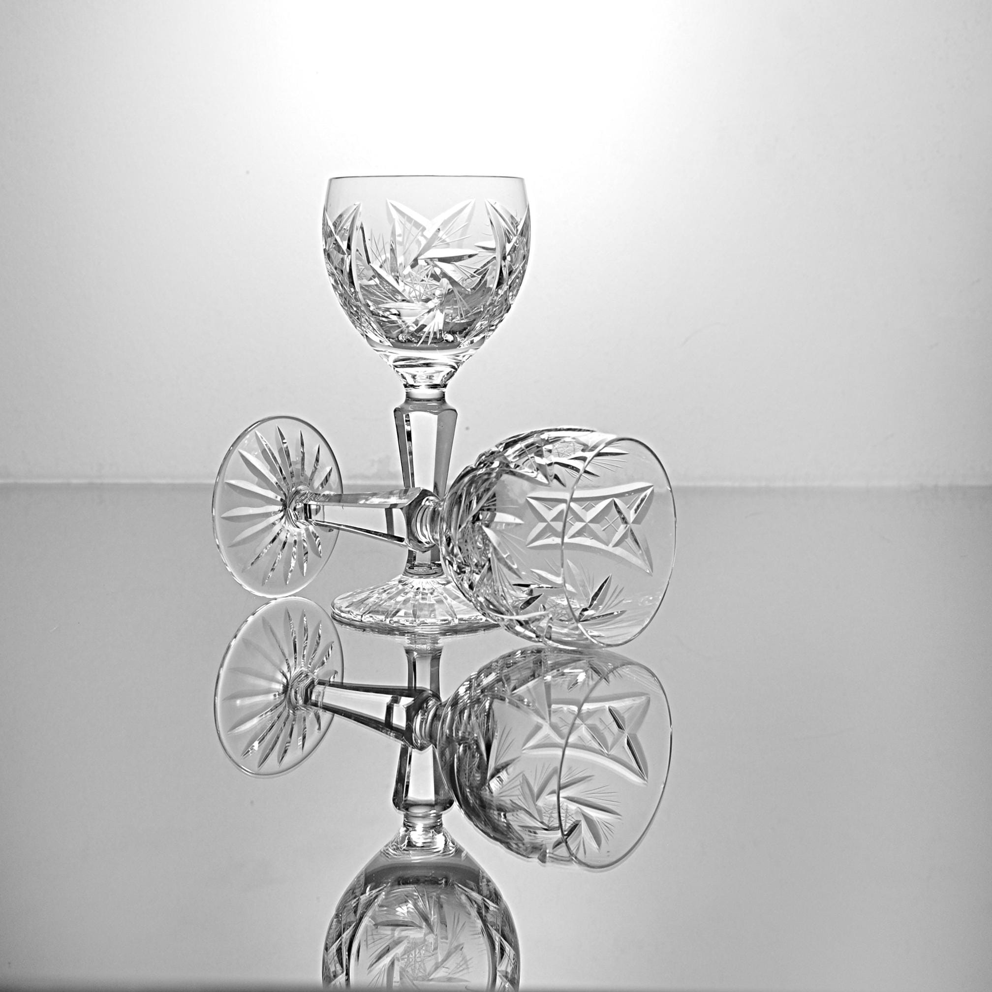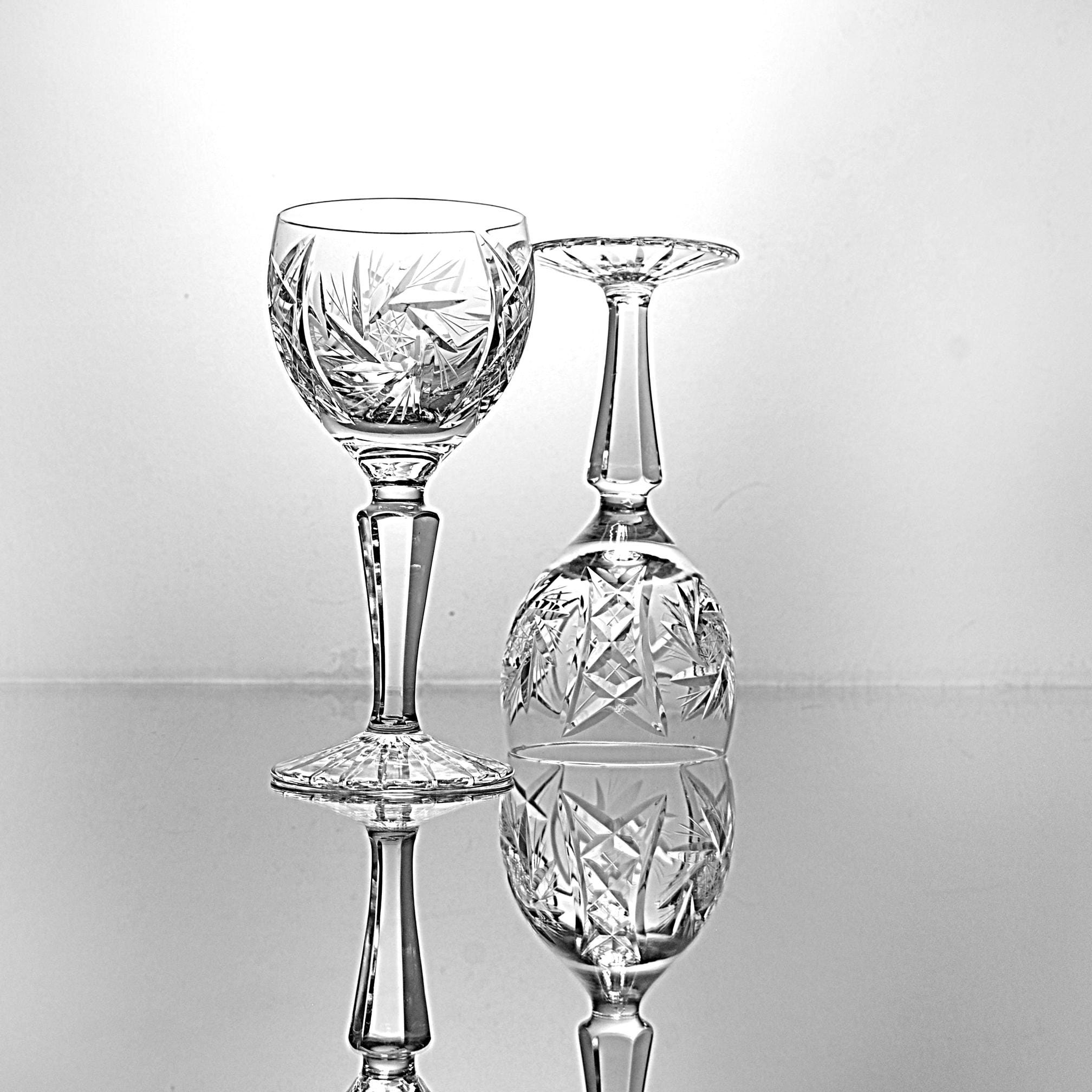 Around here, a good wine glass has some weight to it and catches the light without trying. This pair from American Cut does exactly that. They’re from the Juliette pattern—deep cuts, starburst detail, and that clean American crystal look that dressed a lot of dinner tables back then. These are the smaller wine size which makes them handy for dessert wines or just a modest pour. If you’ve got a set you’re trying to add to, or you just like well-made American crystal that doesn’t boss you around, these will do the job.