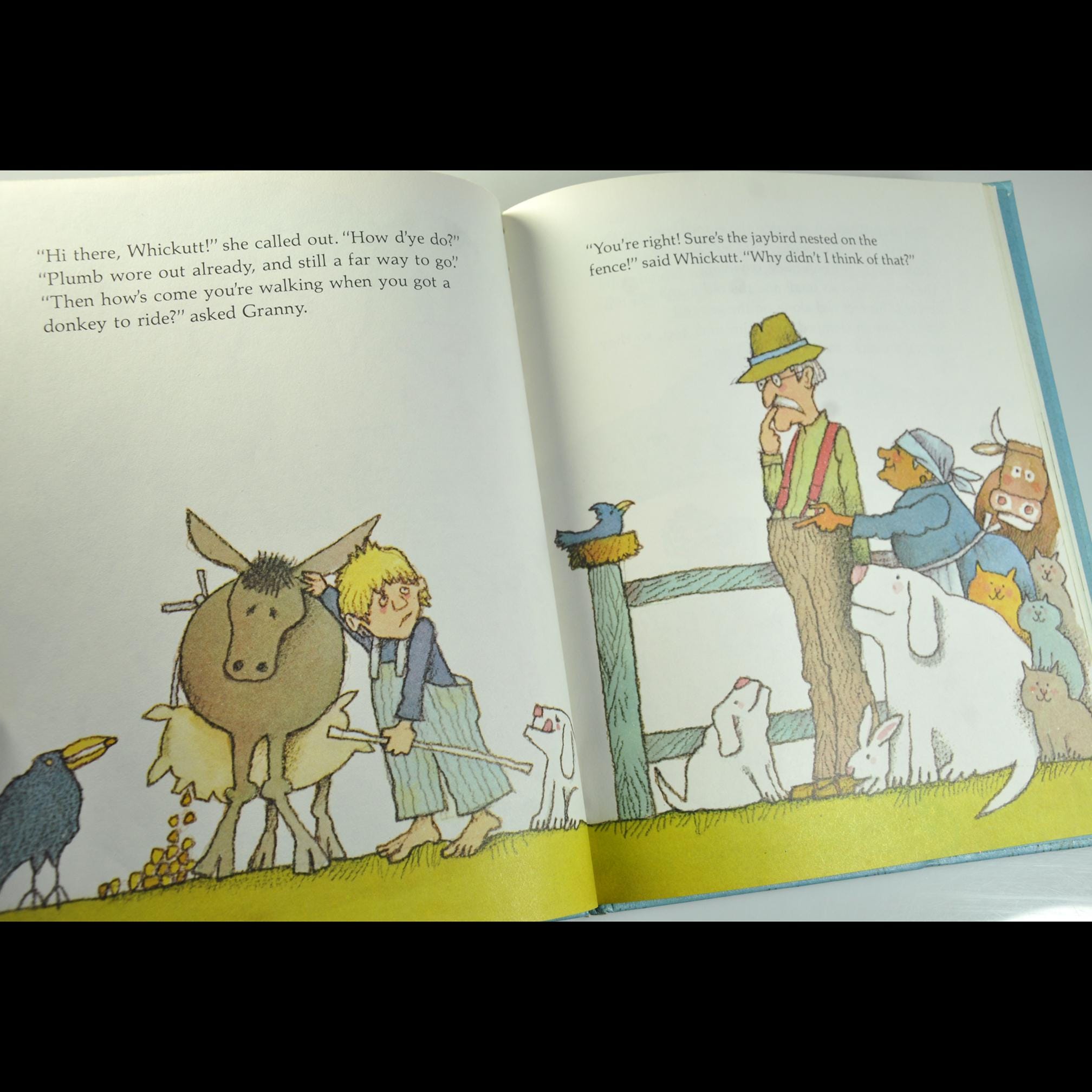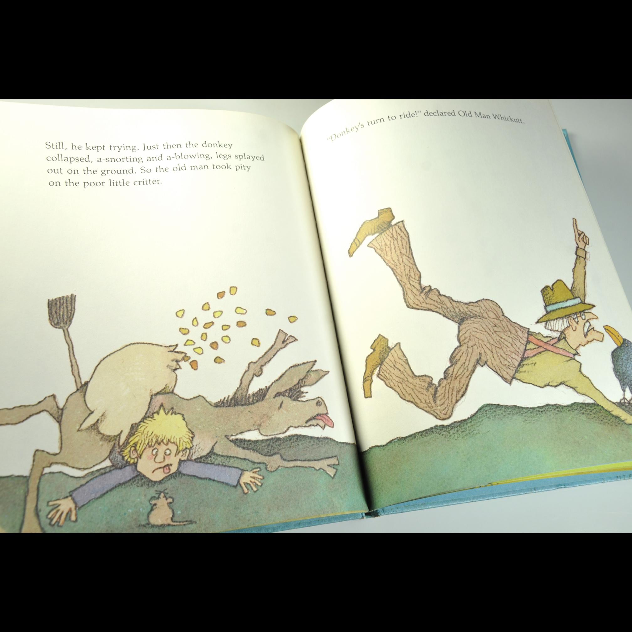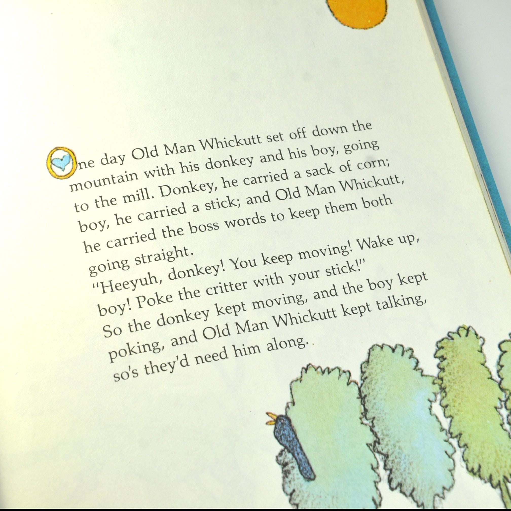 The story follows Old Man Whickutt, his donkey, and his grandson. The trio is headed down the mountain with a sack of corn. Along the way, everyone has ideas about how to do the job “properly,” and before long the donkey is the only sensible one in the whole outfit. It’s light, funny, and keeps that old rural common-sense tone without talking down to kids.
