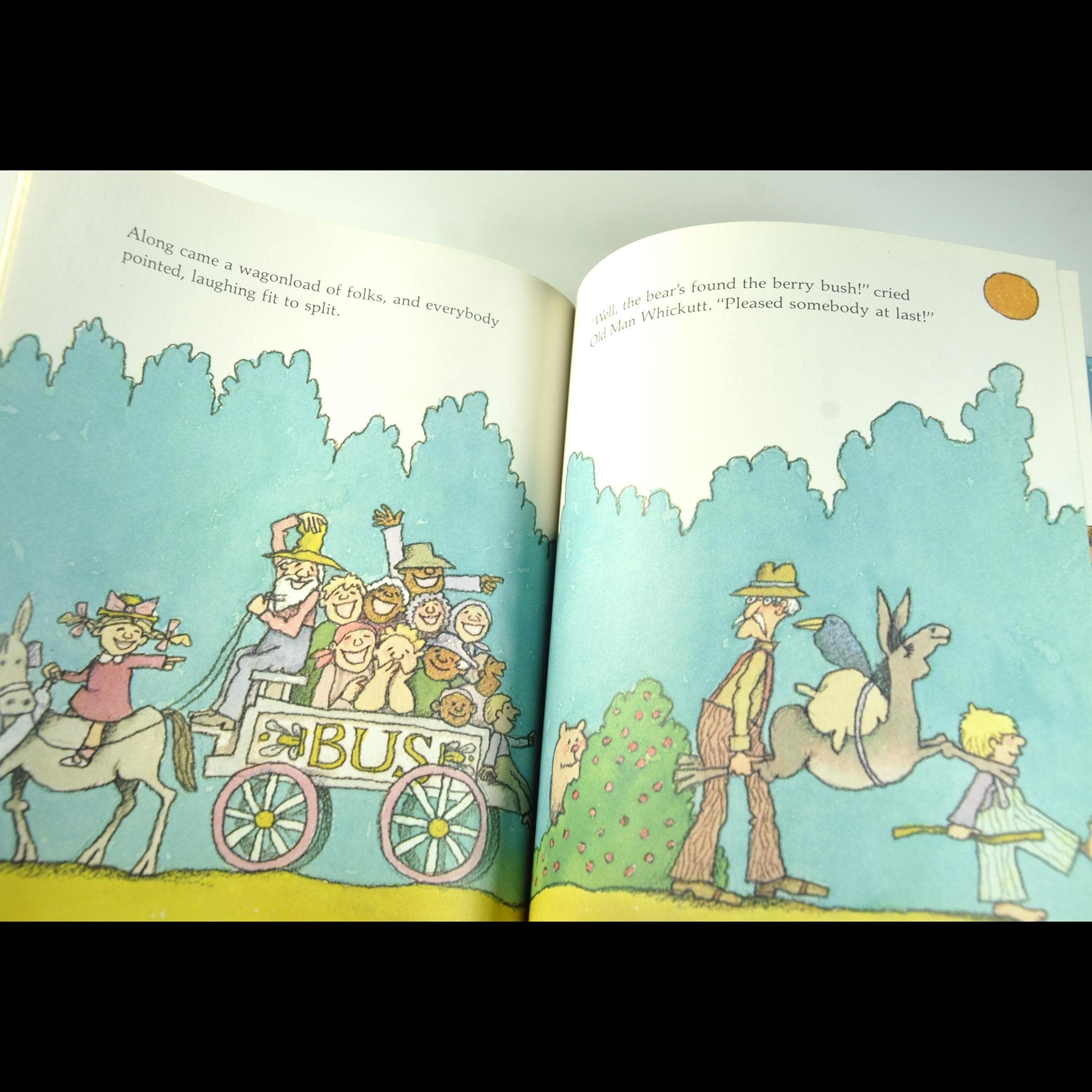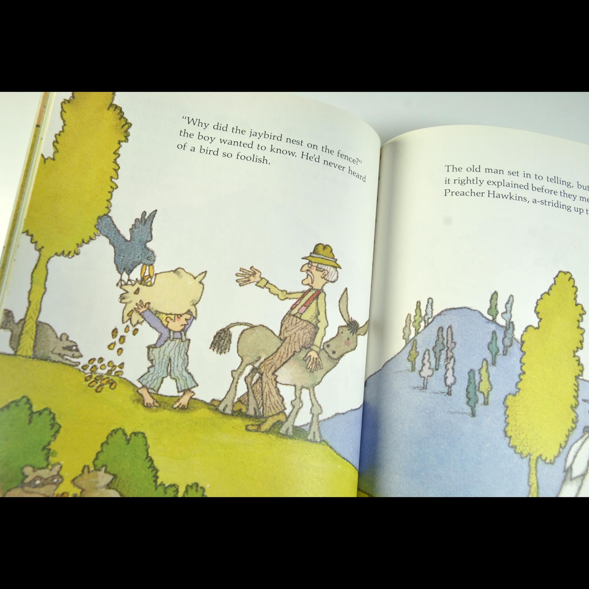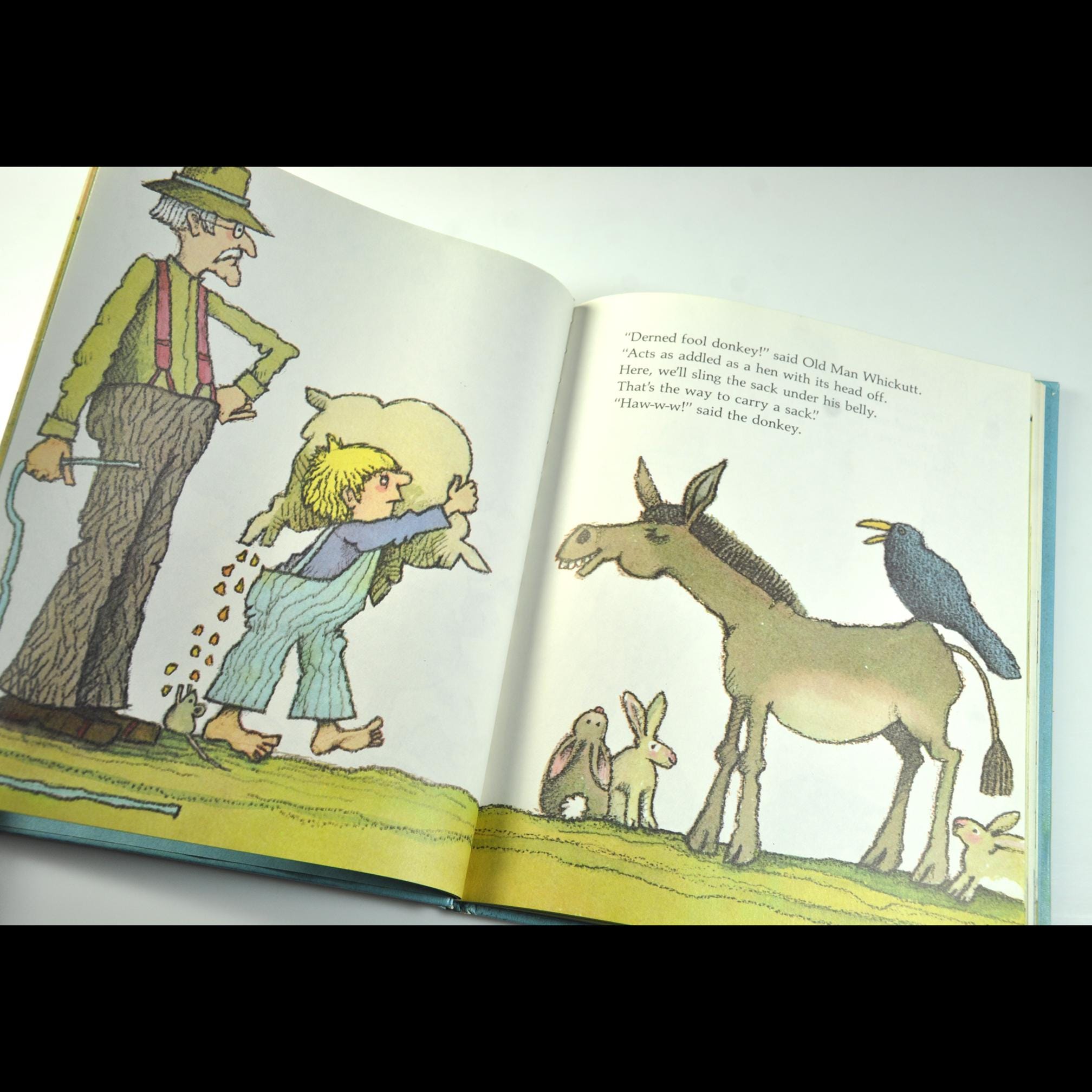 The story follows Old Man Whickutt, his donkey, and his grandson. The trio is headed down the mountain with a sack of corn. Along the way, everyone has ideas about how to do the job “properly,” and before long the donkey is the only sensible one in the whole outfit. It’s light, funny, and keeps that old rural common-sense tone without talking down to kids.