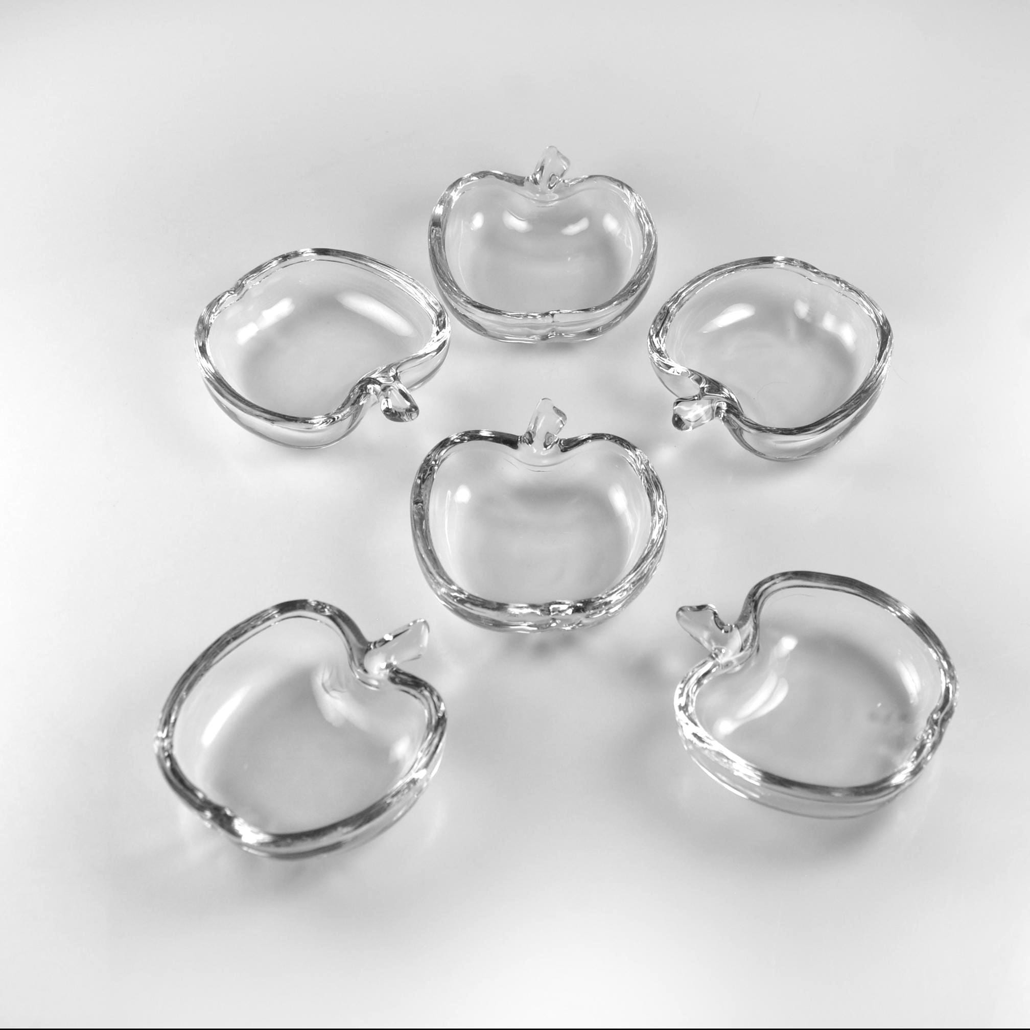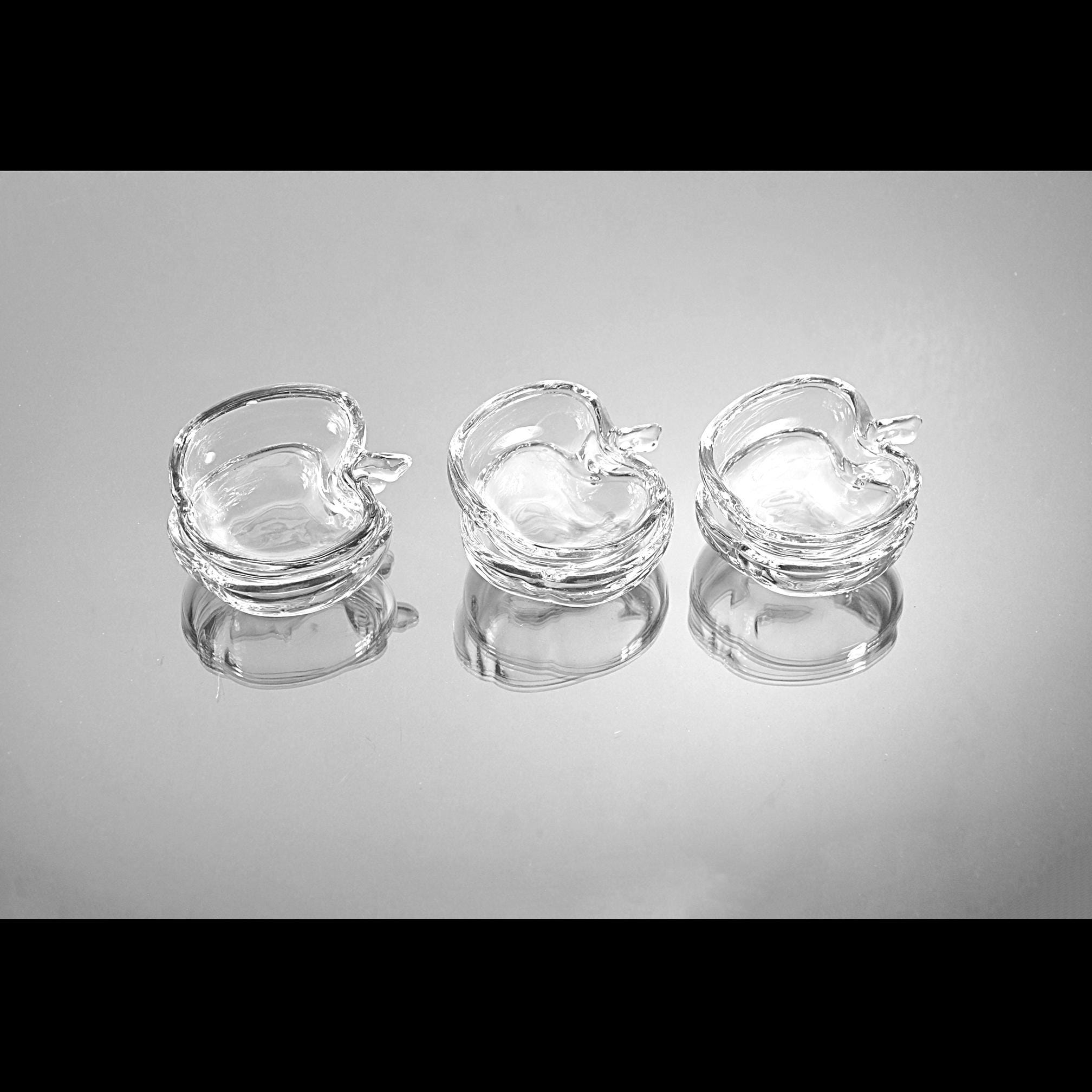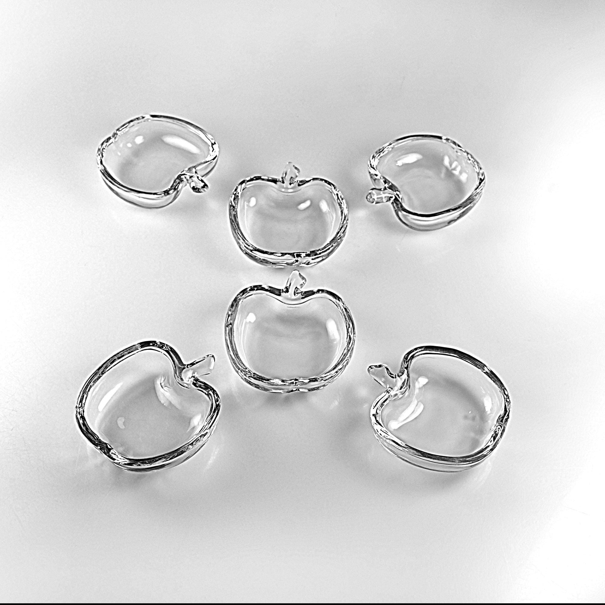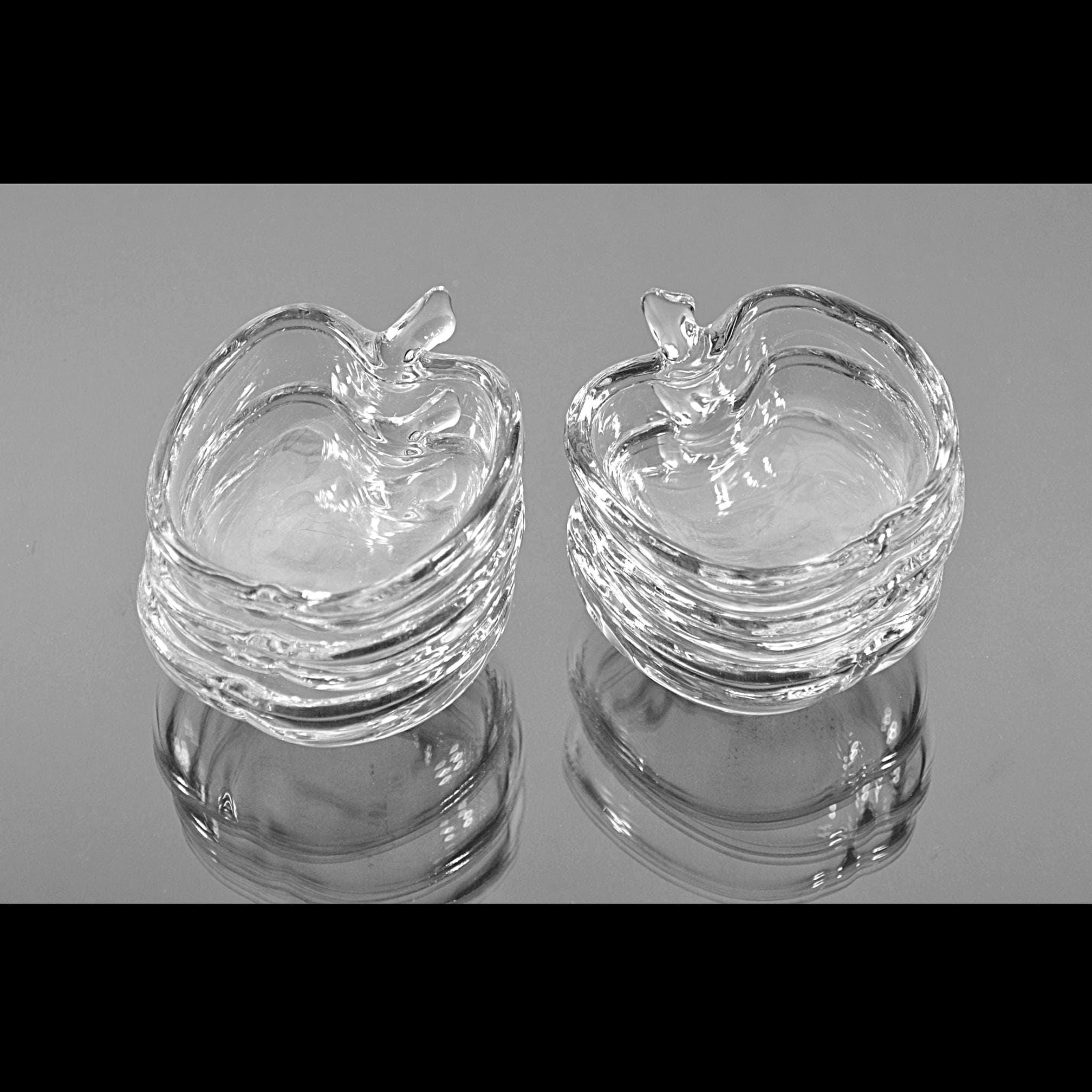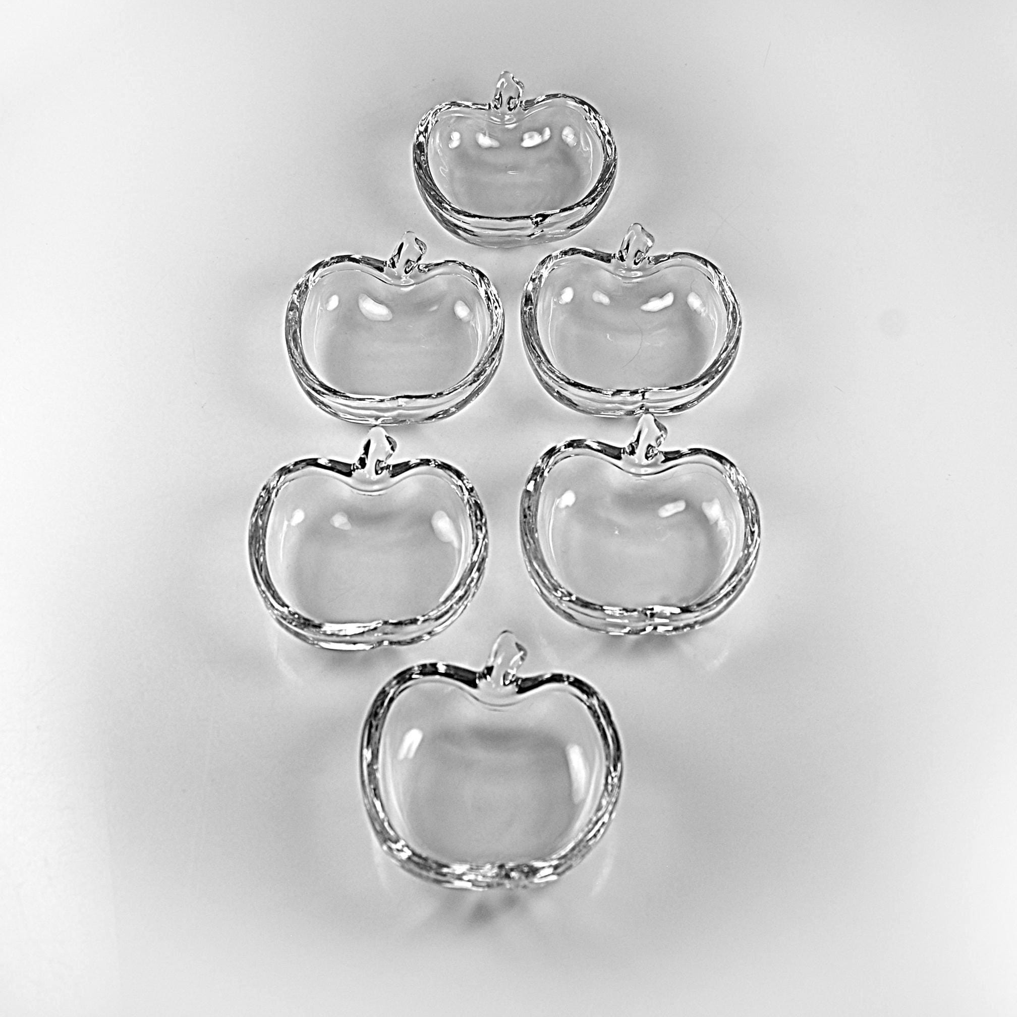 These are six little apple dishes of clear glass pressed into a familiar apple shape with a tiny cute glass stem on top. Folks used these pieces when home entertaining for nuts, mints, a teabag holder, etc., and with six of them, everyone would have one at their plate. They do a great job of holding tea bags after steeping or corralling the loose odds and ends that roll around a kitchen counter. I’ve also seen folks use them as prep bowls for spices when cooking or set one by the sink to drop rings in before doing dishes. Simple and useful. The glass is bright and clear, molded nicely with a bit of weight to them.