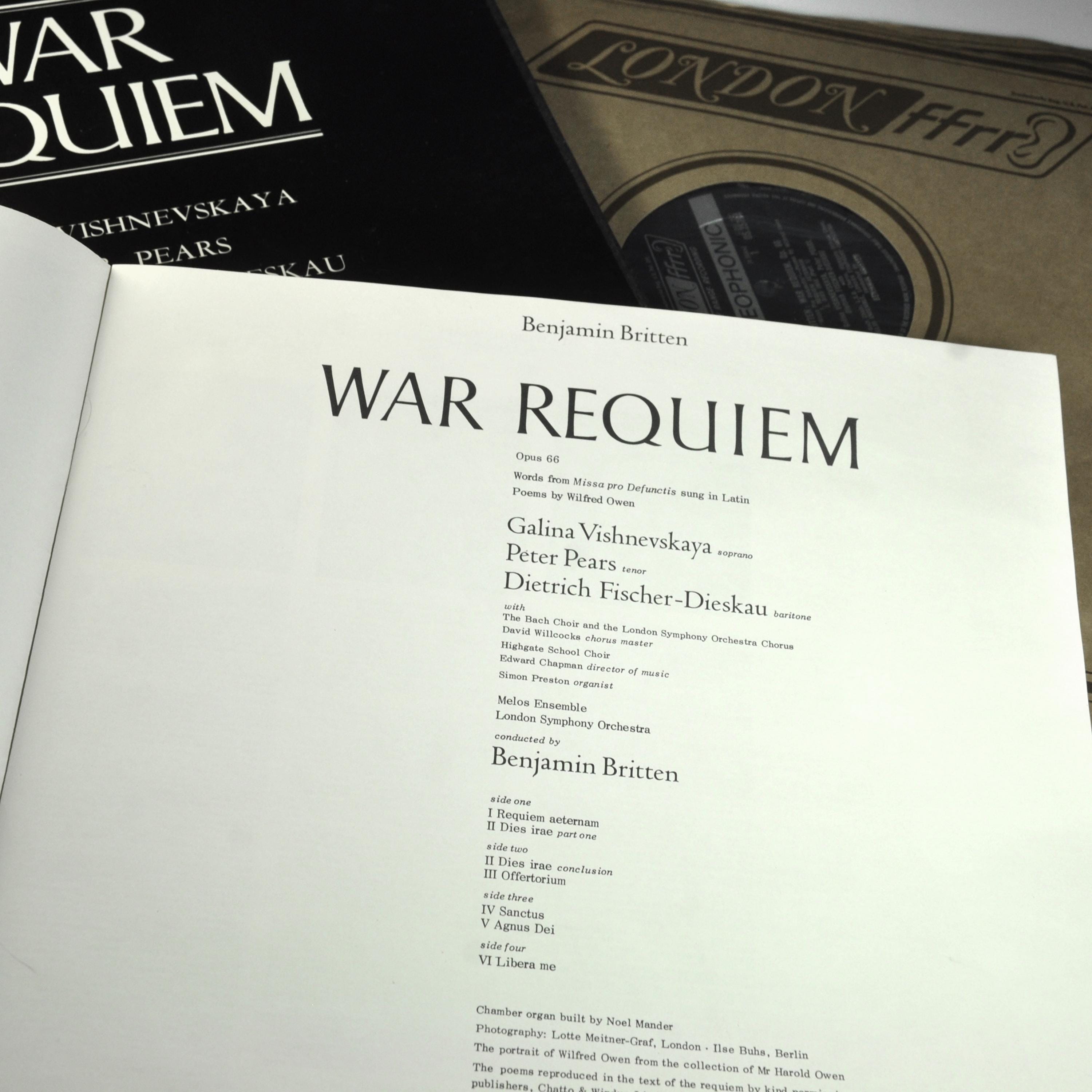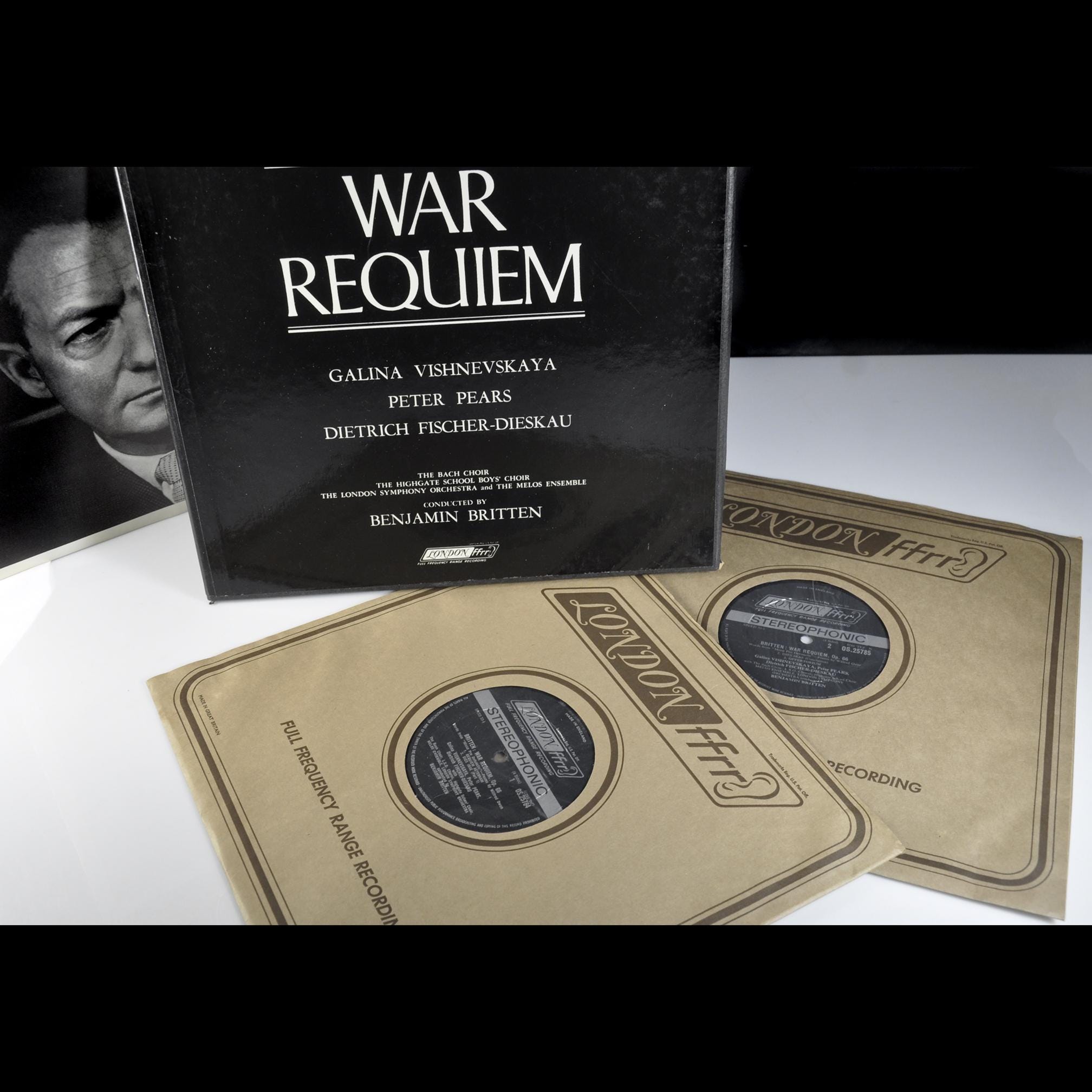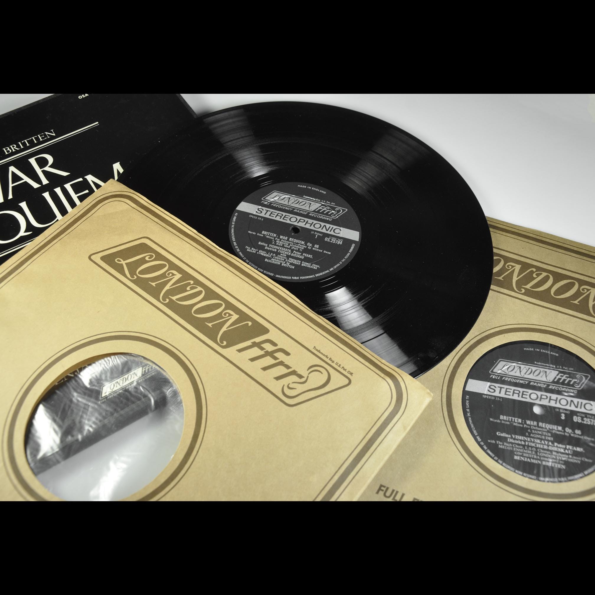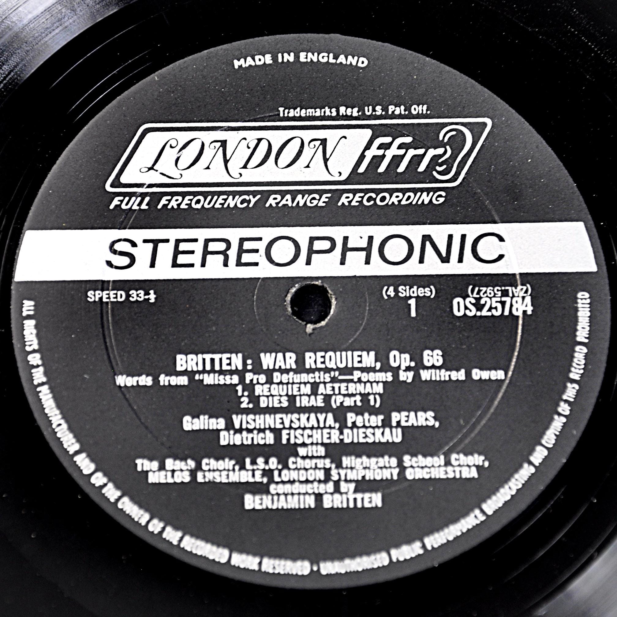 Everything about this one says mid-1970s UK pressing: “Made in England” on the labels, stereo designation, ffrr ear logo, and the proper Decca-style stereo matrix numbers (ZAL-5929-7E and ZAL-5930-4E). Vishnevskaya, Pears, and Fischer-Dieskau are all here, along with the London Symphony Orchestra, the Boys Choirs, and Britten conducting his own work.