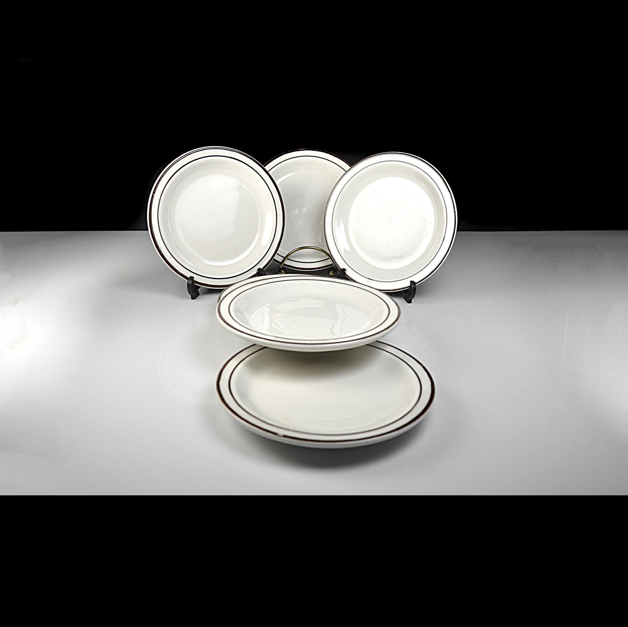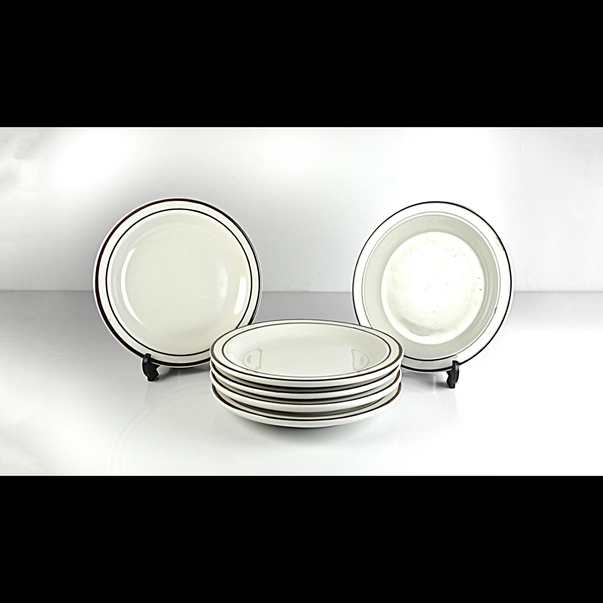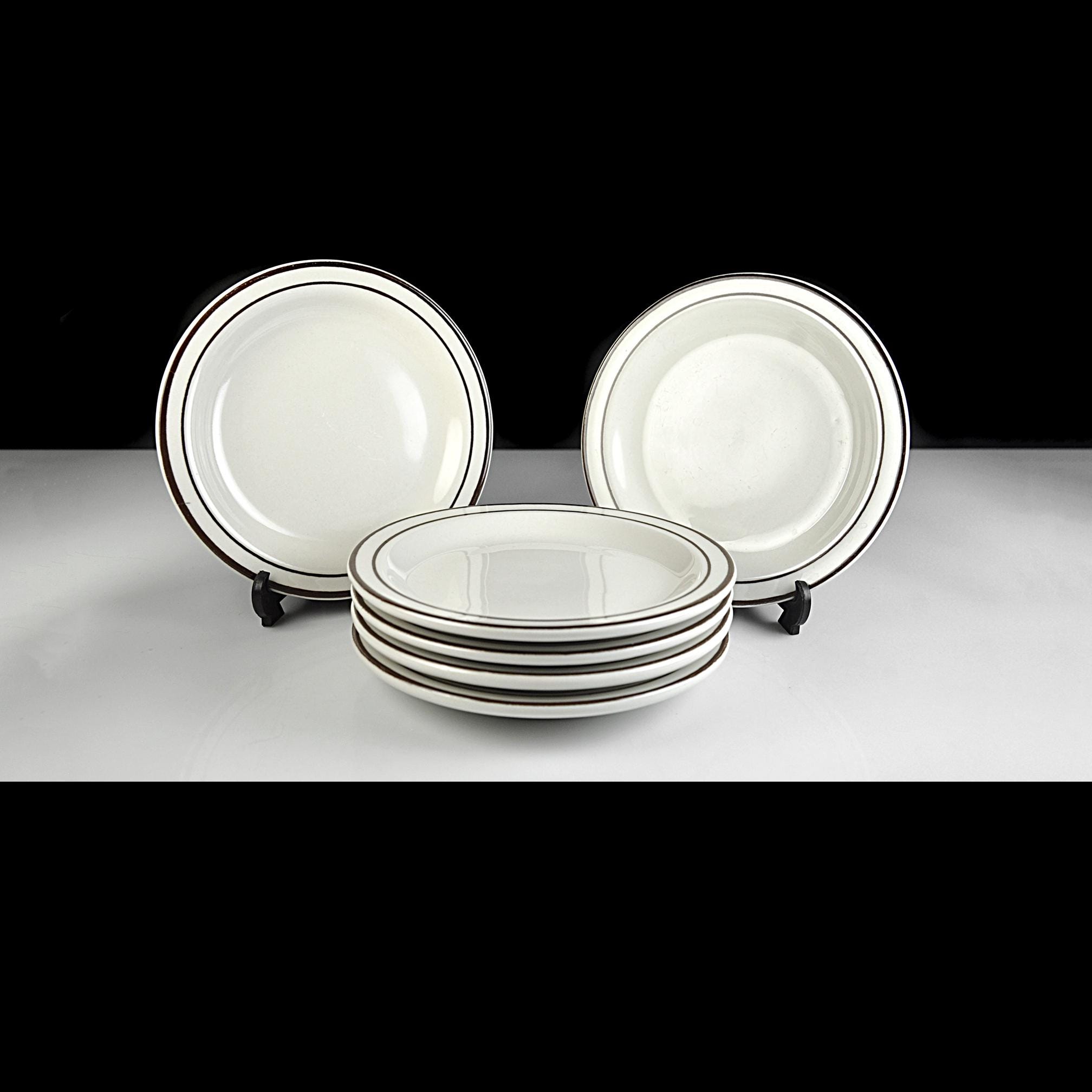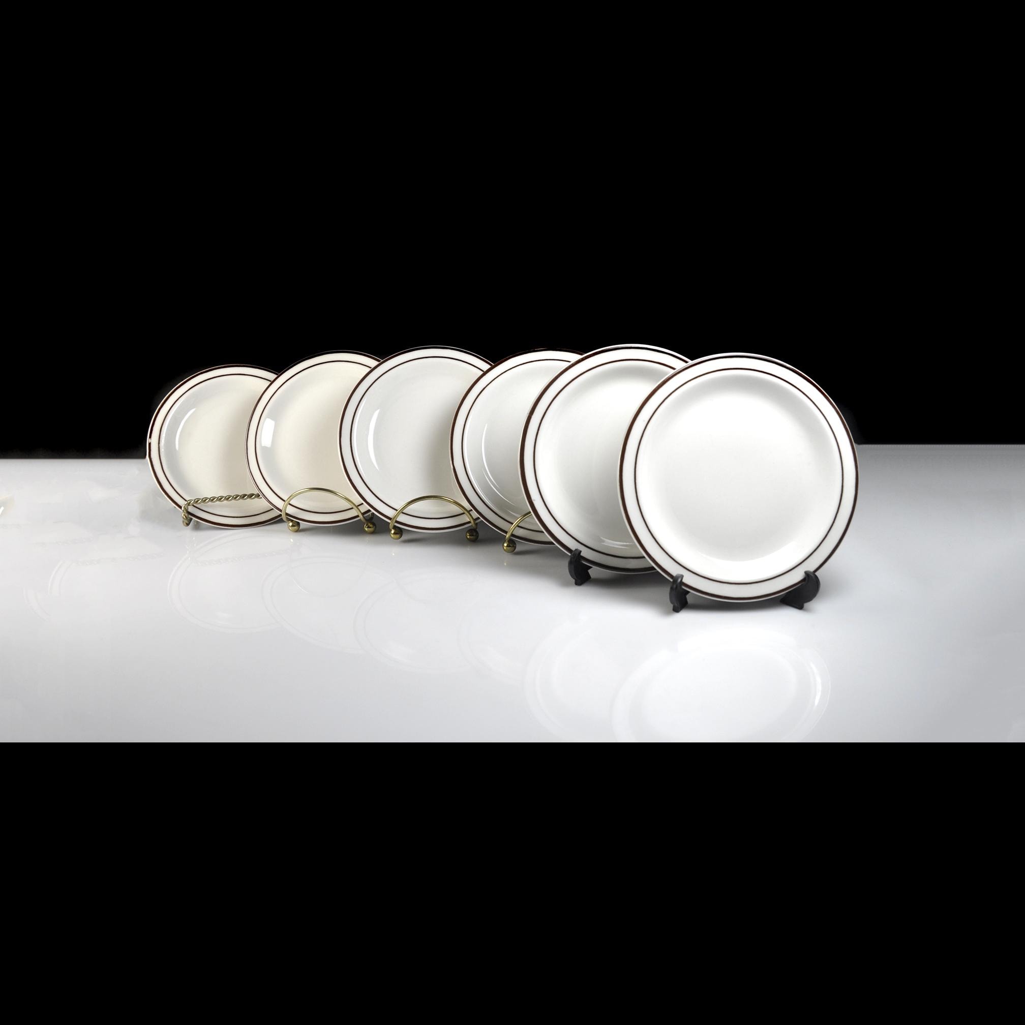 Restaurant china was made to work hard and stay good looking while doing it. This set of six bread and butter plates from Buffalo China fits that bill. They’re heavy in the hand, simple in design, and tough as nails—just like what you’d find stacked at a diner counter or coming off the line at a cafeteria. This is just straightforward American-made china ready for another long run, whether that’s on the supper table, holding biscuits at a holiday meal, or corralling odds and ends in the kitchen. Buffalo China turned out pieces like this from about the mid-century on, supplying restaurants, hotels, and institutions across the country. They are great because they don’t break easily and they look just as good on the table today as they did fifty years ago.
