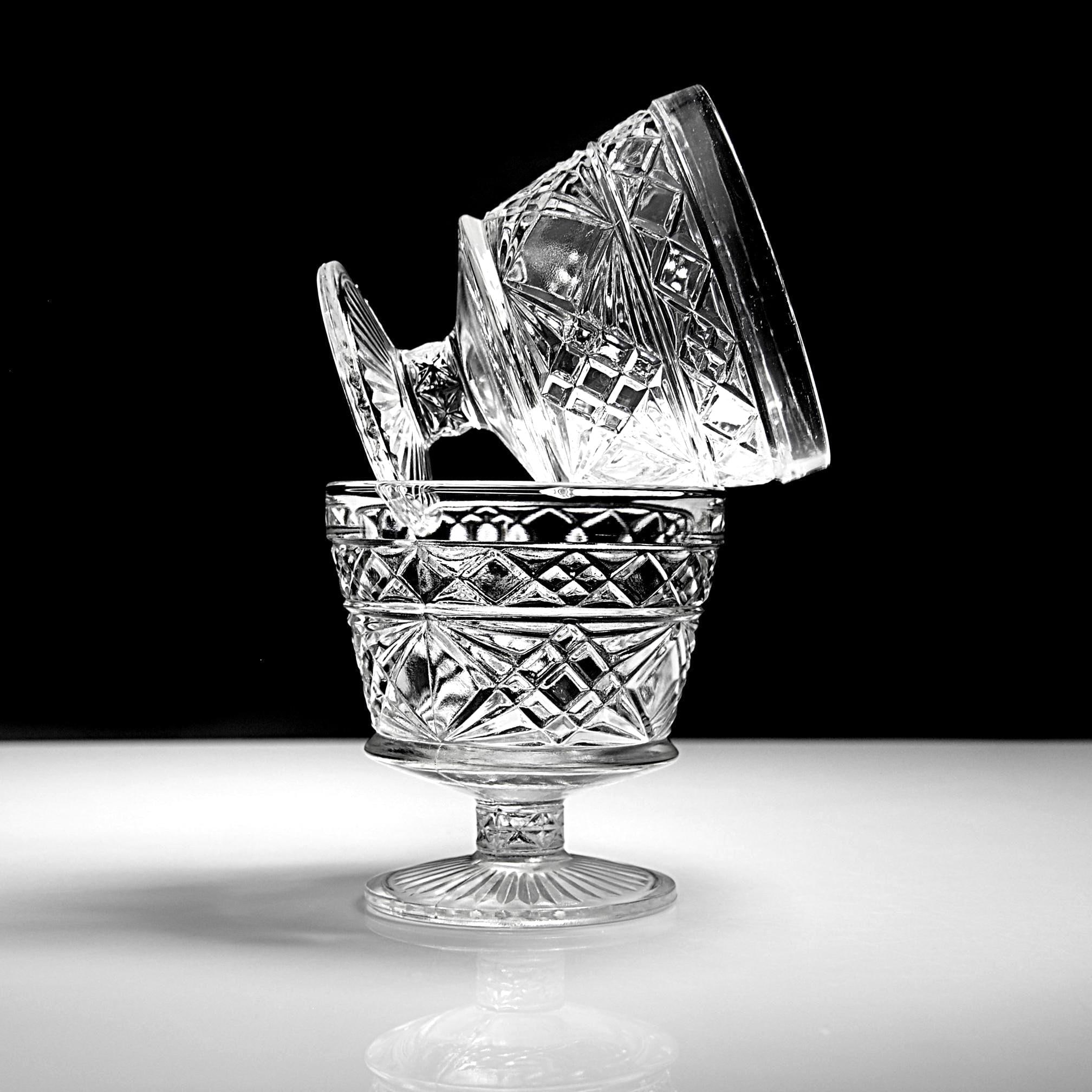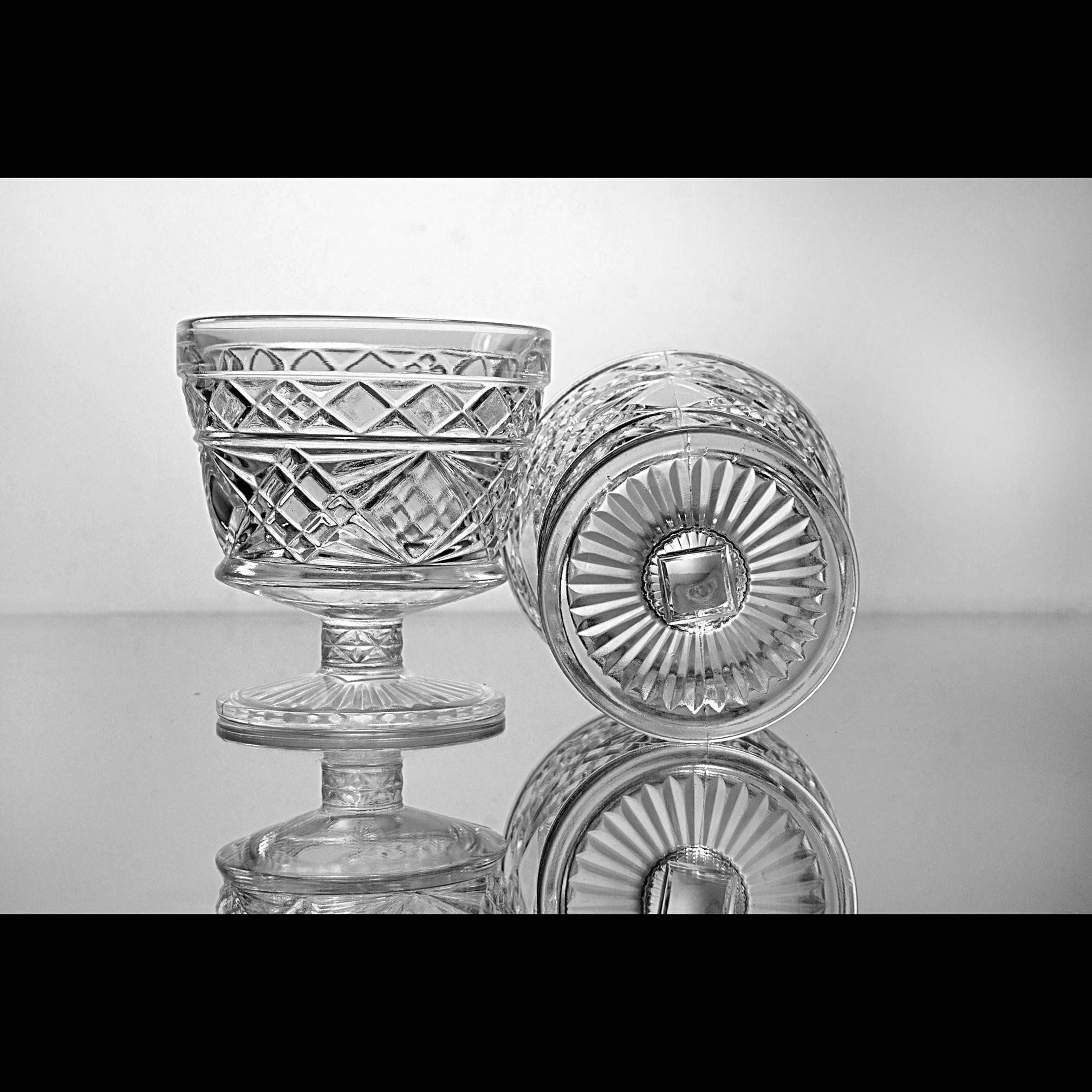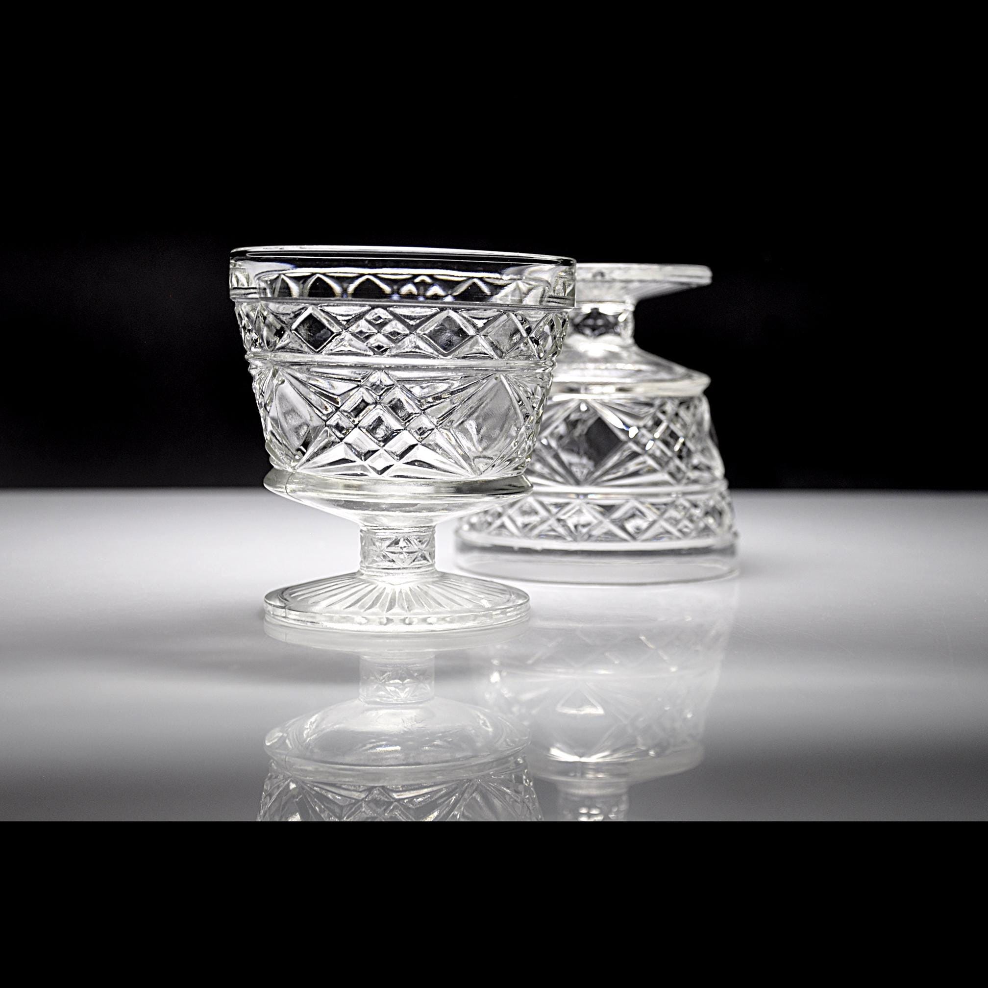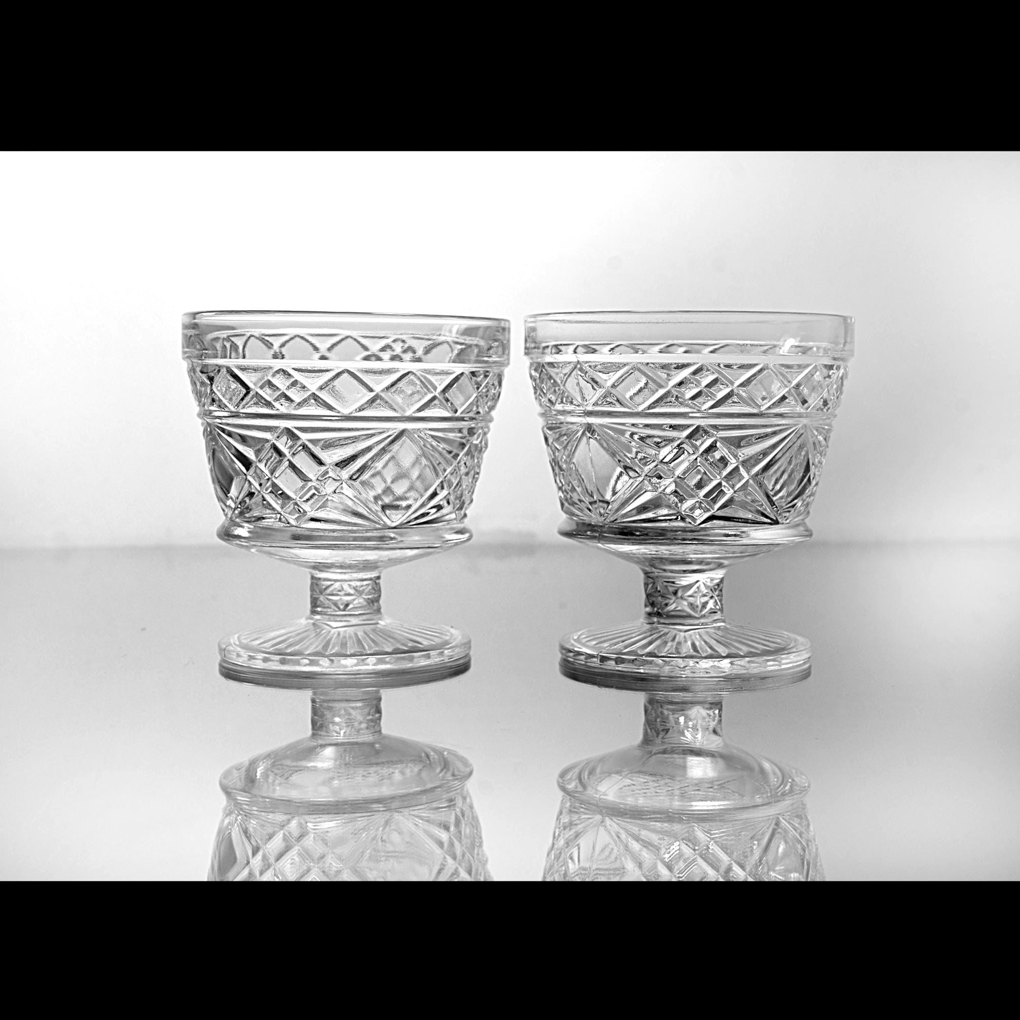These two pedestal dishes are Big Top peanut butter glasses made by Hazel-Atlas back when companies packed food in glass that was meant to live on afterward. Folks used them for ice cream, canned fruit, and the occasional Sunday pudding. The diamond pattern catches the light, and the ribbed foot gives them that early–mid-century look without trying too hard. If you grew up with a grandma who saved jars and lids and never threw away something that still had life left in it, these will feel right at home in your kitchen. Nice as sherbets, champagne coupes, yogurt dishes, or just to hold candy on the counter.
