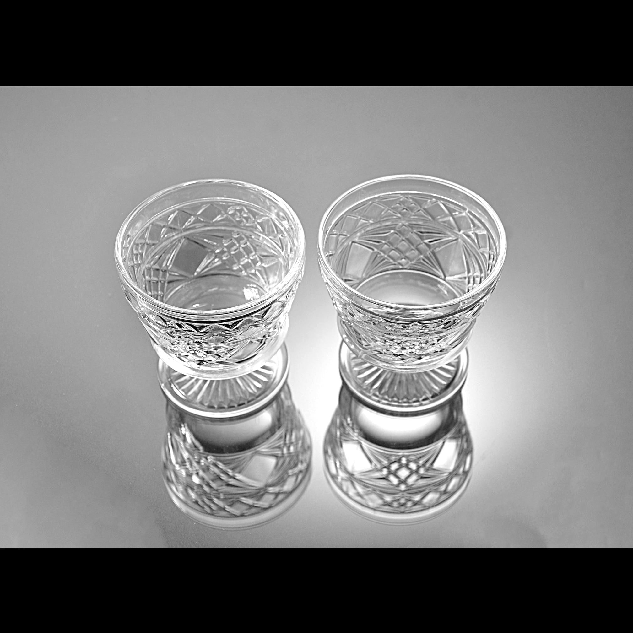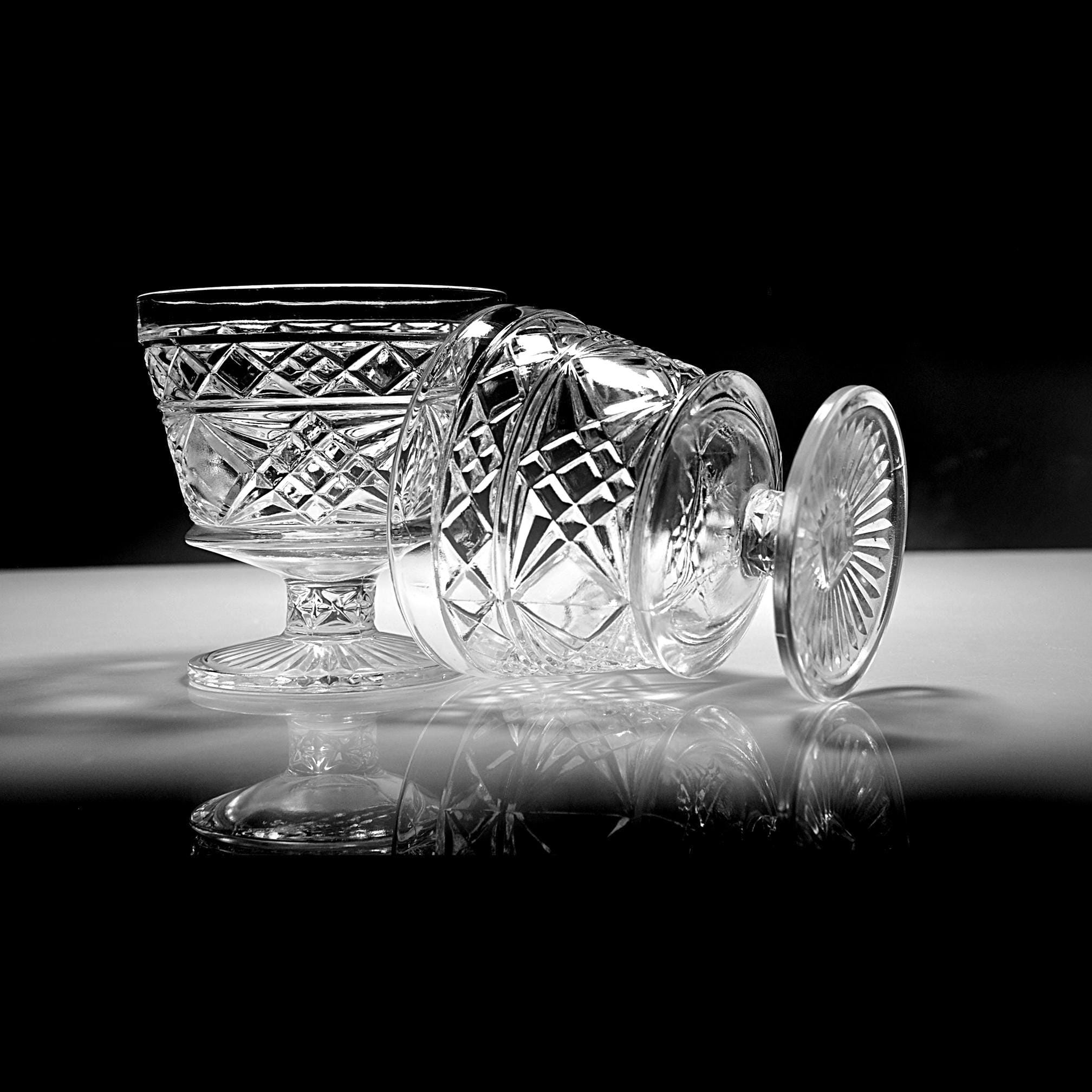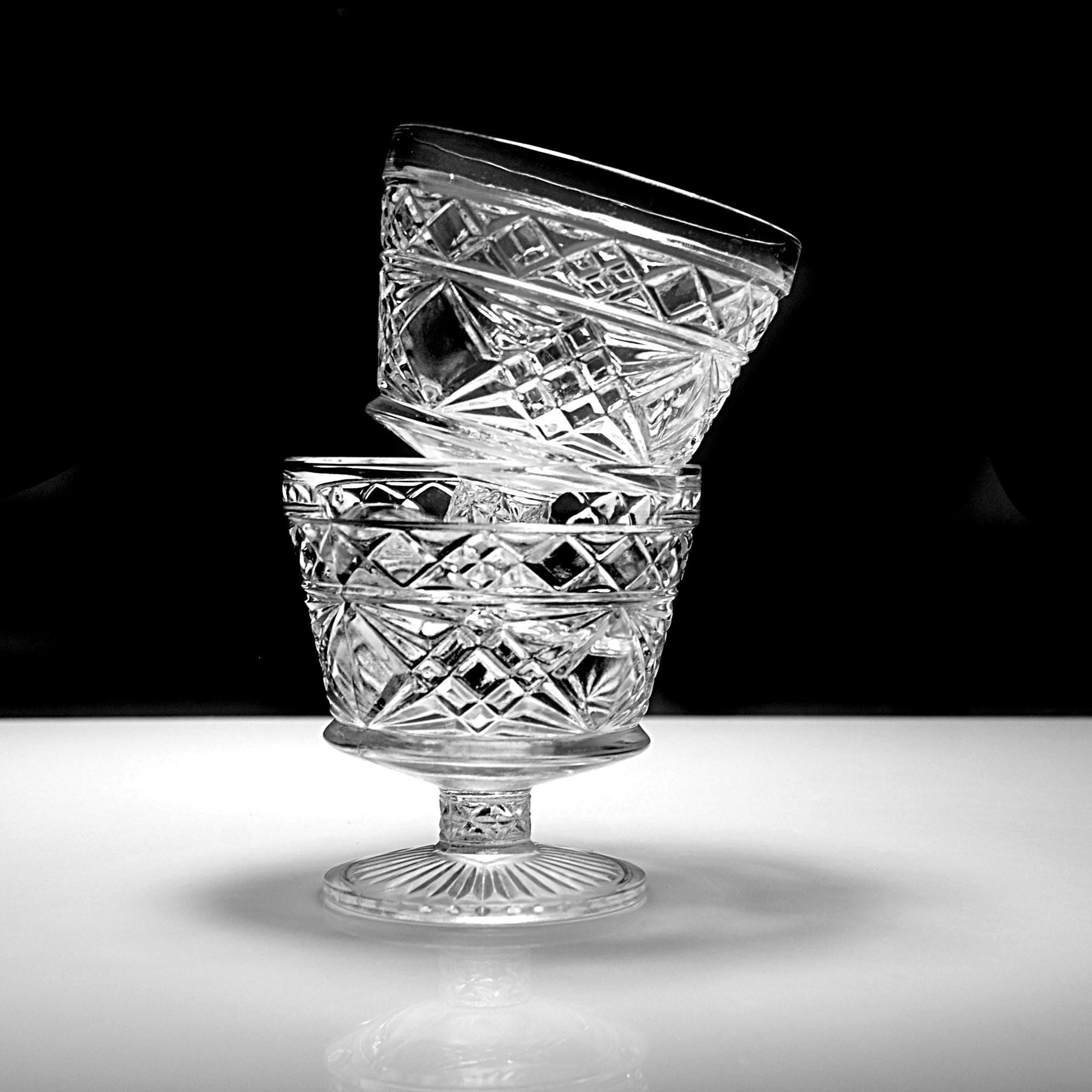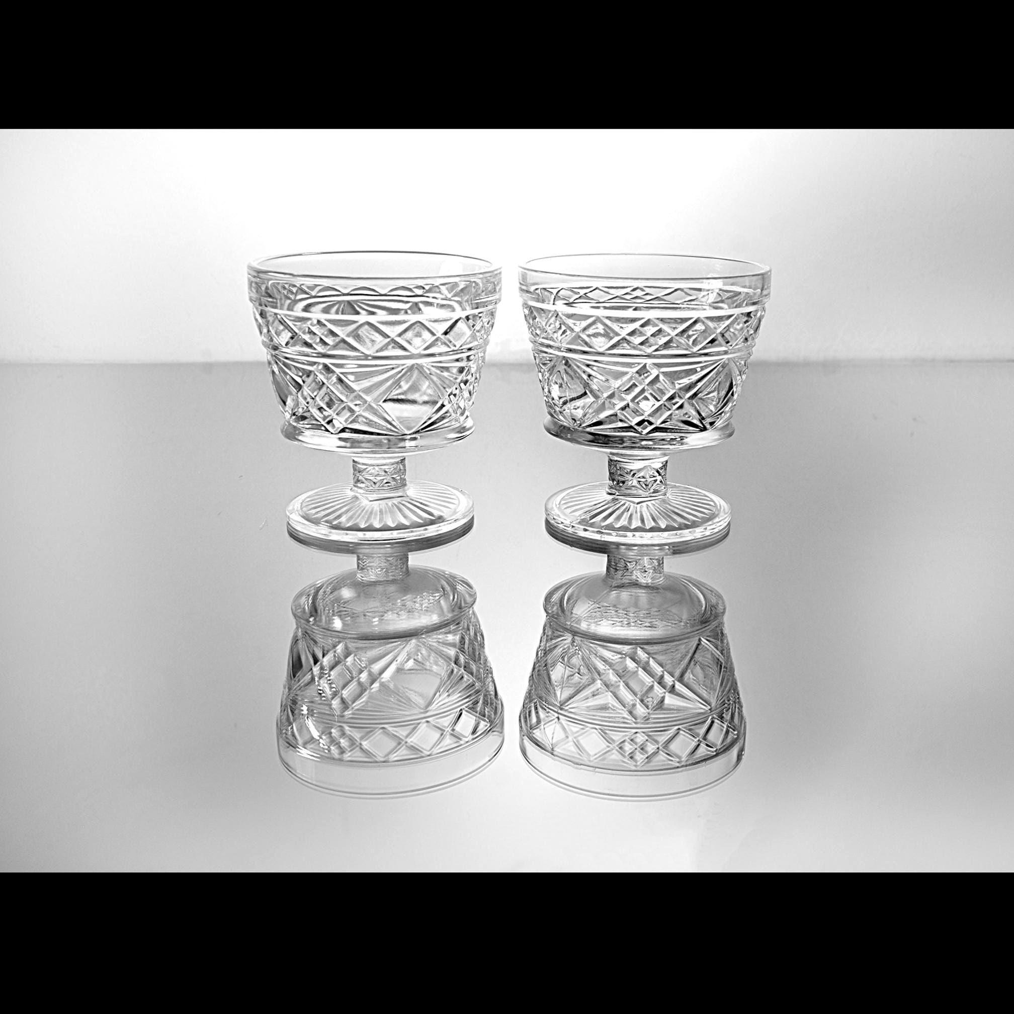 These two pedestal dishes are Big Top peanut butter glasses made by Hazel-Atlas back when companies packed food in glass that was meant to live on afterward. Folks used them for ice cream, canned fruit, and the occasional Sunday pudding. The diamond pattern catches the light, and the ribbed foot gives them that early–mid-century look without trying too hard. If you grew up with a grandma who saved jars and lids and never threw away something that still had life left in it, these will feel right at home in your kitchen. Nice as sherbets, champagne coupes, yogurt dishes, or just to hold candy on the counter.