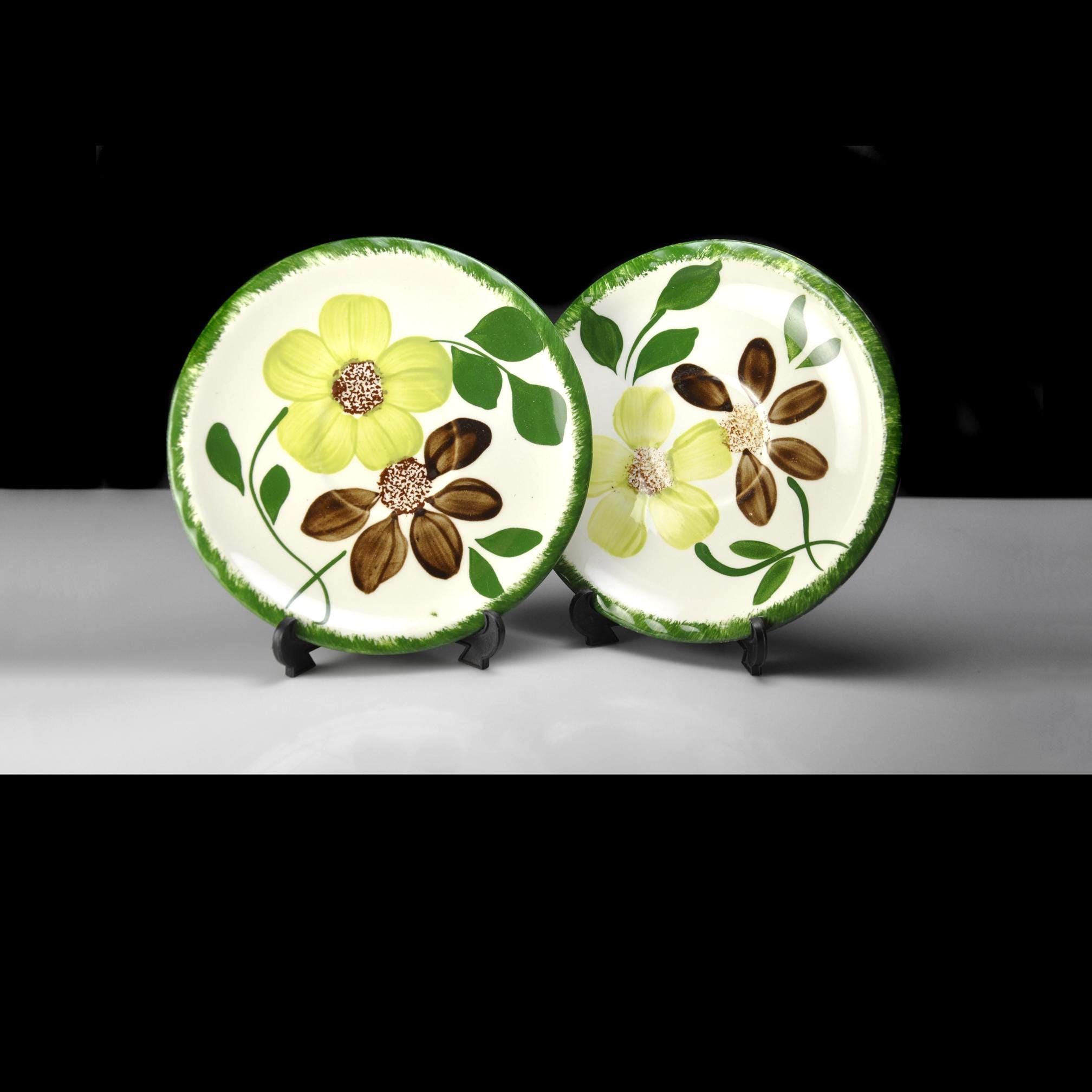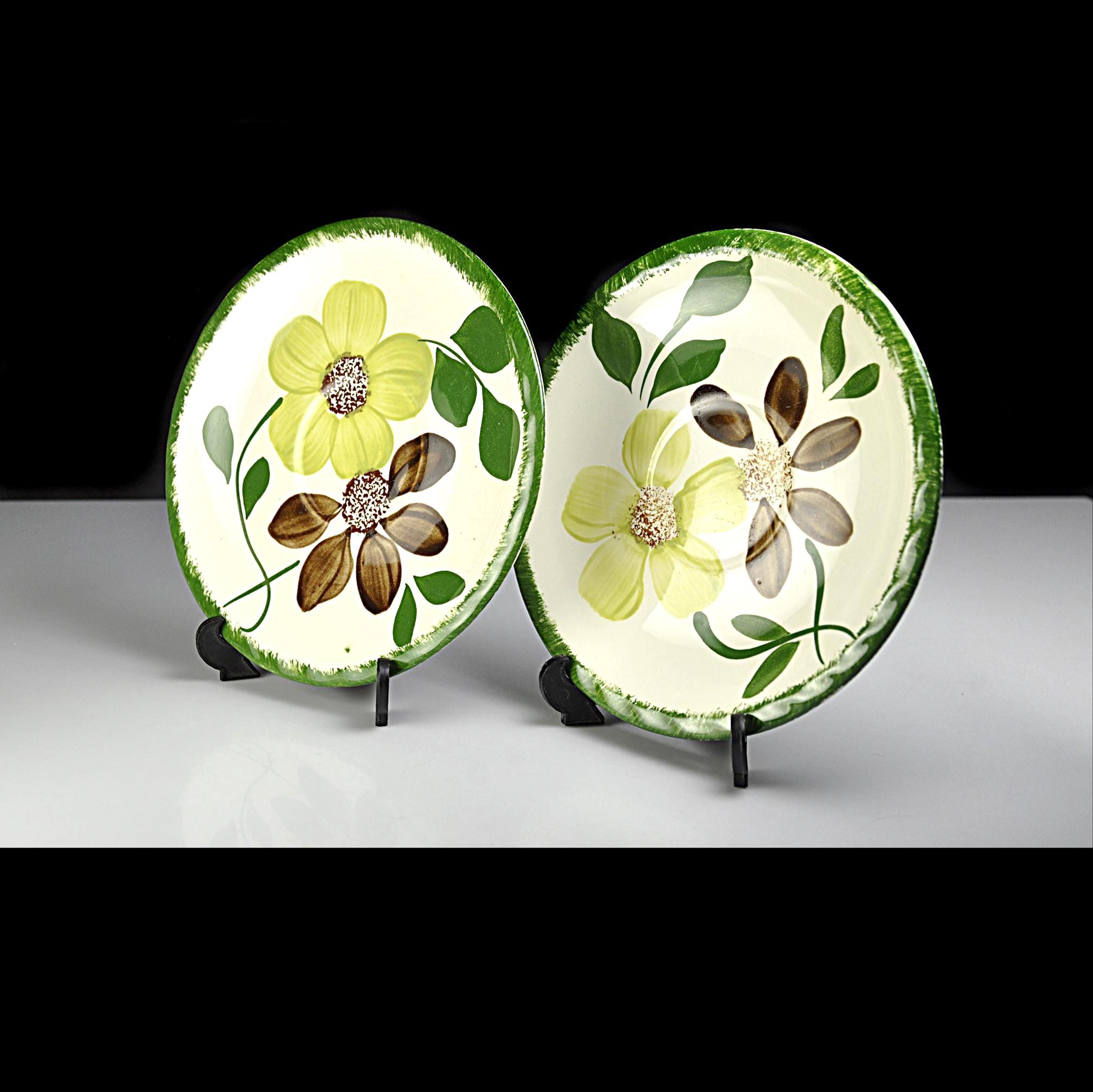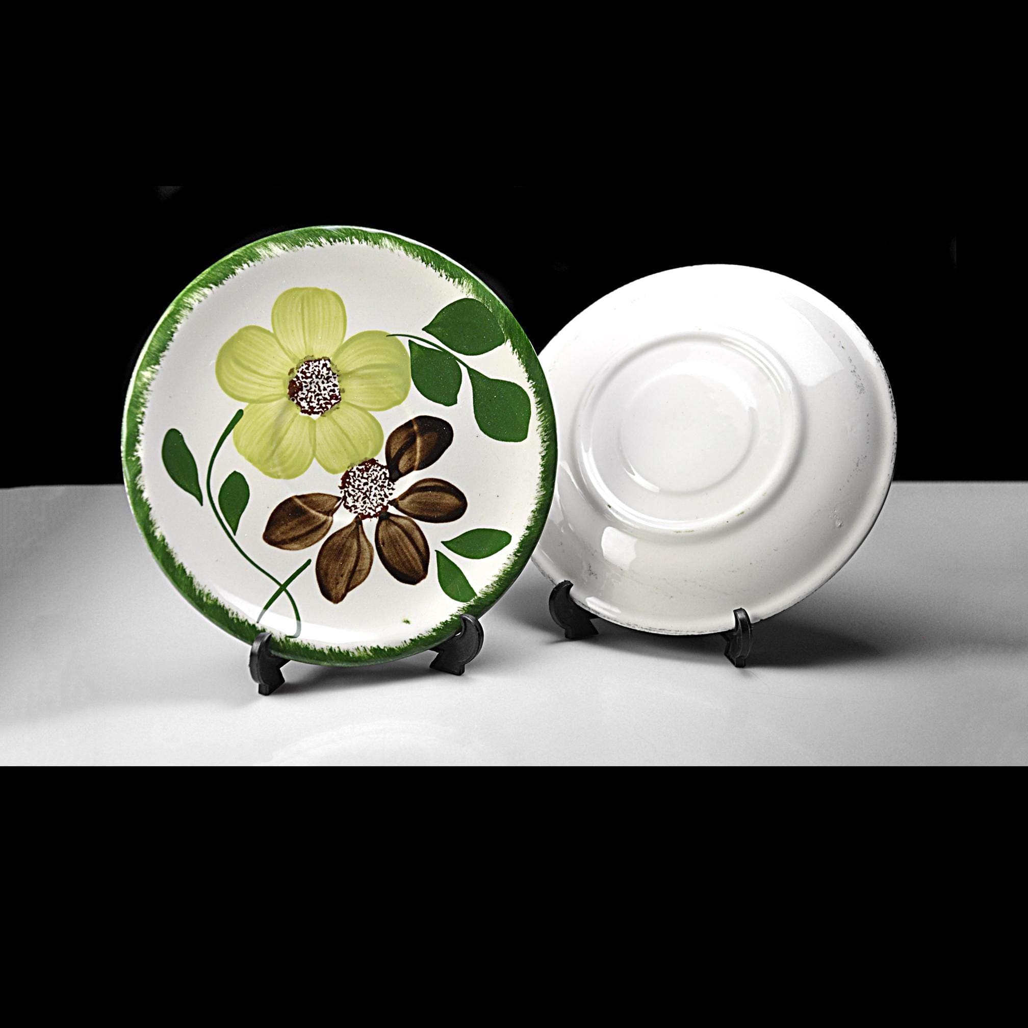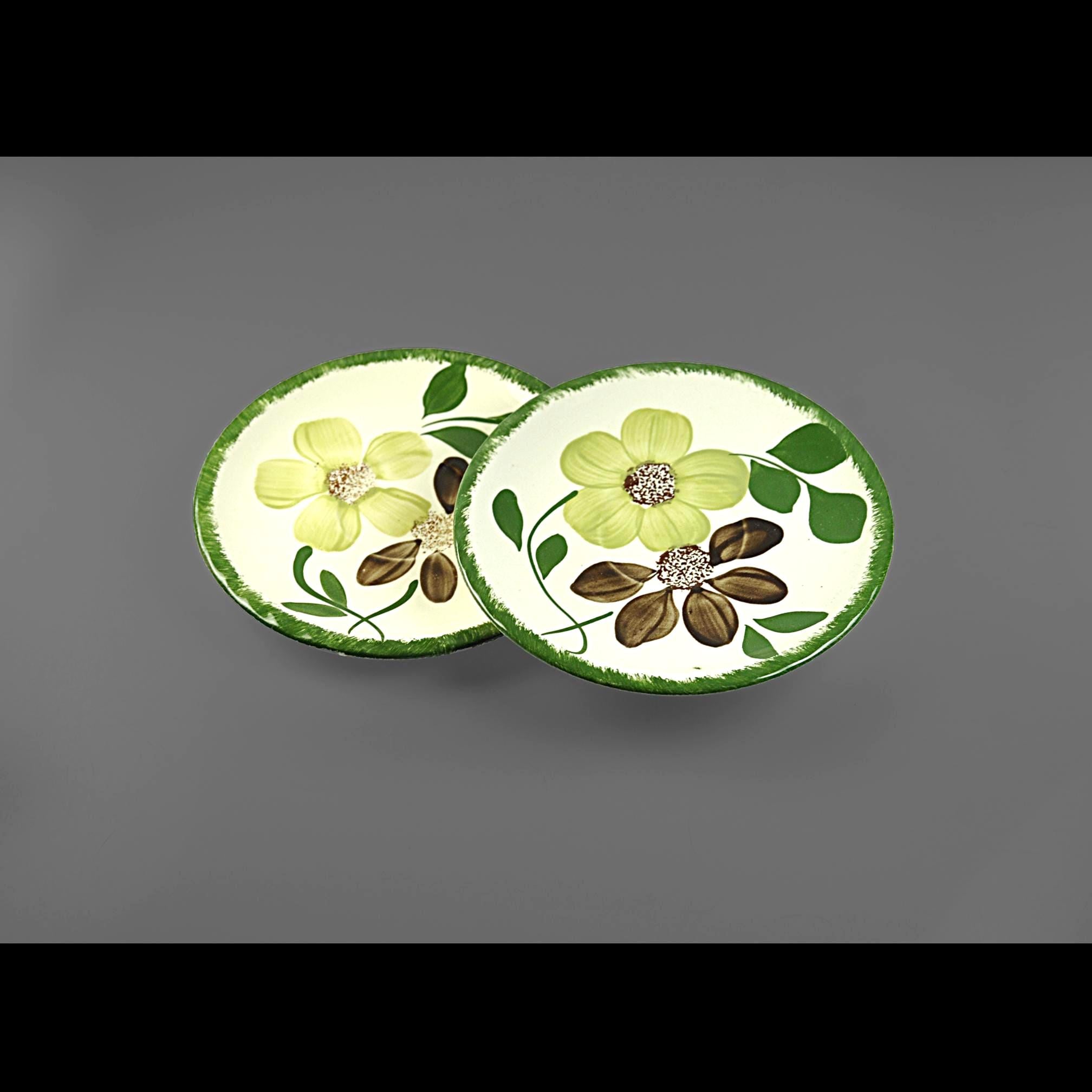 There’s something homey about old Blue Ridge pieces. You can almost picture them stacked in an open cupboard in a farmhouse, every plate a little different because every brushstroke was done by hand. These two saucers are in the Green Briar pattern — soft yellow flowers, brown petals, and thick green leaves, all framed with that grassy rim. Blue Ridge Southern Potteries made workhorse tableware meant to be used every day, not tucked away for company. The women who painted them worked fast and steady, and no two pieces ever come out exactly alike. They’re the right size for coffee cups, small desserts, or to replace missing pieces in a collection. Even on their own, they’ve got enough personality to earn a spot on an open shelf or on the table under a potted plant.