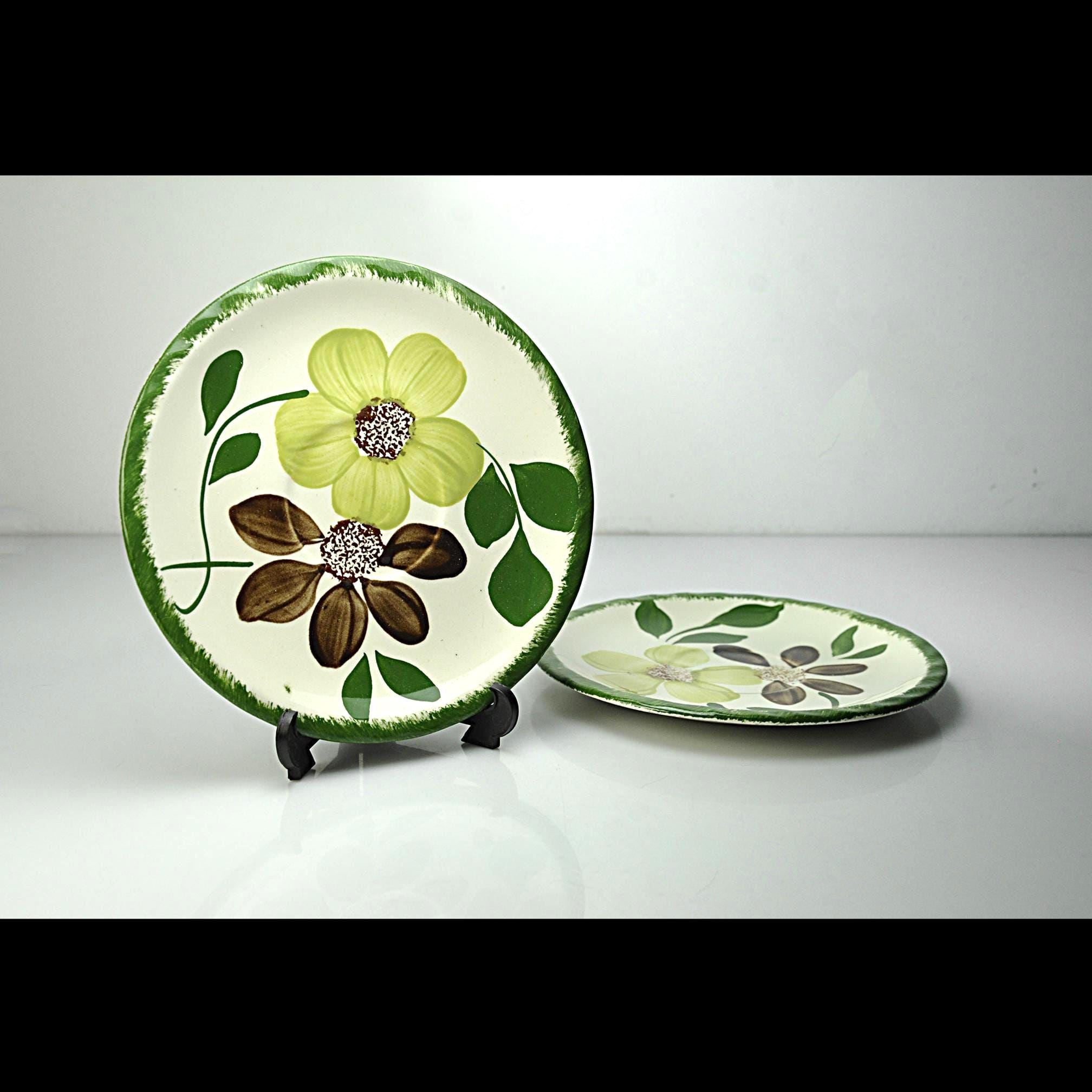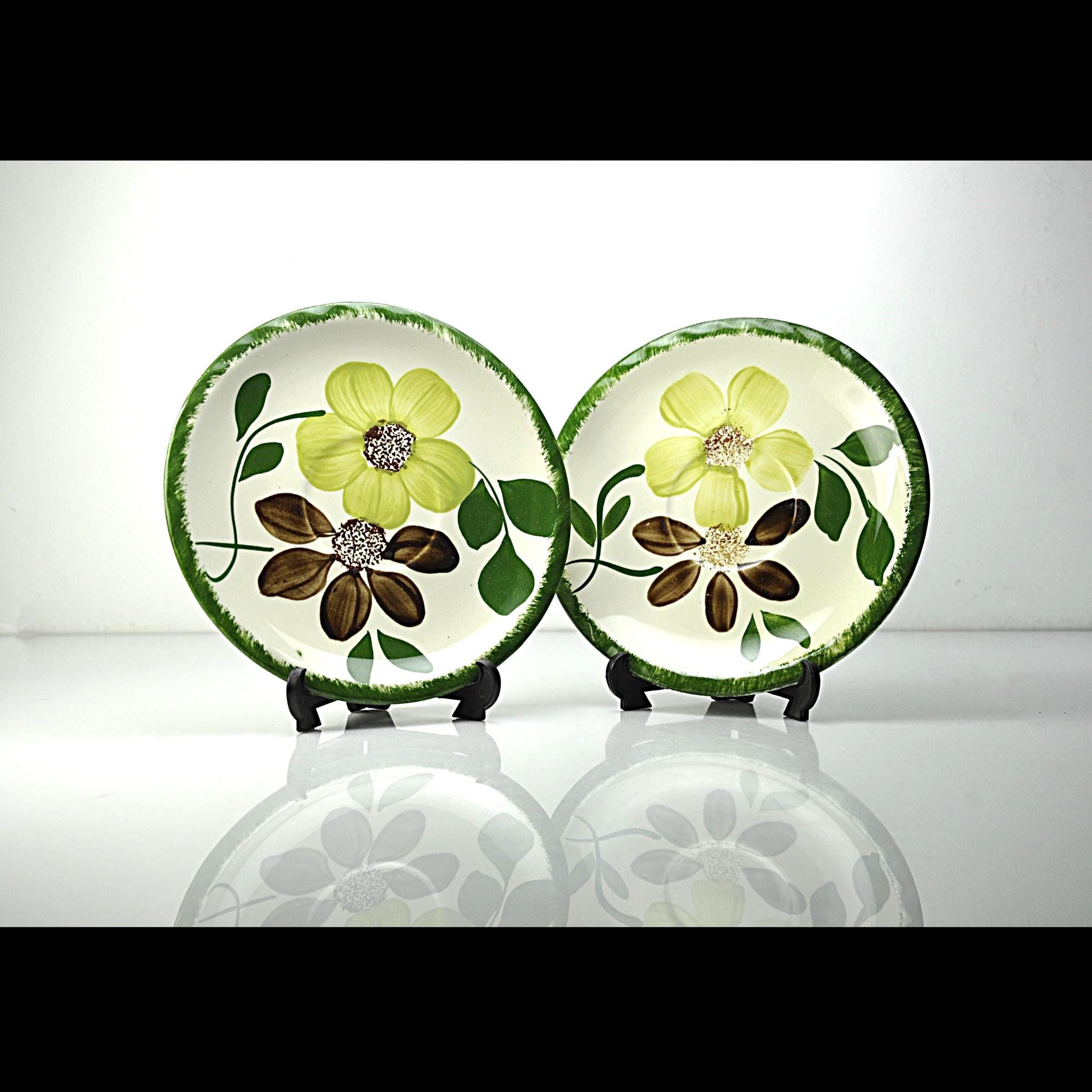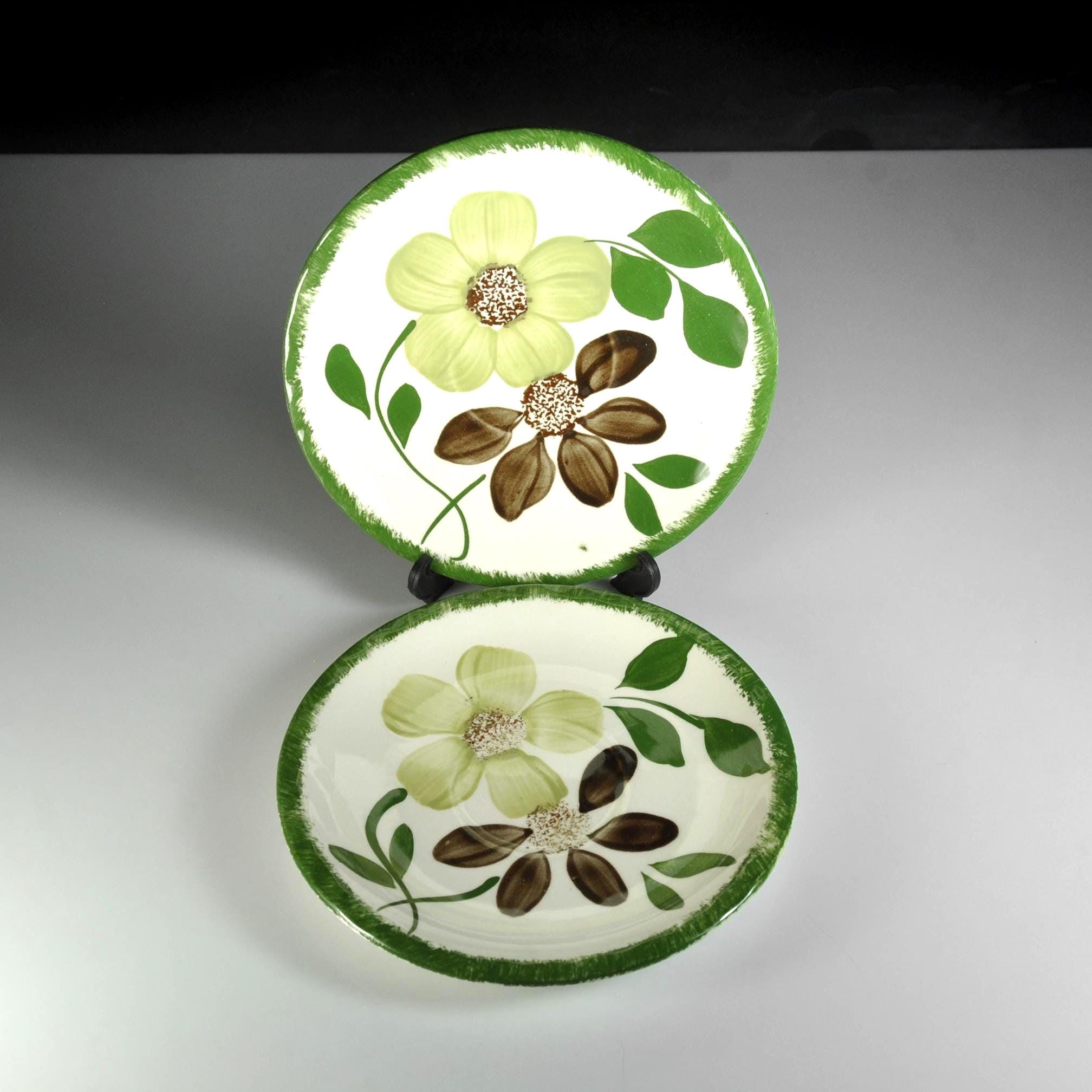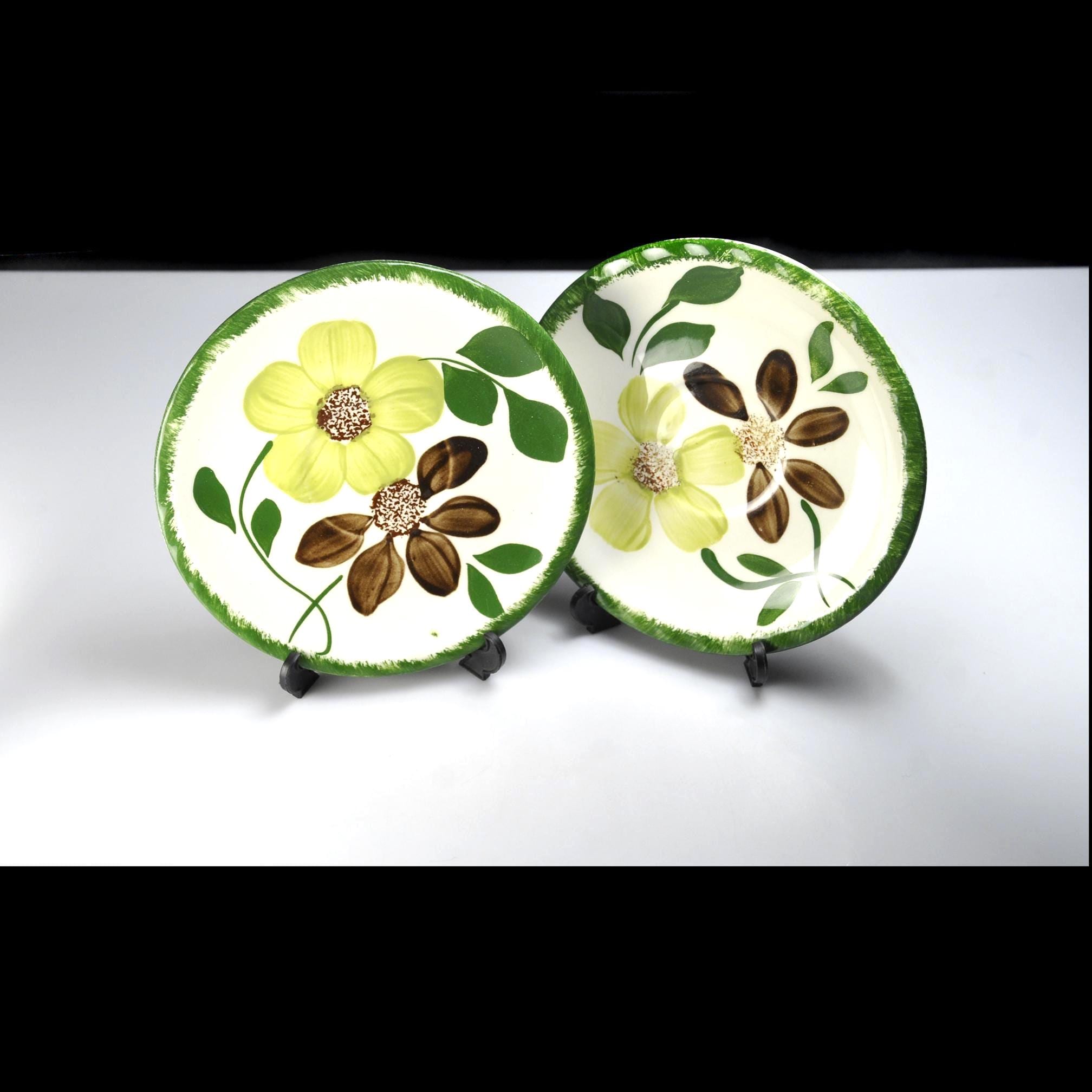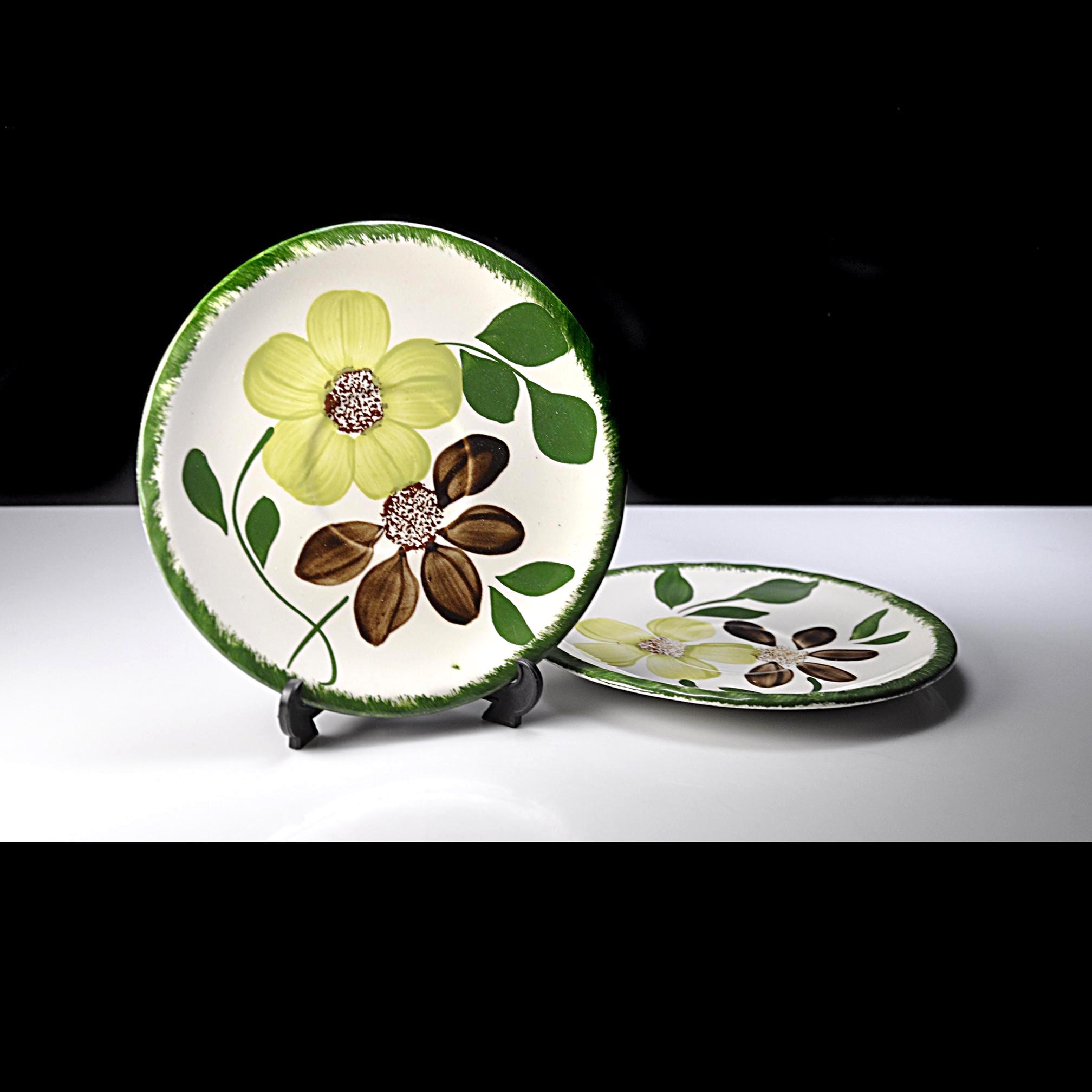 There’s something homey about old Blue Ridge pieces. You can almost picture them stacked in an open cupboard in a farmhouse, every plate a little different because every brushstroke was done by hand. These two saucers are in the Green Briar pattern — soft yellow flowers, brown petals, and thick green leaves, all framed with that grassy rim. Blue Ridge Southern Potteries made workhorse tableware meant to be used every day, not tucked away for company. The women who painted them worked fast and steady, and no two pieces ever come out exactly alike. They’re the right size for coffee cups, small desserts, or to replace missing pieces in a collection. Even on their own, they’ve got enough personality to earn a spot on an open shelf or on the table under a potted plant.