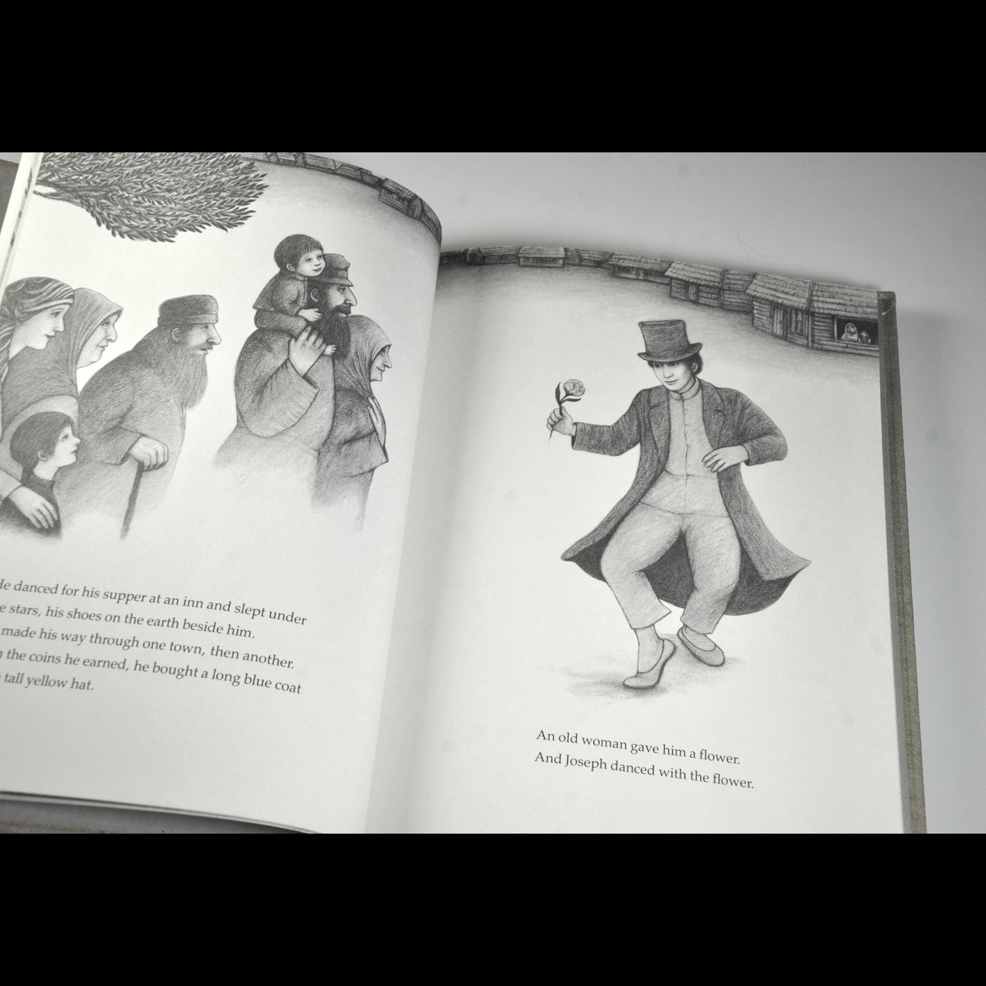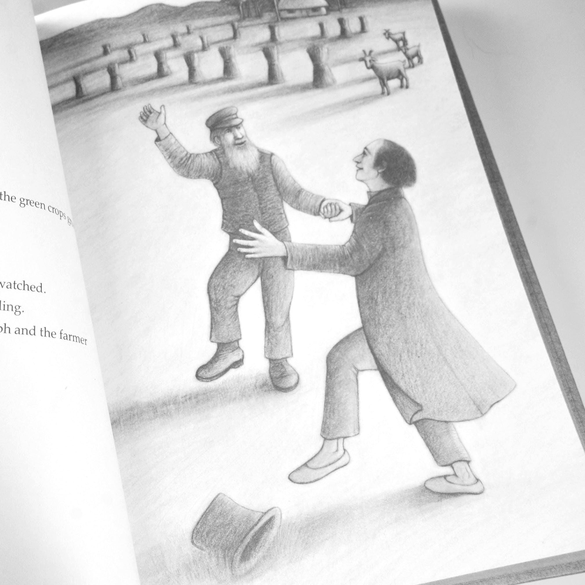 This story follows a boy named Joseph, who meets a mysterious old man by the sea—a man dressed in a red coat, green hat, and silver shoes. The old man calls himself “The Dancing Man” and gives Joseph his silver shoes as a gift. With those shoes, Joseph takes the joy of dancing into the world. He dances across villages, lifting spirits, comforting others, and bringing cheer wherever he goes. The tale carries themes of kindness, joy, and passing on gifts that brighten the world, backed by tender grayscale illustrations.