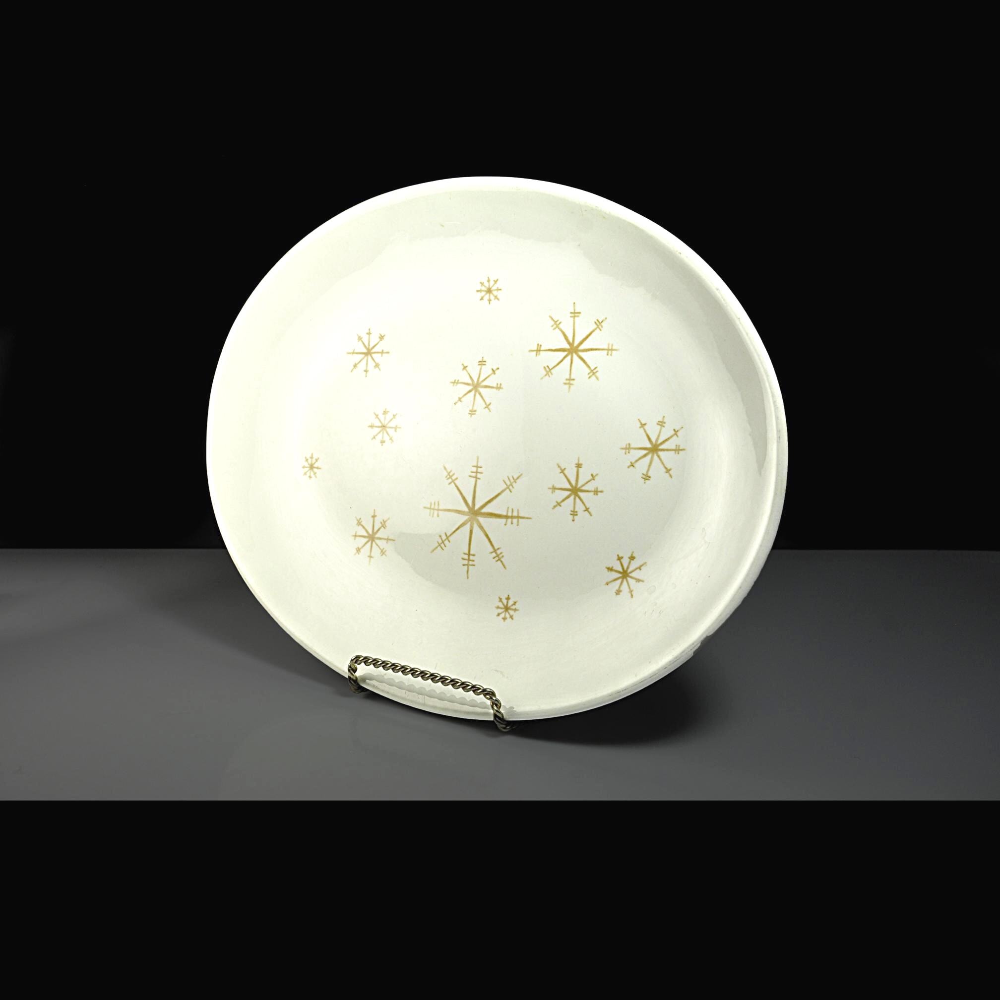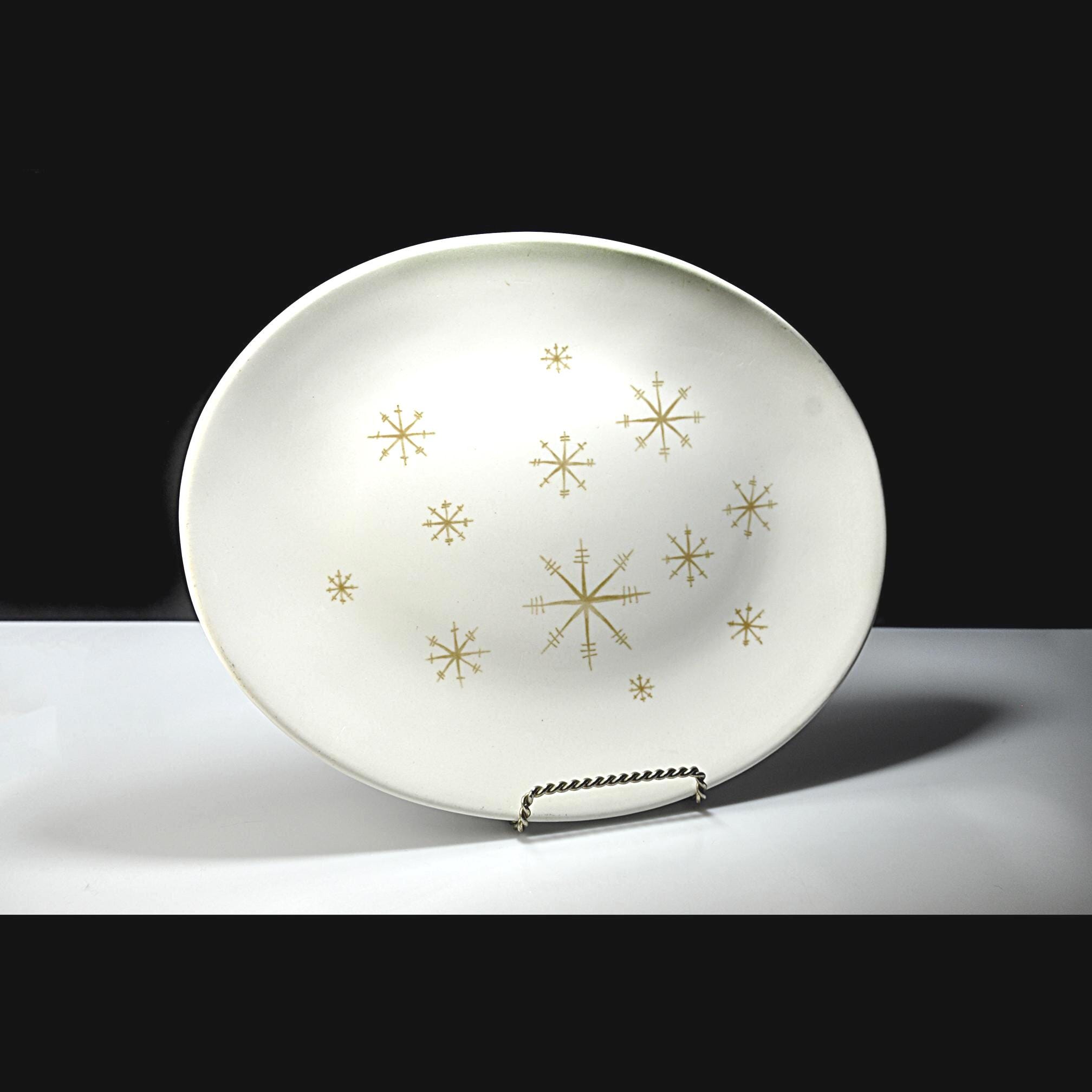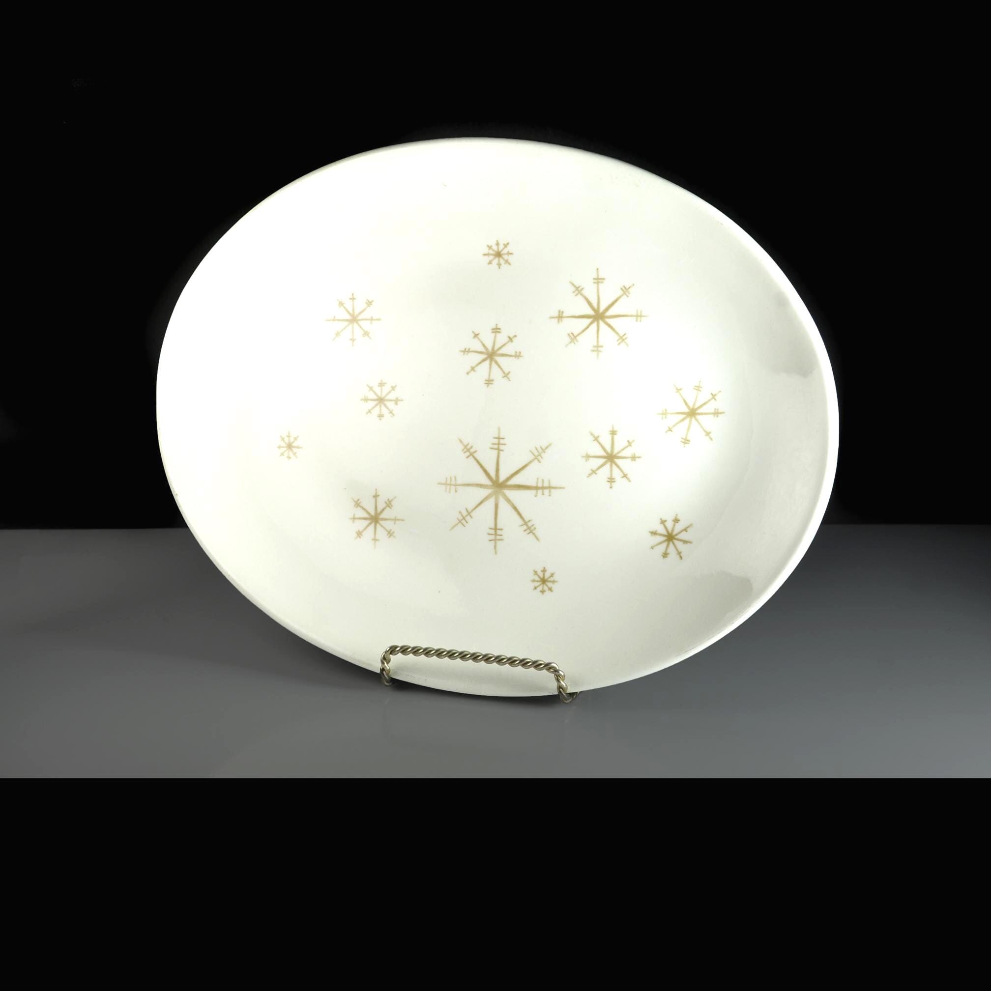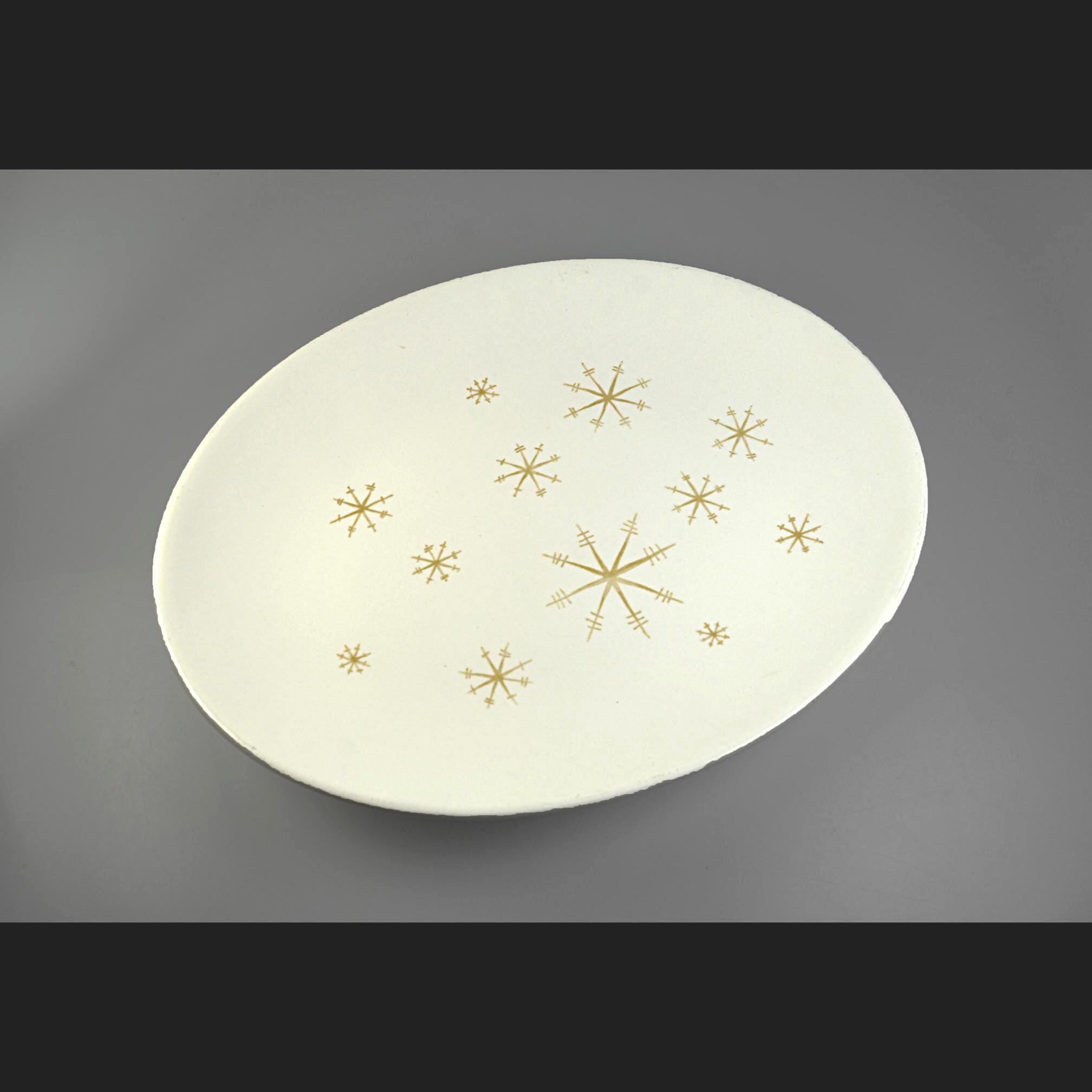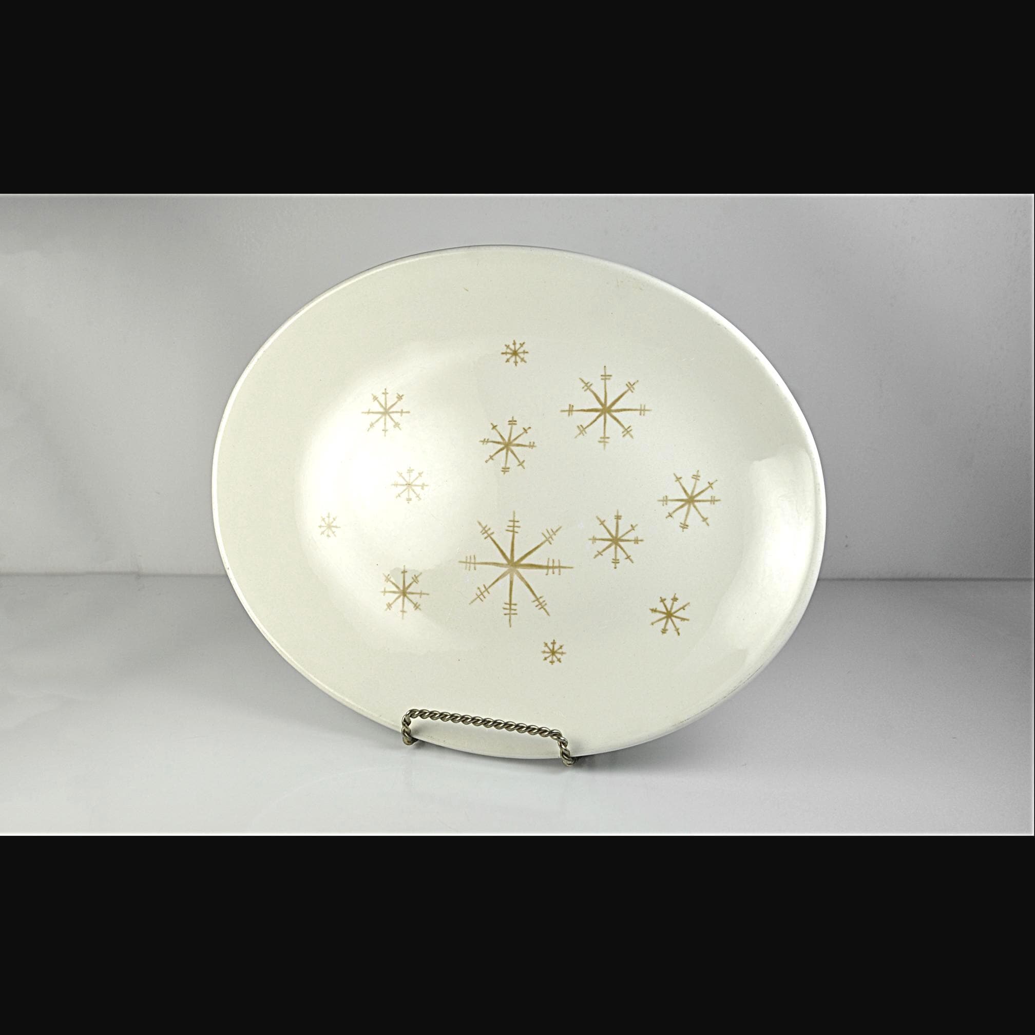 Mid-century dinnerware just feels optimistic, and this platter is a perfect example of that era. This oval platter was made by Royal China Company in their Star Glow pattern, a classic 1950s atomic design with gold starbursts scattered across a soft creamy white background. It’s the kind of piece that would have sat proudly in the center of a post-war dining table—used for roasts, holiday dinners, and Sunday gatherings. The platter measures 13 inches long by 10¼ inches wide, making it a great size for serving meats, vegetables, or even displaying as part of a mid-century kitchen collection. It is in excellent vintage condition with no chips, cracks, or crazing. There are a few light utensil marks from normal use over the years—nothing unusual for a piece of this age, and honestly just proof that it was loved and used as intended. This is a solid, American-made mid-century piece that fits beautifully into atomic, retro, or vintage kitchen décor.