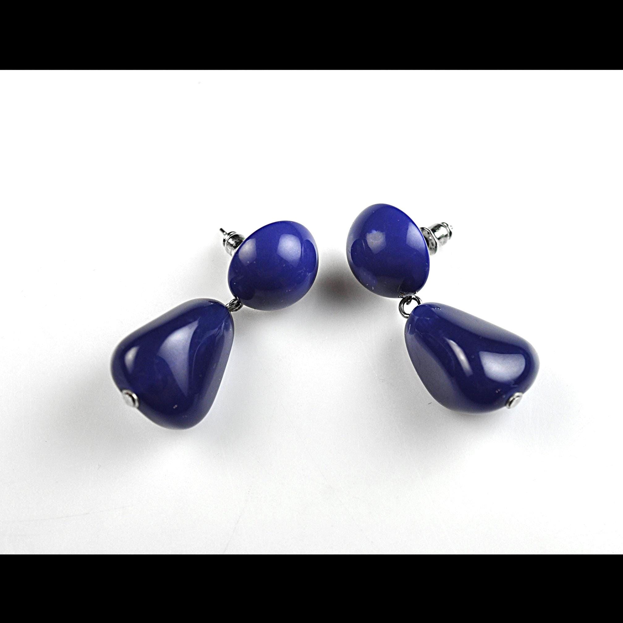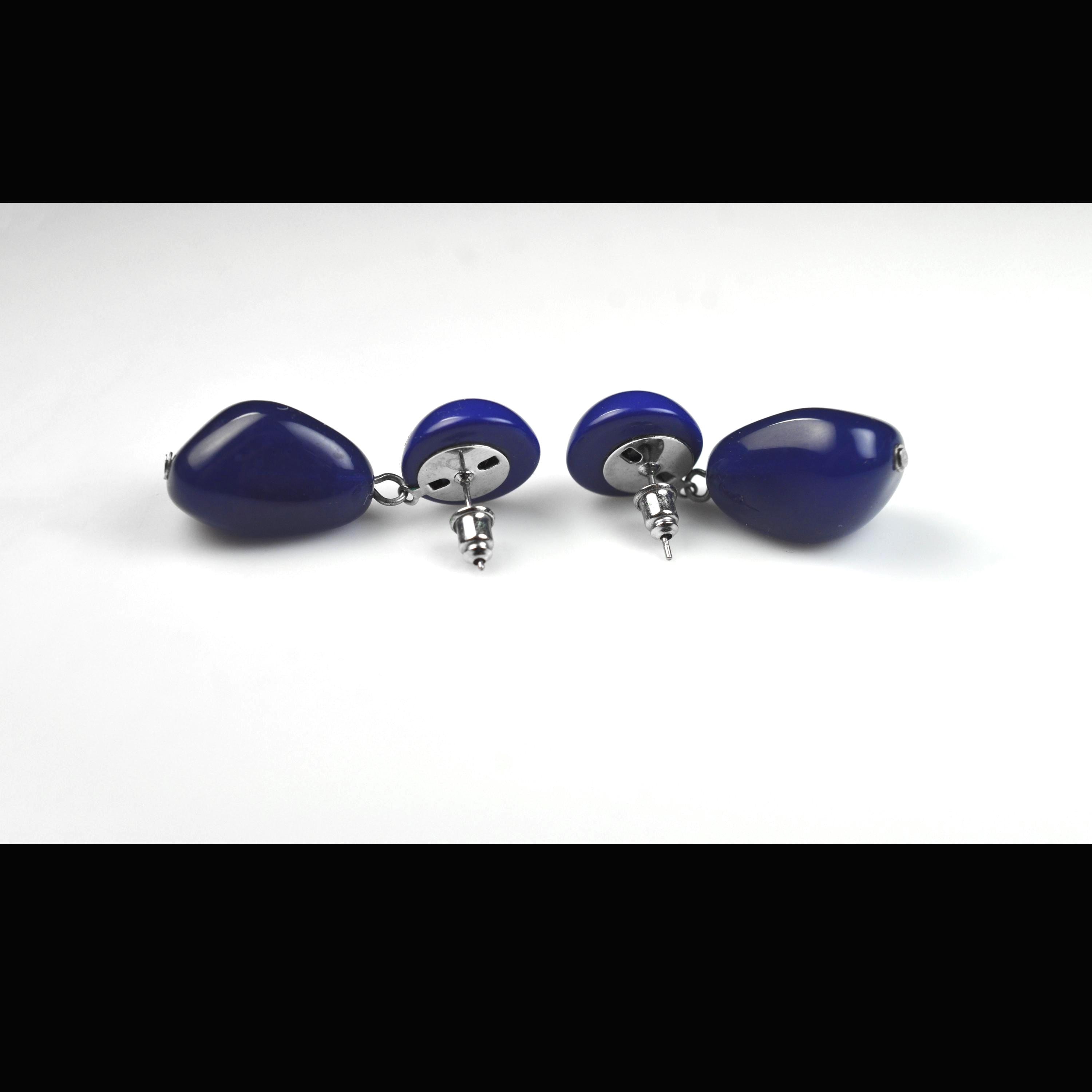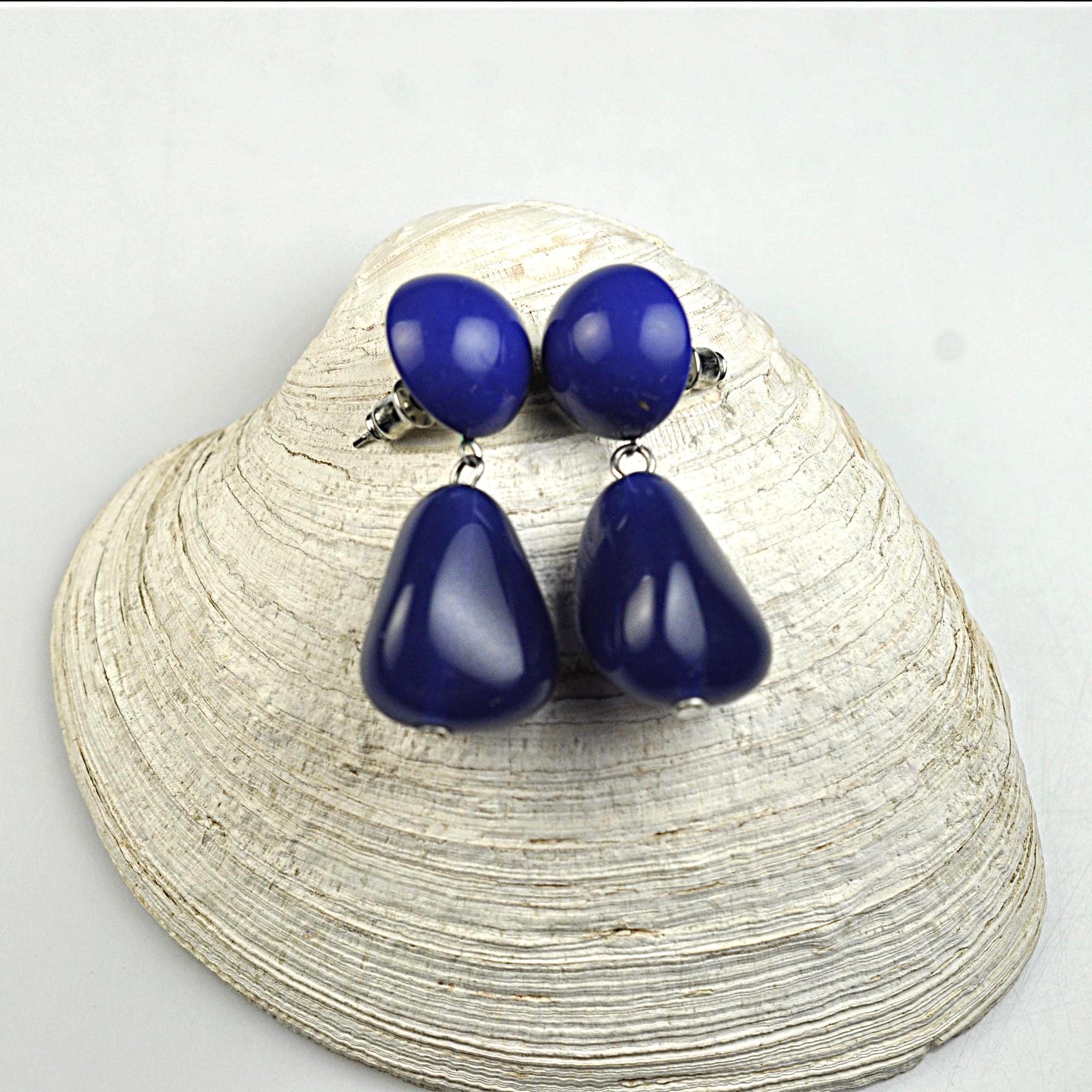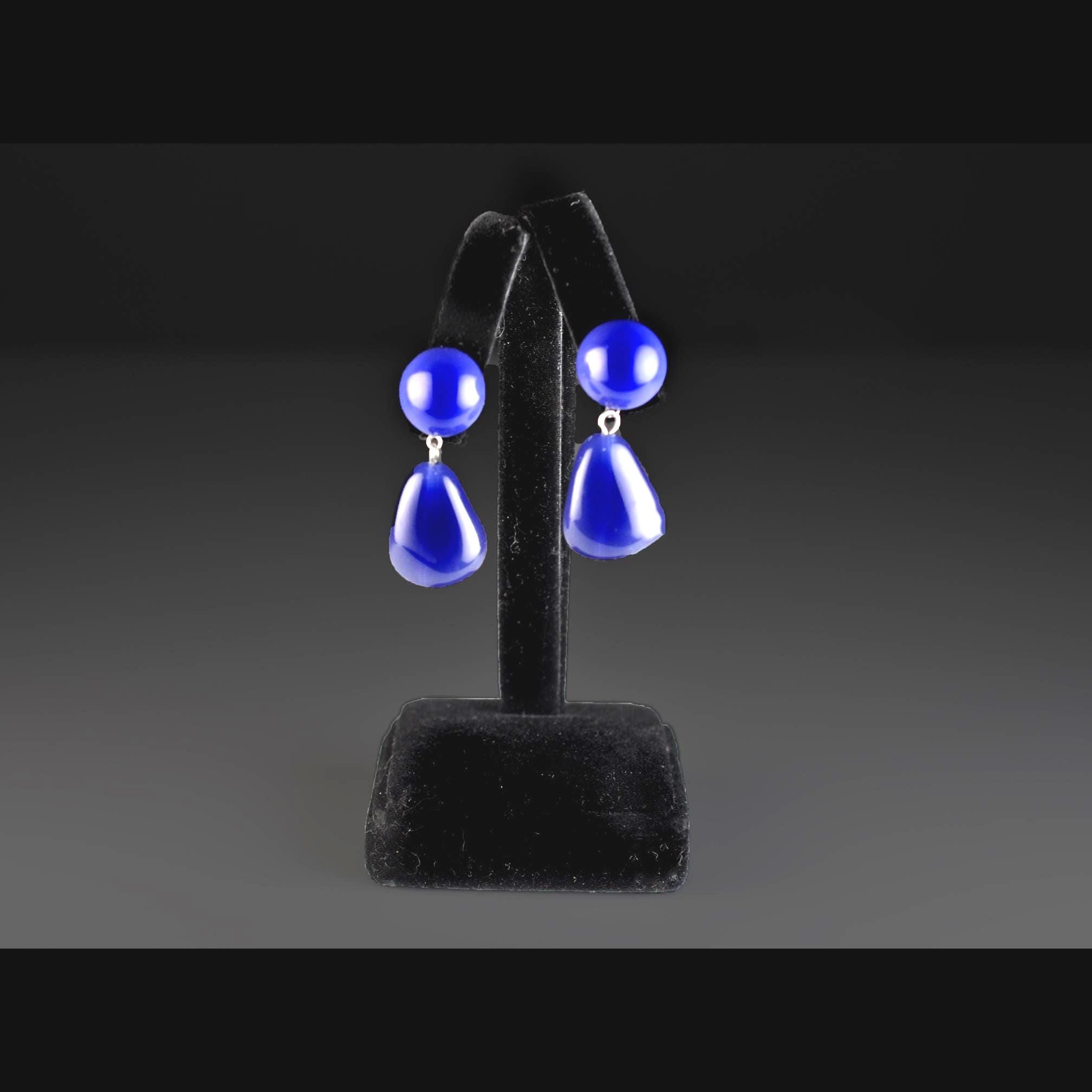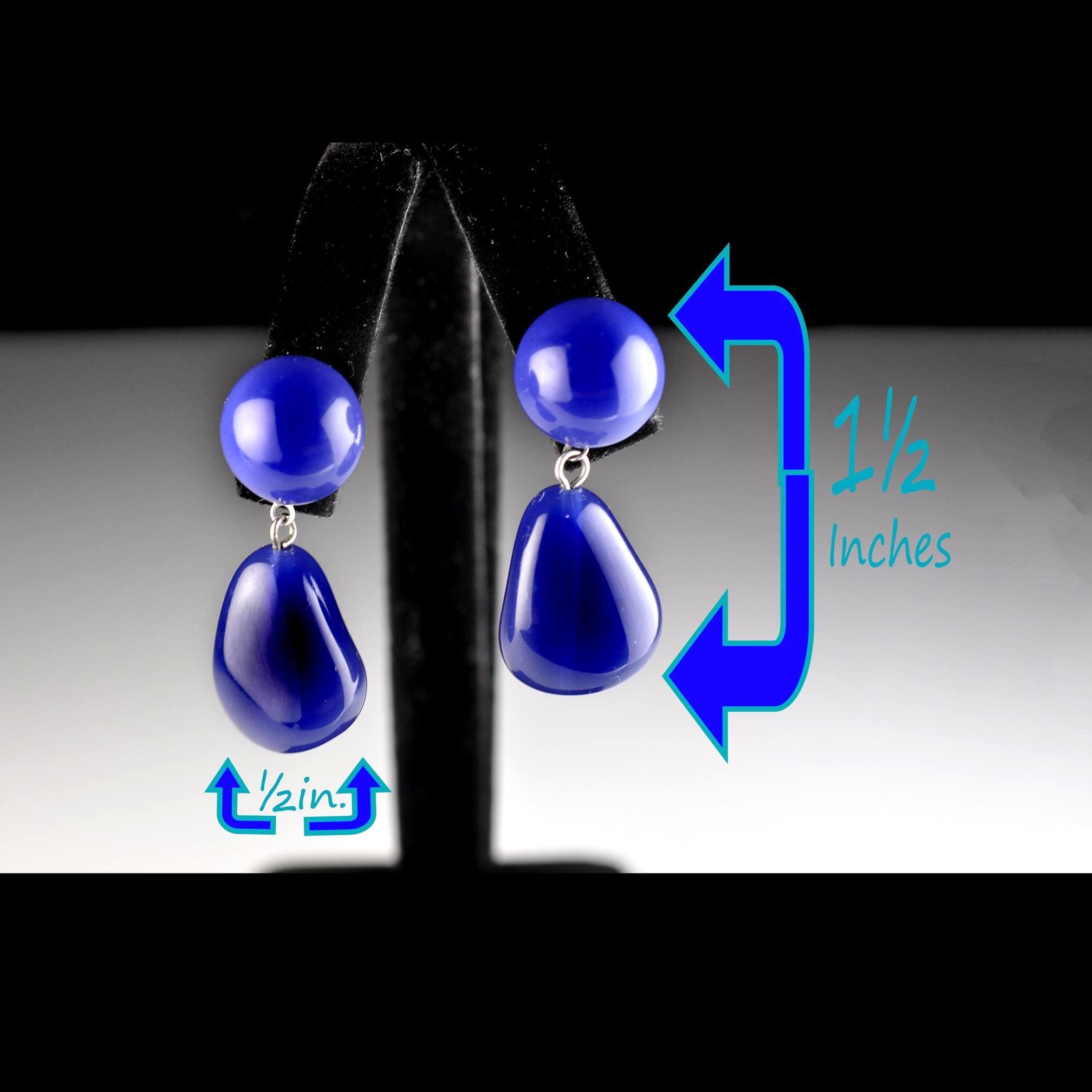 These vintage blue Lucite drop earrings have that unmistakable mid-century look that never really goes out of style. The rich dark blue color is bold without being loud, and the smooth rounded shapes give them a clean, modern feel that works just as well today as it did decades ago. Made during the height of Lucite costume jewelry popularity, these date to around the late 1950s to early 1960s. They are factory-made, not handmade, and well-constructed—far better quality than later plastic jewelry. A classic pair of wearable vintage earrings—easy to dress up, easy to wear, and unmistakably mid-century.
