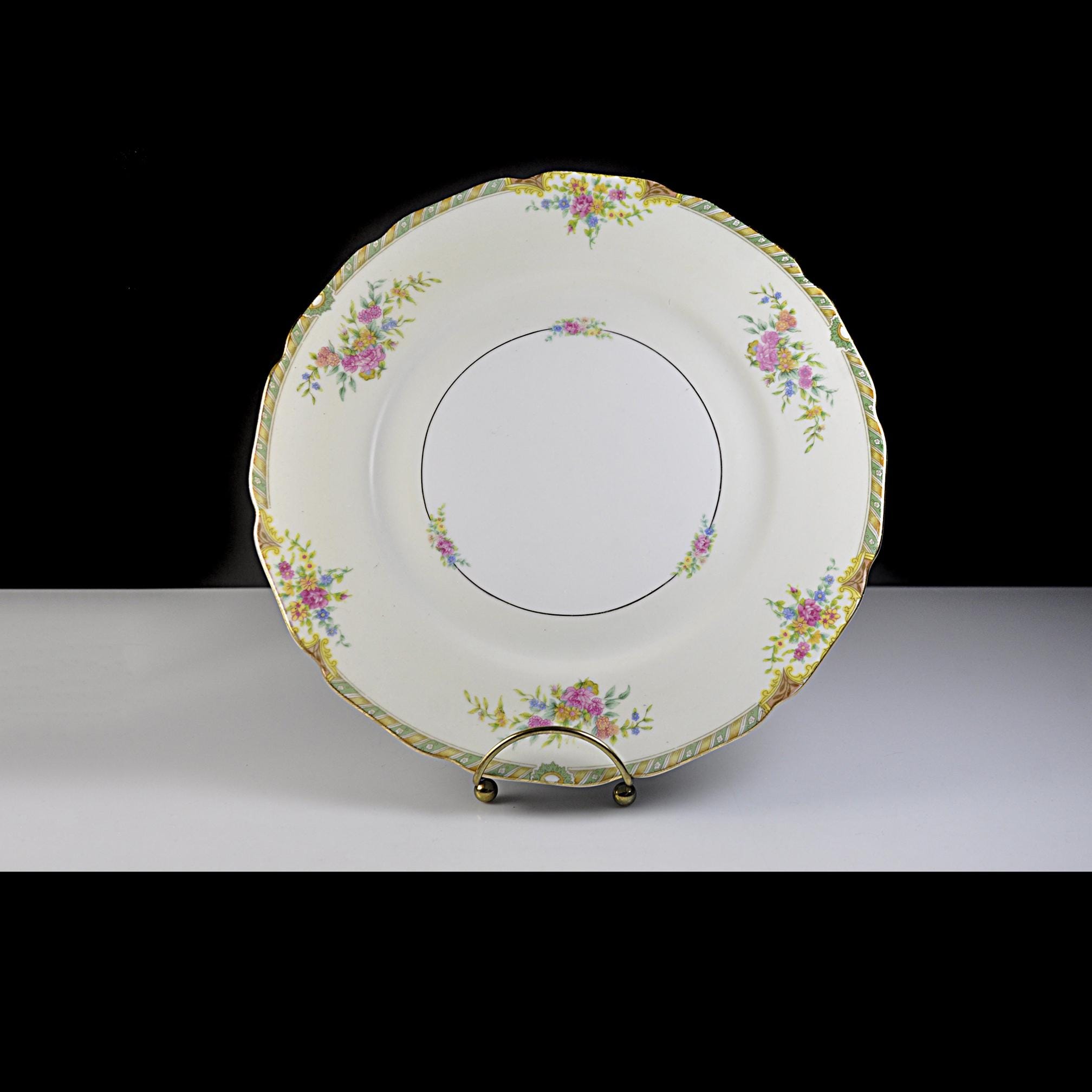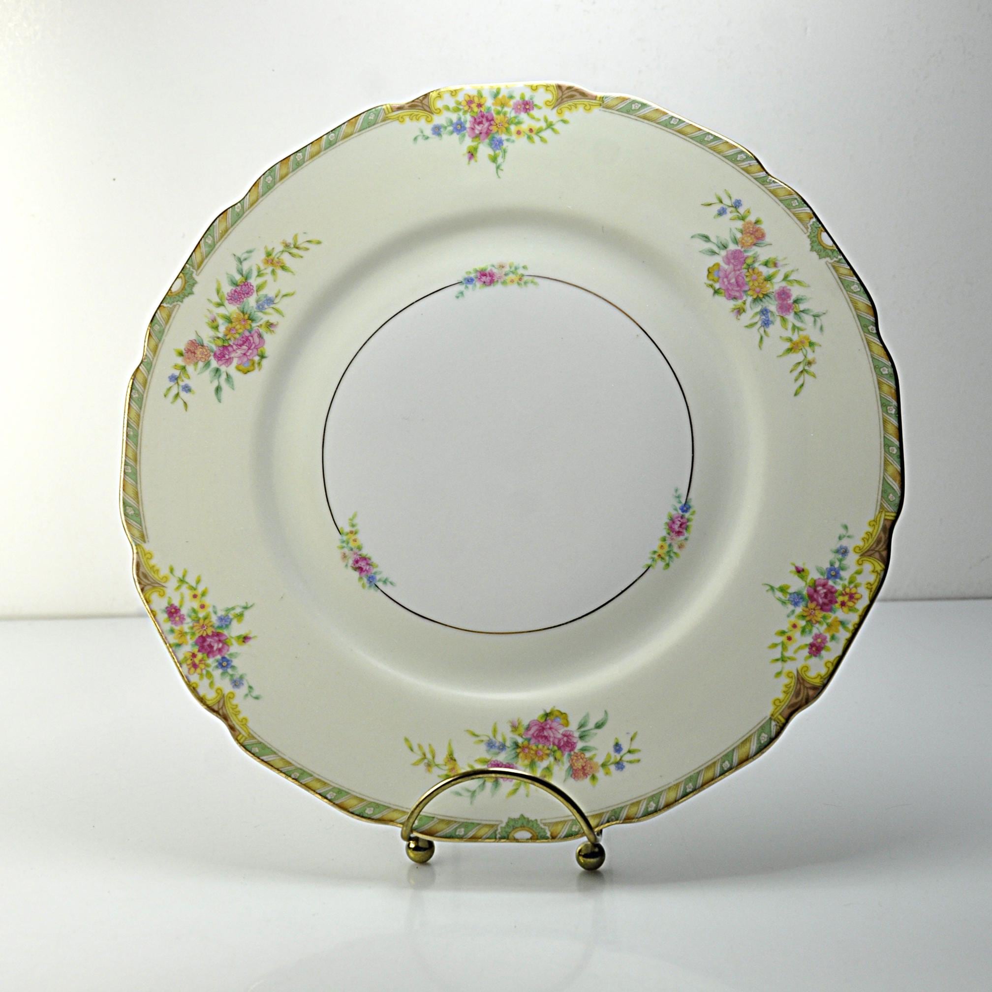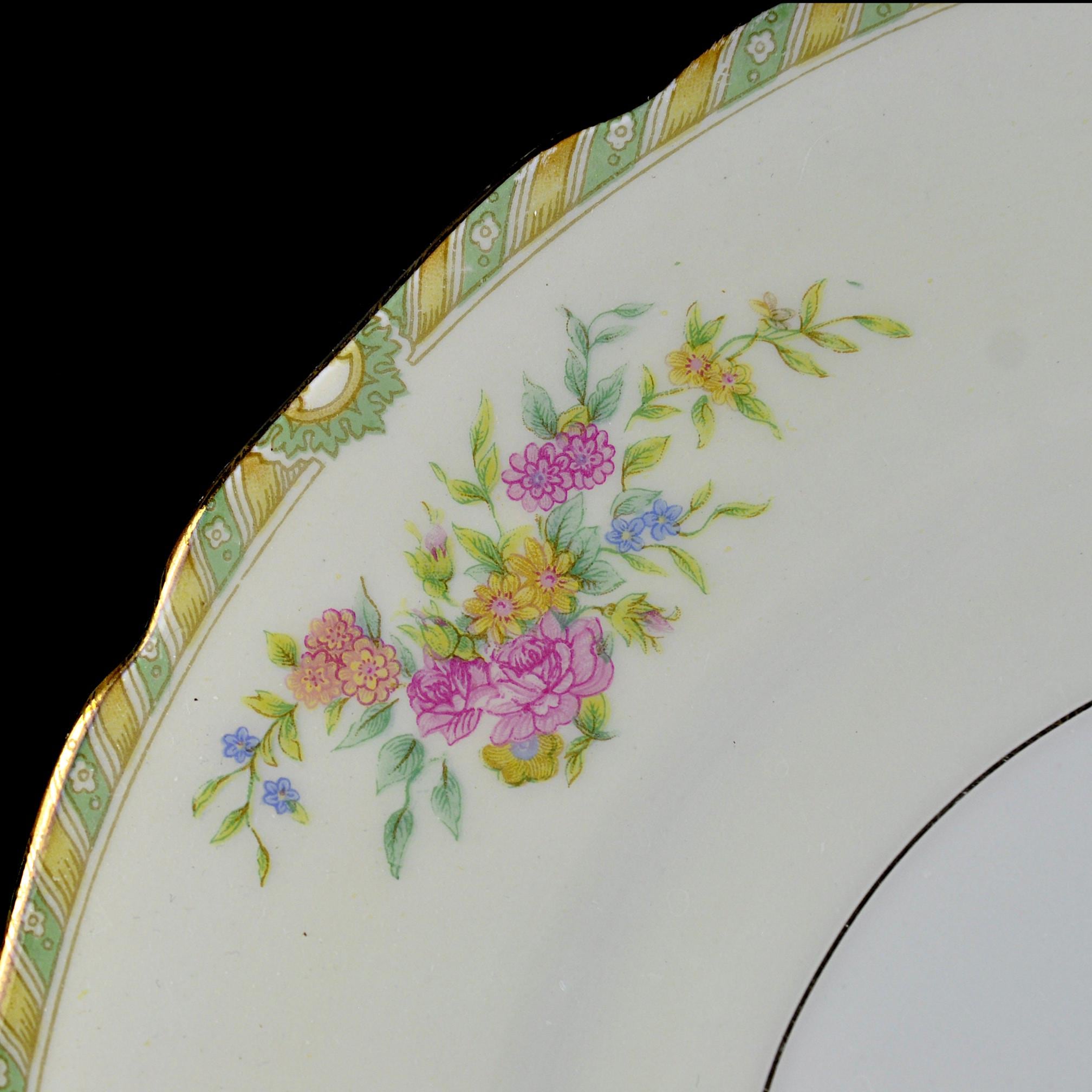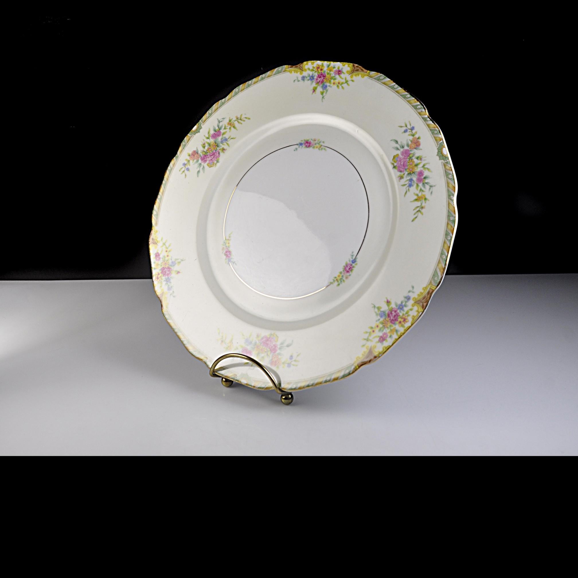 This is a vintage Black Knight dinner plate in the Leonora pattern, made in Germany by Waldenburg Studios and dating to the interwar period, circa 1925–1939. The plate measures 10 inches in diameter and features soft floral bouquets in pink, yellow, and blue, accented with a green and gilt border and a gently scalloped edge. The decoration is refined and balanced—classic European table china made for export to the American market before World War II. This piece works well as a replacement plate, a display plate, or as part of a traditional floral table setting. Plates of this age and condition are getting harder to find.