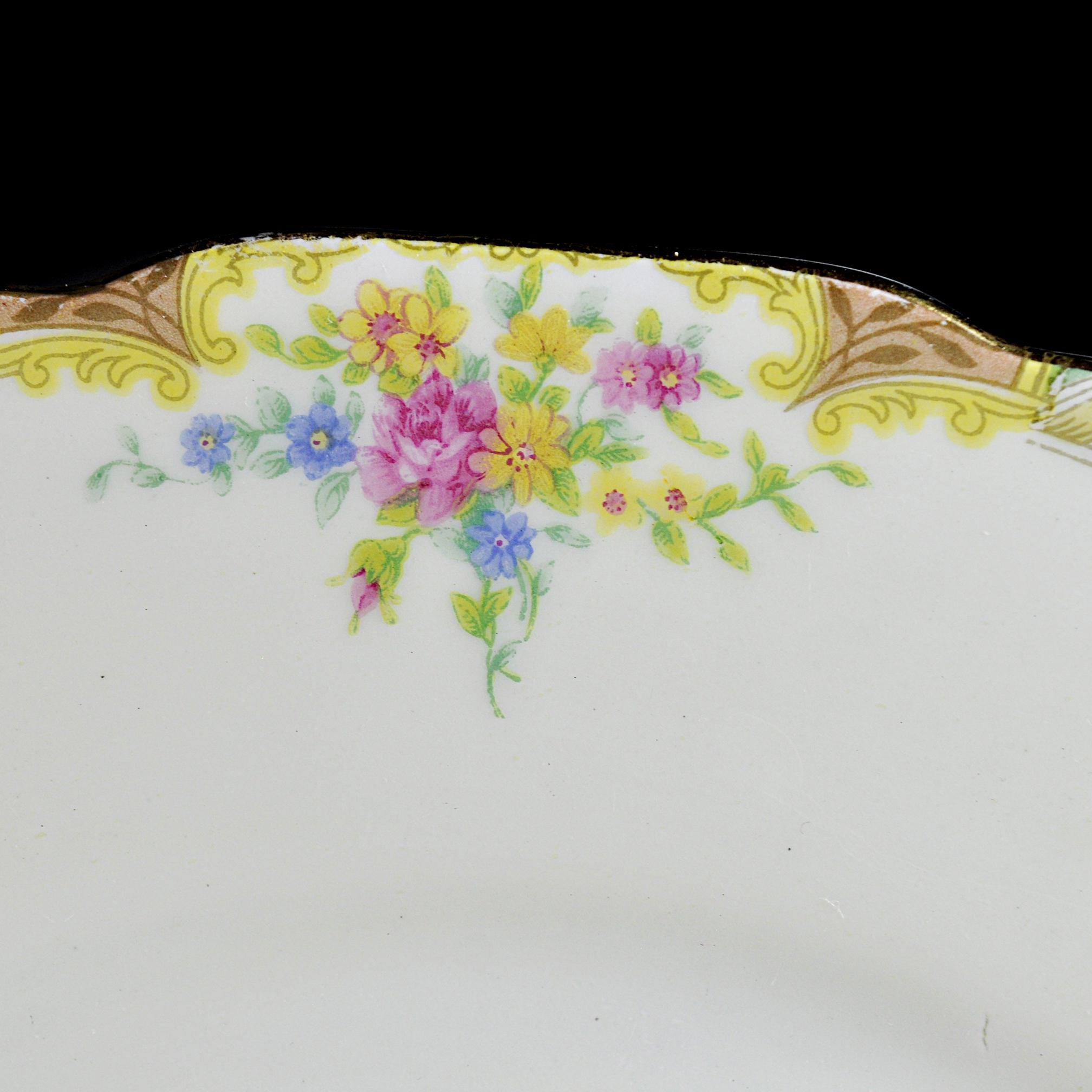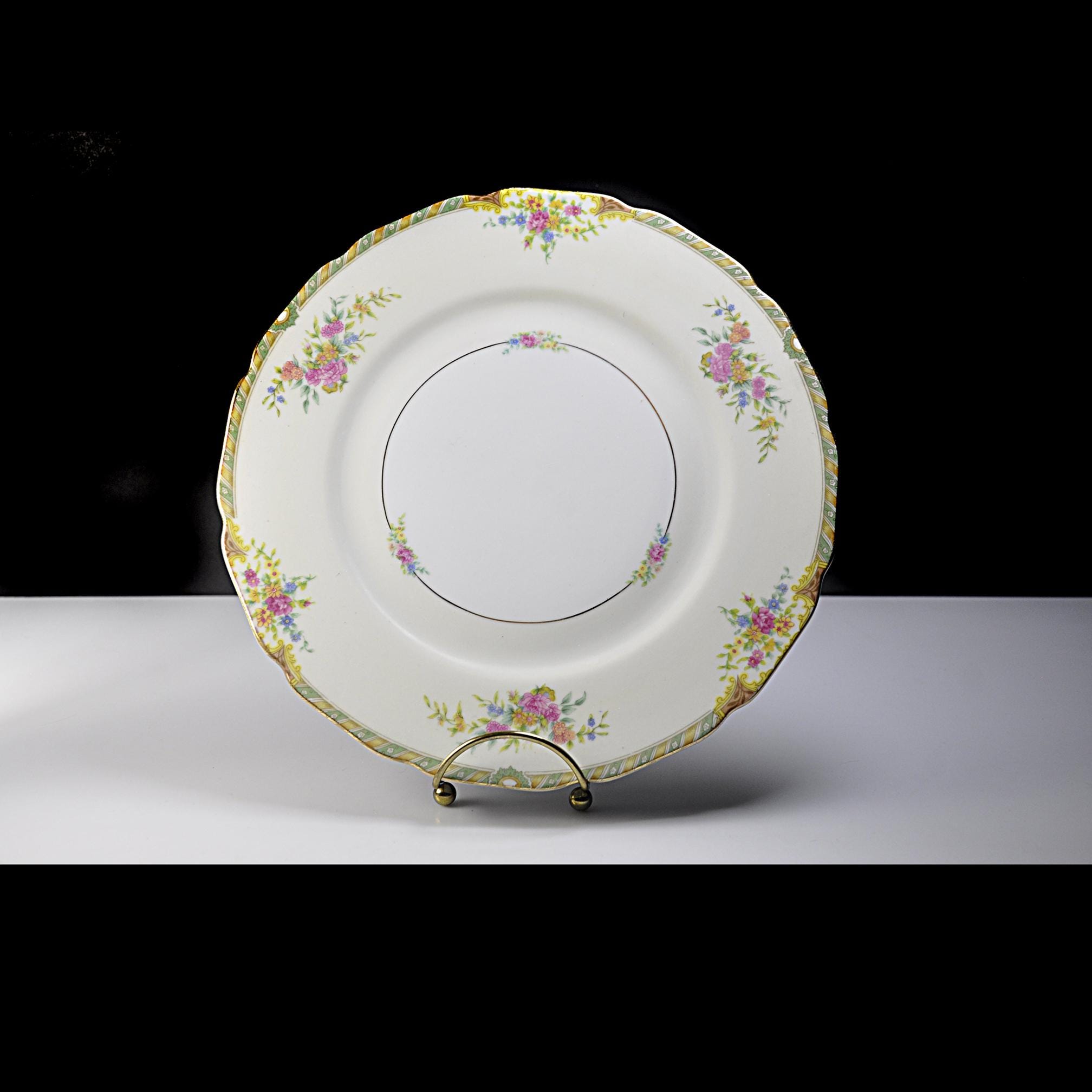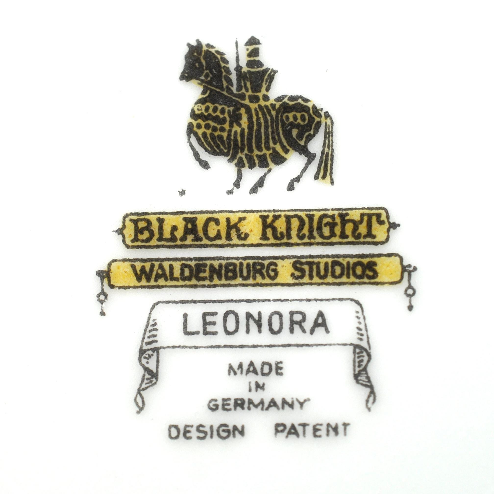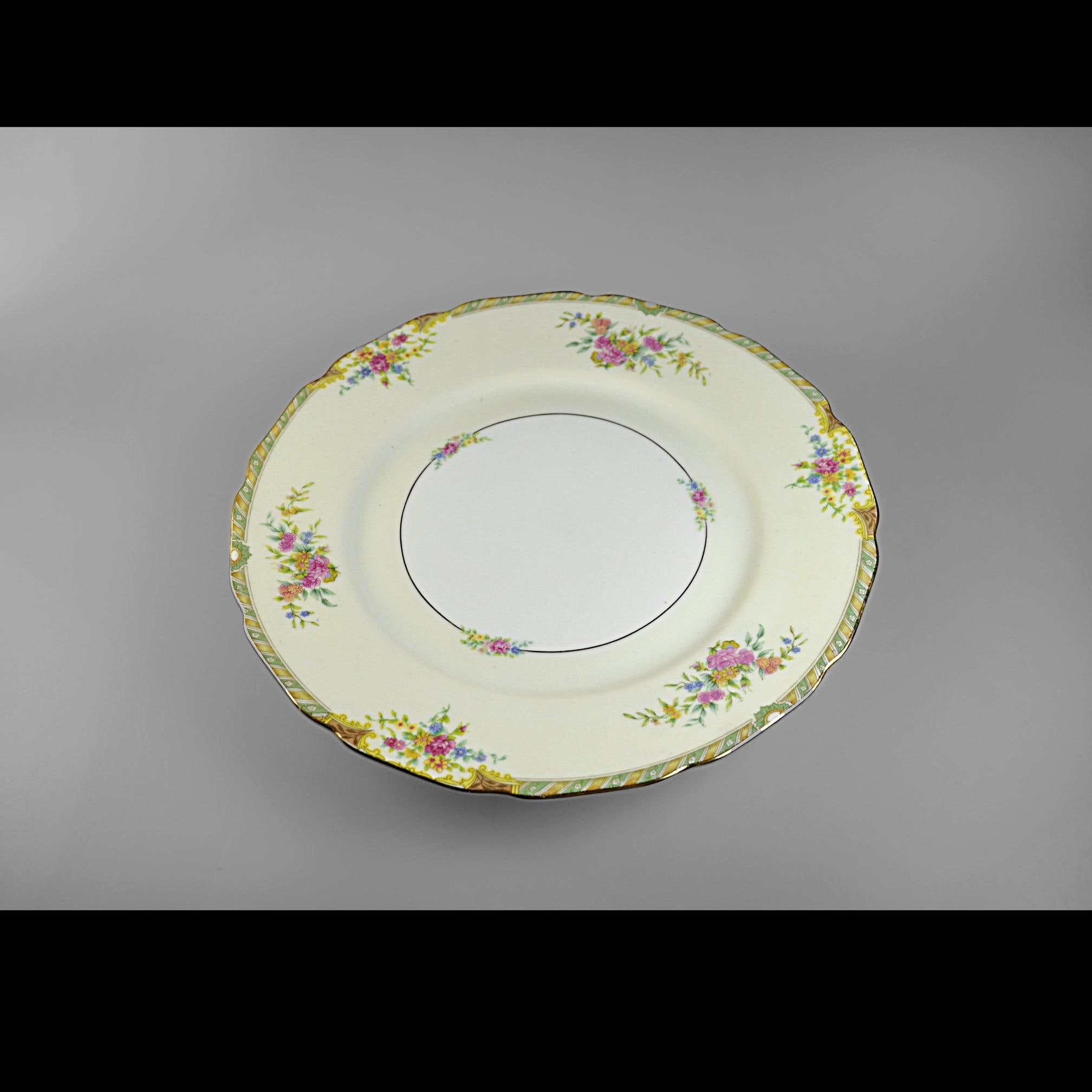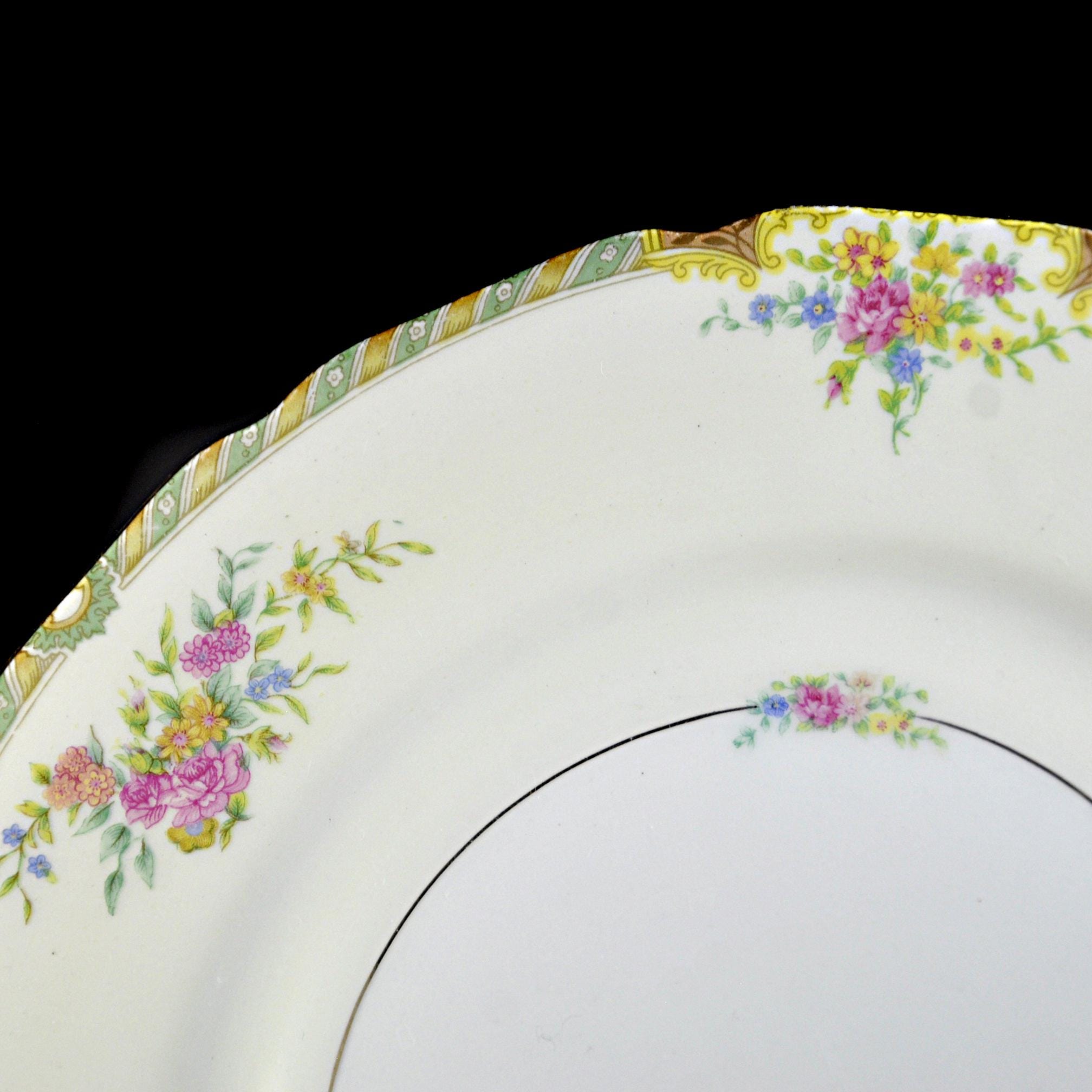 This is a vintage Black Knight dinner plate in the Leonora pattern, made in Germany by Waldenburg Studios and dating to the interwar period, circa 1925–1939. The plate measures 10 inches in diameter and features soft floral bouquets in pink, yellow, and blue, accented with a green and gilt border and a gently scalloped edge. The decoration is refined and balanced—classic European table china made for export to the American market before World War II. This piece works well as a replacement plate, a display plate, or as part of a traditional floral table setting. Plates of this age and condition are getting harder to find.