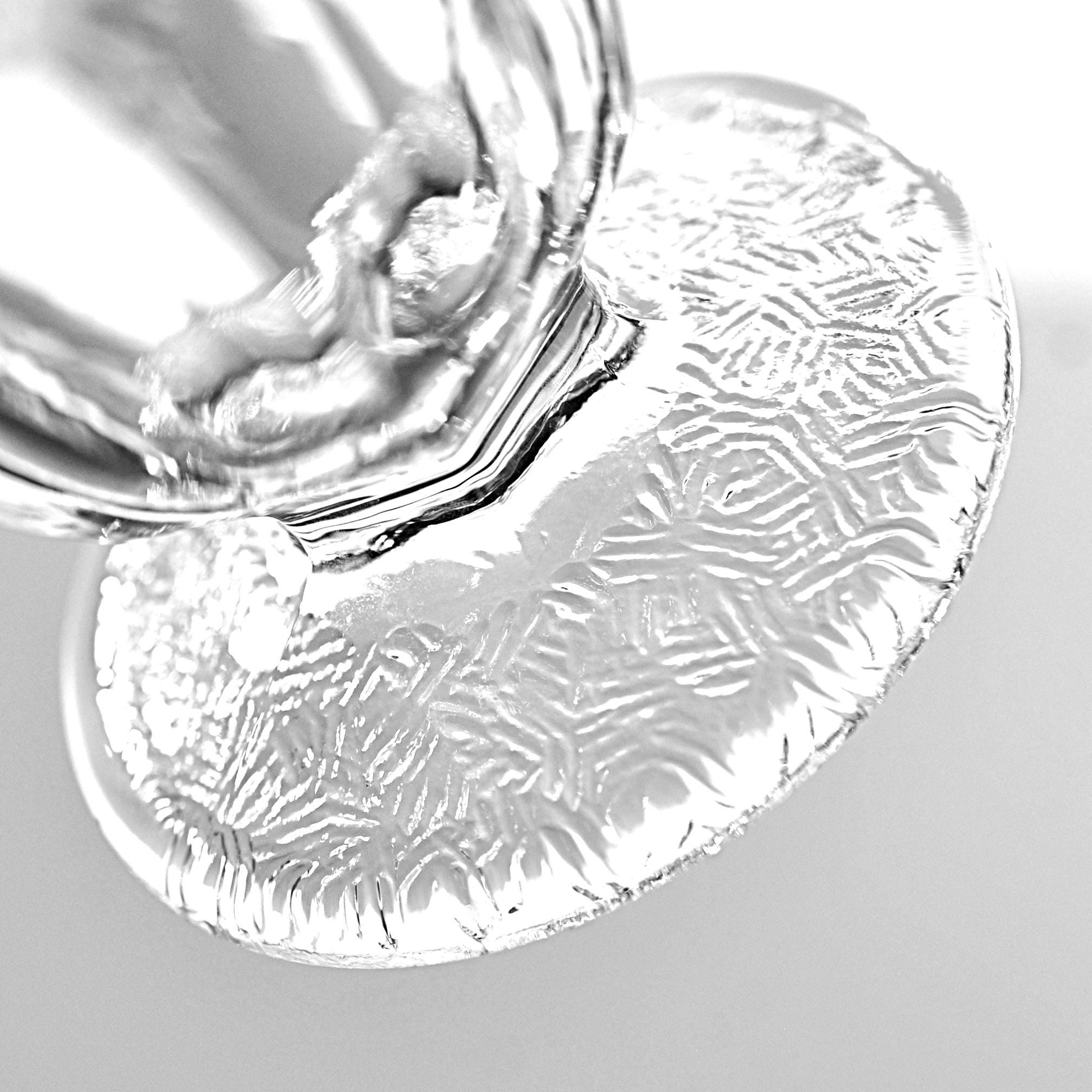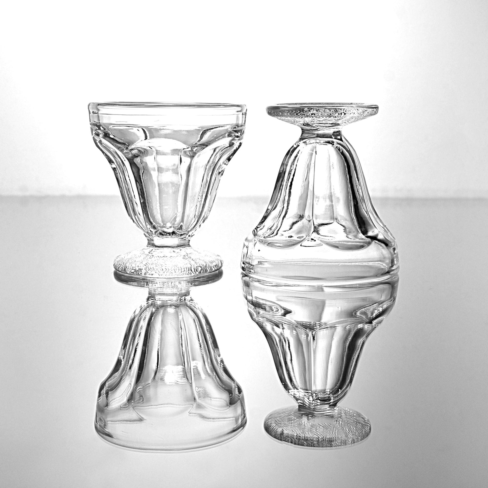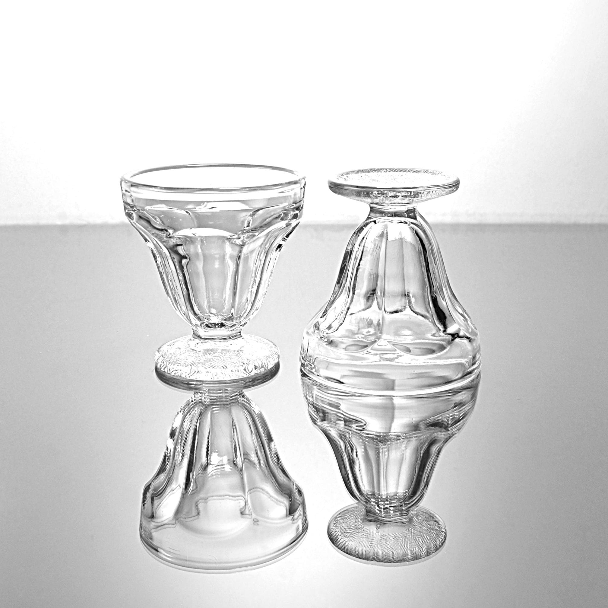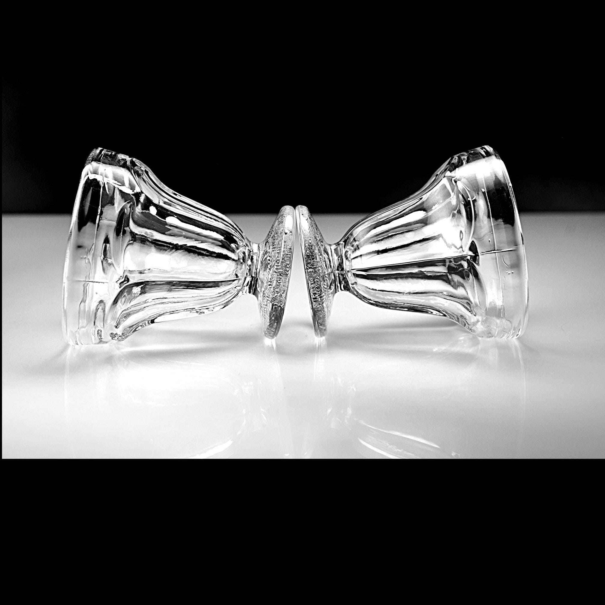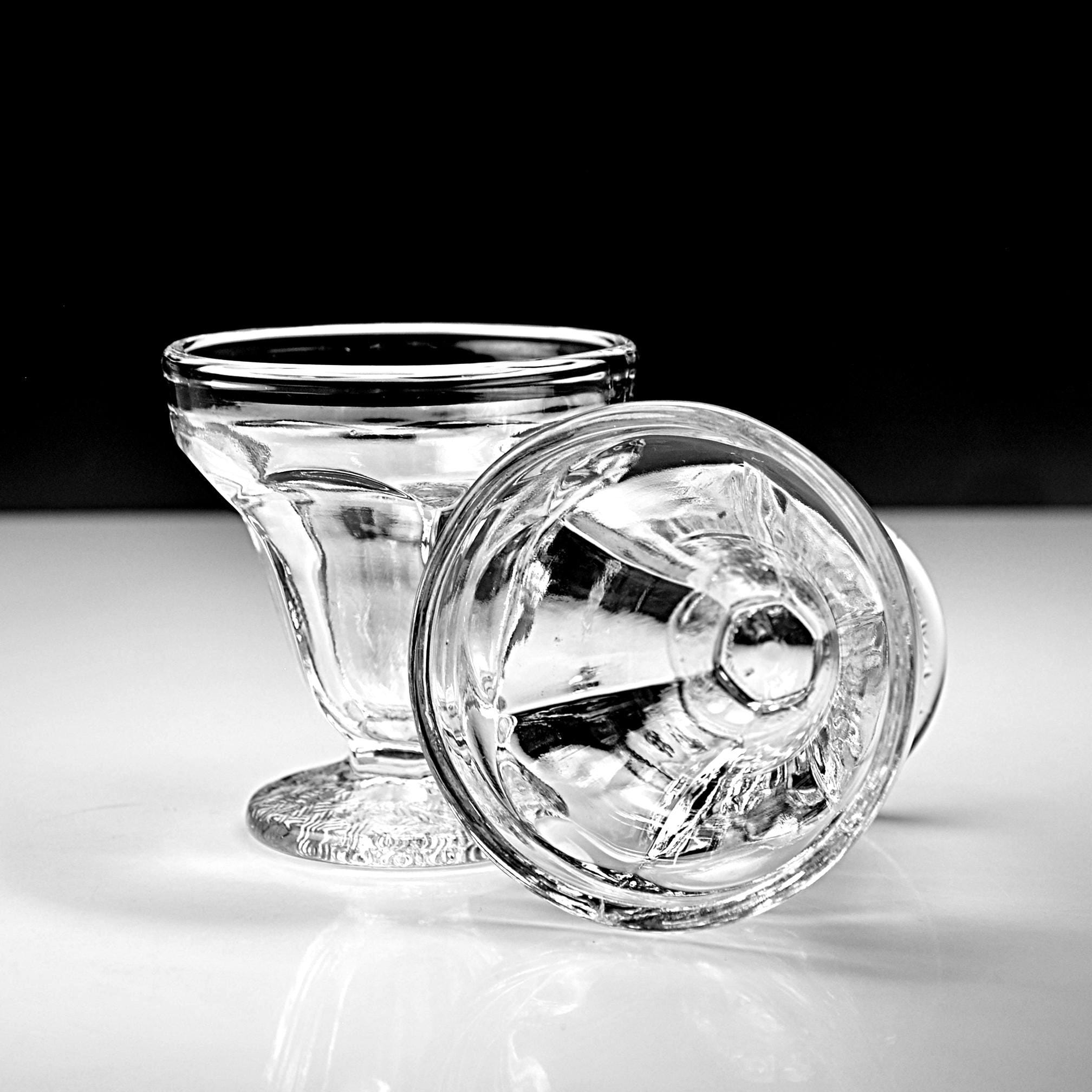 This is a set of two small vintage glass sherbet cups, standing 3¼ inches tall and 3 inches across the top. They have a paneled bowl and a nicely textured foot that gives them just enough detail without being fussy. If you’re putting together a cottage-style kitchen or just need a pair of small dessert cups that feel a little more special than modern glassware, these will do the job.