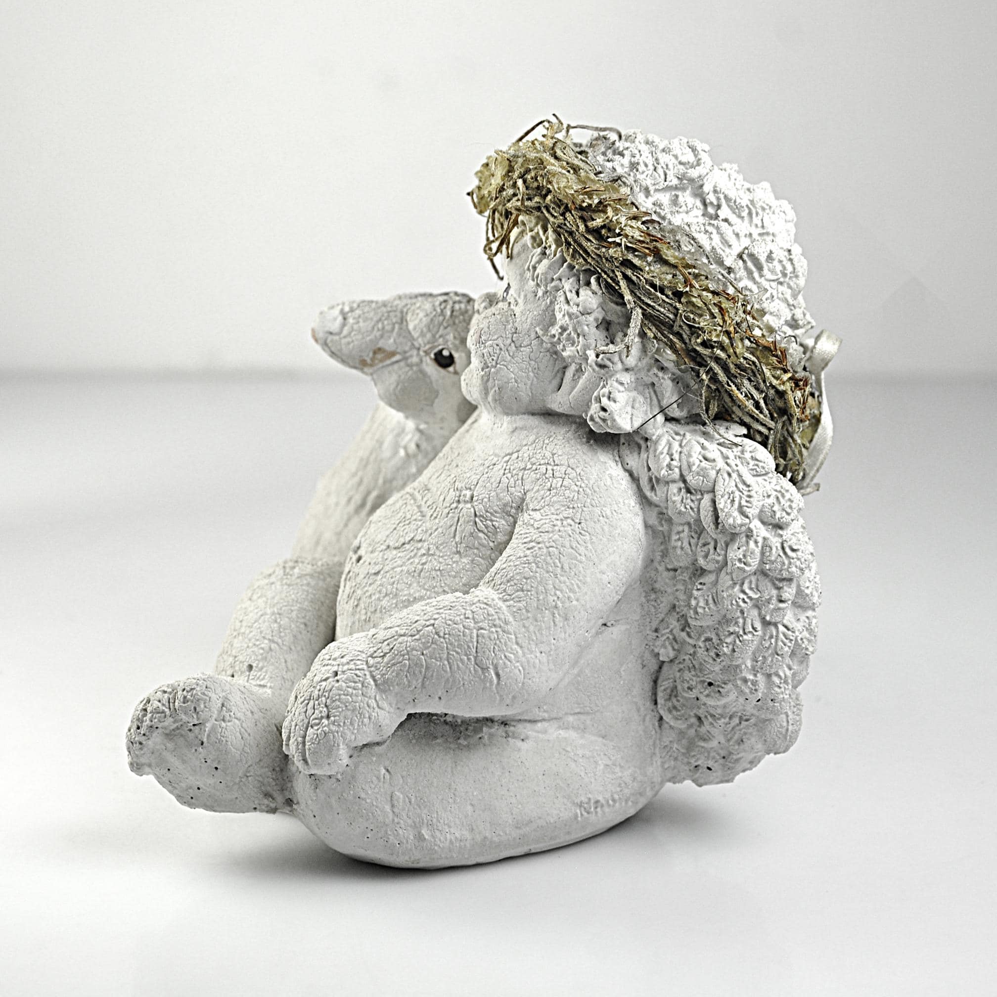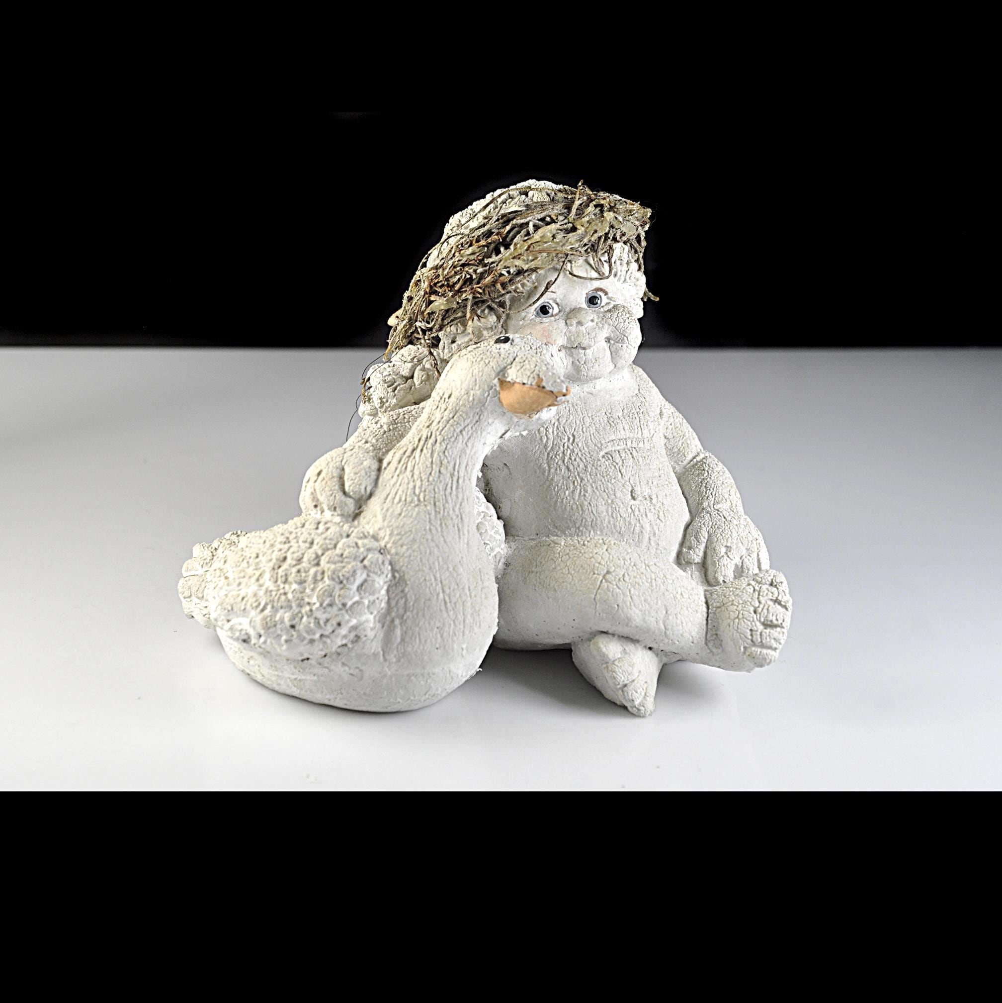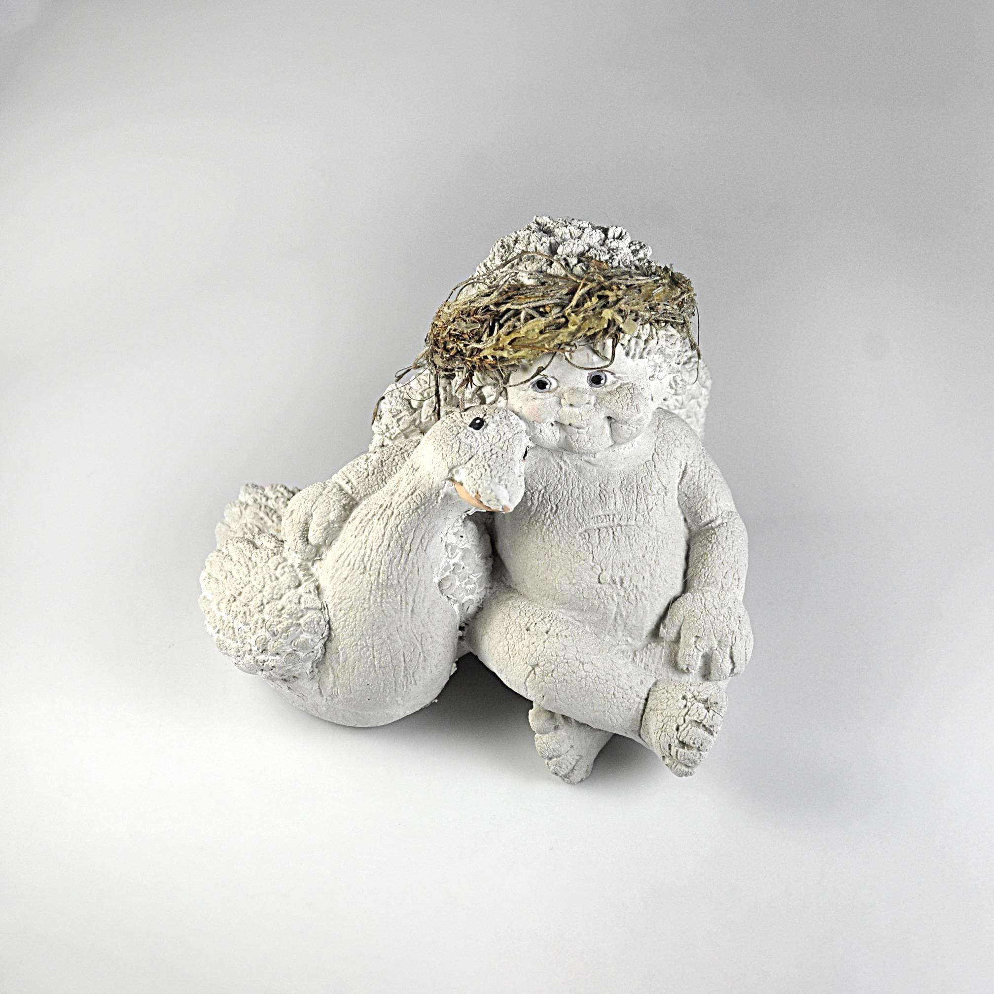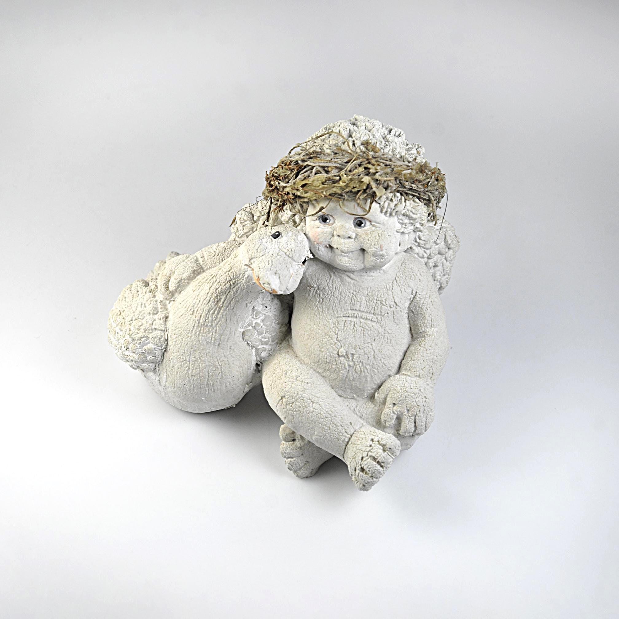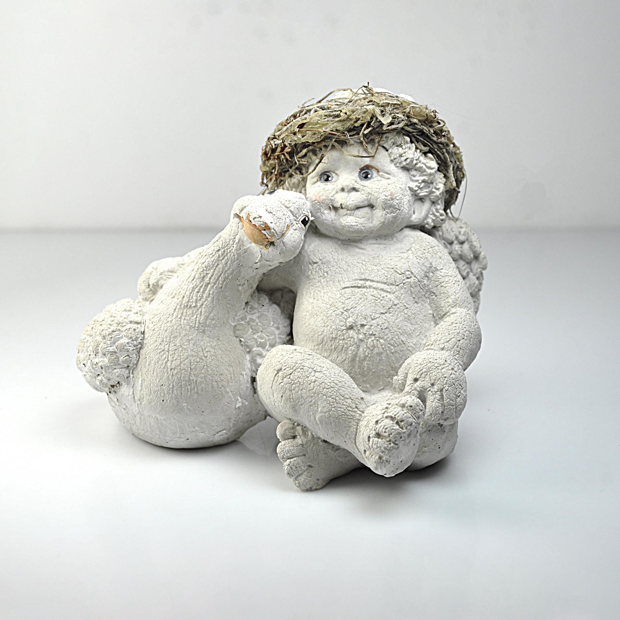 This sweet little cherub is just waiting to be loved again. He’s sitting comfortably beside his goose, wings resting quietly on his back, looking as content as can be. This Dreamsicles figurine, titled “Me and My Shadow,” captures that gentle charm so many of us remember. The soft ivory finish, textured surface, and rustic straw cap give it that classic early Dreamsicles look. He’s made of solid resin and has a nice weight to him. Perfect for a Dreamsicles collector or for anyone who loves cherubs.