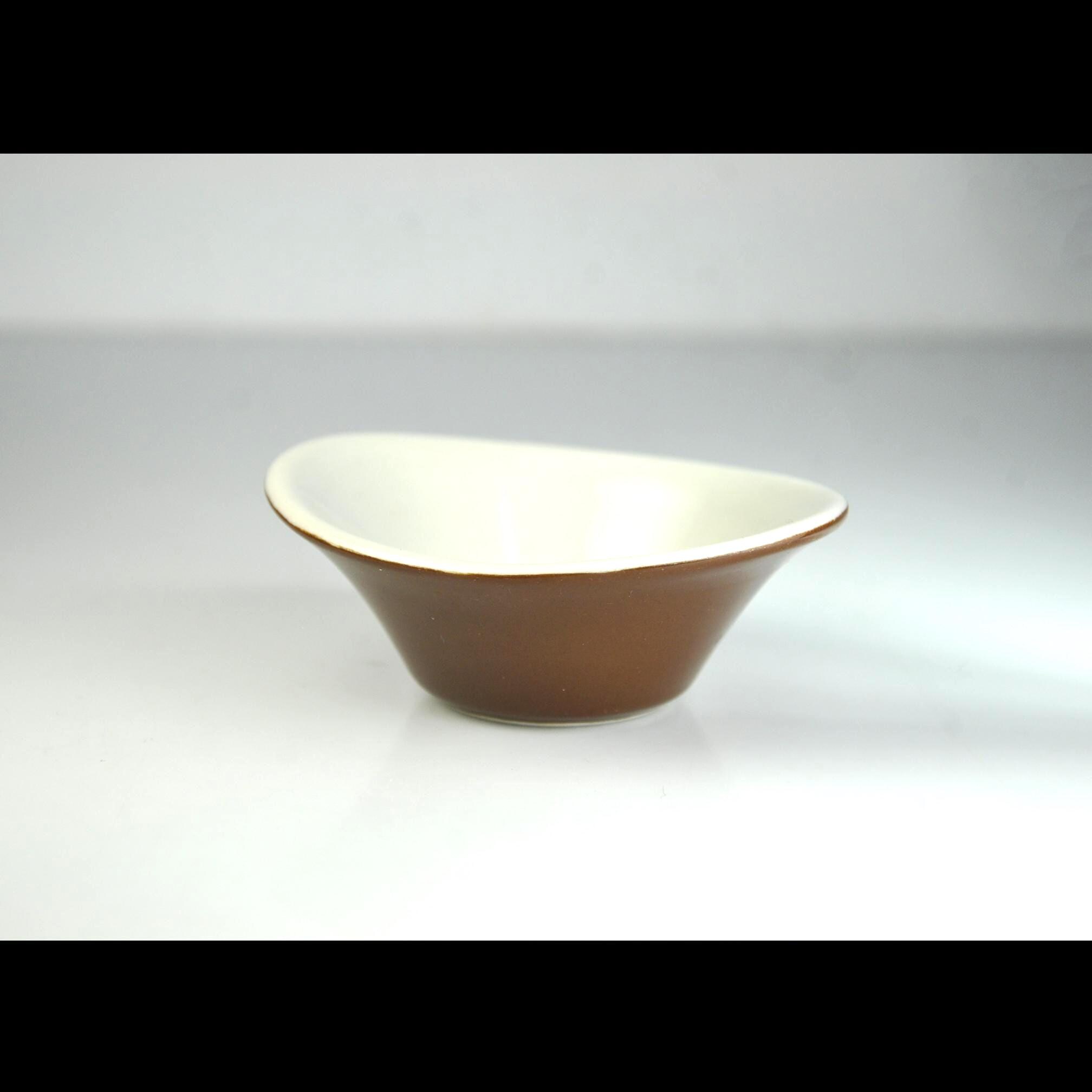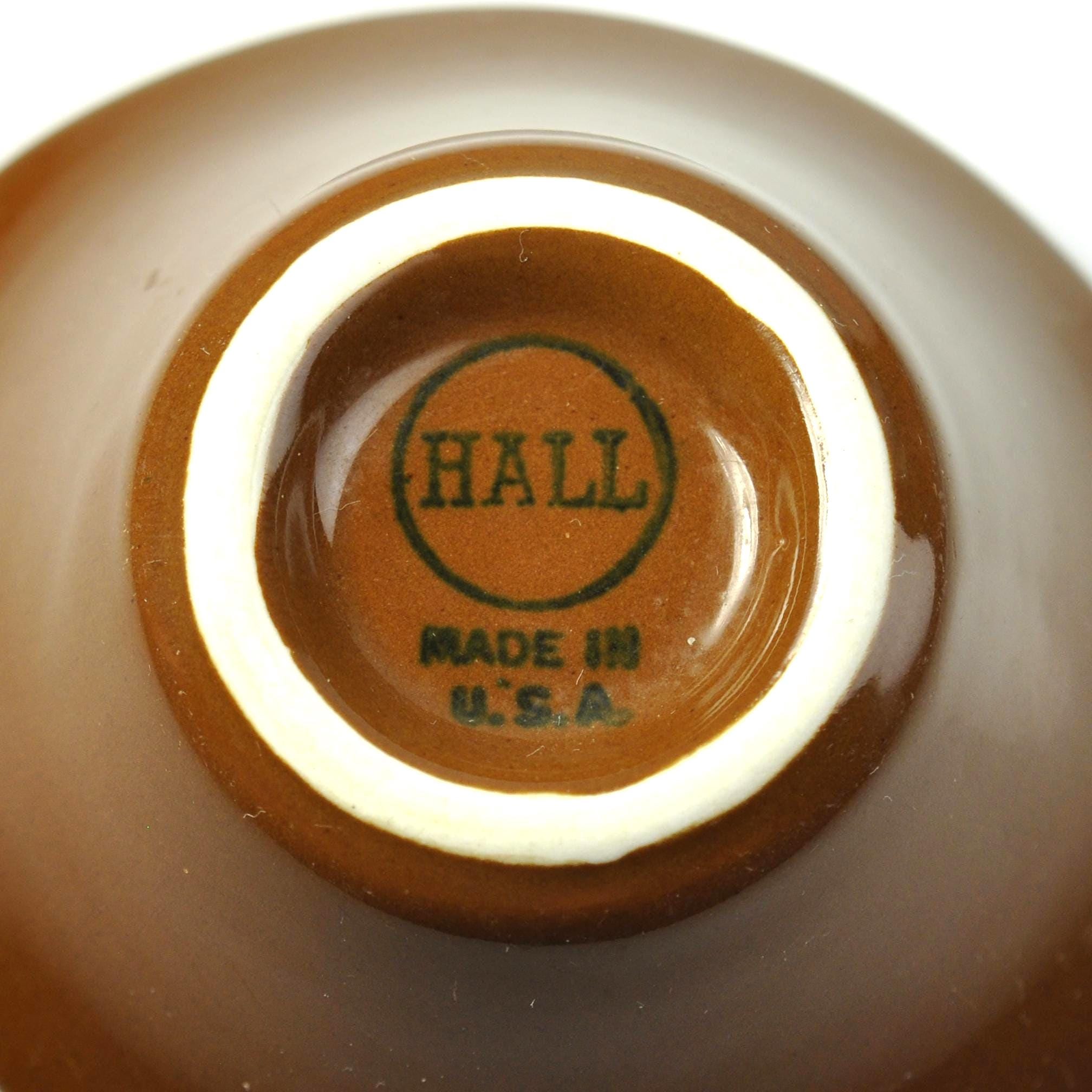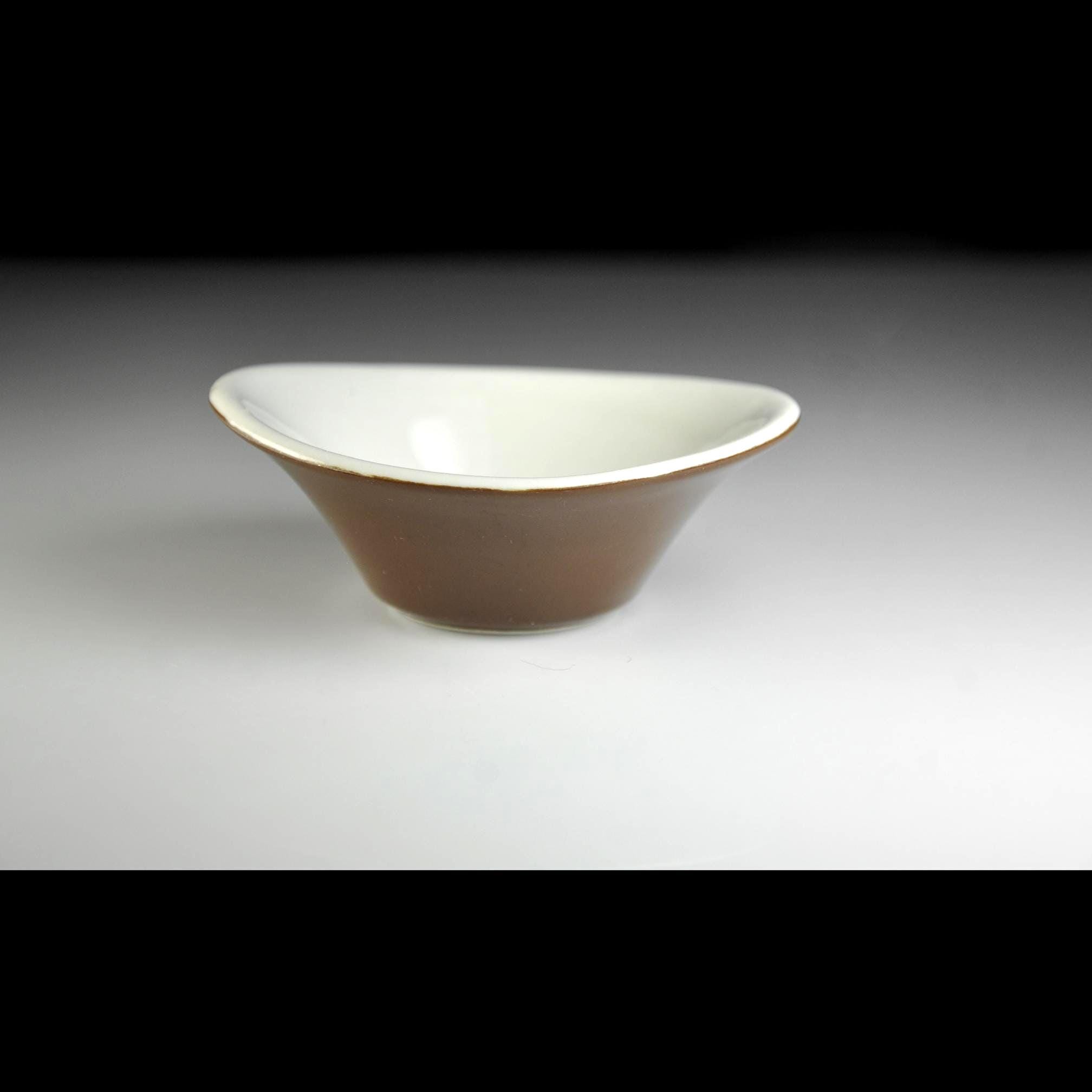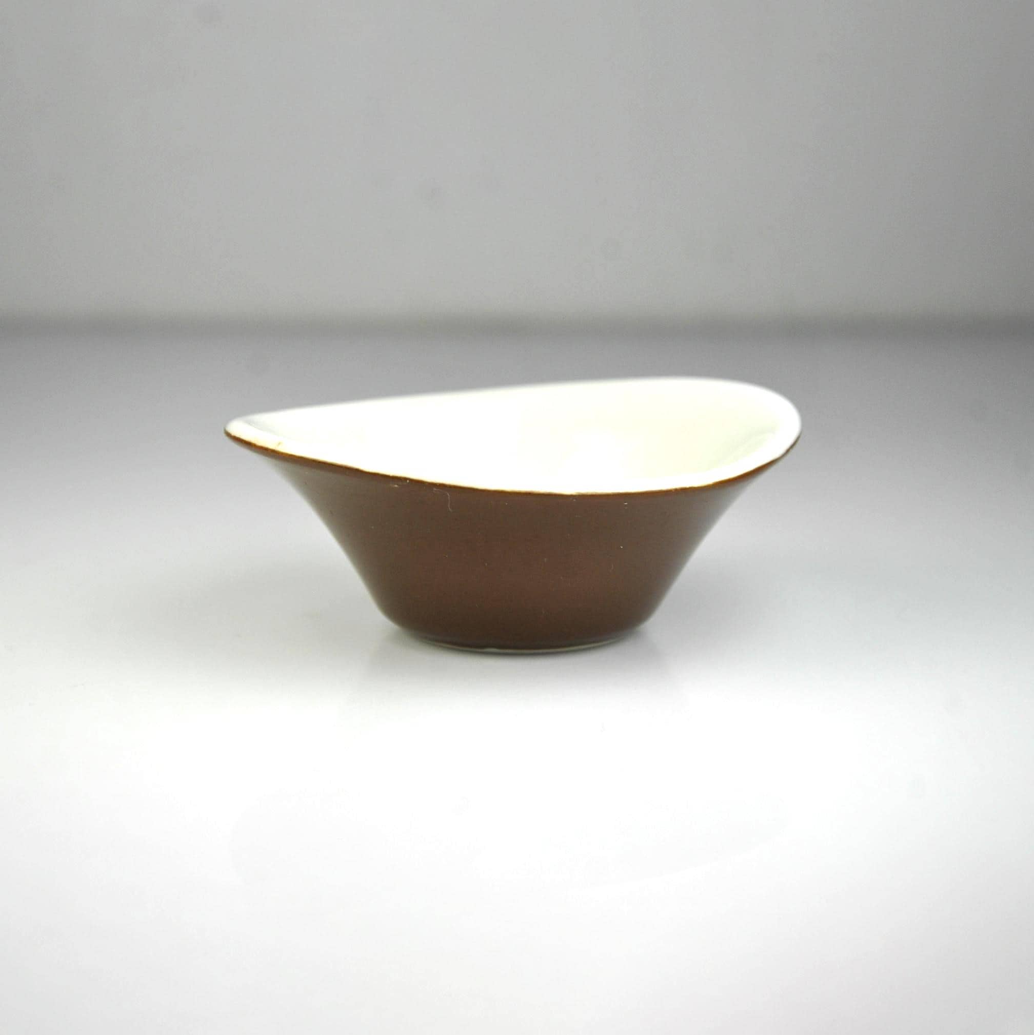 This little bowl was made to work in a restaurant atmosphere. Stamped Hall Made in USA on its bottom. Hall is a name that built its reputation on sturdy American-made china that could handle daily use without complaint. The deep brown glaze on the outside and clean white interior gives it that classic mid-century look that still feels right at home today. Originally, bowls like this were used for small servings — butter, jam, relishes, sauces, or a scoop of something simple on the side. Today it’s just as useful. It would make a perfect little prep bowl, salt cellar, dip dish, tea bag holder, change holder, or ring dish on a bedside table. Sometimes the smallest pieces are the most useful.