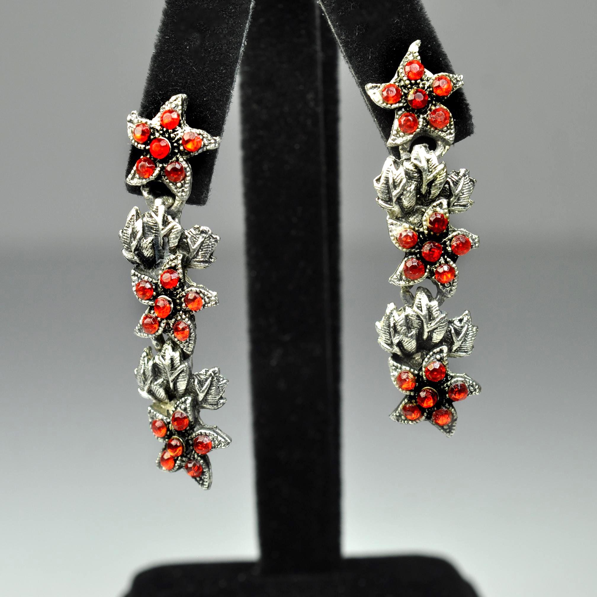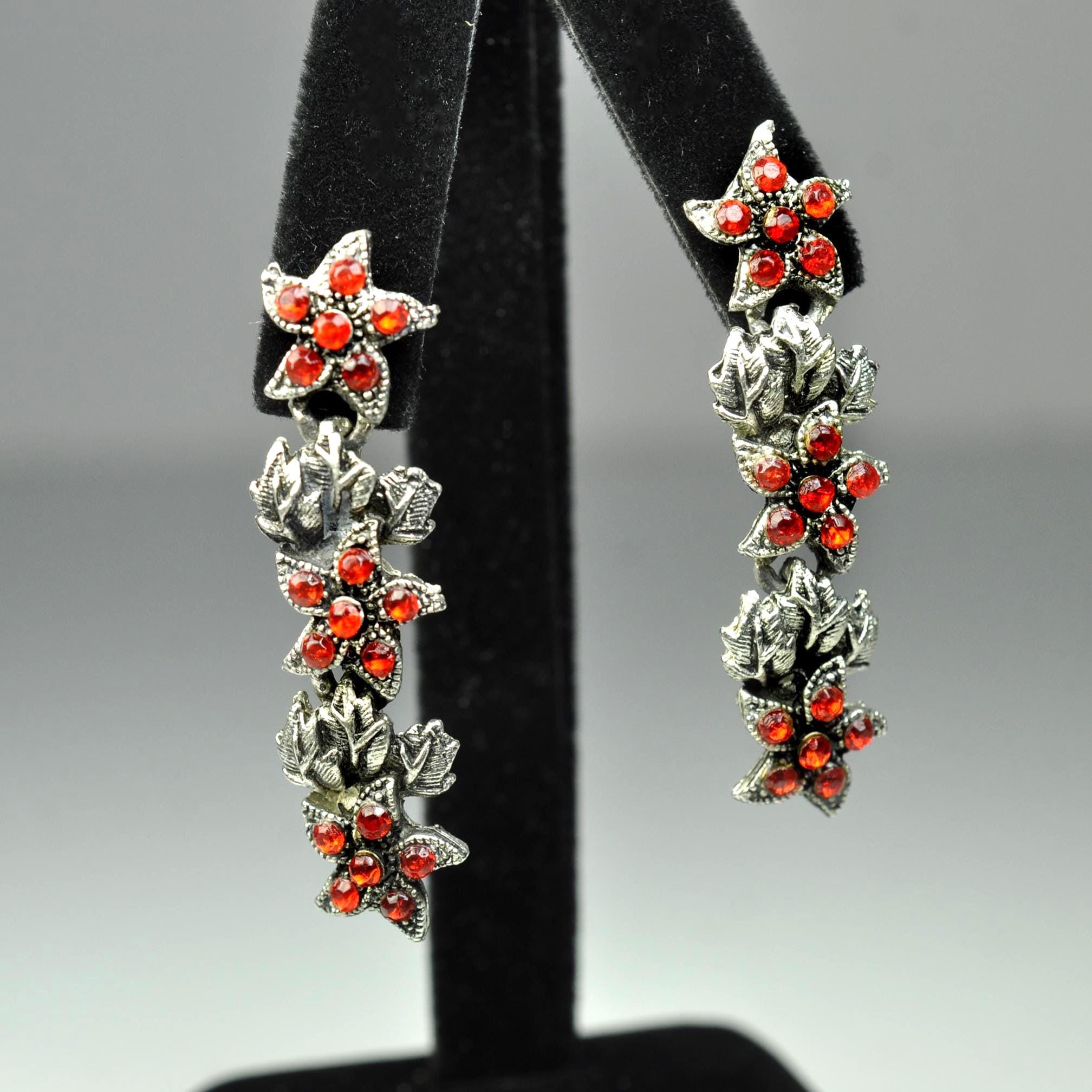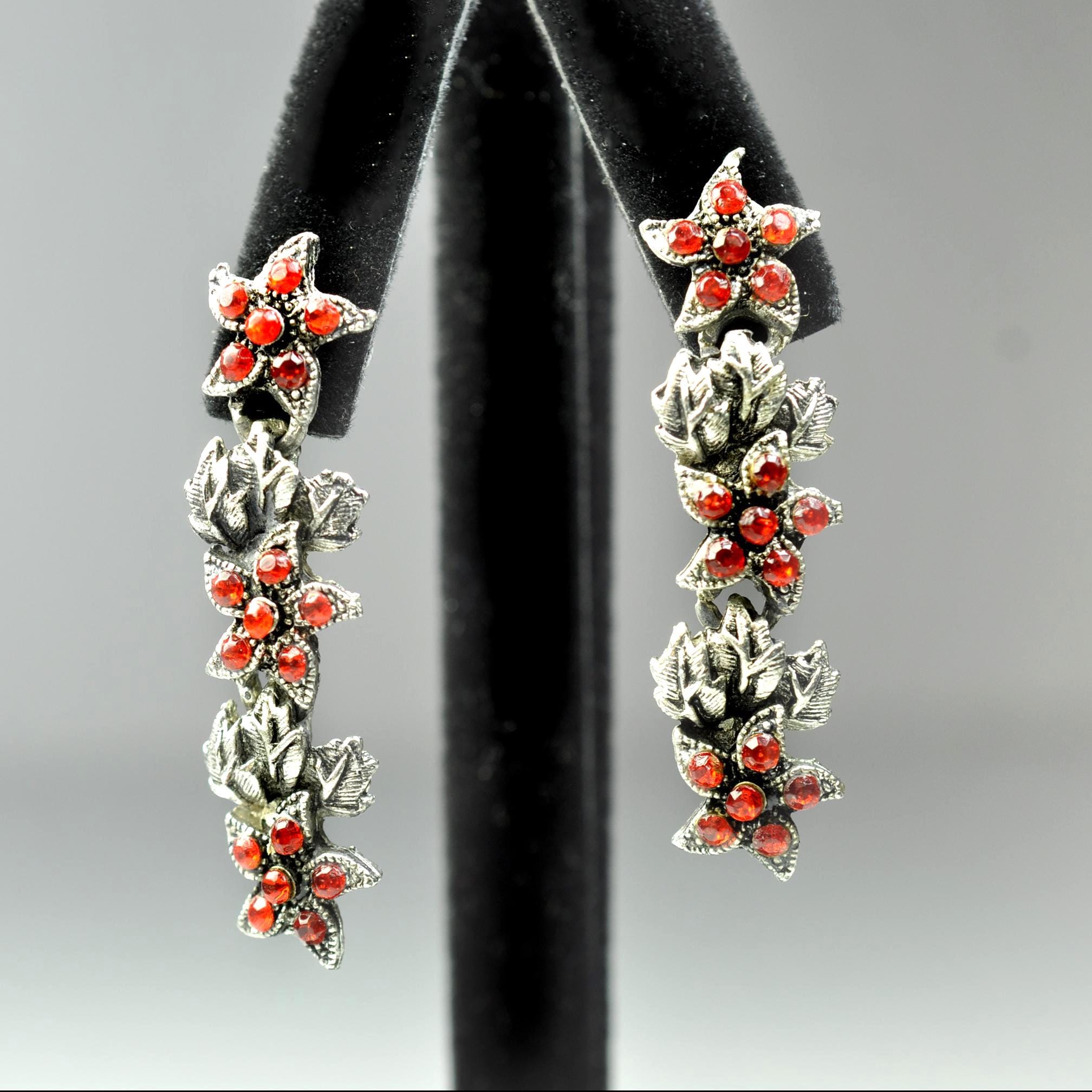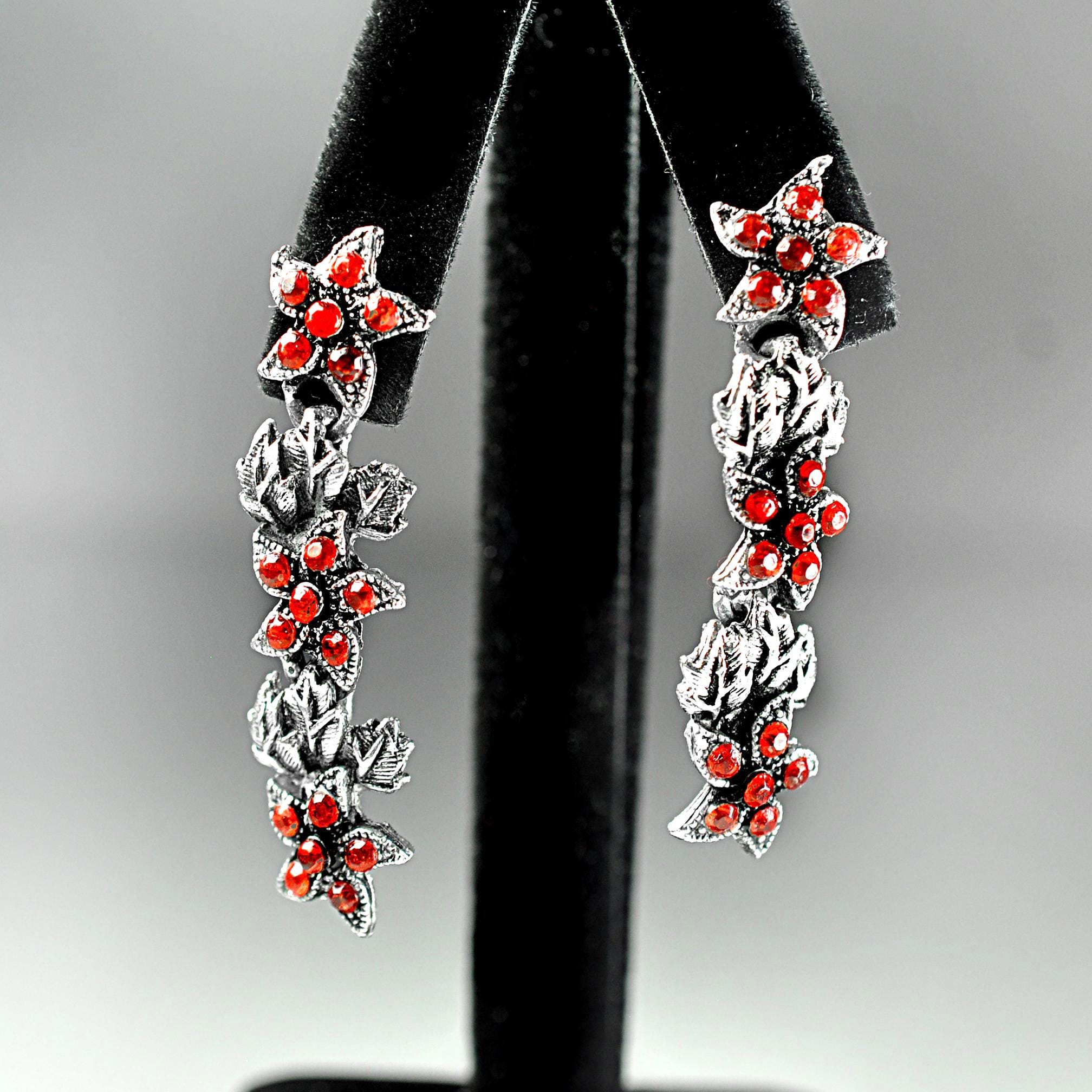 These vintage red rhinestone dangle earrings have that old-fashioned, slightly dramatic look that never really goes out of style. The silver tone leaves are textured and dimensional, with bright red stones nestled in like berries along the vine. They catch the light beautifully without looking overdone. They measure 2 inches in length, giving them just enough movement to feel special, but they’re still comfortable for everyday wear. Post backs with secure fittings. They are beautiful botanical jewelry — romantic, a little moody, and classic. A lovely statement pair that works year-round and adds a bit of depth to any outfit.