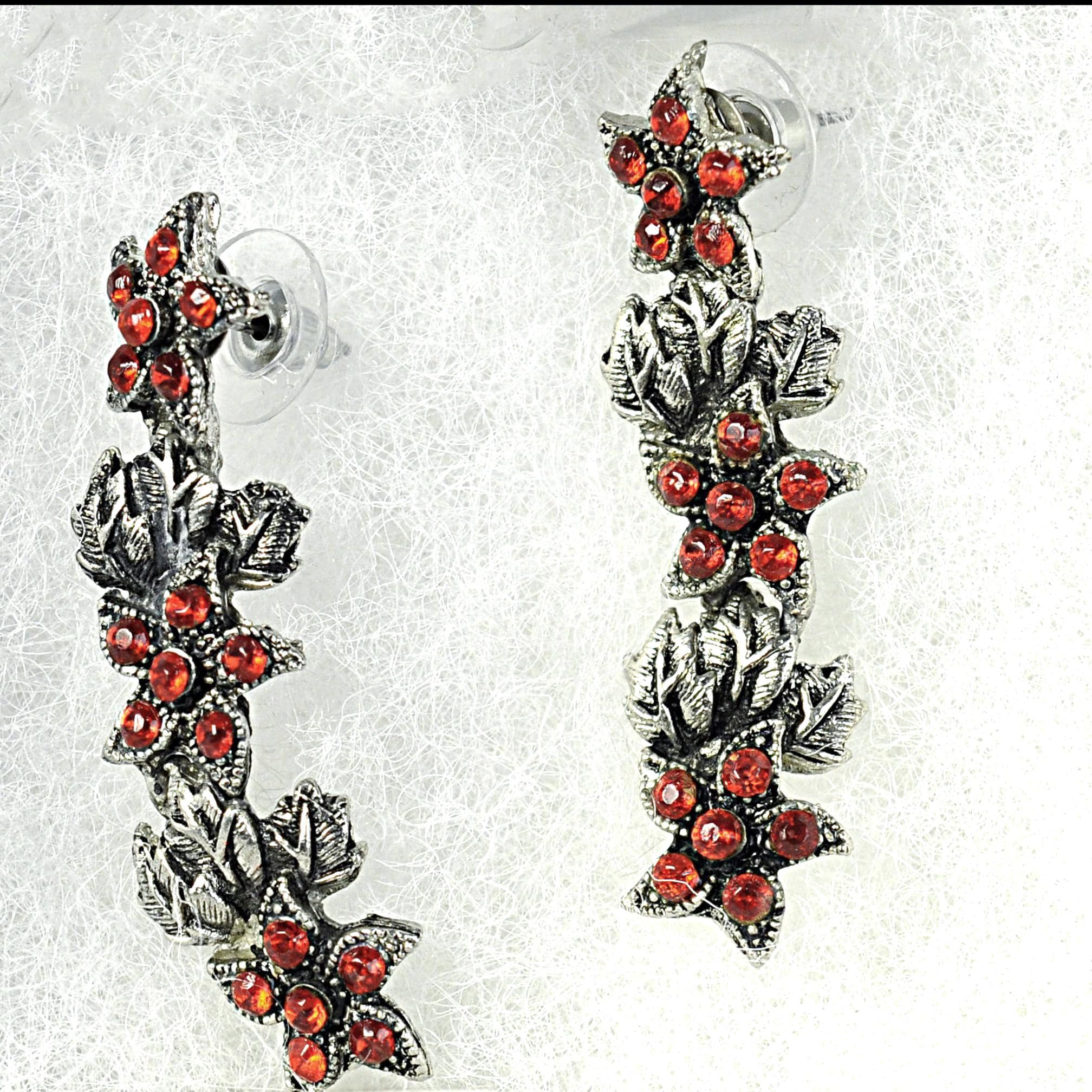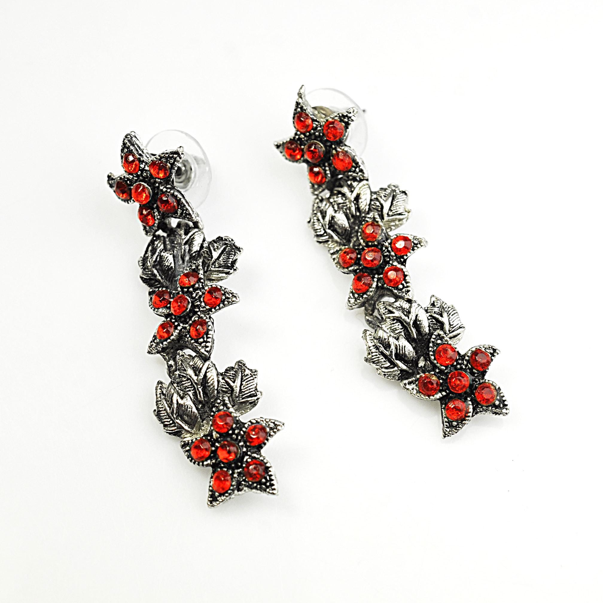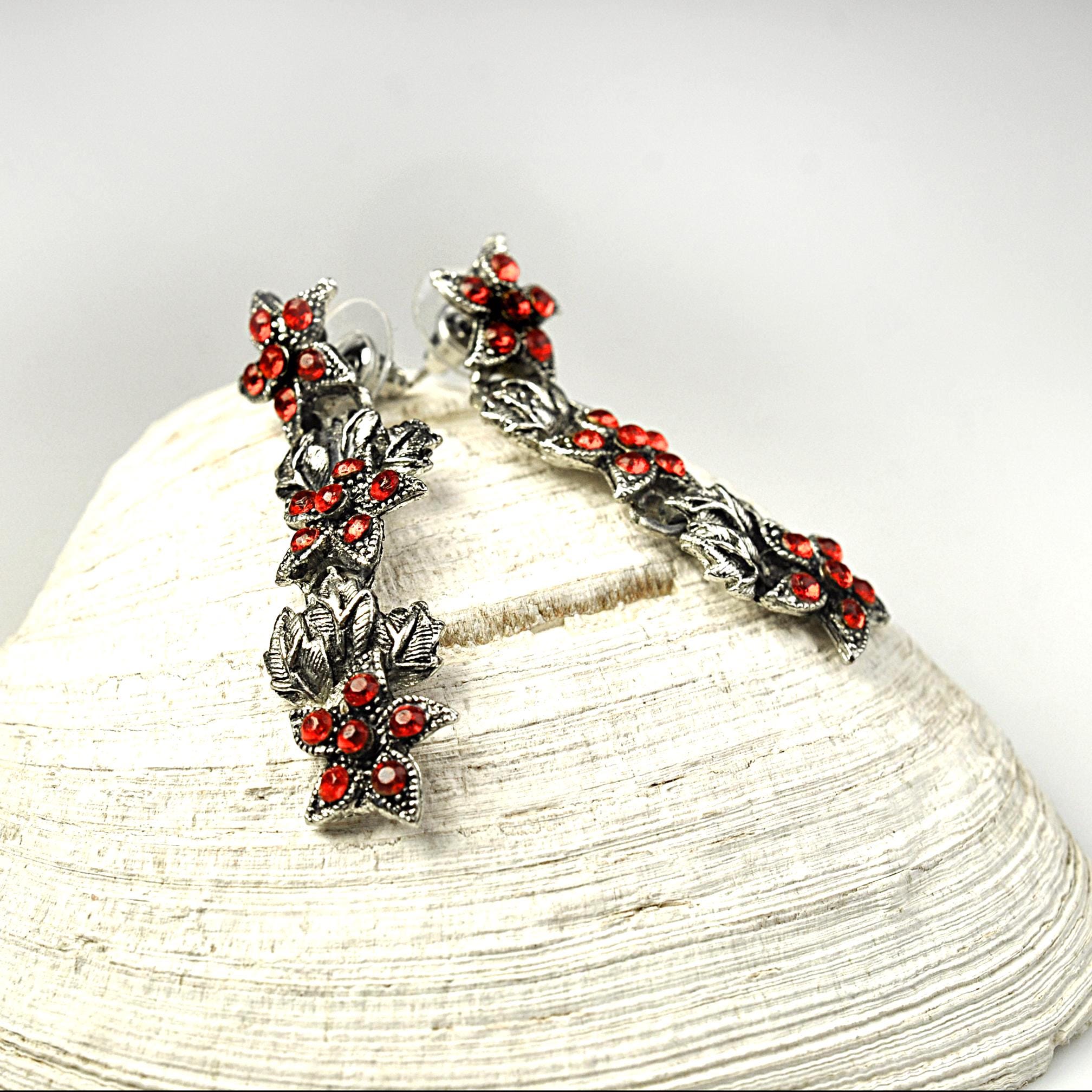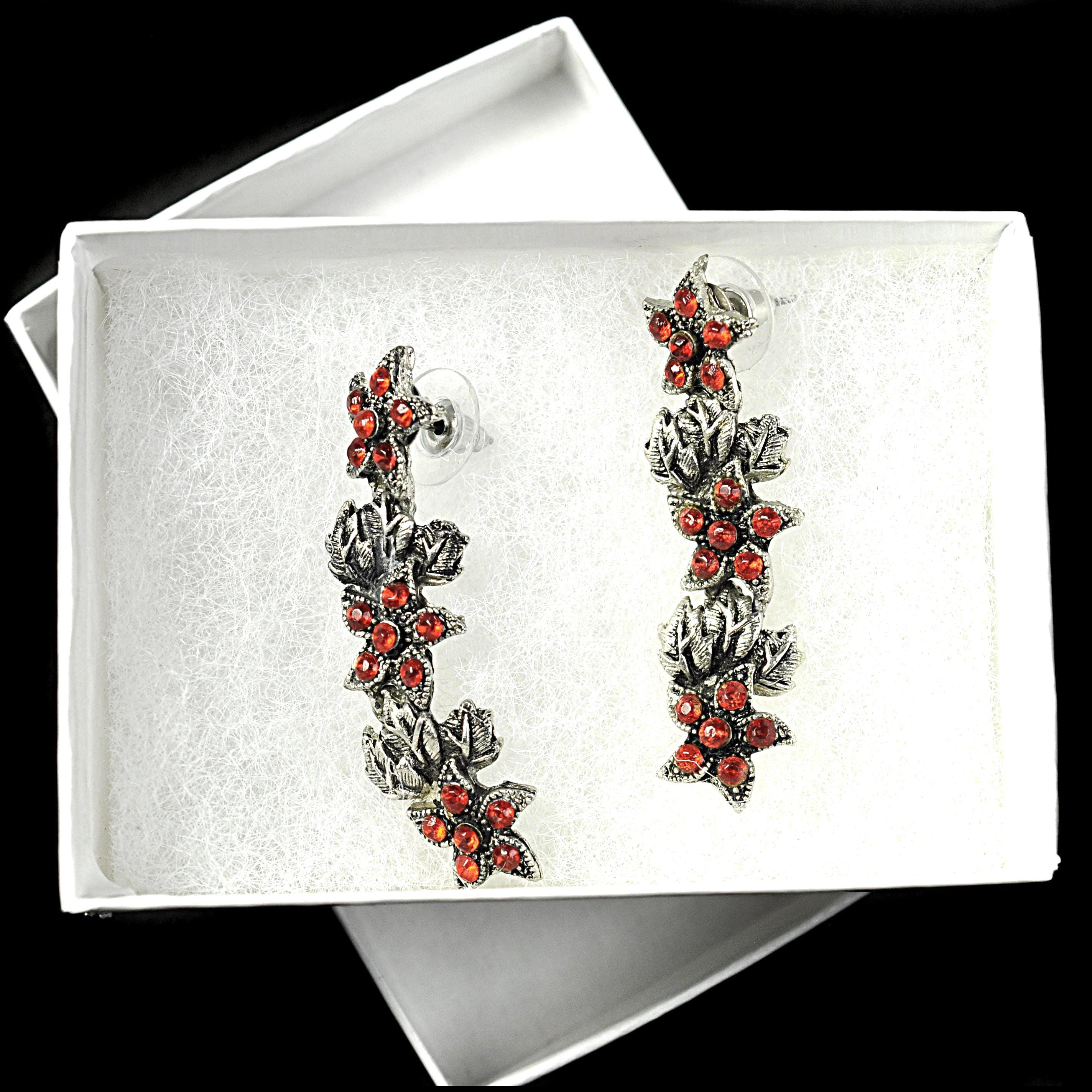 These vintage red rhinestone dangle earrings have that old-fashioned, slightly dramatic look that never really goes out of style. The silver tone leaves are textured and dimensional, with bright red stones nestled in like berries along the vine. They catch the light beautifully without looking overdone. They measure 2 inches in length, giving them just enough movement to feel special, but they’re still comfortable for everyday wear. Post backs with secure fittings. They are beautiful botanical jewelry — romantic, a little moody, and classic. A lovely statement pair that works year-round and adds a bit of depth to any outfit.