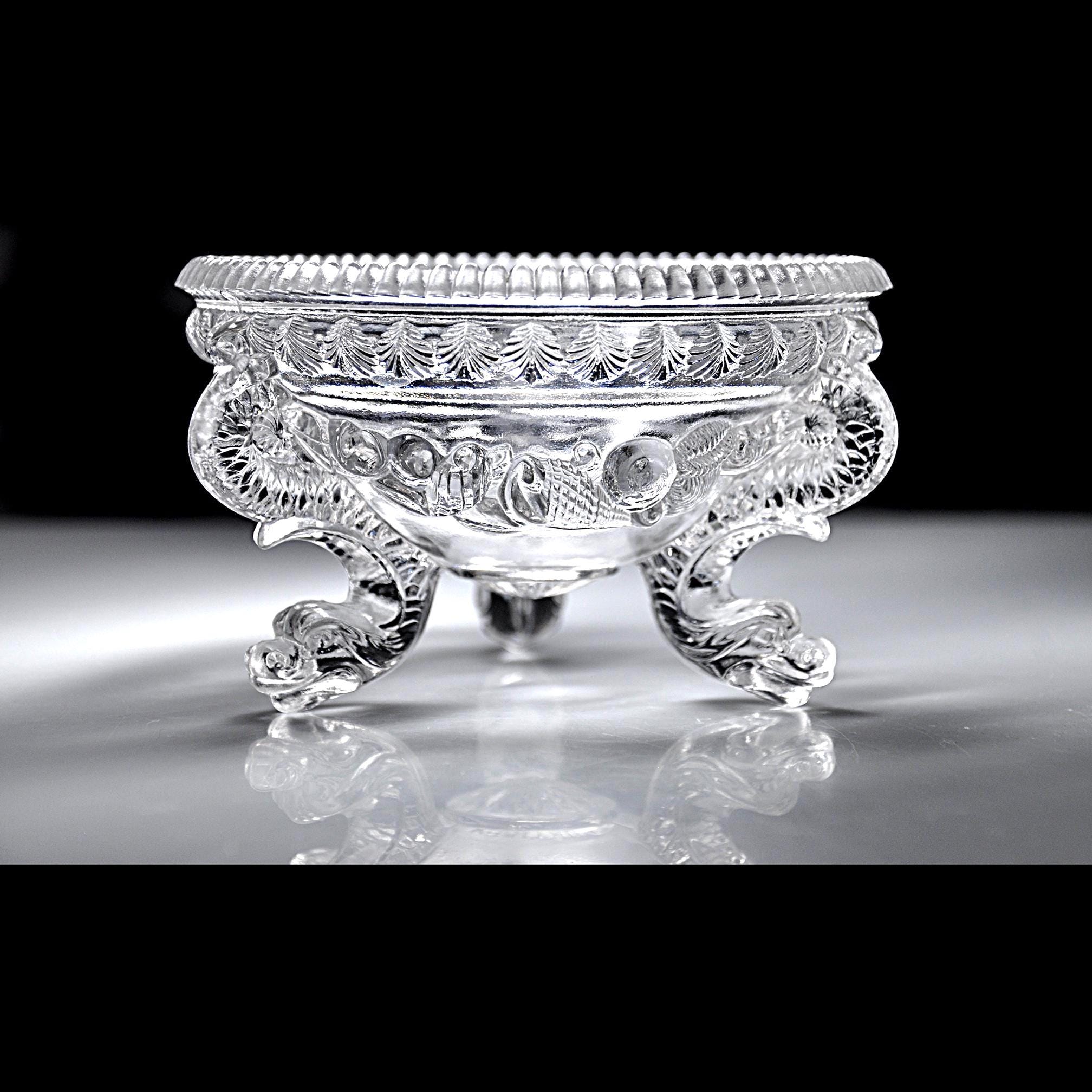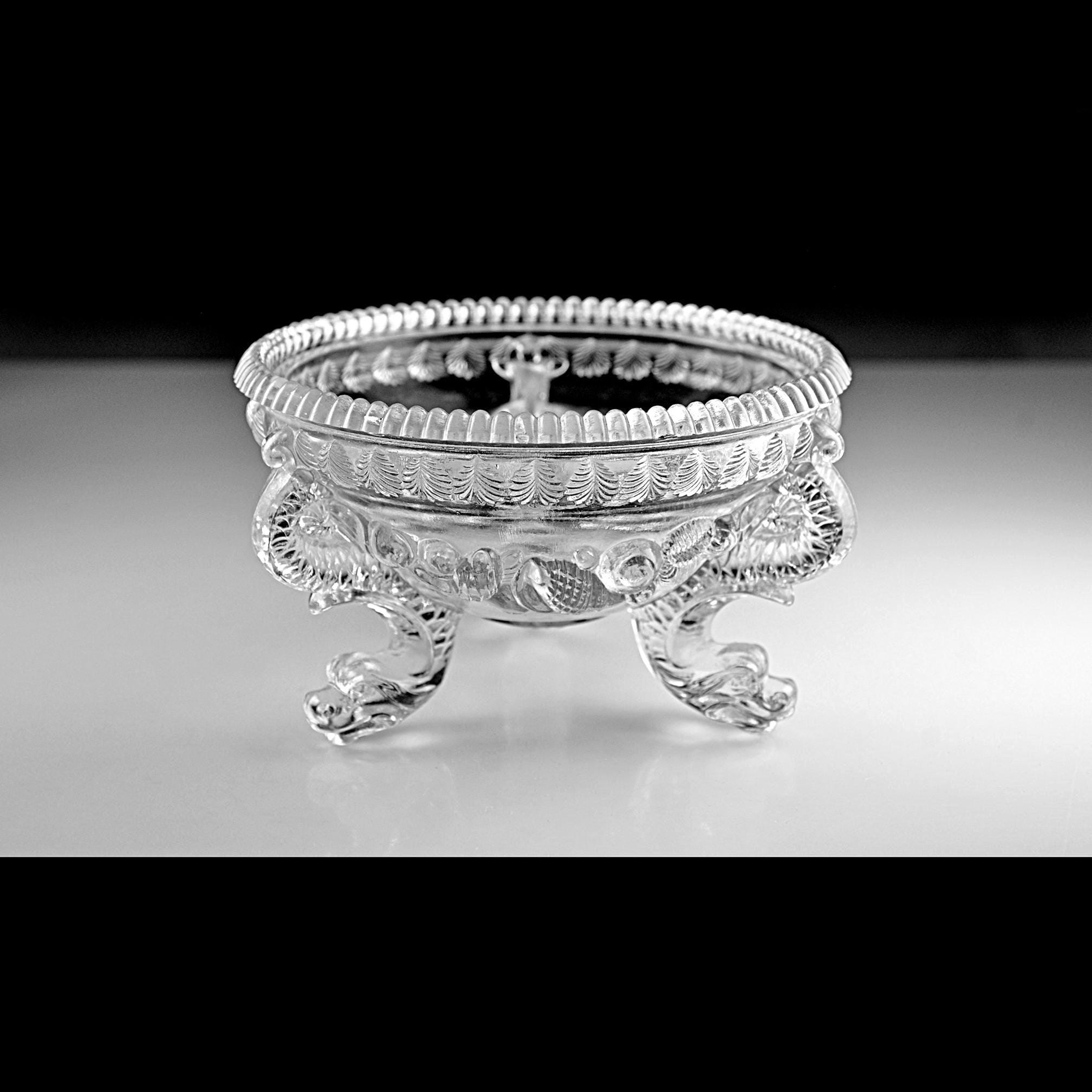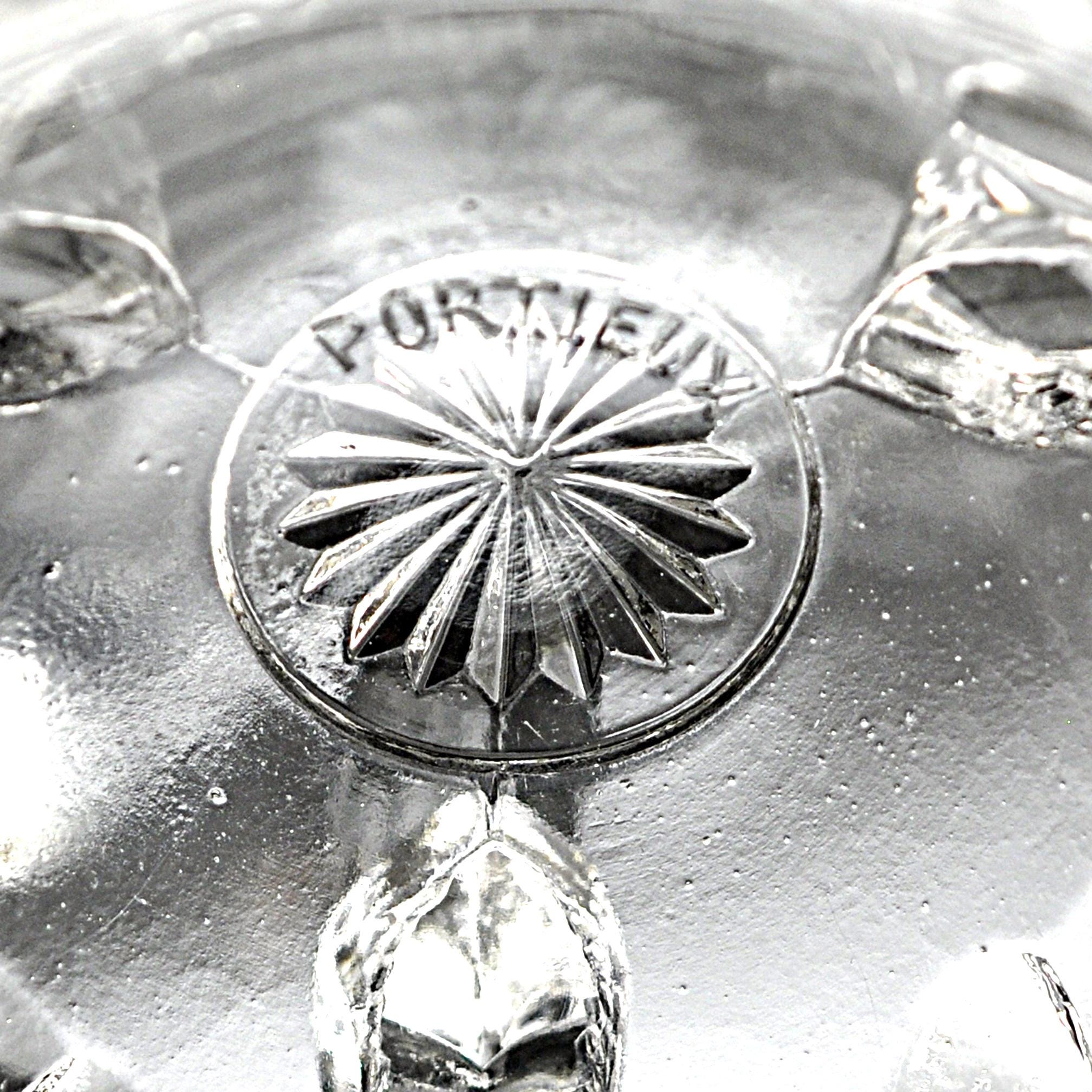 Lovely unmistakable late 19th-century French glass. The weight, the depth of the pressing, the kind of detail that simply isn’t done today. This footed bowl was produced by Cristallerie de Portieux, one of France’s historic glassworks dating back to the 1700s. The embossed Portieux mark appears clearly on the underside within a sunburst medallion. Dating to approximately 1870–1890, this piece would originally have been a covered sugar or bonbon dish. The lid is no longer present, but the base stands beautifully on its own and reads today as an elegant pedestal bowl. What truly sets it apart are the dramatic scroll feet — often described as dragon feet — richly molded and full of movement. They give the piece presence and architectural character. Above them, a swagged garland motif wraps the body, while a crisp leaf border frames the rim. This is a refined example of Victorian French pressed glass — decorative, display-ready, and nearly 150 years old.