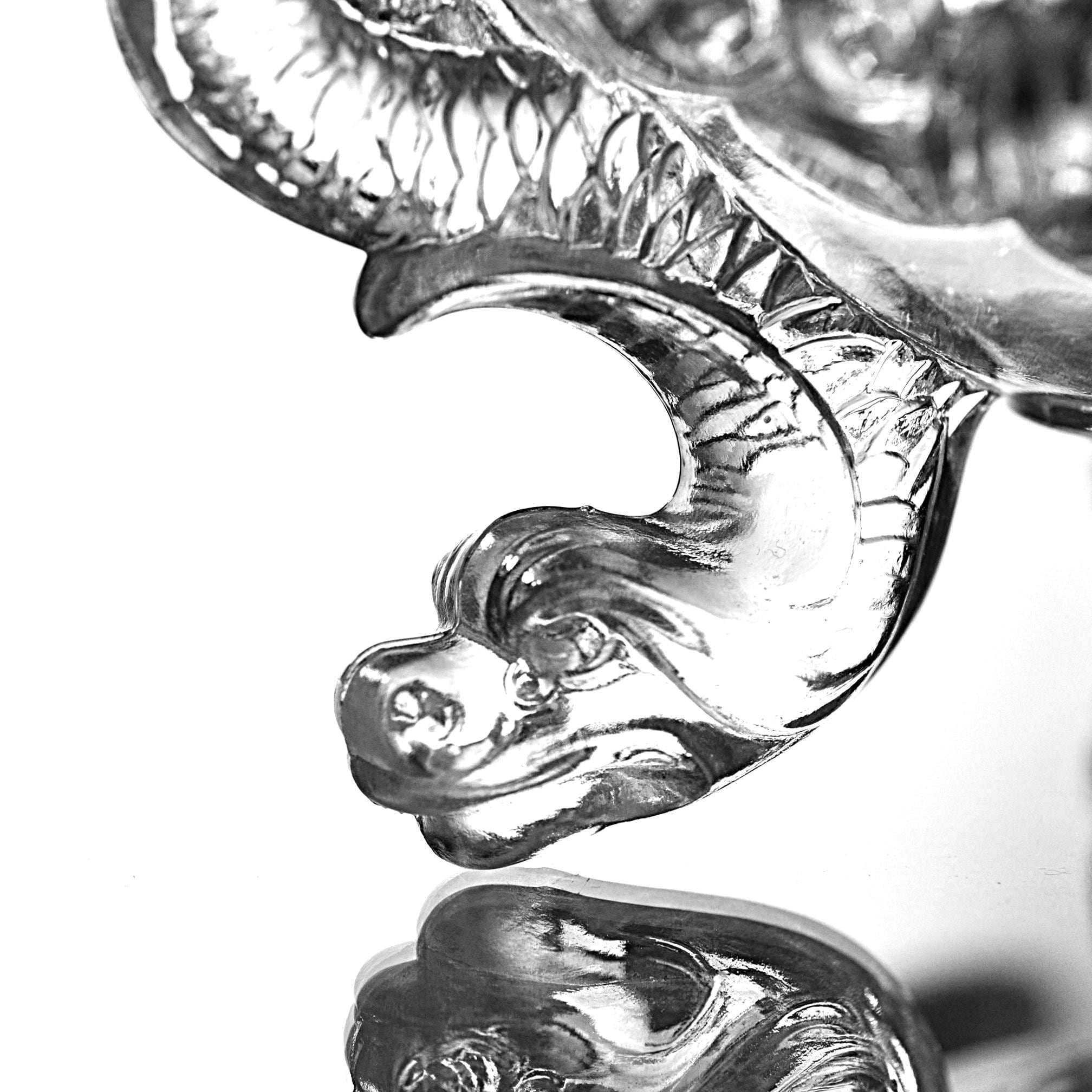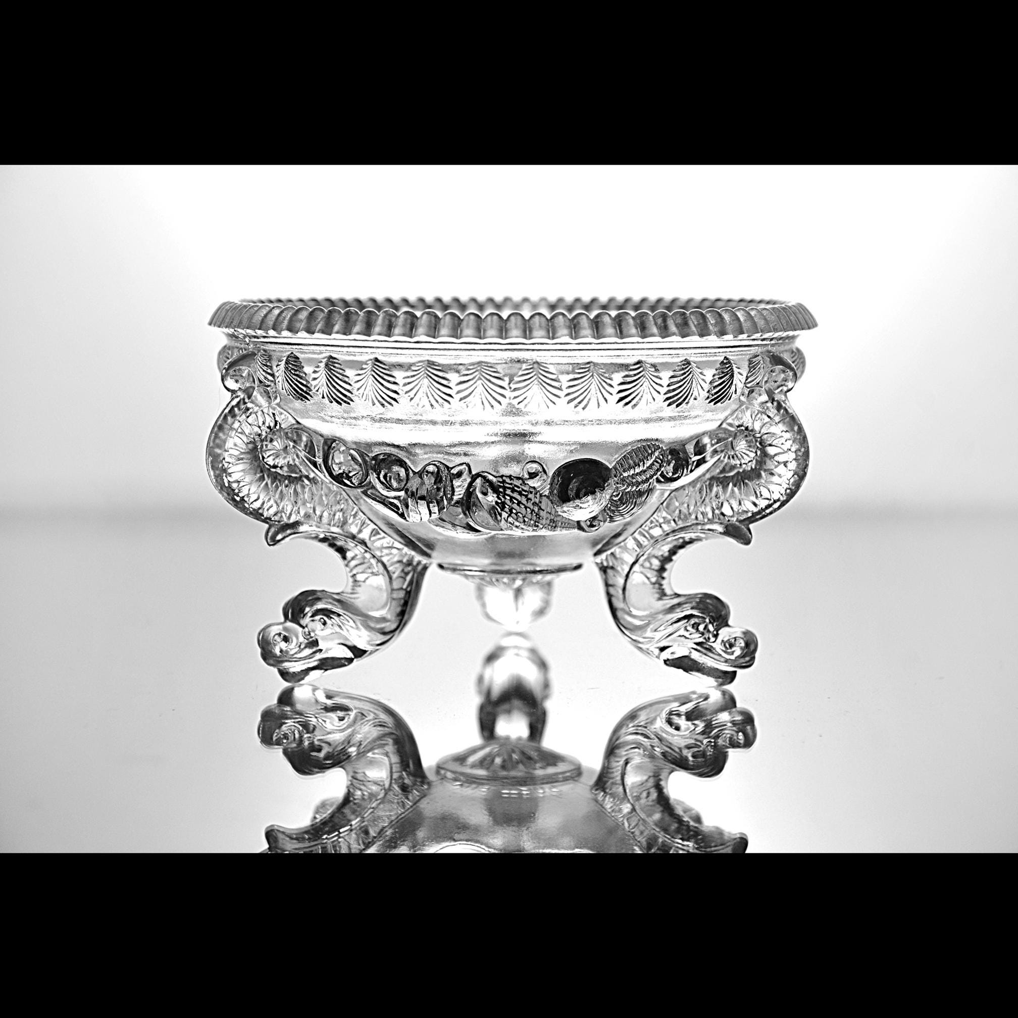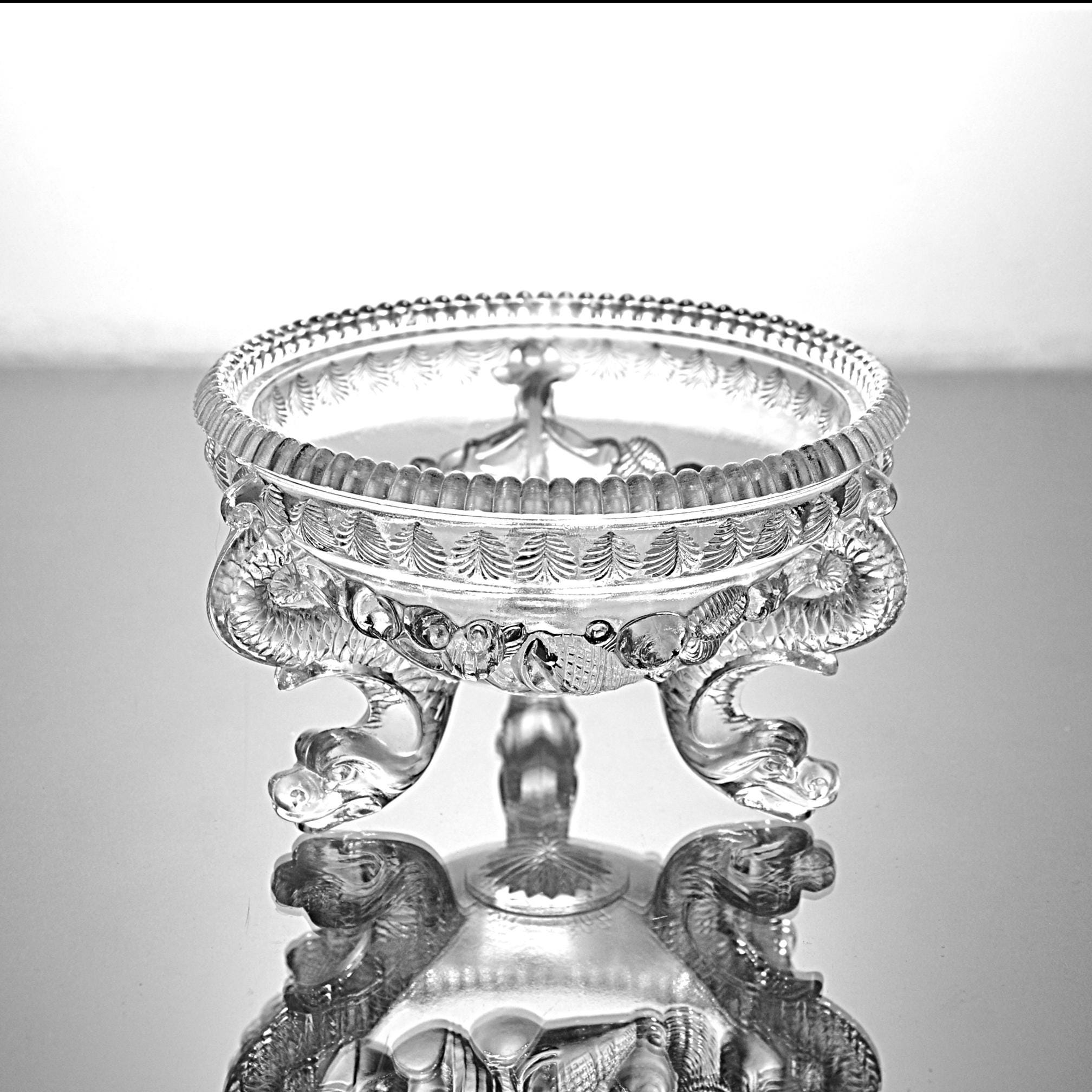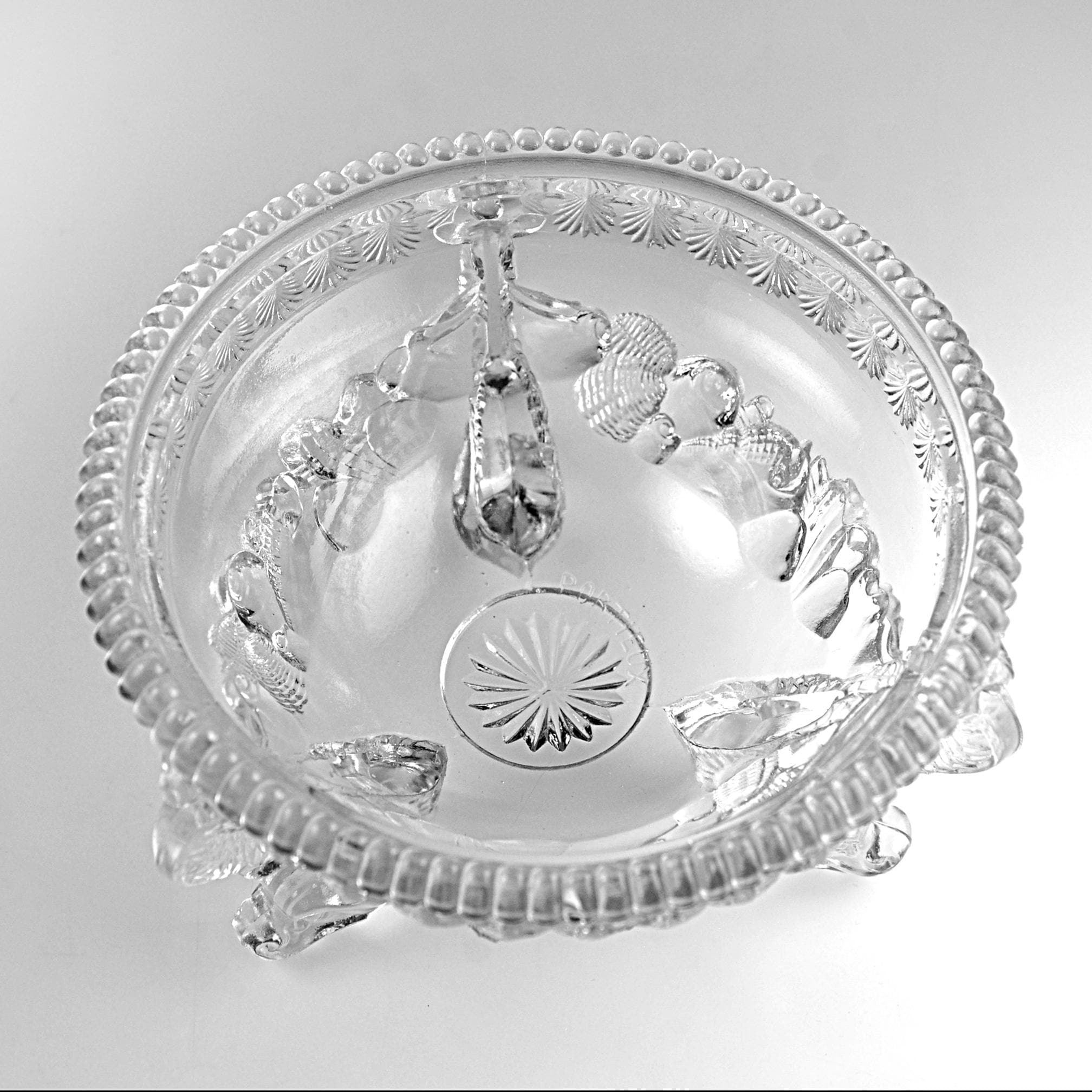 Lovely unmistakable late 19th-century French glass. The weight, the depth of the pressing, the kind of detail that simply isn’t done today. This footed bowl was produced by Cristallerie de Portieux, one of France’s historic glassworks dating back to the 1700s. The embossed Portieux mark appears clearly on the underside within a sunburst medallion. Dating to approximately 1870–1890, this piece would originally have been a covered sugar or bonbon dish. The lid is no longer present, but the base stands beautifully on its own and reads today as an elegant pedestal bowl. What truly sets it apart are the dramatic scroll feet — often described as dragon feet — richly molded and full of movement. They give the piece presence and architectural character. Above them, a swagged garland motif wraps the body, while a crisp leaf border frames the rim. This is a refined example of Victorian French pressed glass — decorative, display-ready, and nearly 150 years old.