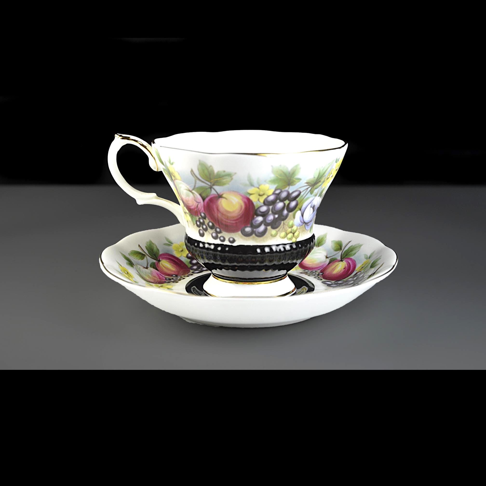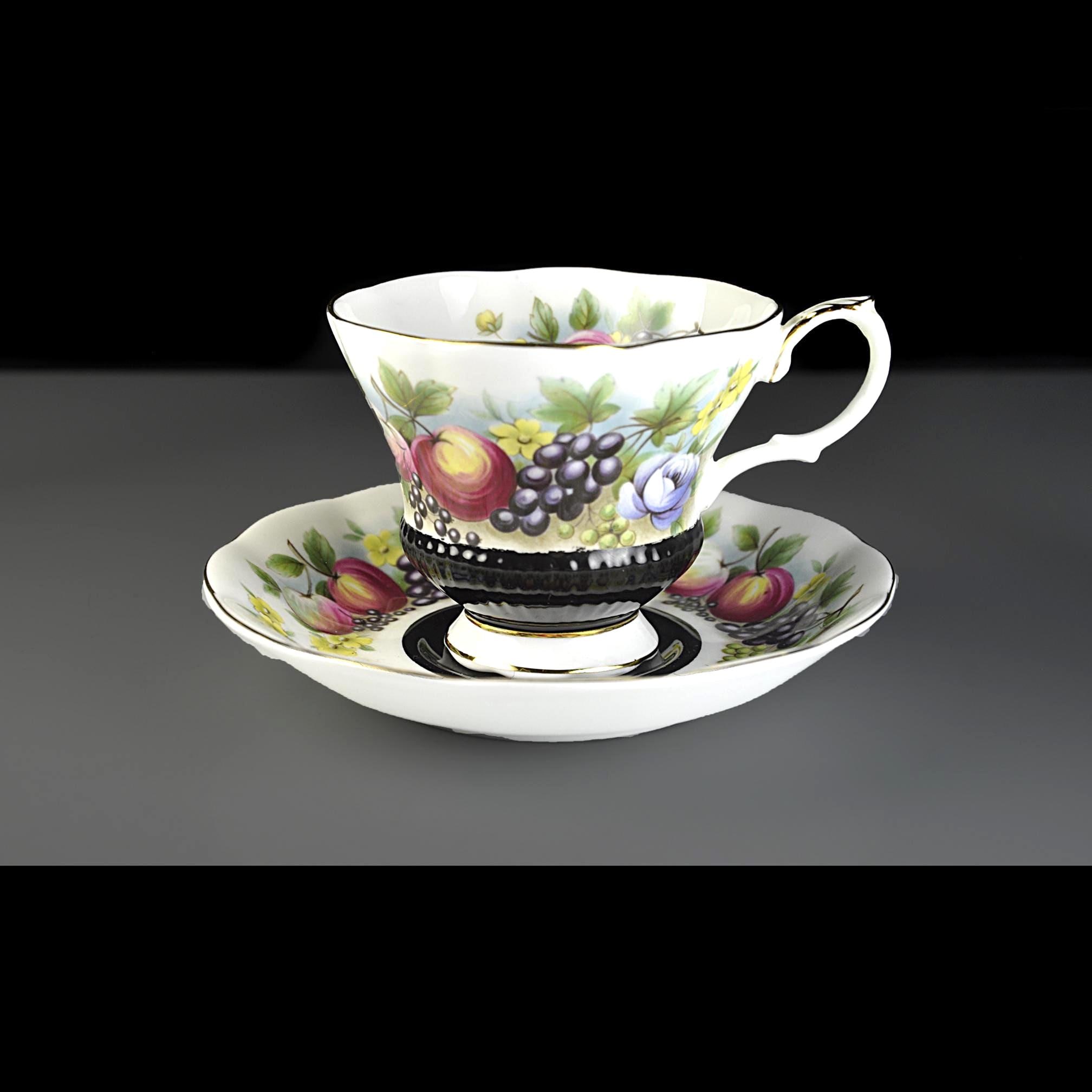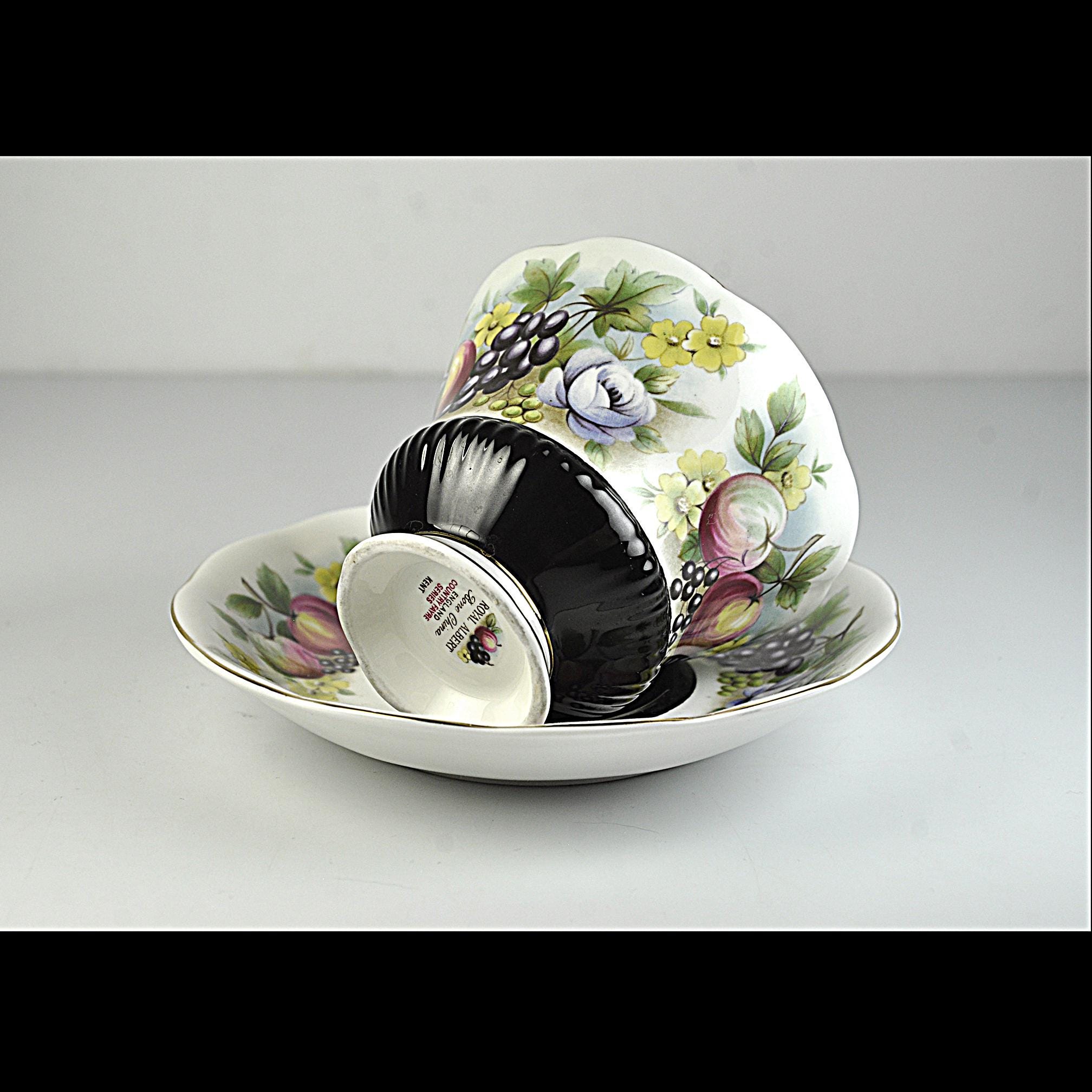 This Royal Albert “Kent” teacup and saucer from the Country Fayre Series carries that classic English countryside look — ripe fruit, soft florals, and a harvest warmth that feels right at home on a well-set table. The rich black lower band adds depth and contrast, grounding the colorful apples, grapes, and blossoms above it. The fine gold trim around the rim and foot gives it that unmistakable Royal Albert refinement. It’s elegant without being fussy. It’s perfect for afternoon tea, a special breakfast setting, or as a thoughtful gift for someone who appreciates English bone china with character.