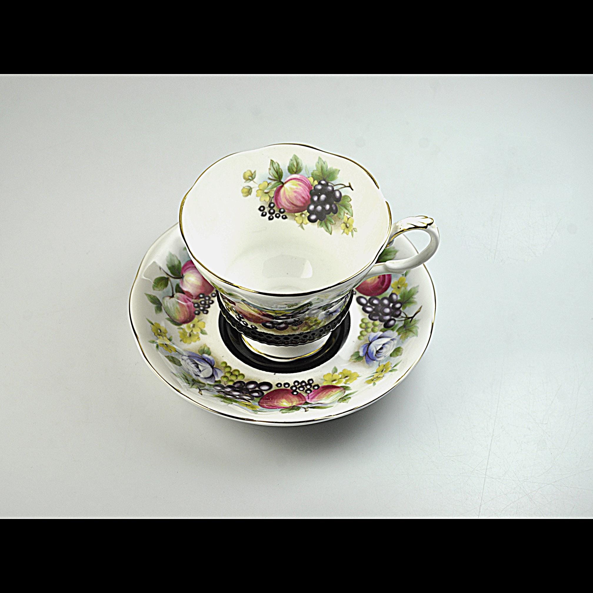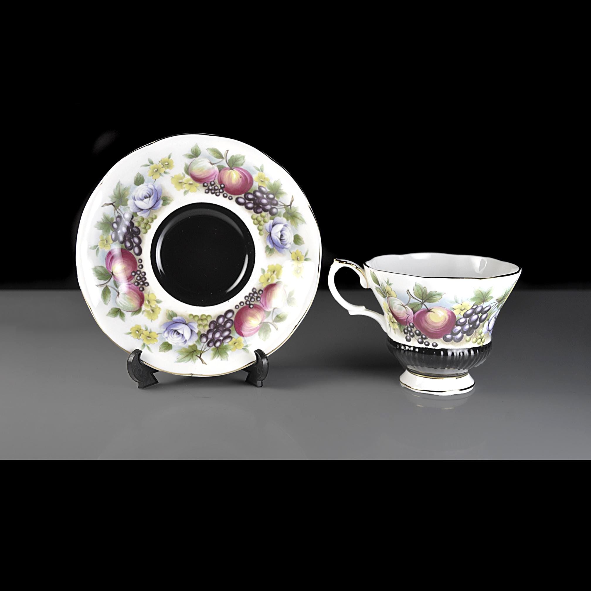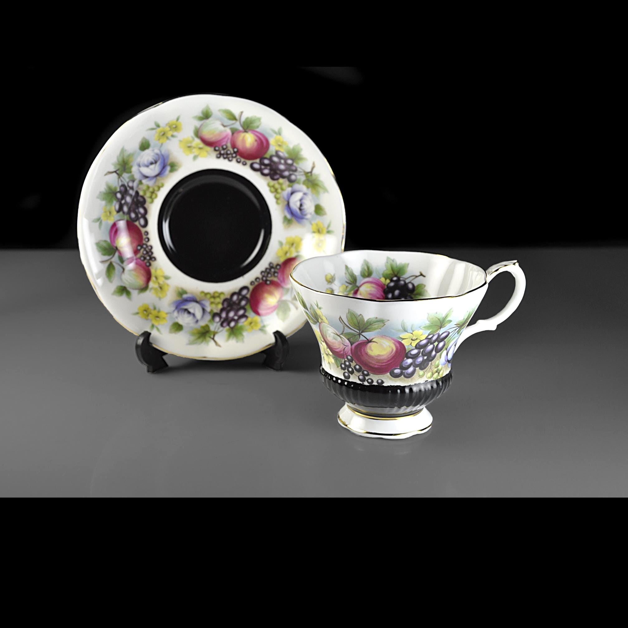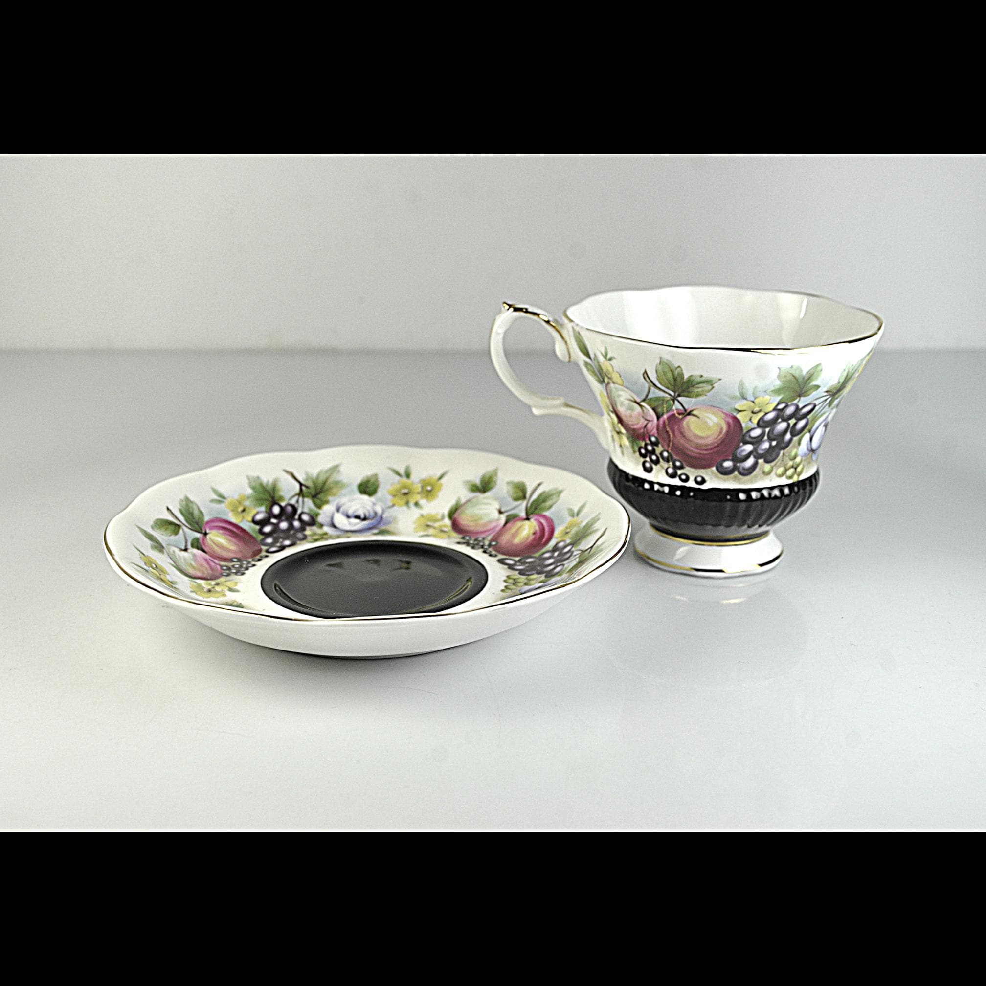 This Royal Albert “Kent” teacup and saucer from the Country Fayre Series carries that classic English countryside look — ripe fruit, soft florals, and a harvest warmth that feels right at home on a well-set table. The rich black lower band adds depth and contrast, grounding the colorful apples, grapes, and blossoms above it. The fine gold trim around the rim and foot gives it that unmistakable Royal Albert refinement. It’s elegant without being fussy. It’s perfect for afternoon tea, a special breakfast setting, or as a thoughtful gift for someone who appreciates English bone china with character.