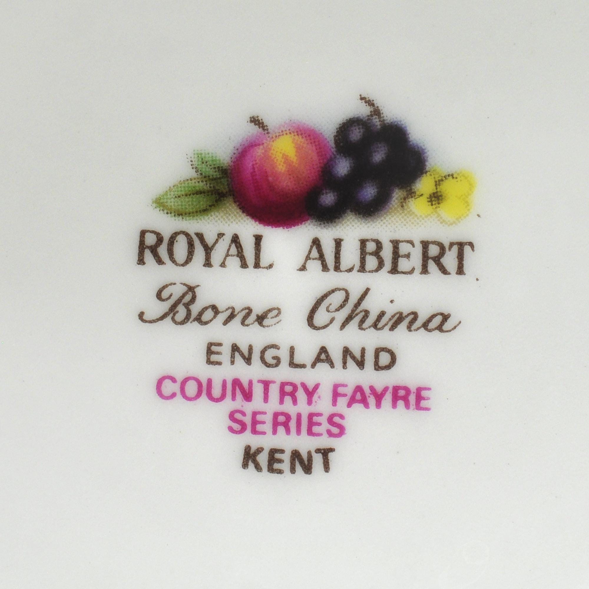 Made in England of fine bone china, this set dates to approximately the late 1960s to early 1970s. Royal Albert’s Country Fayre Series honored English counties, and “Kent” reflects orchard country — fruit-forward, cheerful, and traditional.
