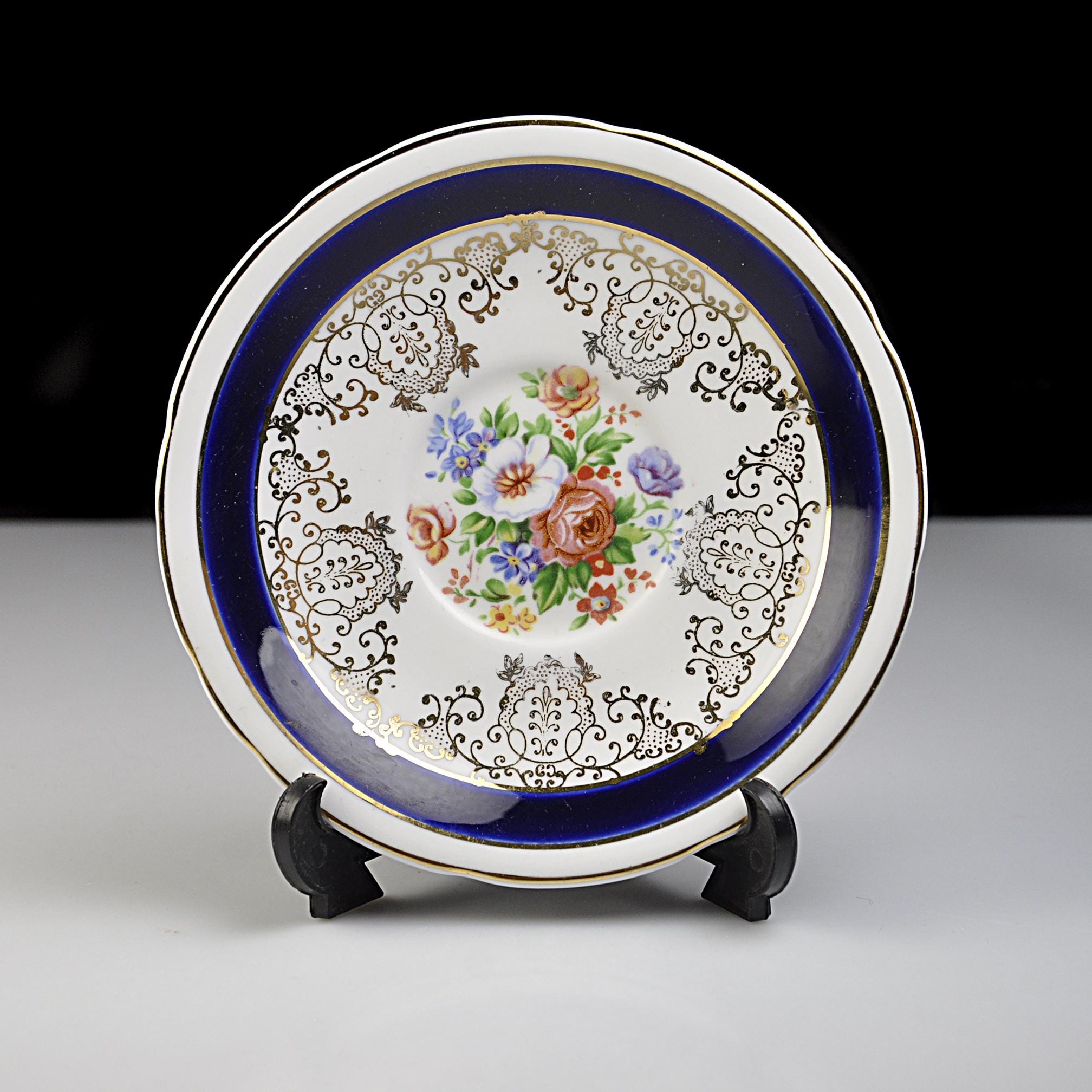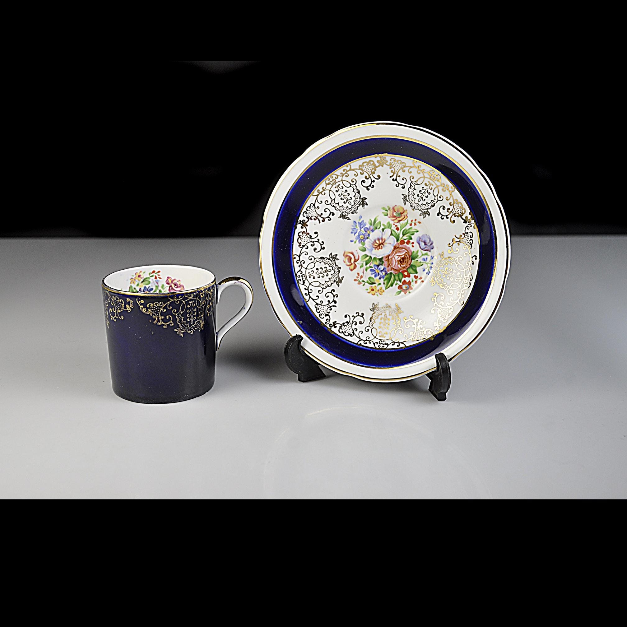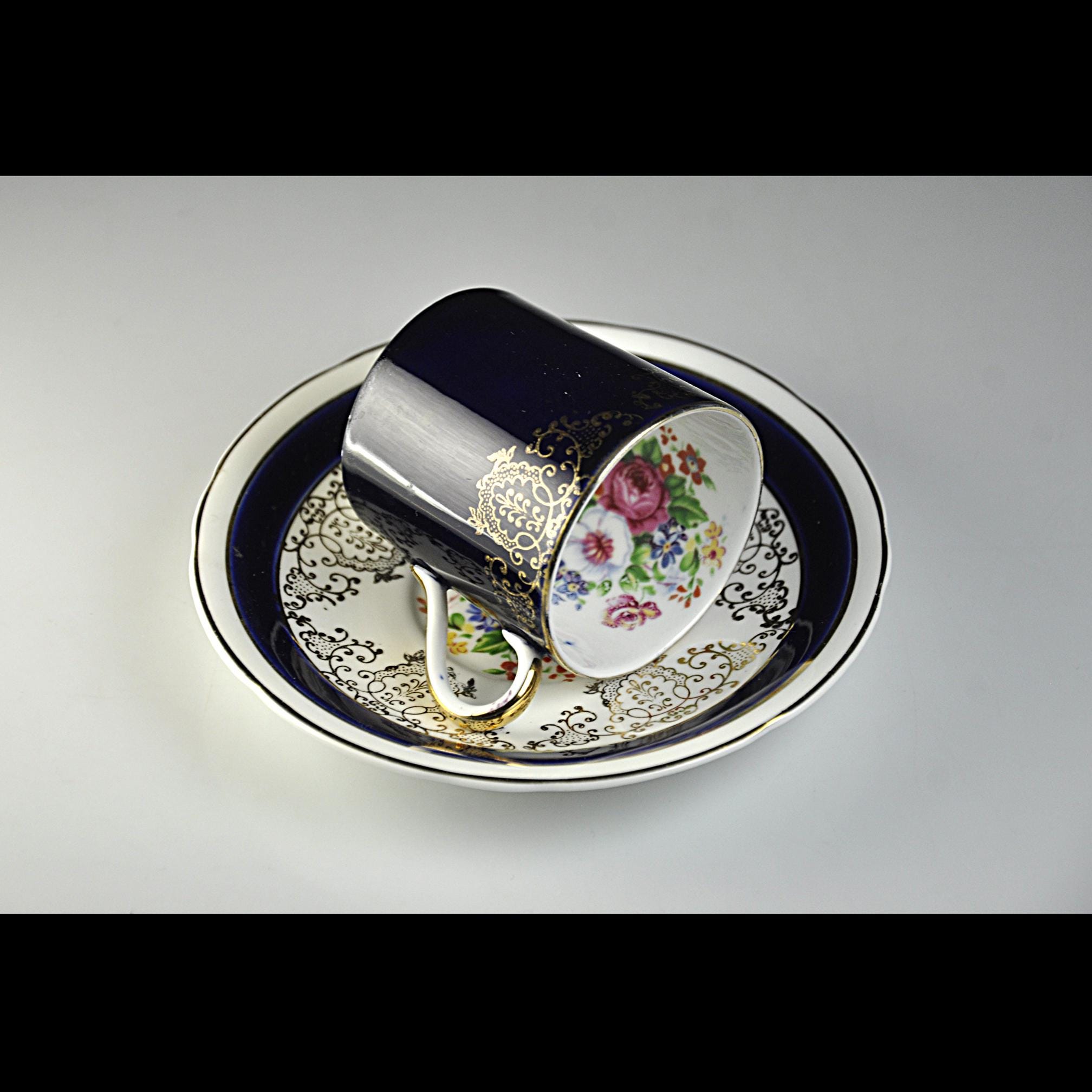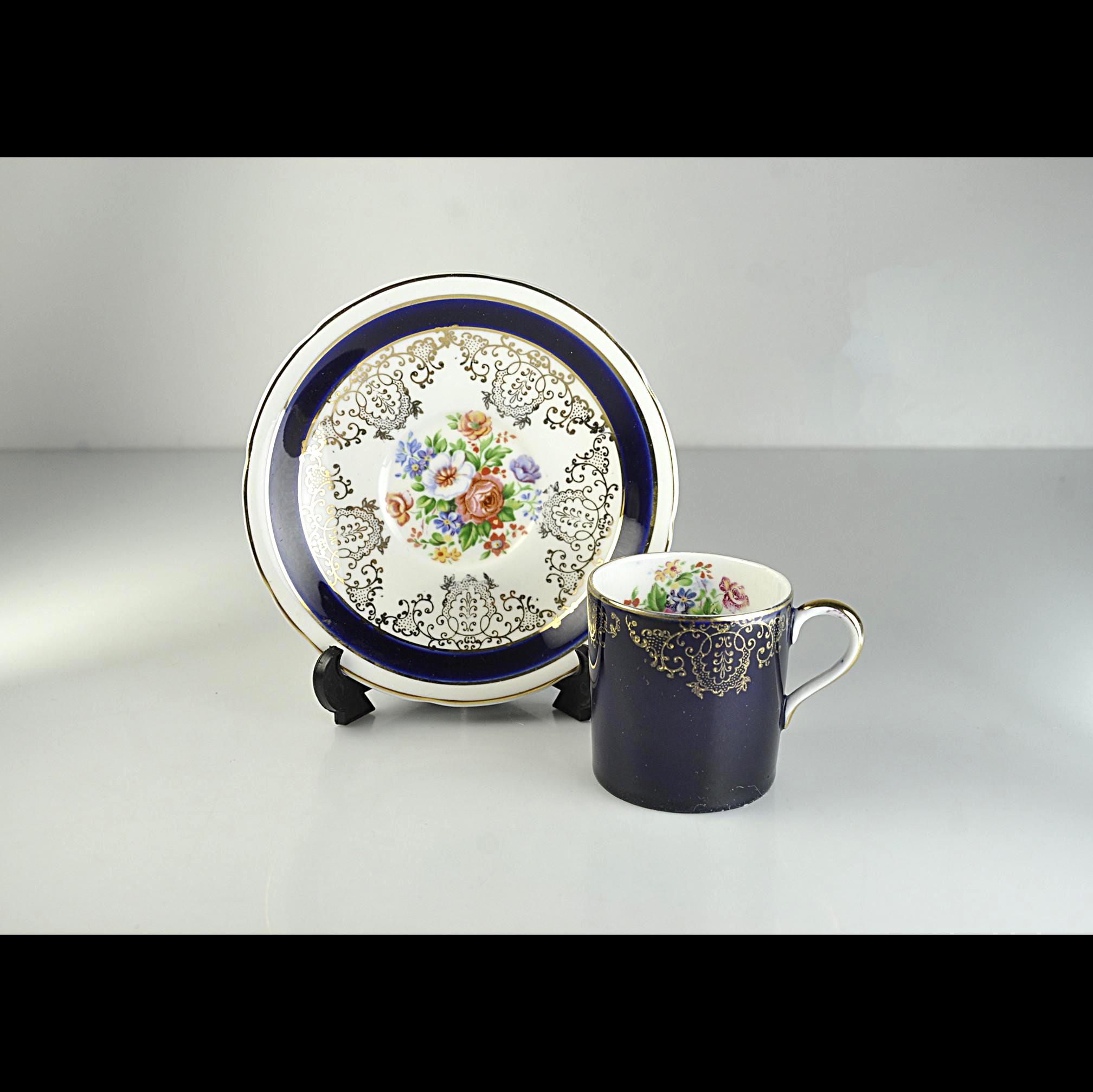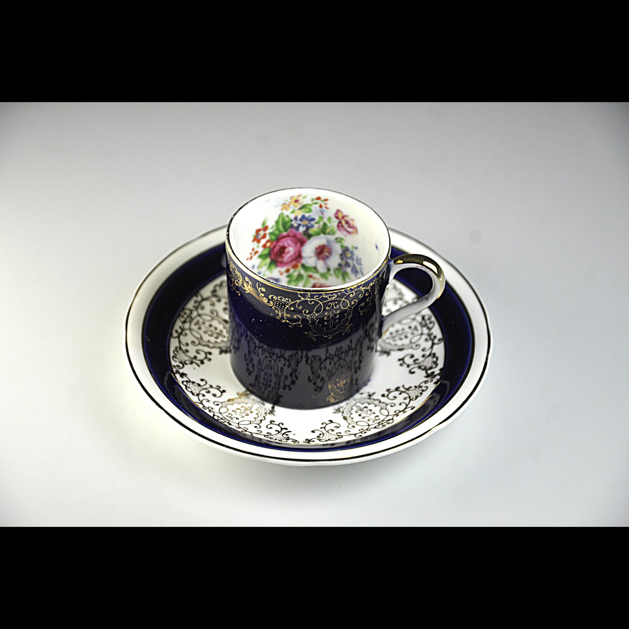 Some pieces are small, but they carry themselves like something far grander. This tiny English bone china demitasse cup and saucer is finished in a rich cobalt blue with intricate gold scrollwork wrapped around the cup like fine old lace. Inside the cup, a bright floral bouquet blooms in soft pinks, blues, and greens — classic English garden style. This is a charming mid-century English piece with strong color, elegant detailing, and that unmistakable bone china translucency. It may be small — but it has presence.