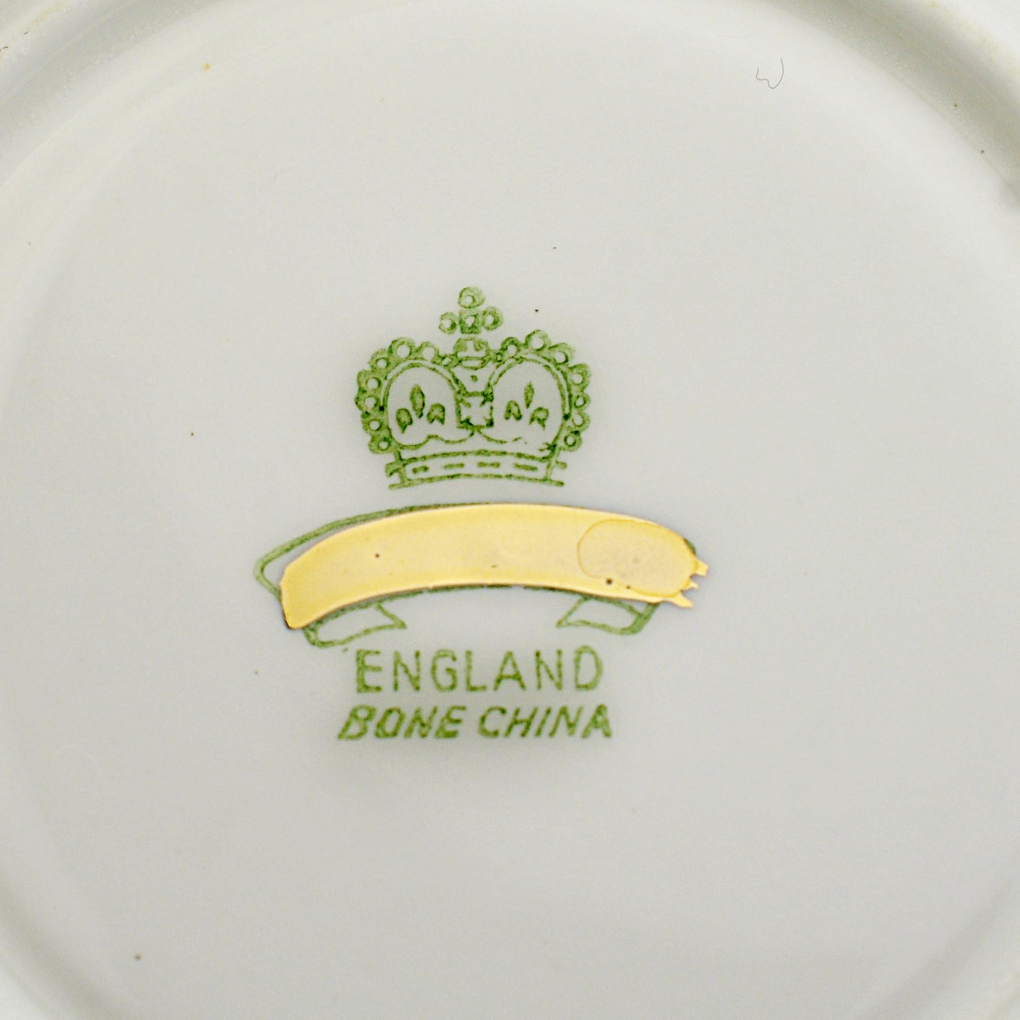 The backstamp reads “England Bone China” beneath a crown. The factory name area has been intentionally covered with matching gilt during decoration, a practice often seen on mid-20th century export or private-label pieces produced for department stores. The quality of the porcelain, cobalt ground, and heavy gilding suggest Staffordshire production, circa 1945–1965.