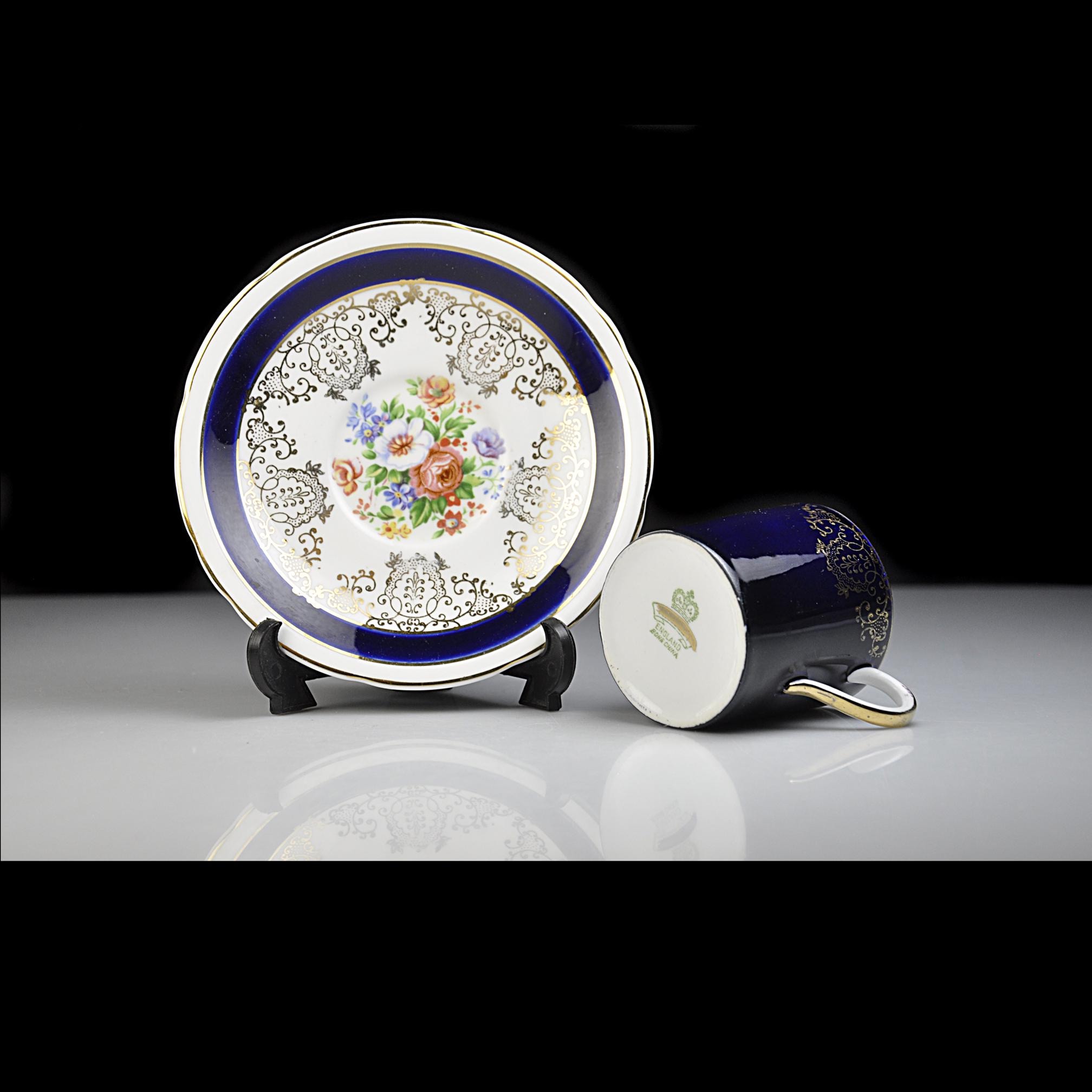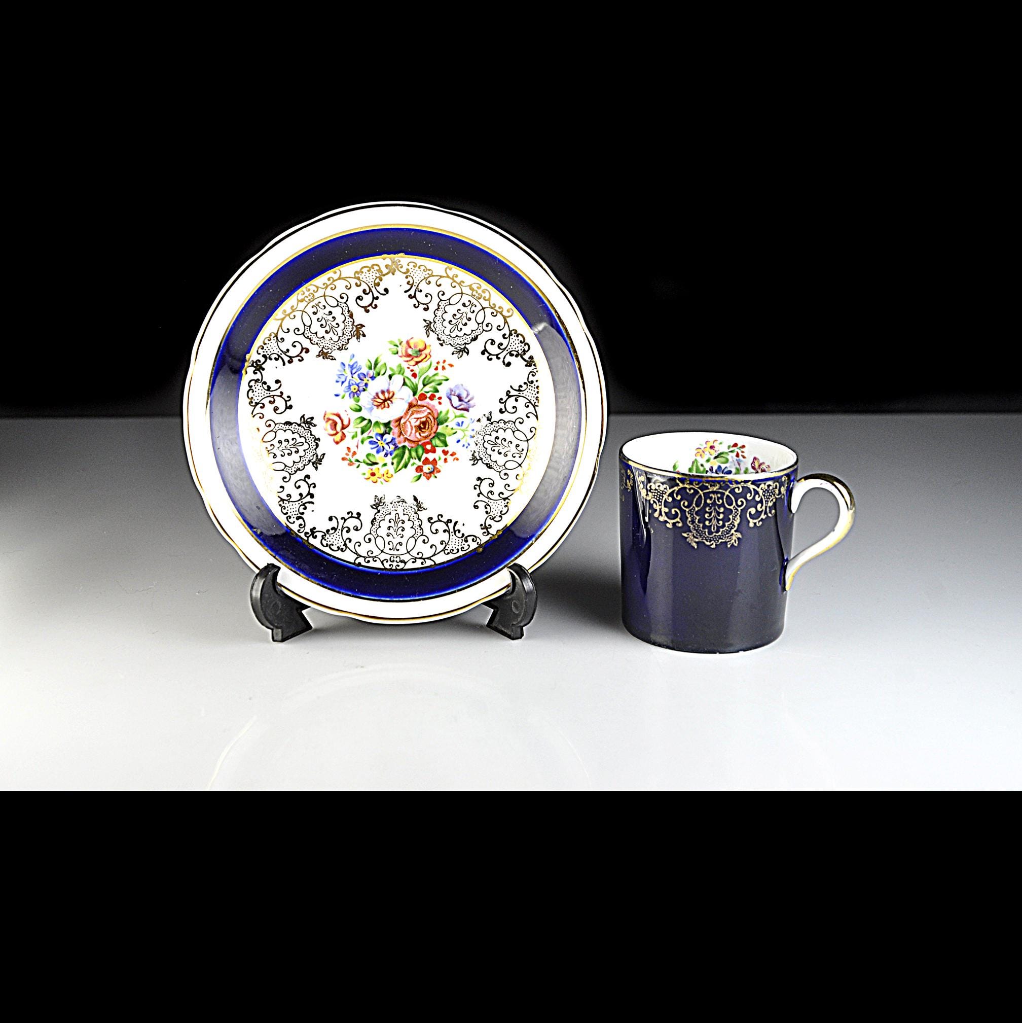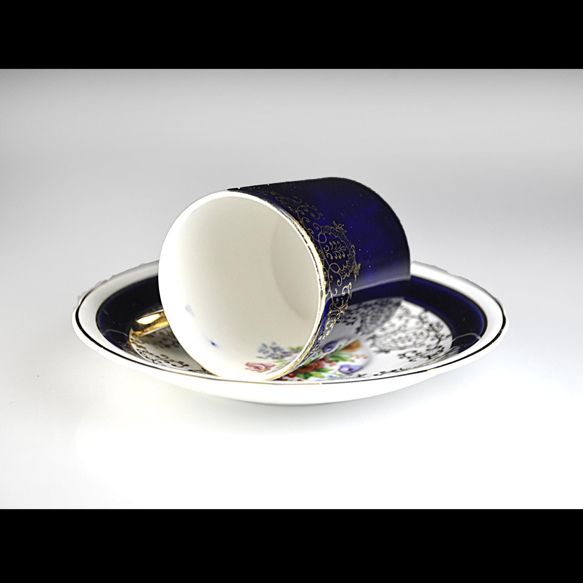 The cup measures just 2 inches tall and 2 inches across, paired with a 4¾ inch saucer. It’s true demitasse size — meant for espresso or after-dinner coffee — though it displays beautifully in a cabinet where that cobalt catches the light.
