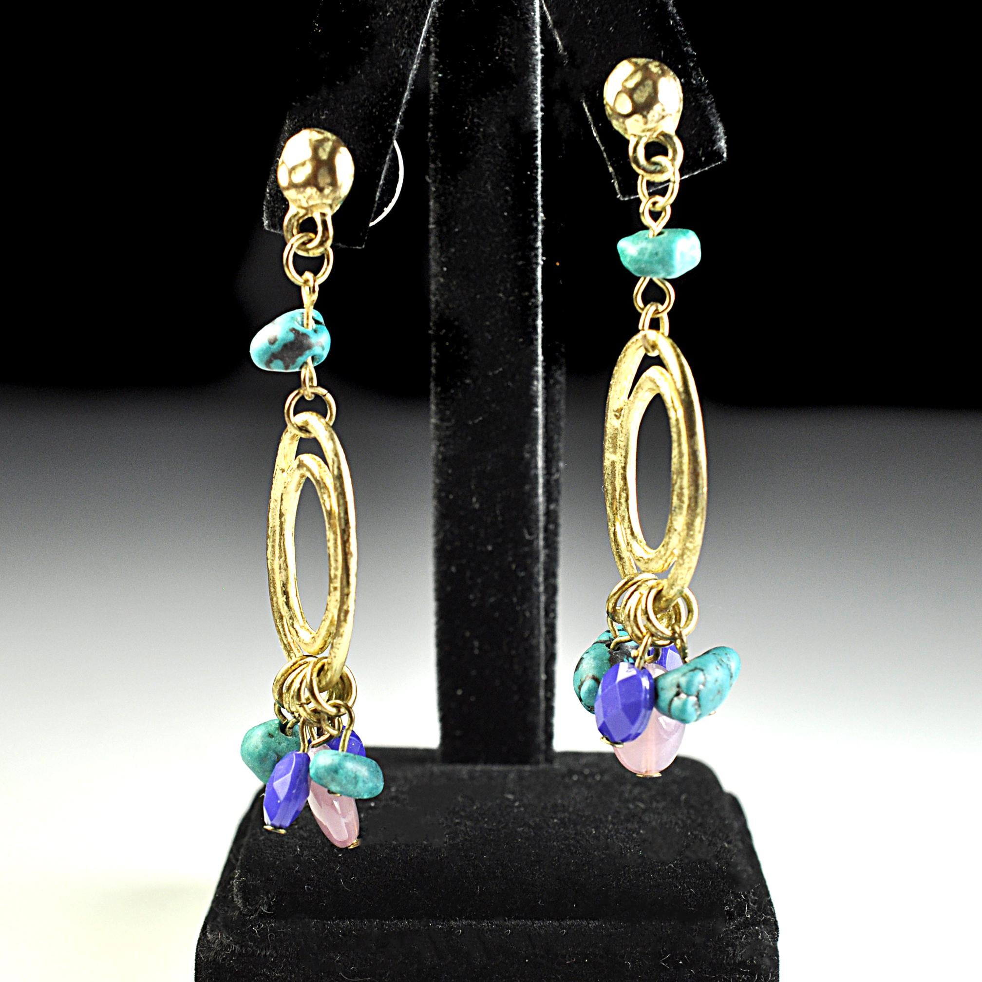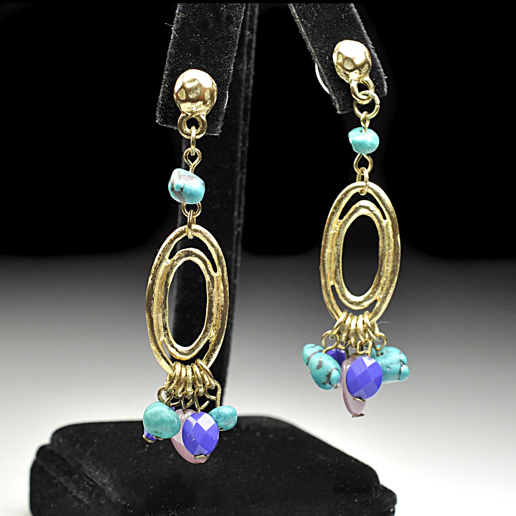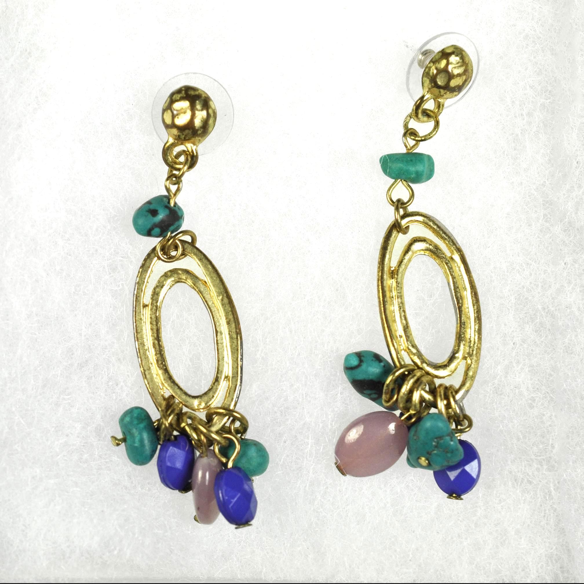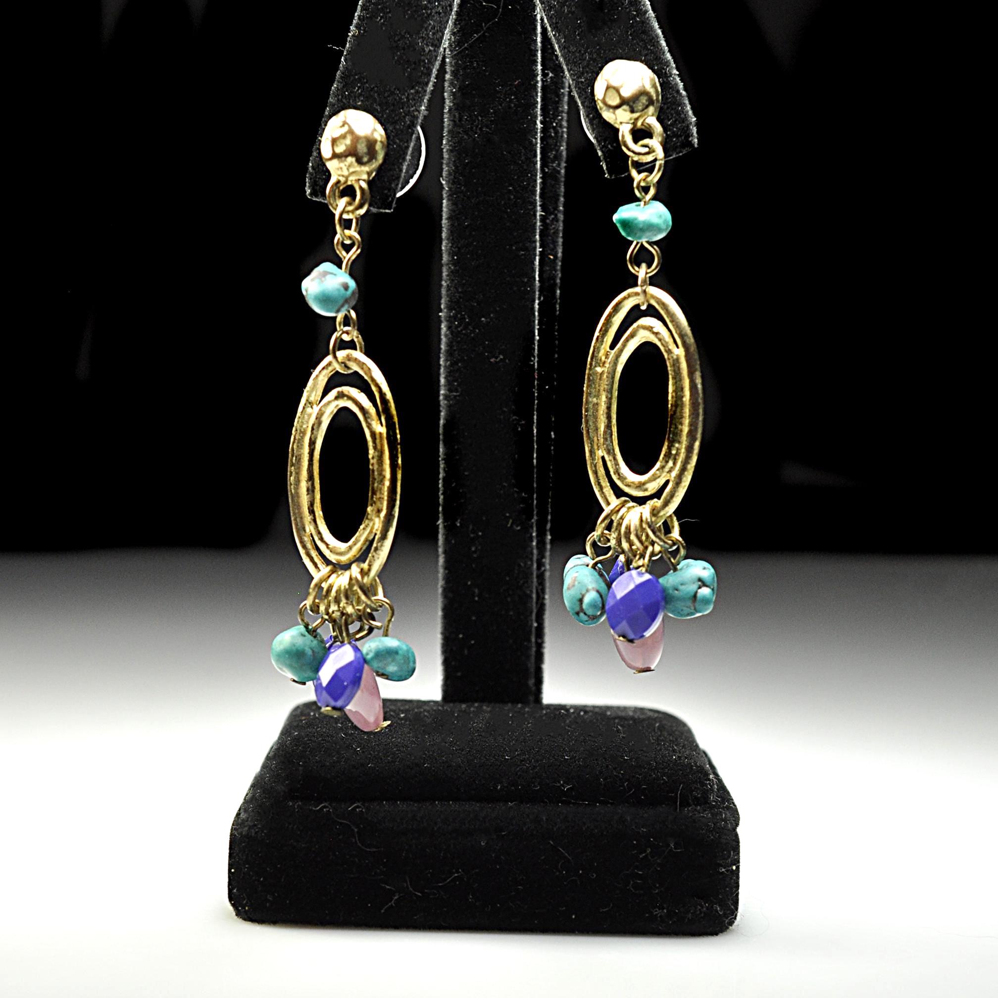 This vintage pair of dangle post earrings features gold-tone oval drops accented with turquoise-style beads and soft purple glass beads that move gently with wear. They’re lightweight in the hand and comfortable enough for all-day use, adding color without feeling heavy. The design reflects the popular Southwestern and bohemian influence seen in late 1980s and early 1990s fashion, when natural colors and relaxed statement jewelry became everyday favorites. An easy pair to reach for with denim, linen, or a simple dress — vintage style that still feels right at home today.
