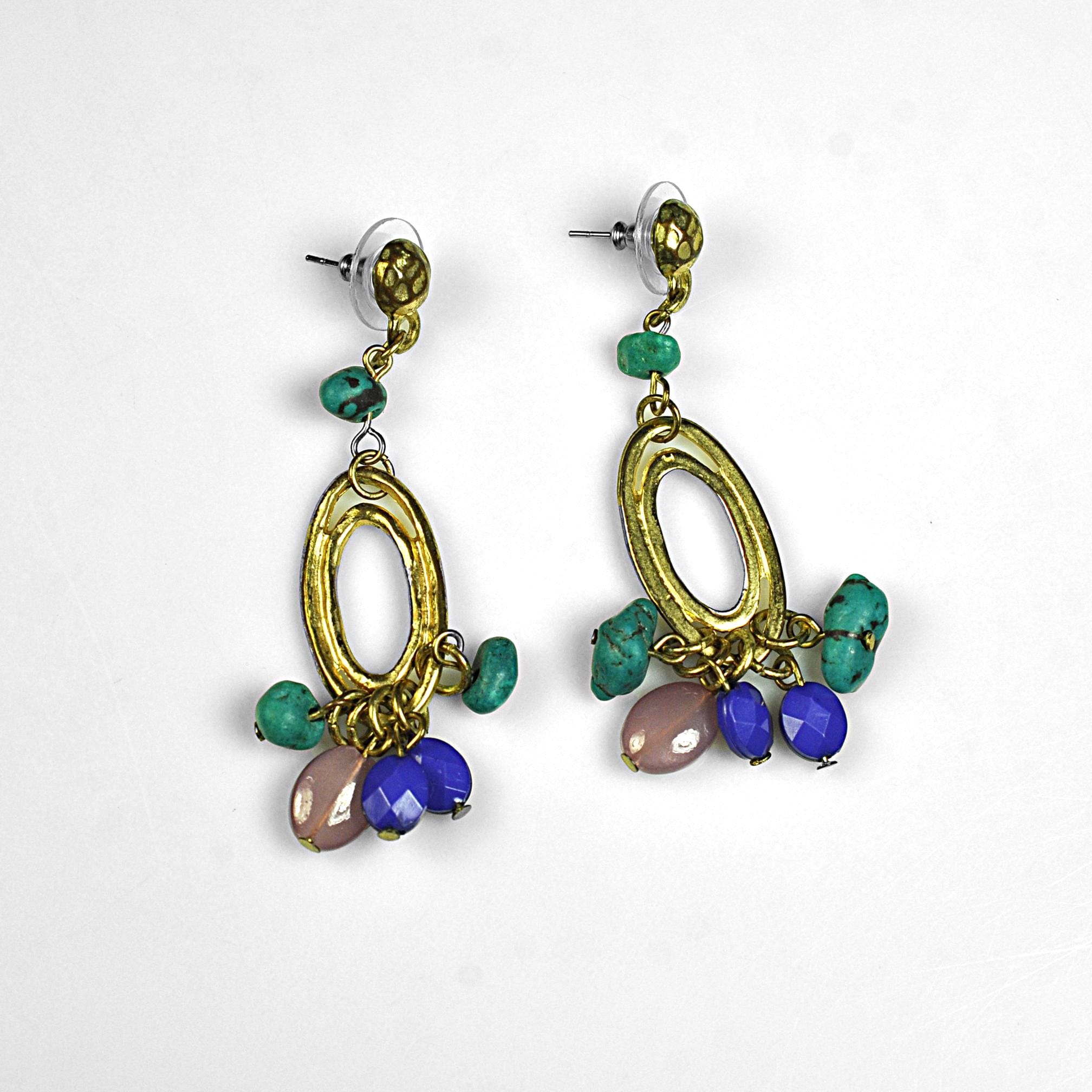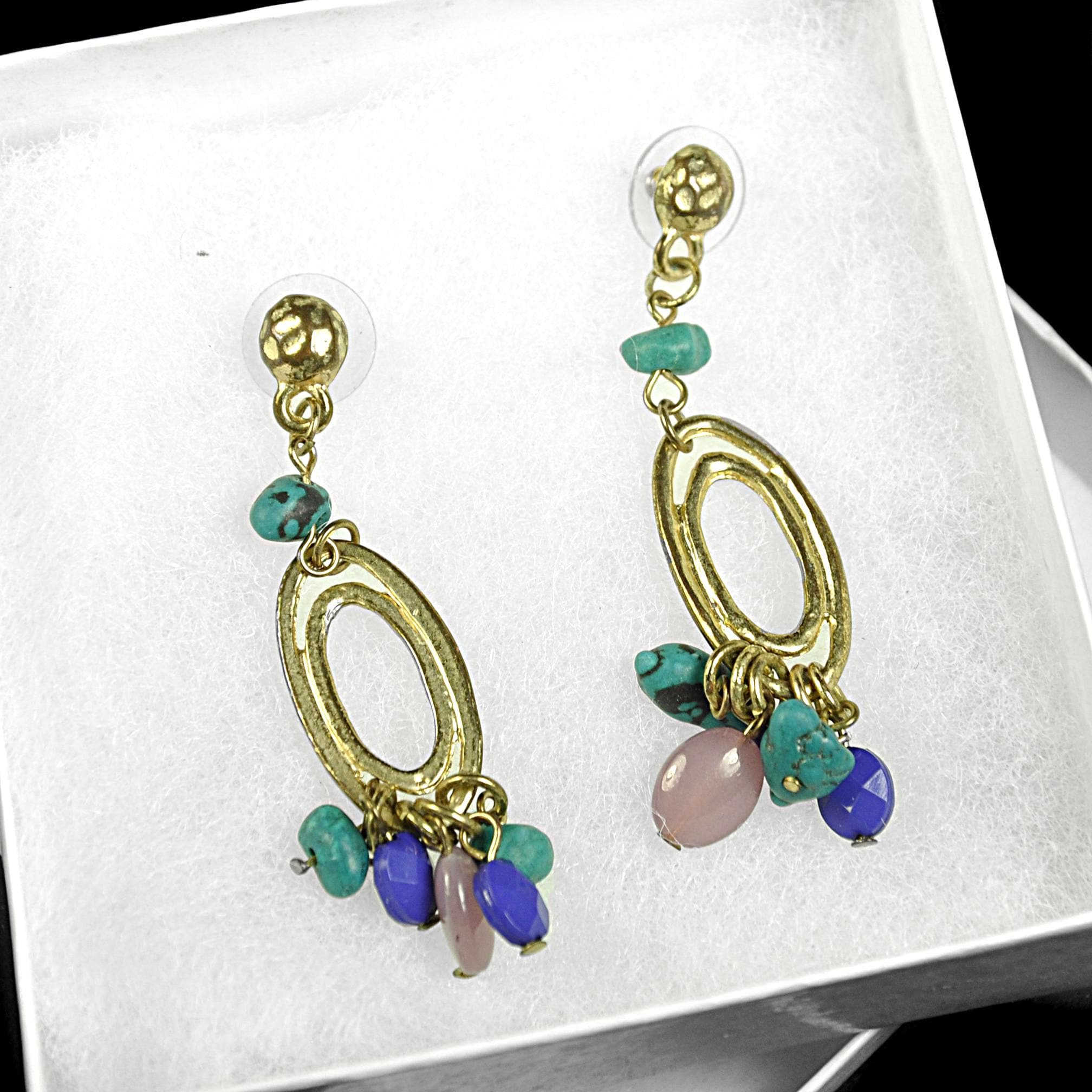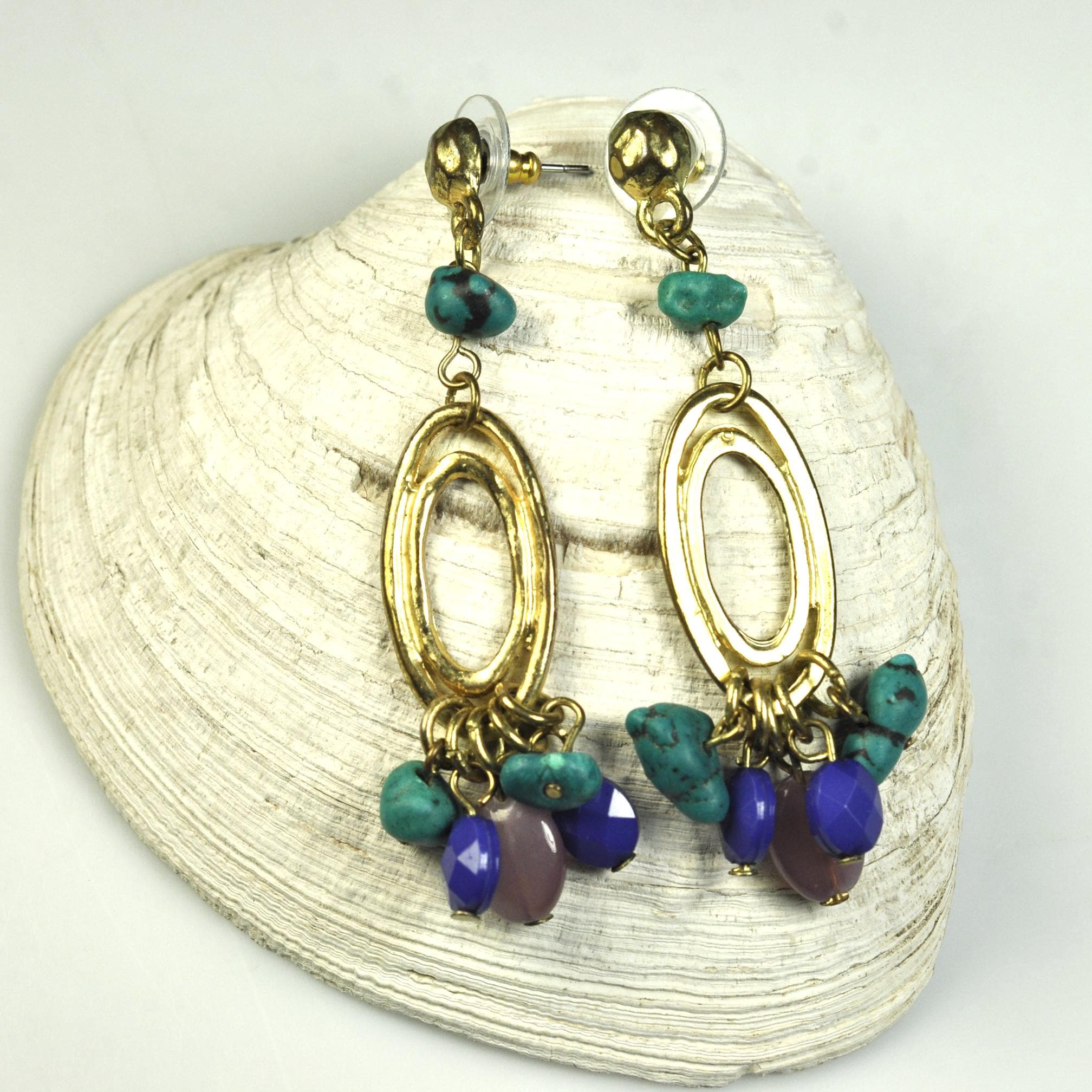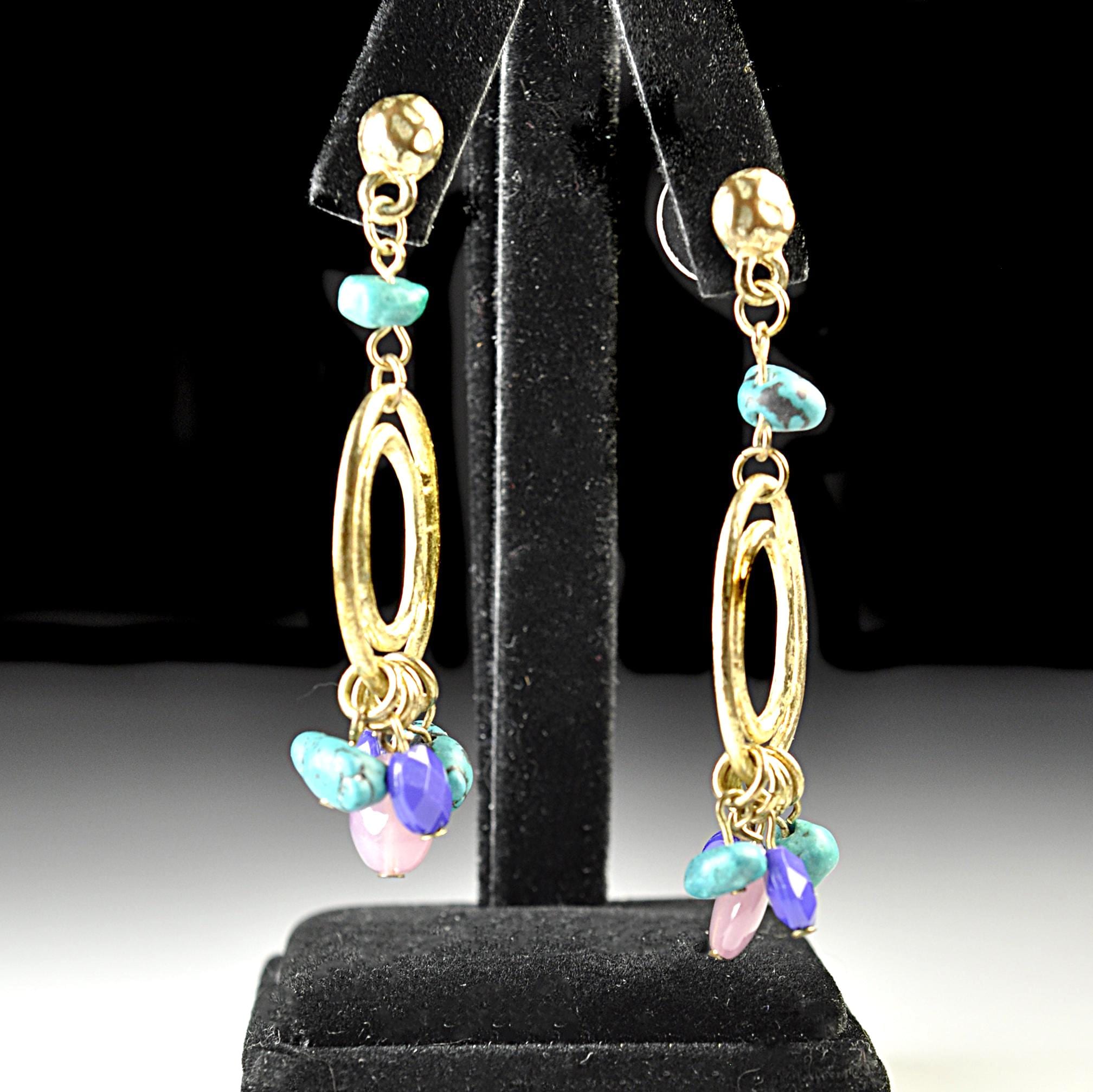 This vintage pair of dangle post earrings features gold-tone oval drops accented with turquoise-style beads and soft purple glass beads that move gently with wear. They’re lightweight in the hand and comfortable enough for all-day use, adding color without feeling heavy. The design reflects the popular Southwestern and bohemian influence seen in late 1980s and early 1990s fashion, when natural colors and relaxed statement jewelry became everyday favorites. An easy pair to reach for with denim, linen, or a simple dress — vintage style that still feels right at home today.
