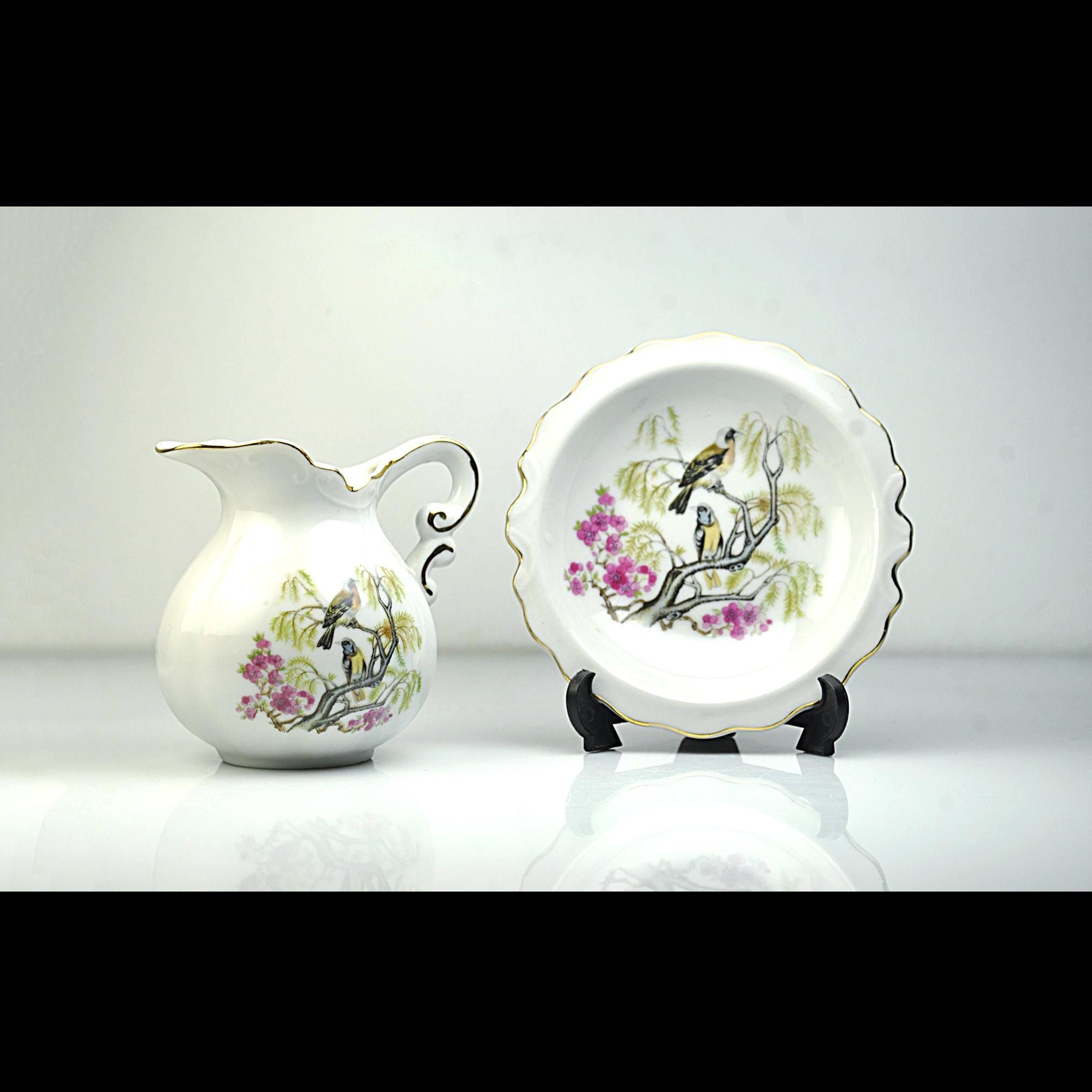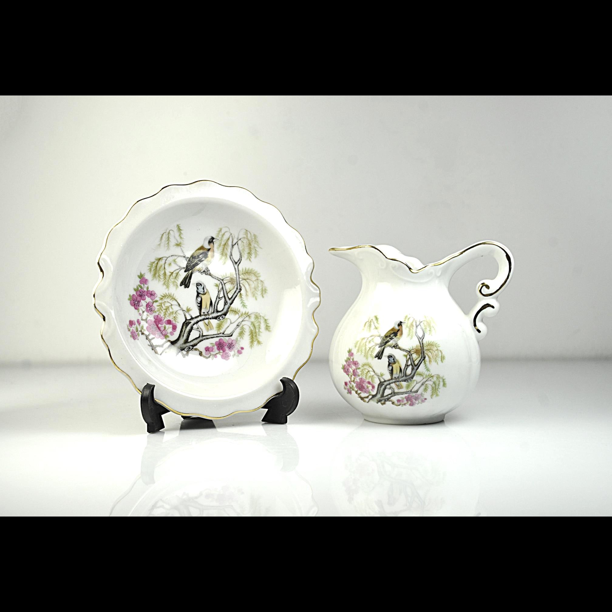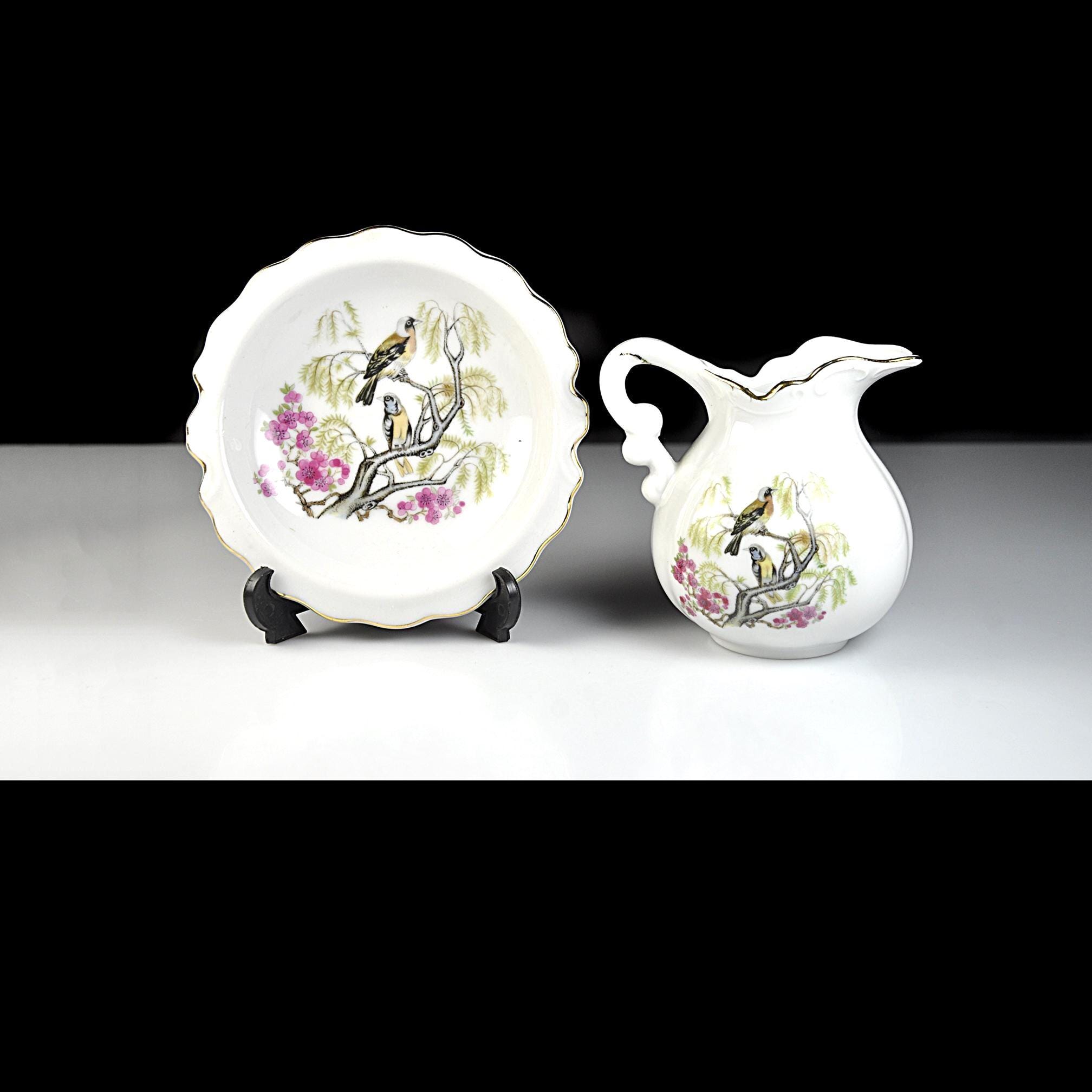 Some pieces were never meant to work hard — they were meant to sit pretty. This little pitcher and bowl set is one of those. Small in scale, delicate in detail, and just plain charming. The white porcelain is trimmed in soft gold along the rim, and the sweetest pair of blue birds rest among pink blossoms on both the pitcher and the bowl. It has that mid-century gift shop feel — the kind of piece someone wrapped up carefully and gave as a thoughtful little treasure. This is simply a sweet decorative piece — the kind that adds a little softness to a room. And sometimes that’s exactly what some spaces need.