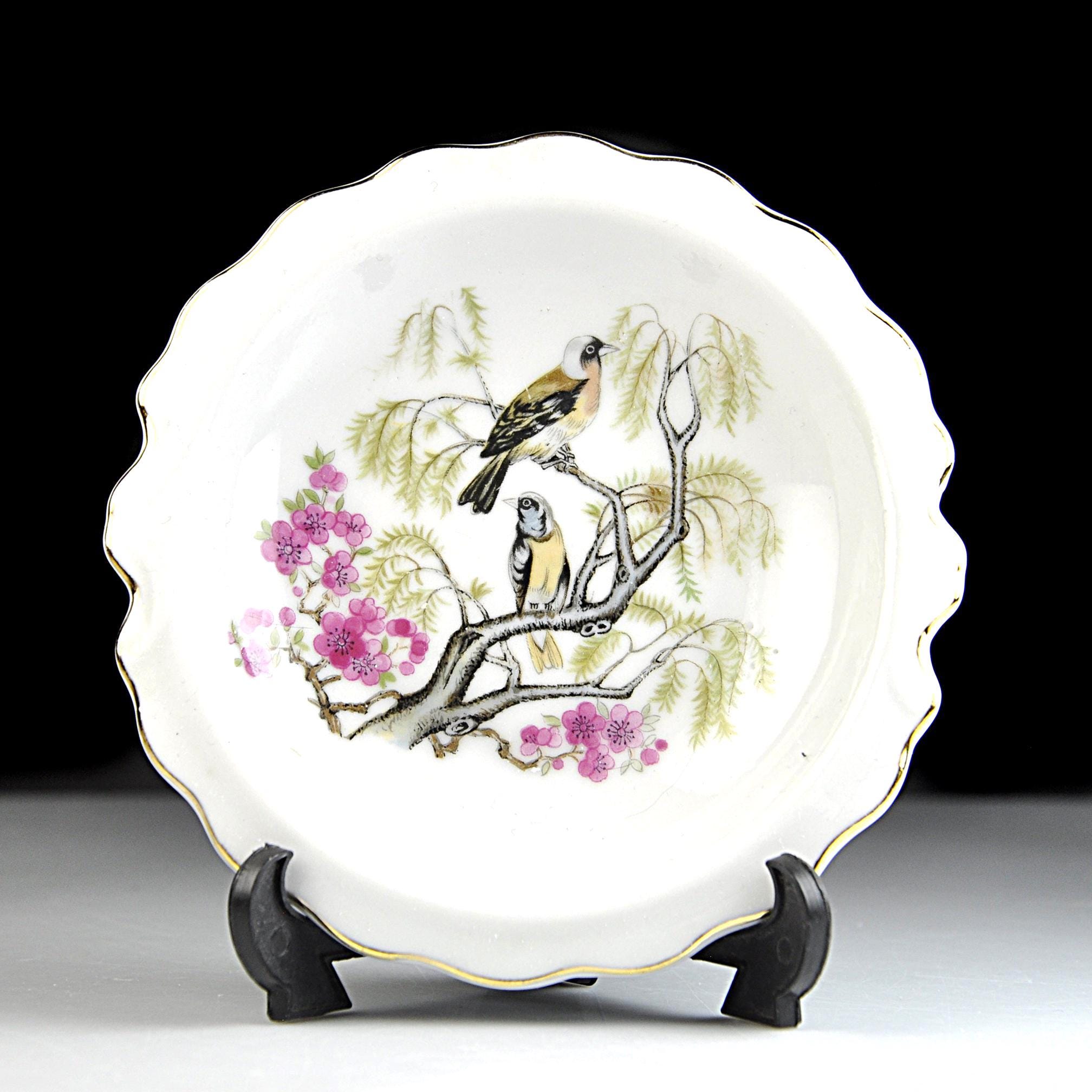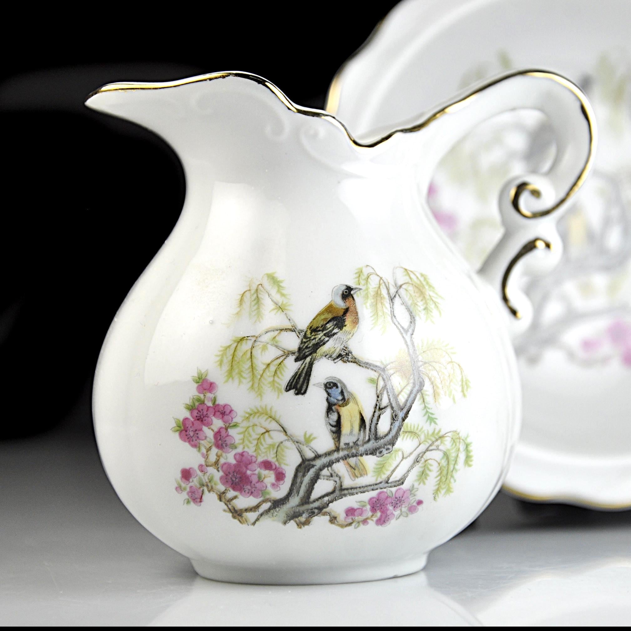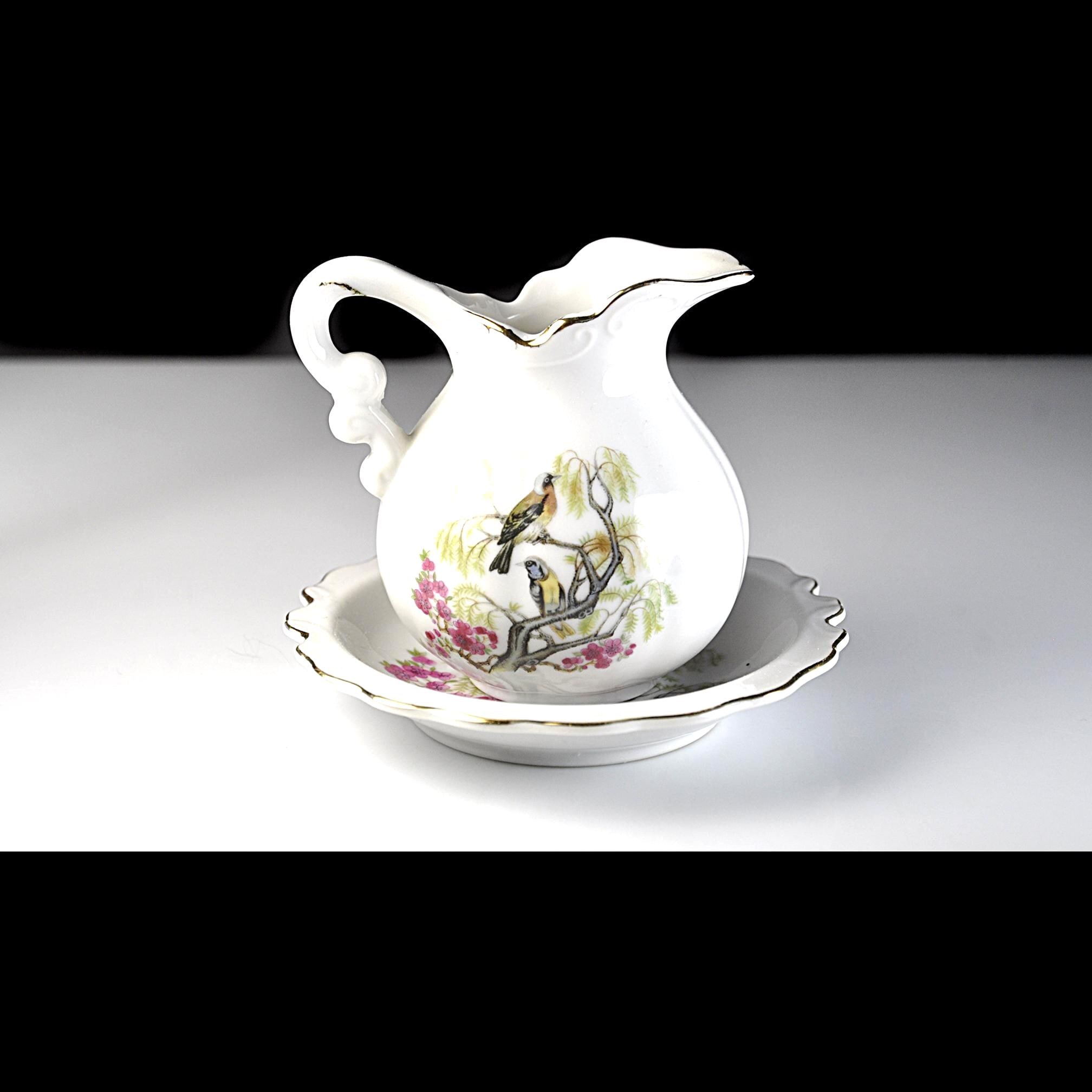Some pieces were never meant to work hard — they were meant to sit pretty. This little pitcher and bowl set is one of those. Small in scale, delicate in detail, and just plain charming. The white porcelain is trimmed in soft gold along the rim, and the sweetest pair of blue birds rest among pink blossoms on both the pitcher and the bowl. It has that mid-century gift shop feel — the kind of piece someone wrapped up carefully and gave as a thoughtful little treasure. This is simply a sweet decorative piece — the kind that adds a little softness to a room. And sometimes that’s exactly what some spaces need.