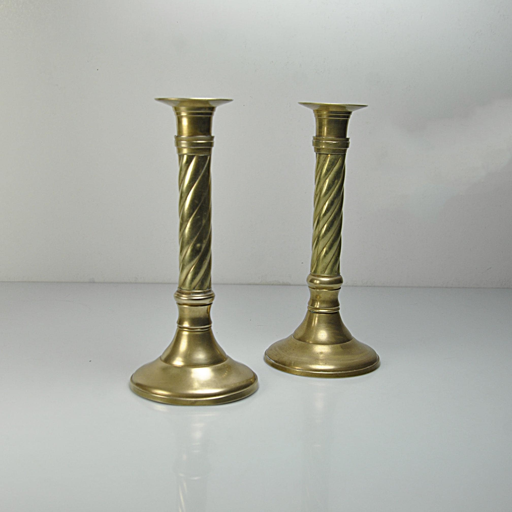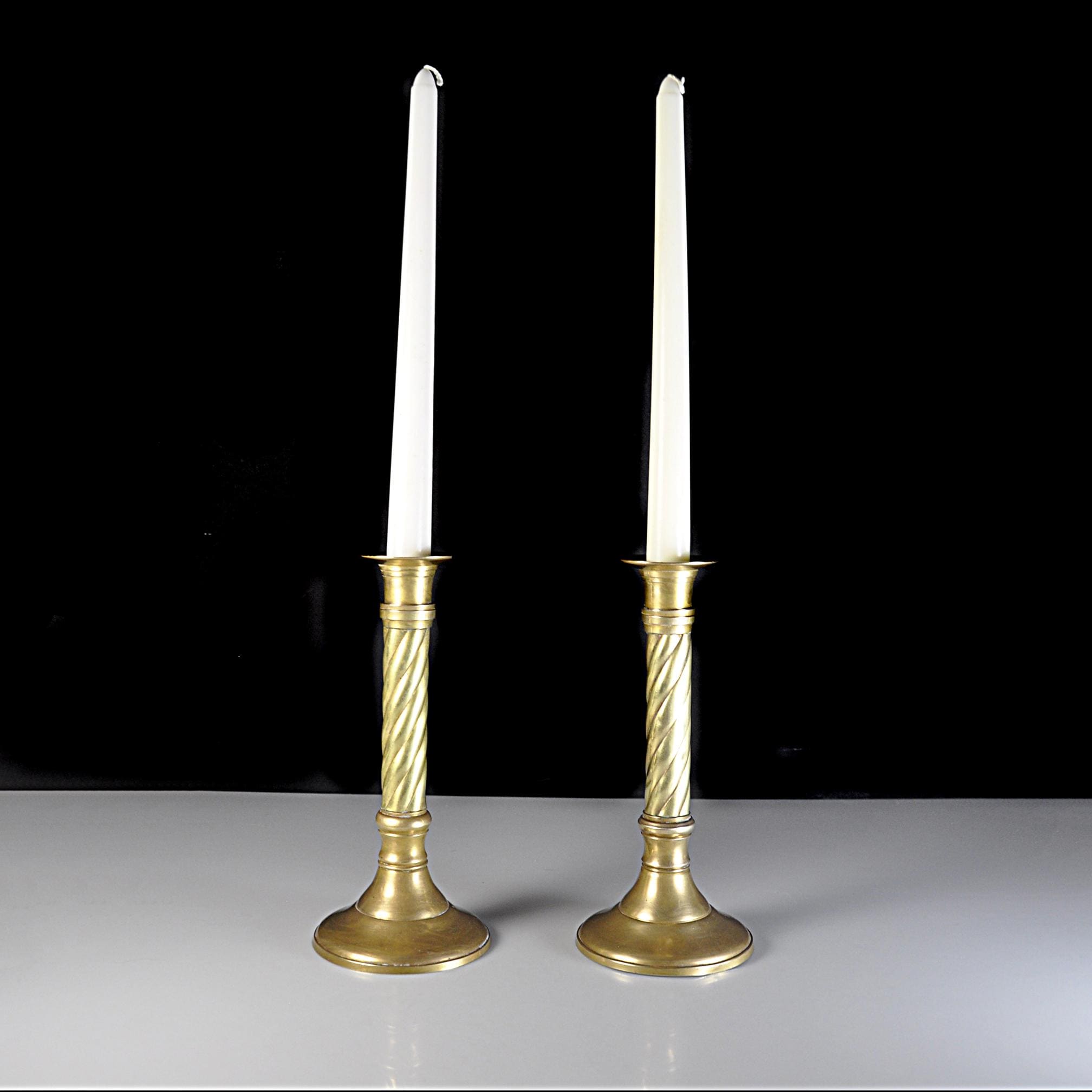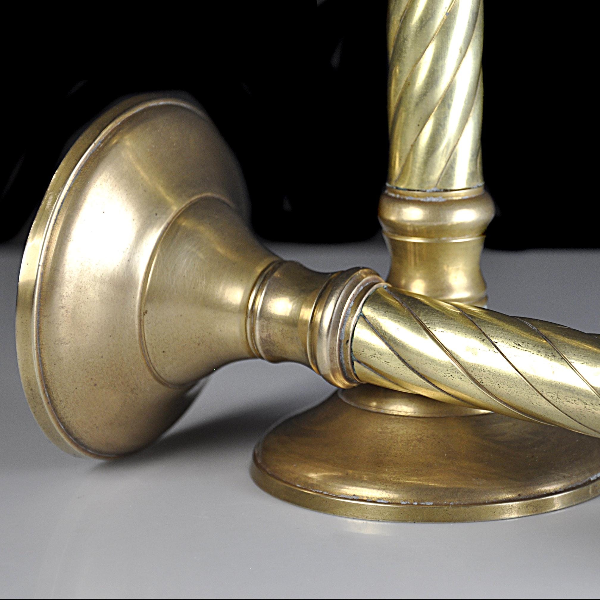 Brass candlesticks are timeless. They’ve always had a place on dining tables, mantels, and sideboards — adding warmth long before electric lighting became the norm. This matching pair of solid brass candlesticks were made in India, known for producing well-crafted brass home décor pieces throughout the mid to late 20th century. The classic twisted column design gives them a traditional look that works beautifully in both vintage and modern homes. Over the years, brass will develop a soft, natural patina that adds character without taking away from their shine. These have been recently polished. They display nicely whether polished bright or left with their gentle aged finish. Both candlesticks are sturdy and well balanced. One candlestick has a small dent to the base consistent with normal vintage use, which does not affect stability or display. A dependable decorative pair ready for everyday use or seasonal decorating.