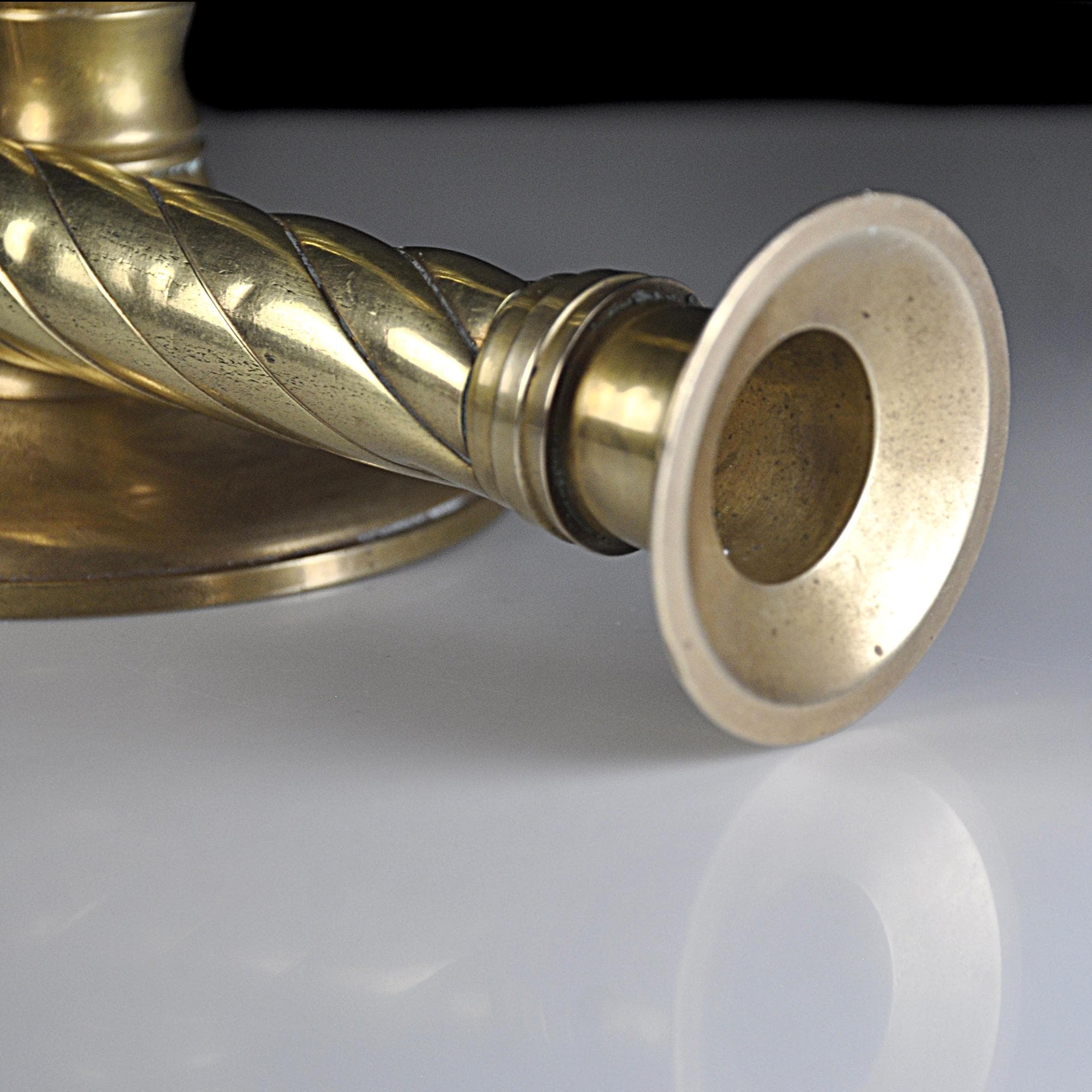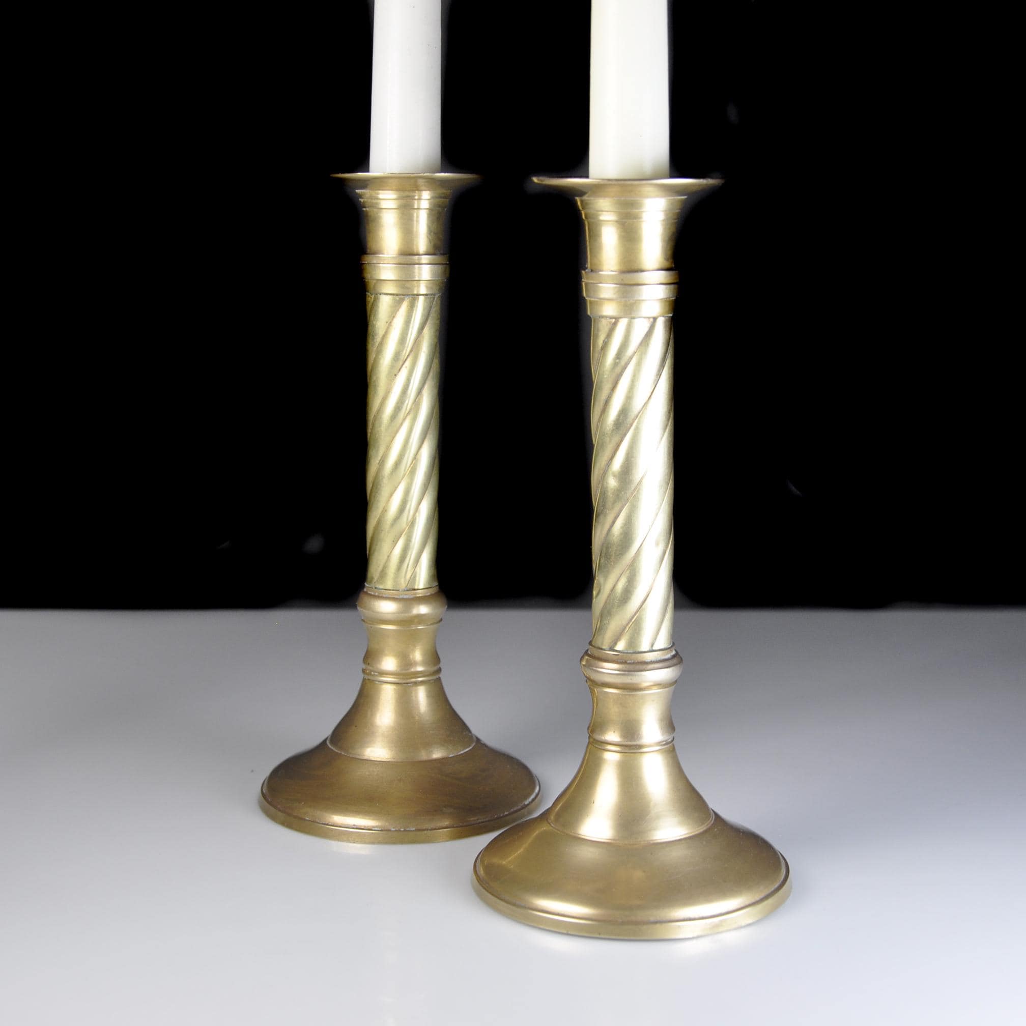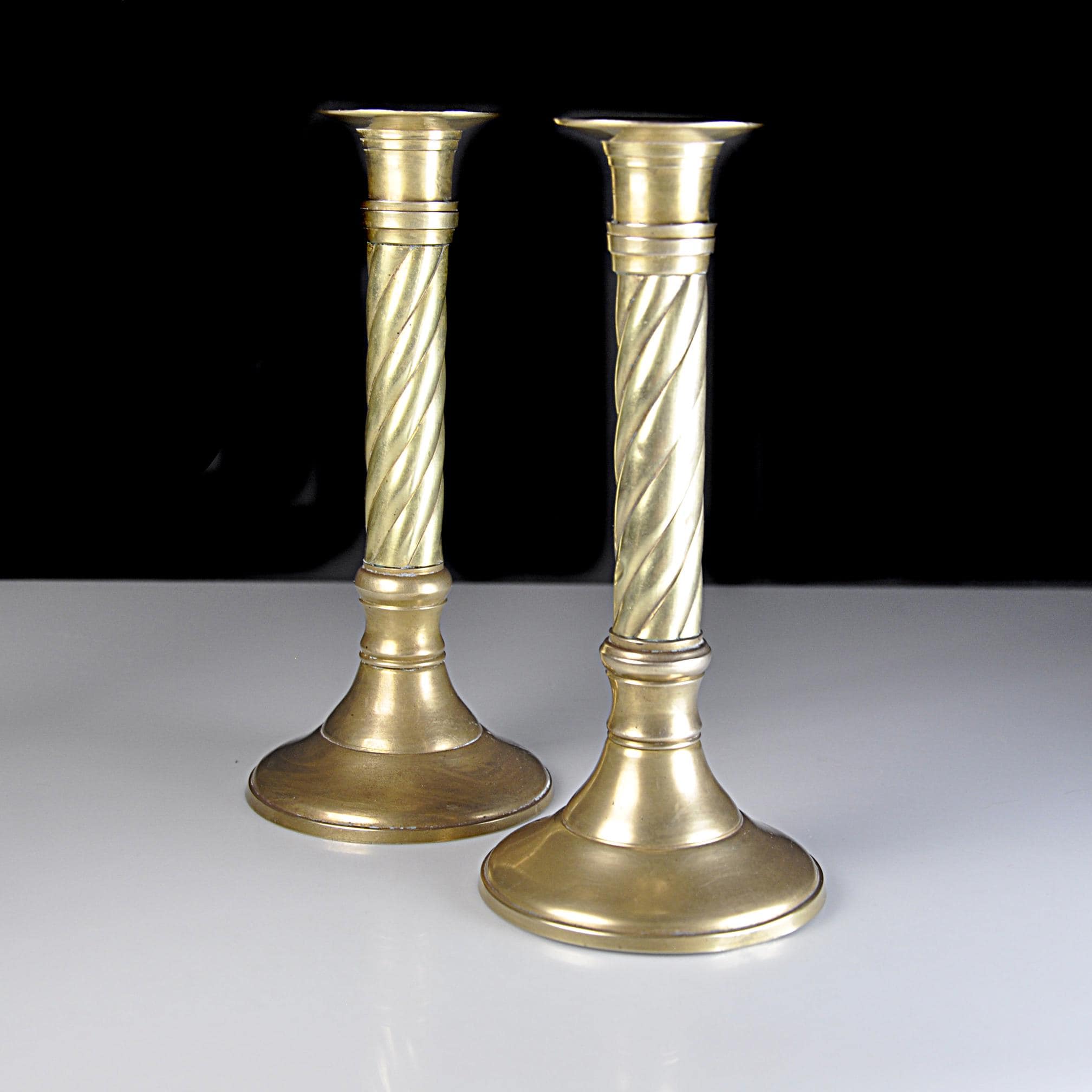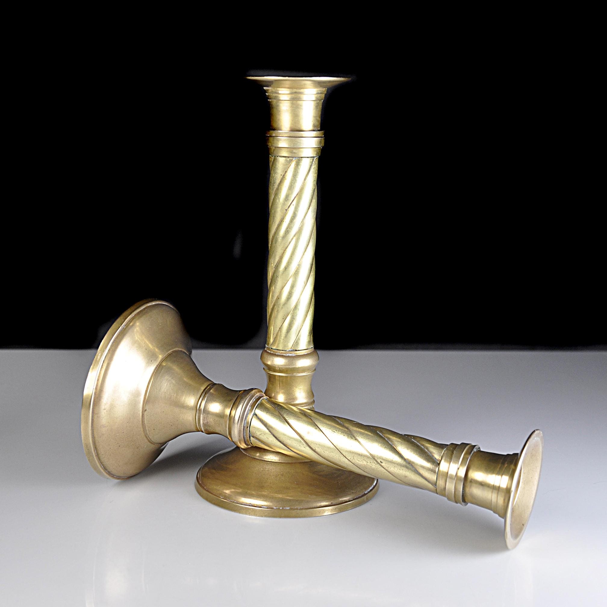 Brass candlesticks are timeless. They’ve always had a place on dining tables, mantels, and sideboards — adding warmth long before electric lighting became the norm. This matching pair of solid brass candlesticks were made in India, known for producing well-crafted brass home décor pieces throughout the mid to late 20th century. The classic twisted column design gives them a traditional look that works beautifully in both vintage and modern homes. Over the years, brass will develop a soft, natural patina that adds character without taking away from their shine. These have been recently polished. They display nicely whether polished bright or left with their gentle aged finish. Both candlesticks are sturdy and well balanced. One candlestick has a small dent to the base consistent with normal vintage use, which does not affect stability or display. A dependable decorative pair ready for everyday use or seasonal decorating.