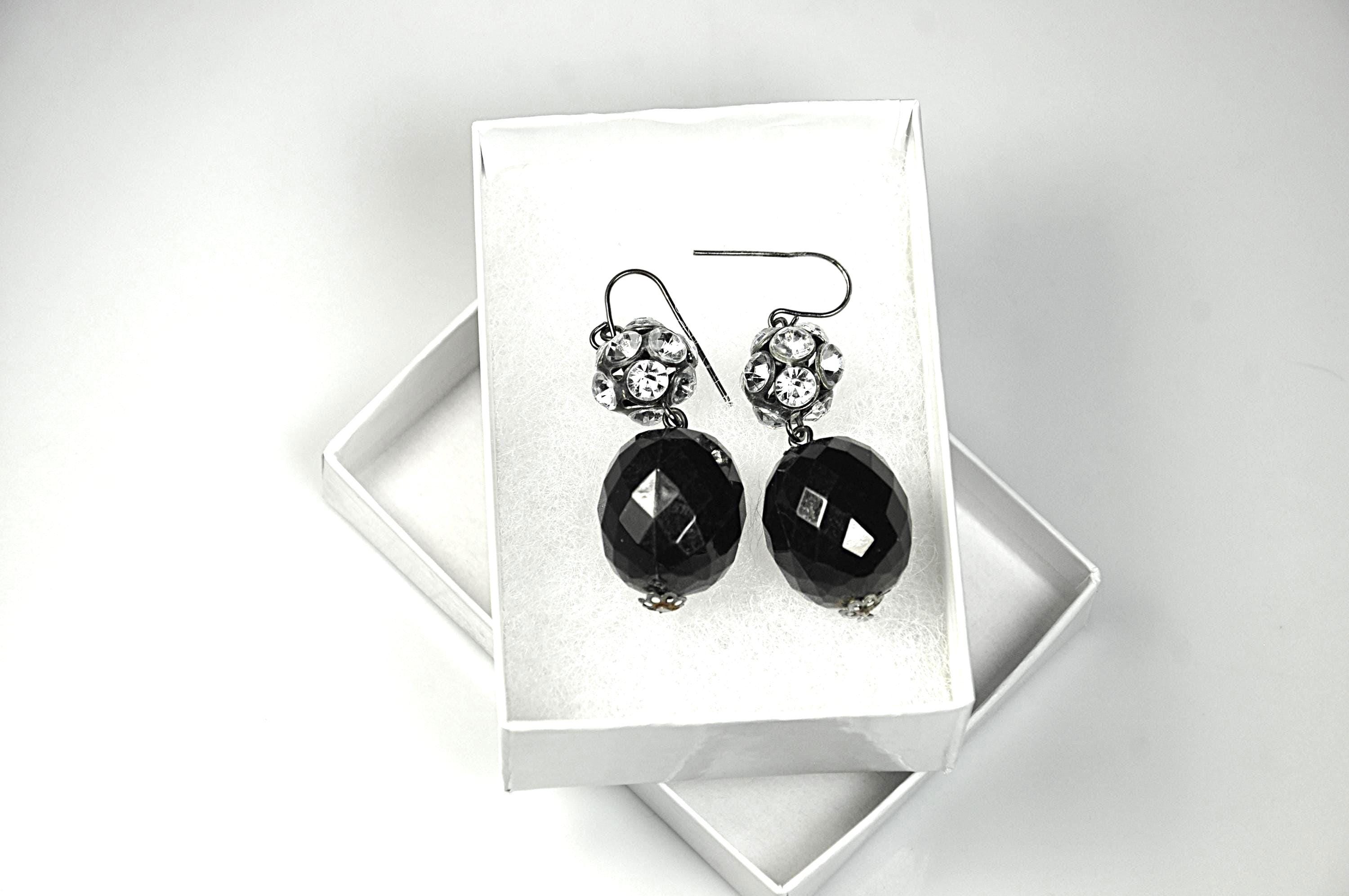 • Faceted black glass bead drops