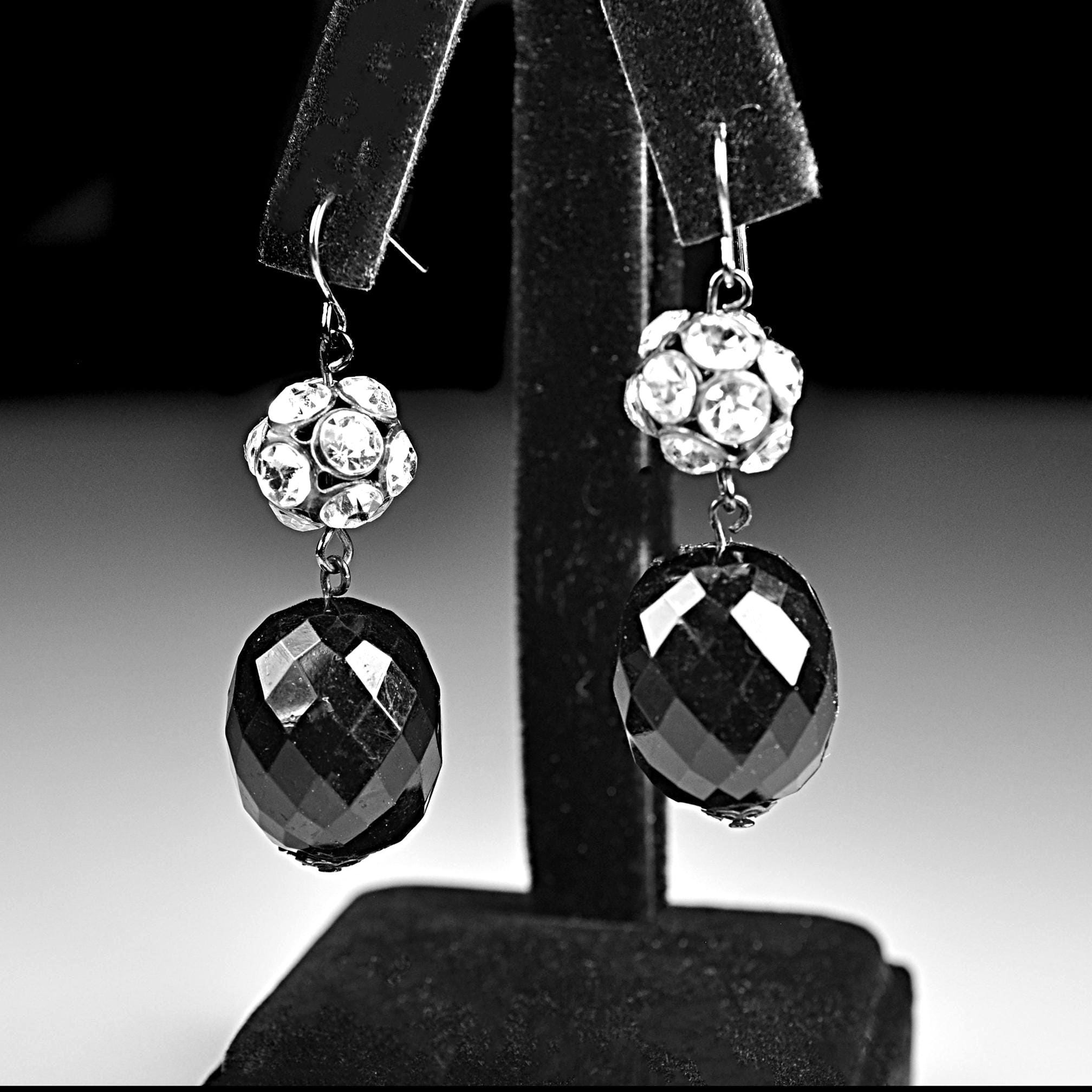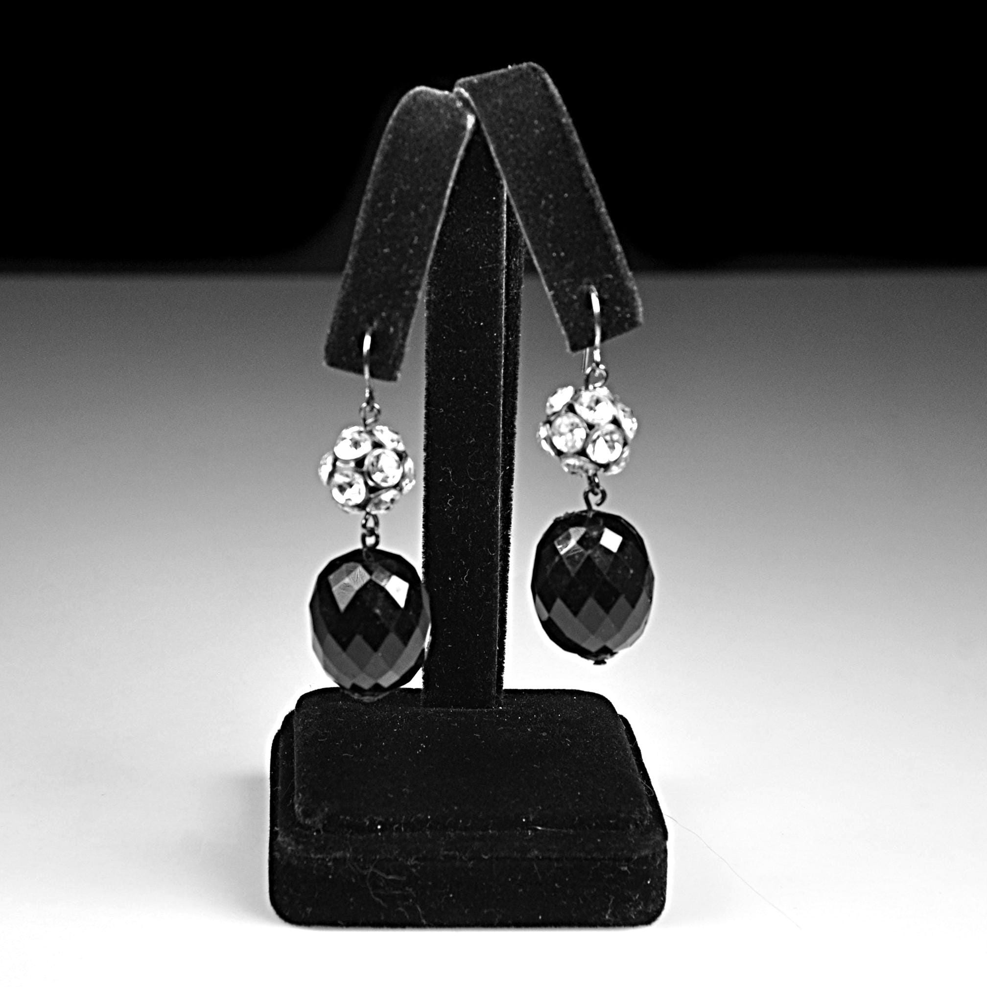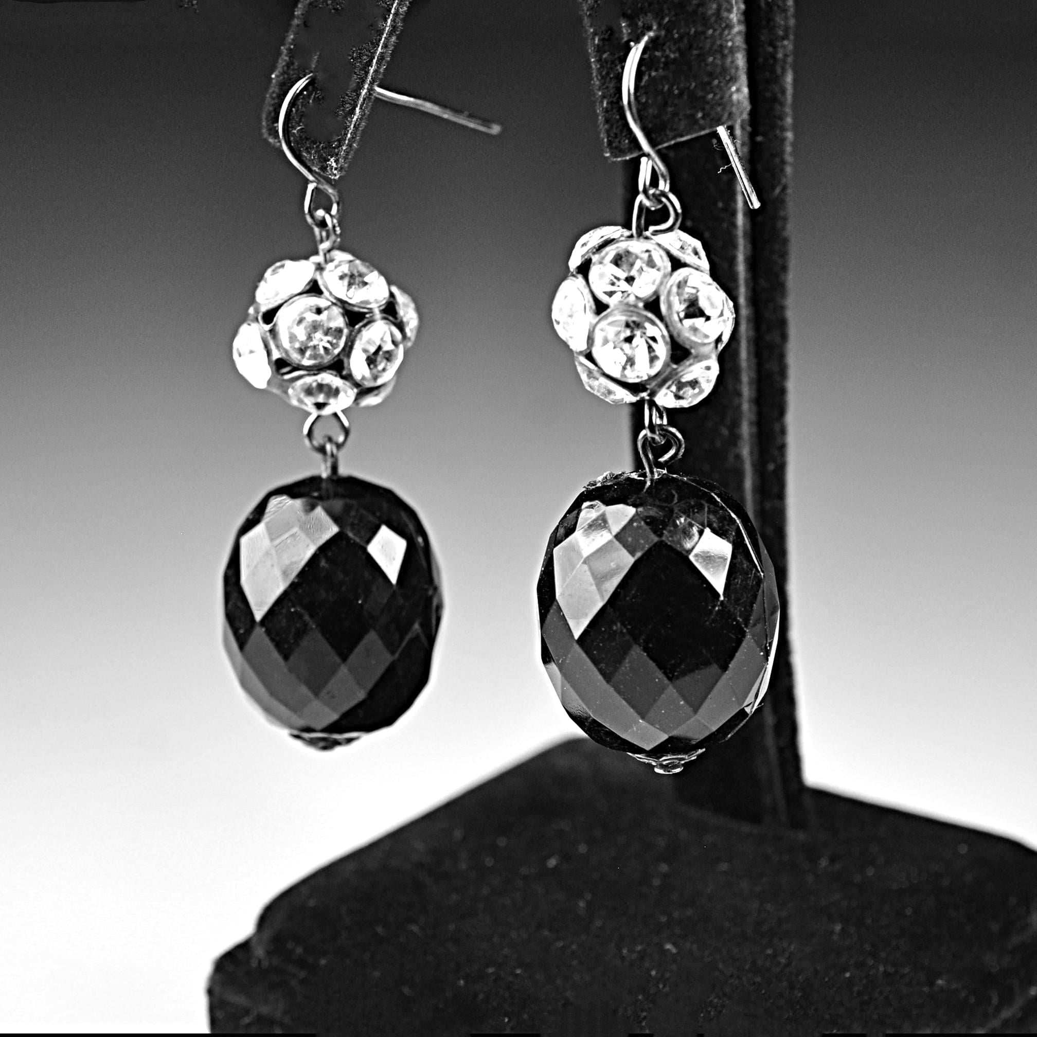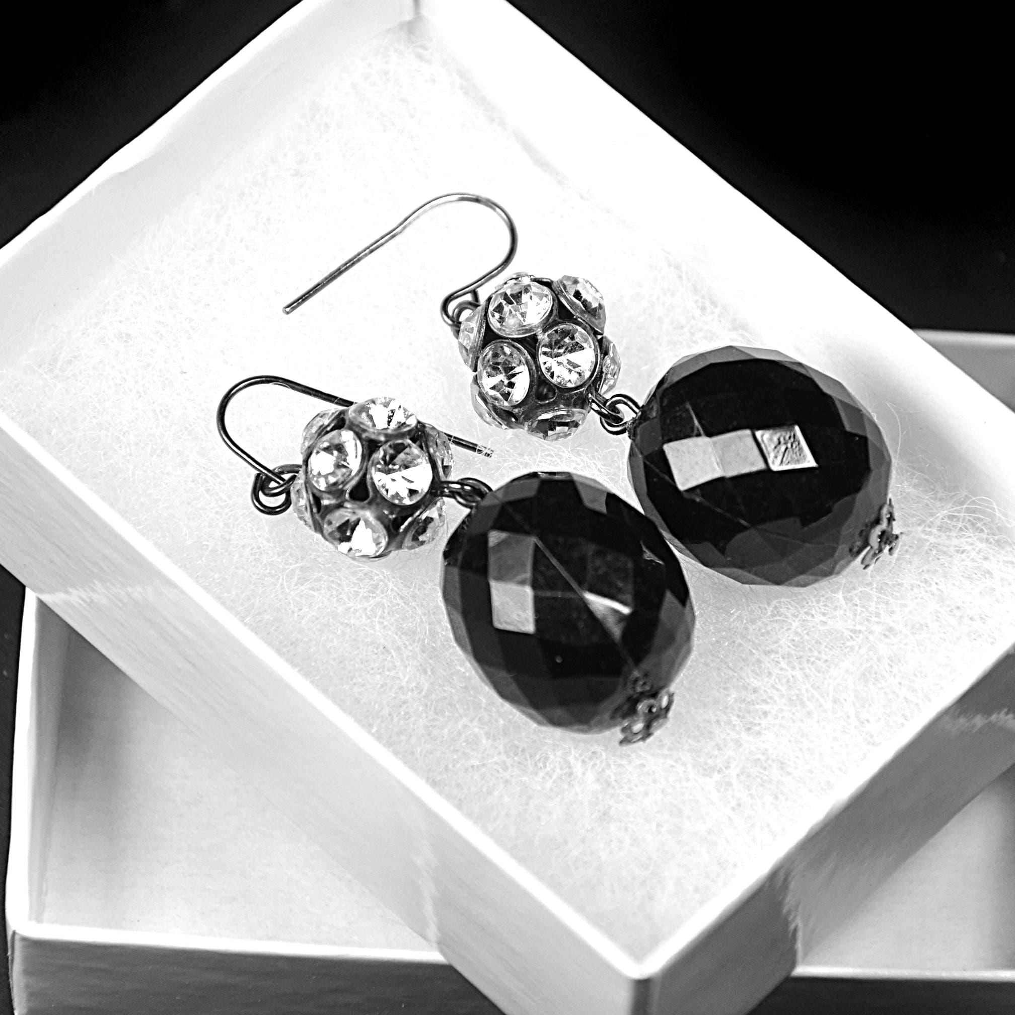 A pretty pair of vintage black glass drop earrings with sparkling rhinestone accents. These earrings have a classic evening look and catch the light beautifully when worn. Each earring features a faceted black glass bead that hangs below a rhinestone-set ball spacer. The stones add just the right amount of sparkle, while the dark gunmetal tone gives them a slightly dramatic look that pairs well with dressy outfits or simple everyday wear. These would look lovely with a black dress, evening wear, or even with a casual outfit when you want just a bit of shine.