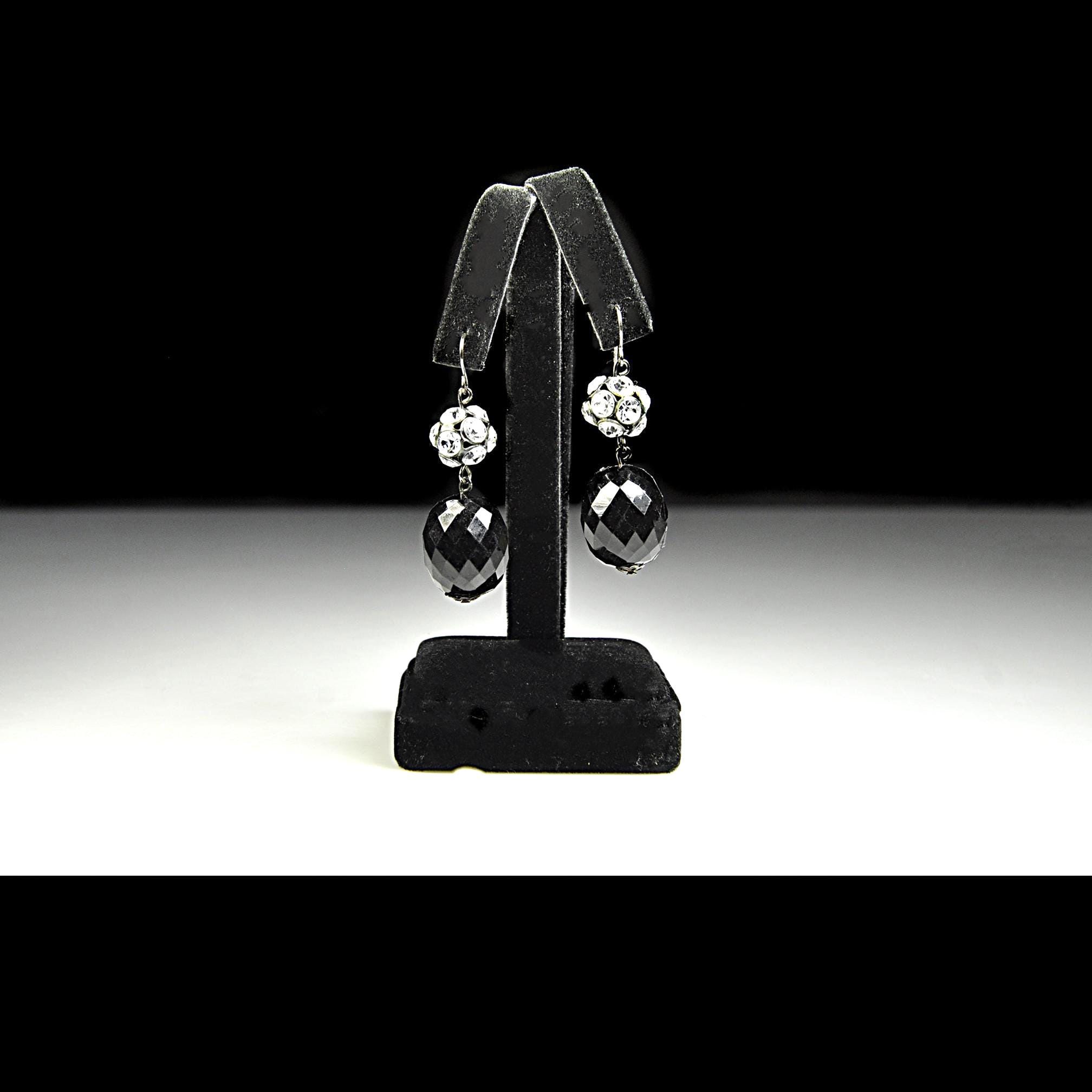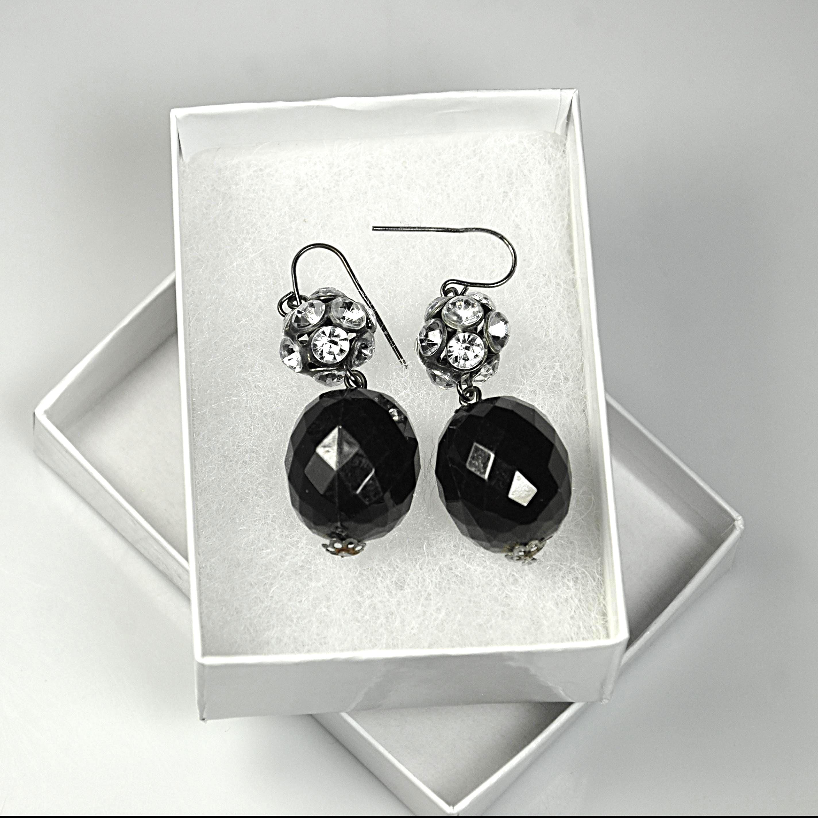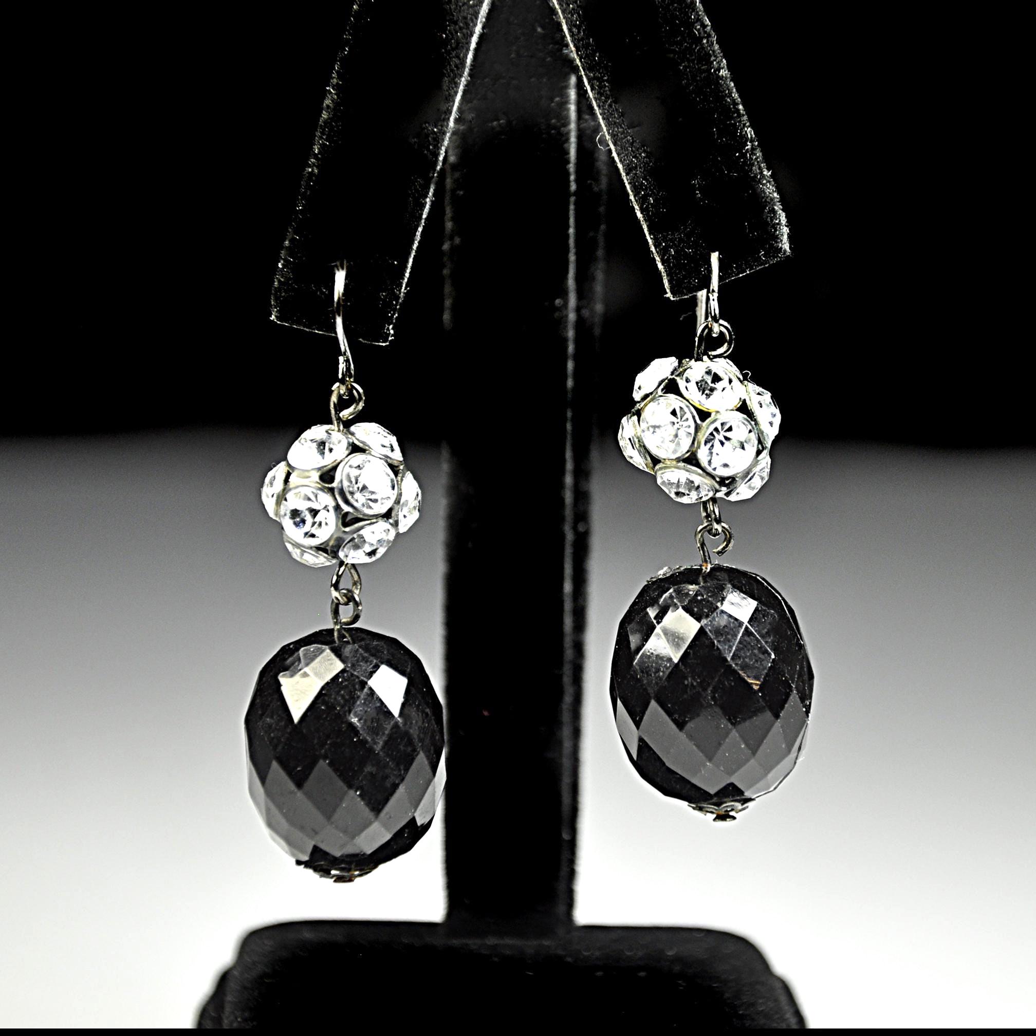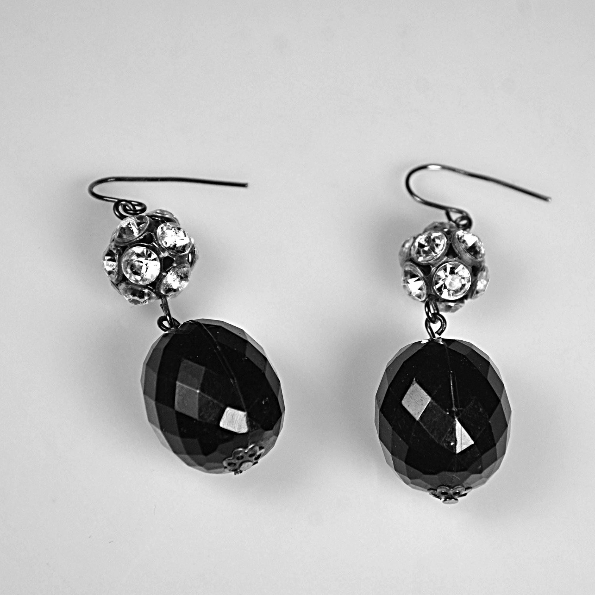 A pretty pair of vintage black glass drop earrings with sparkling rhinestone accents. These earrings have a classic evening look and catch the light beautifully when worn. Each earring features a faceted black glass bead that hangs below a rhinestone-set ball spacer. The stones add just the right amount of sparkle, while the dark gunmetal tone gives them a slightly dramatic look that pairs well with dressy outfits or simple everyday wear. These would look lovely with a black dress, evening wear, or even with a casual outfit when you want just a bit of shine.