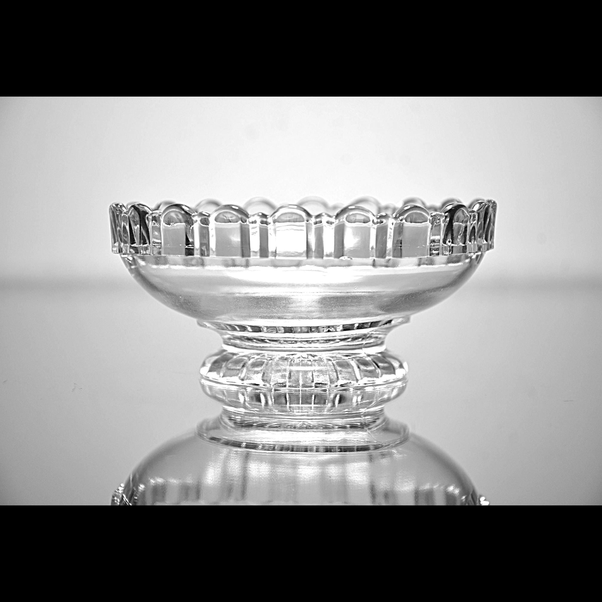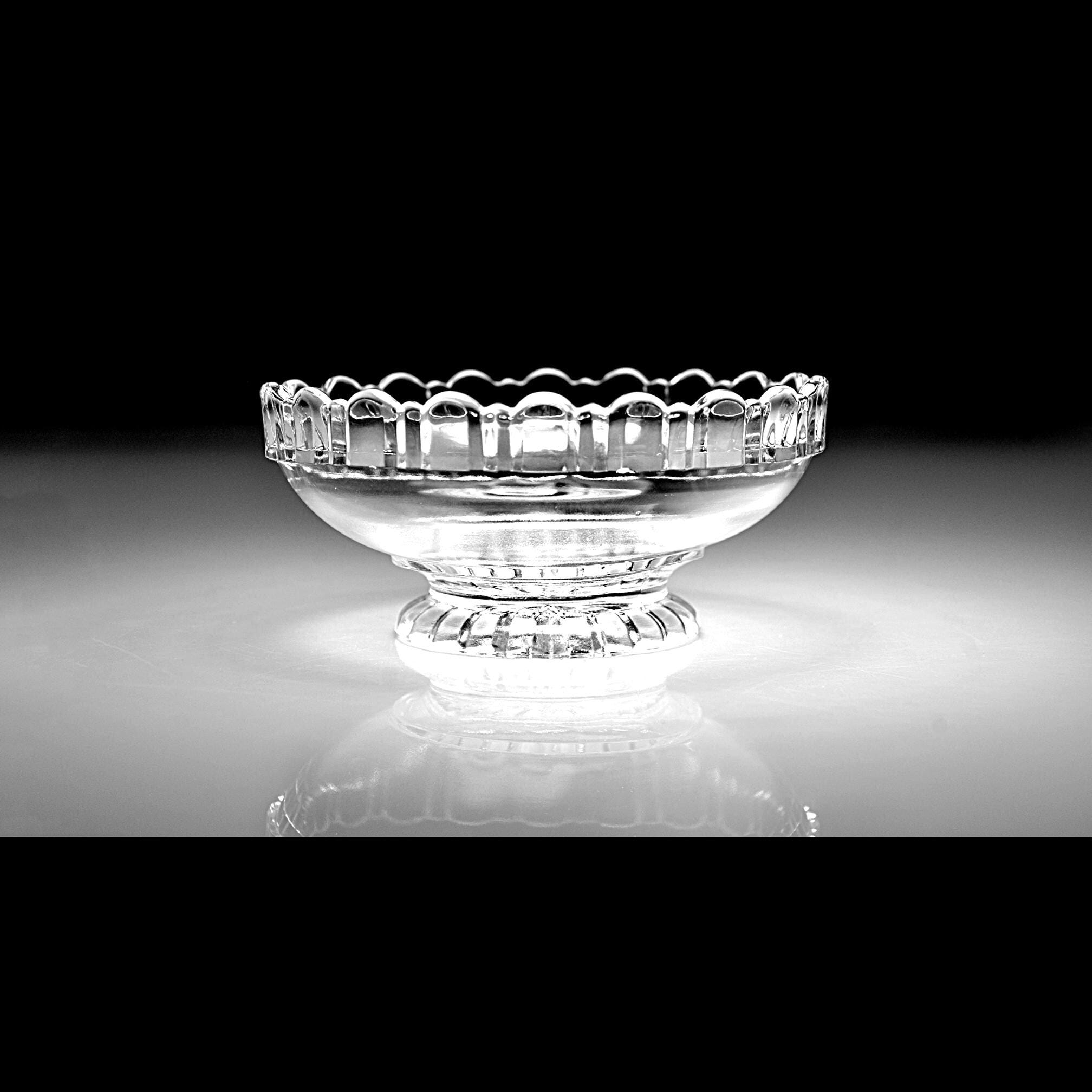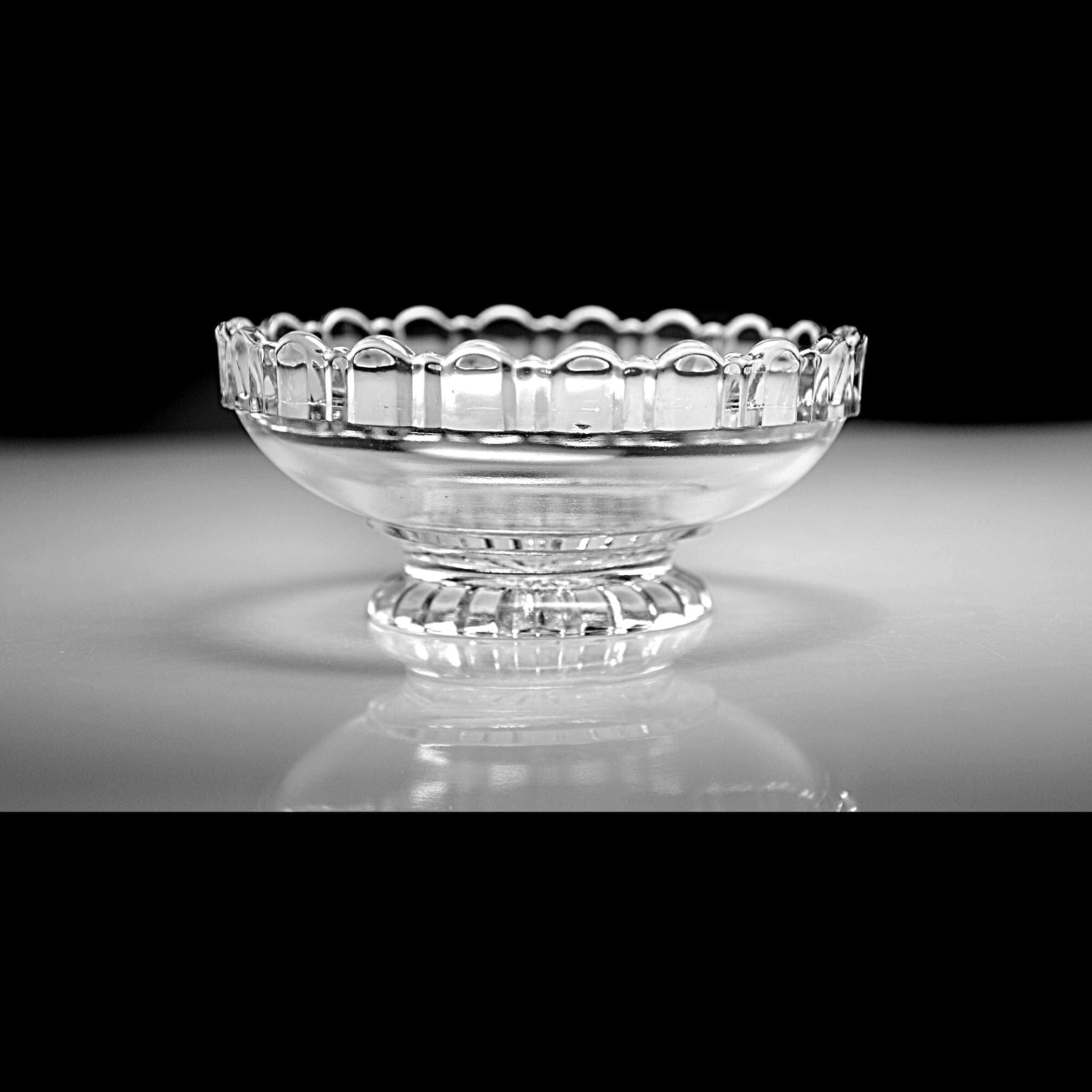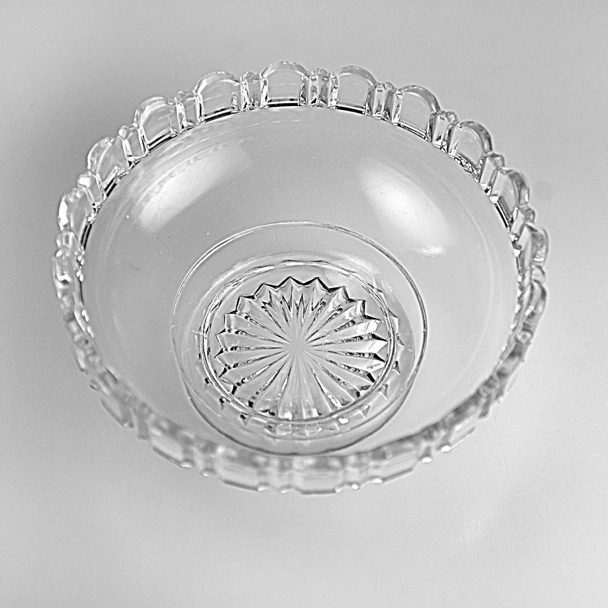 Every once in a while, something turns up that reminds you how long ordinary household pieces have been part of everyday life. This little footed bowl dates back to the Victorian era, when pressed glass was becoming popular in American homes. This piece was made by George Duncan & Sons, a Pittsburgh glass company known for producing beautiful Early American Pressed Glass patterns in the late 1800s. According to the Early American Pattern Glass Society, this pattern was introduced in 1885, placing this bowl firmly in the Victorian period. The design is simple but elegant. Around the rim is a row of rounded panels that catch the light nicely, while the base features a classic pressed starburst pattern. The small pedestal foot lifts the bowl just enough to give it that graceful 19th-century tableware look. Pieces like this were commonly used for berries, nuts, candies, or small individual servings on the Victorian dining table. Today it makes a lovely little dish for candy, jewelry, trinkets, or simply as a small antique display piece. After more than a century, this bowl is still clear, bright, and ready for another home.