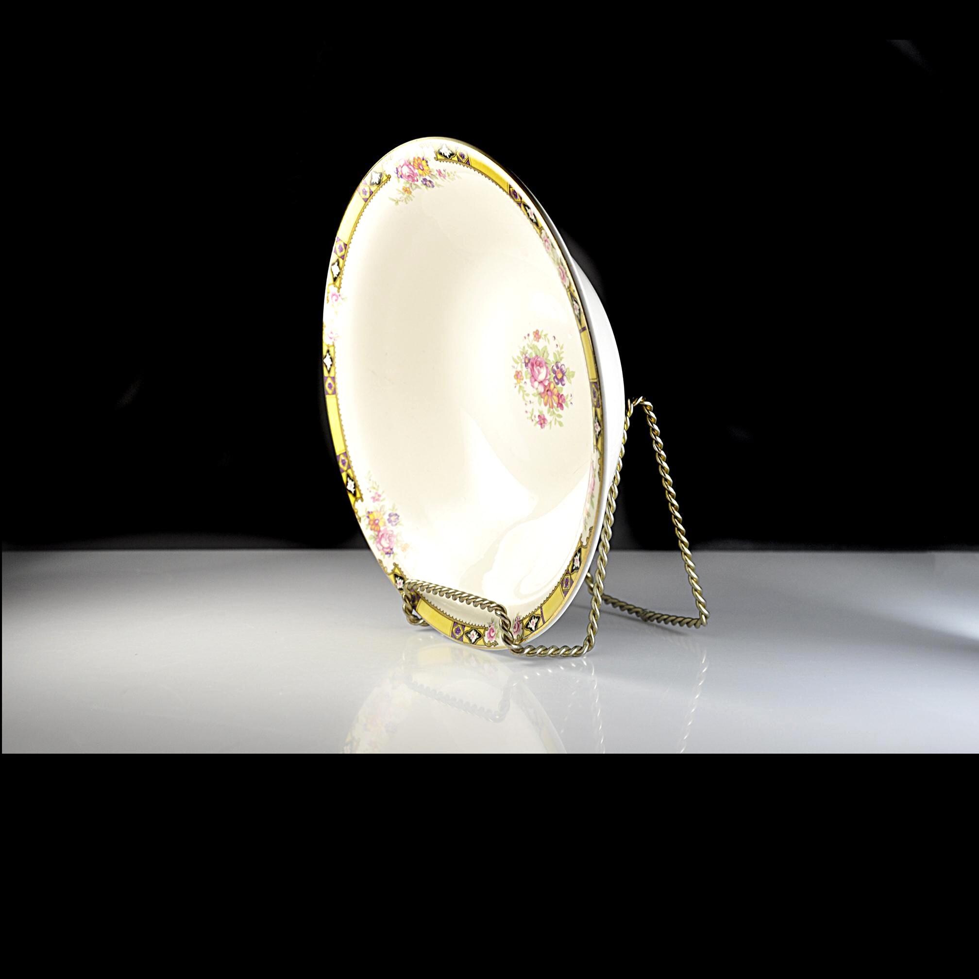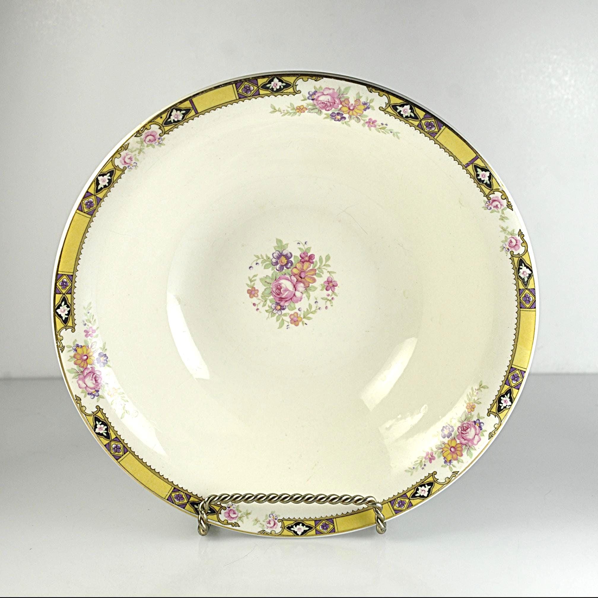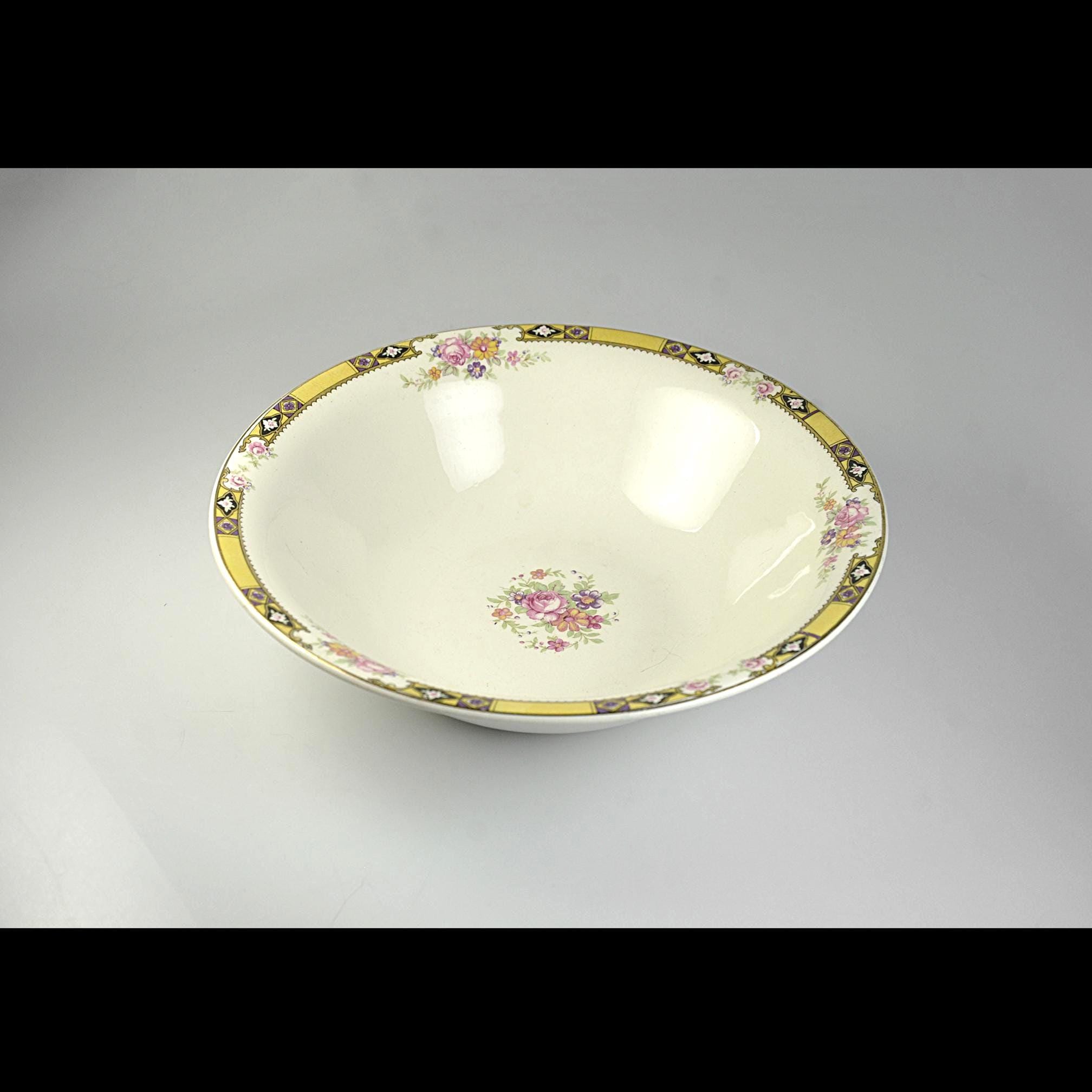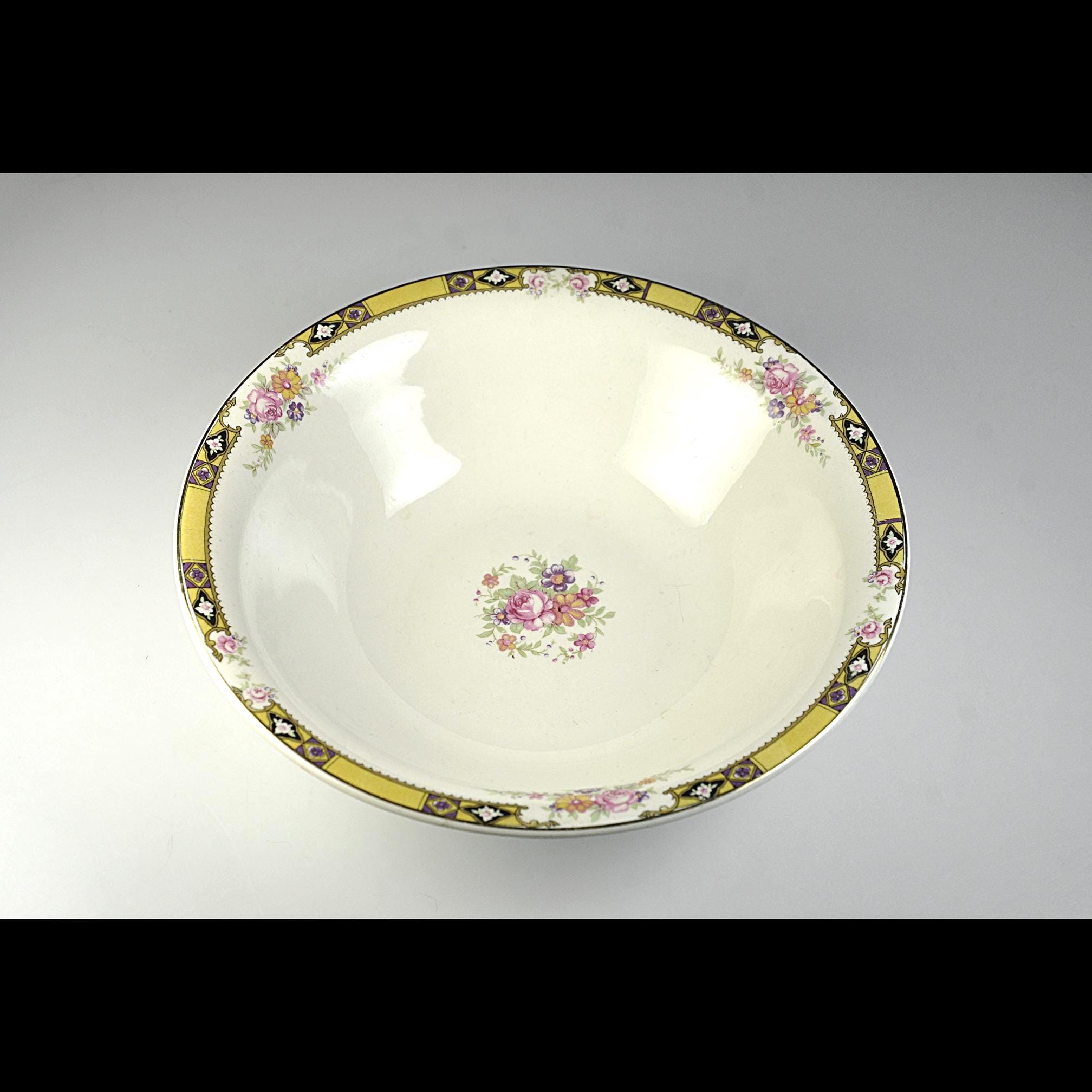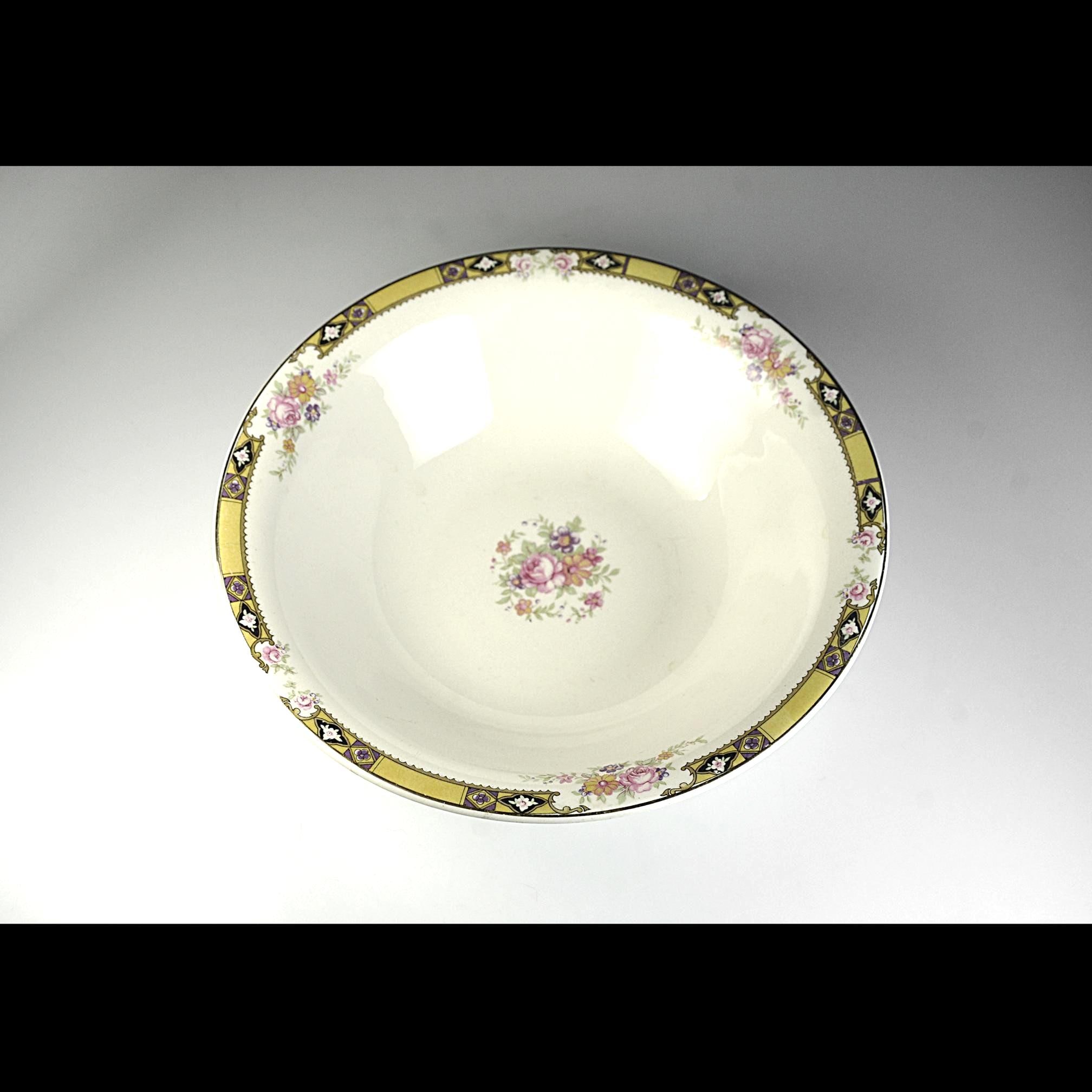Some dishes have that quiet elegance that was common in American homes before the war, when Sunday dinner meant setting out the good china and gathering the family around the table. This vintage vegetable serving bowl was made by the Edwin M. Knowles China Company in West Virginia, one of the long-standing American china makers of the early 20th century. The bowl has a soft ivory body with a delicate bouquet of flowers in the center, surrounded by small floral accents and a striking gold geometric border with black and purple details around the rim. The Art Deco design reflects the decorative styles popular in the late 1930s and early 1940s, when floral china with gold trim was often reserved for holiday meals and special occasions. It makes a lovely serving bowl for vegetables, fruit, or side dishes and would also display beautifully in a china cabinet or vintage kitchen collection.