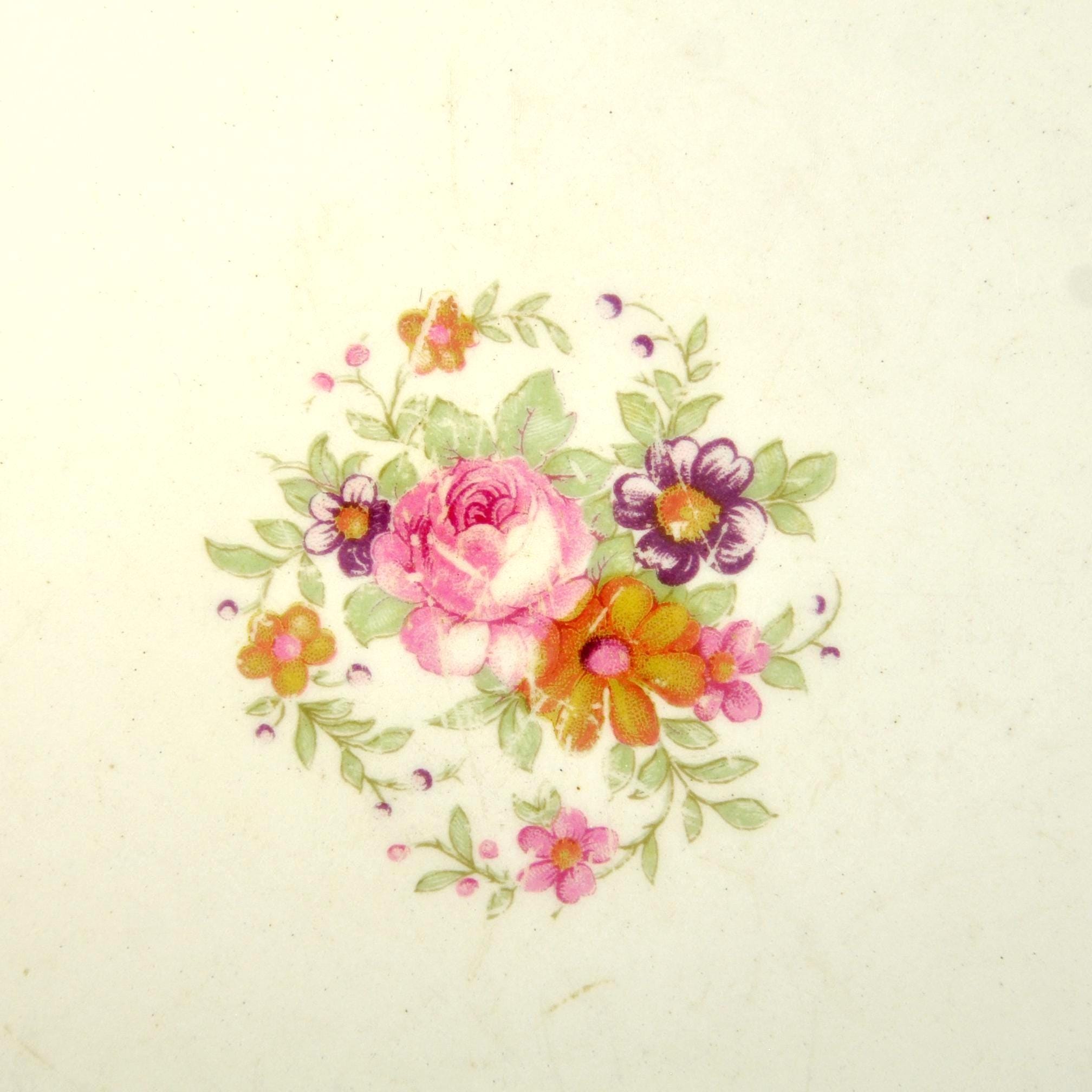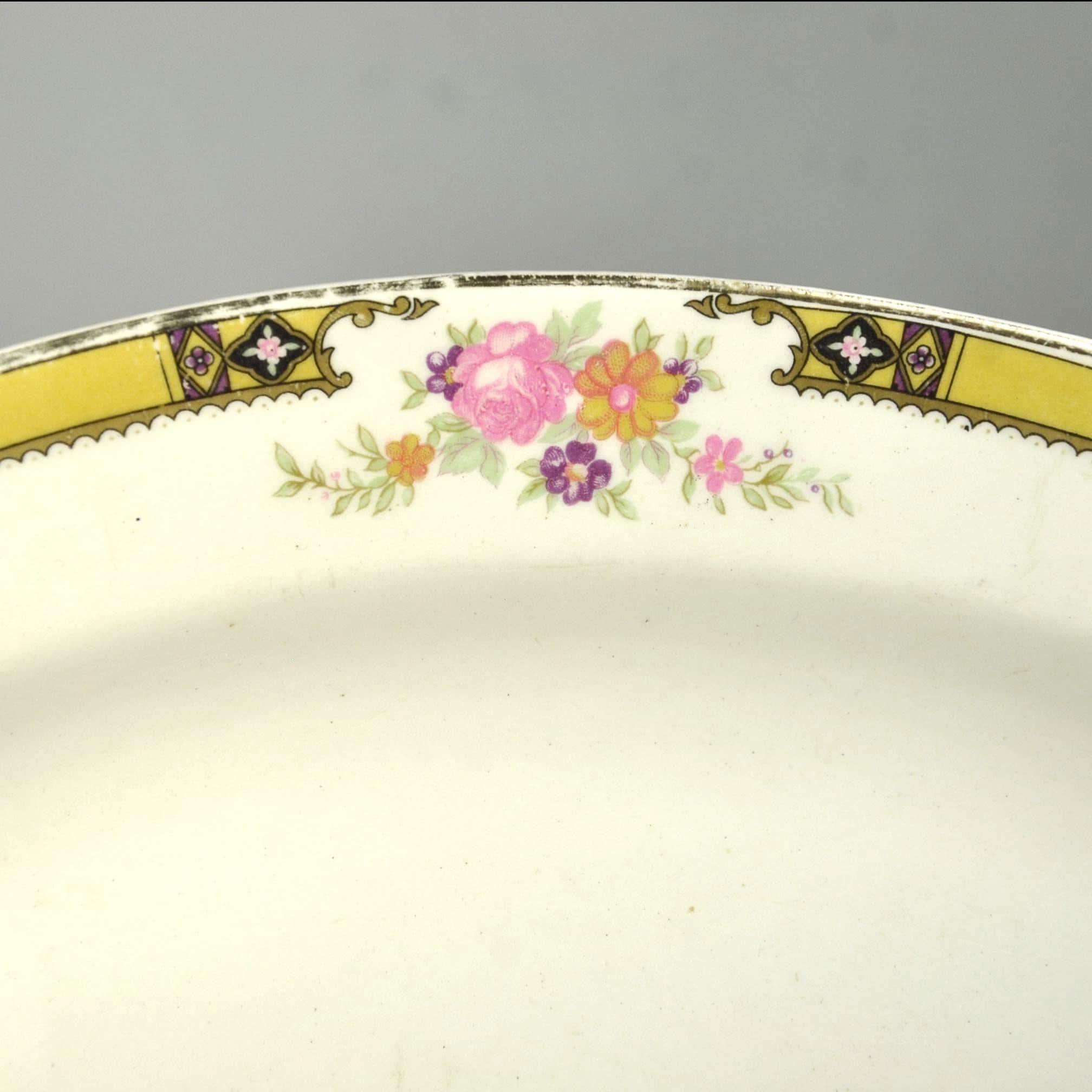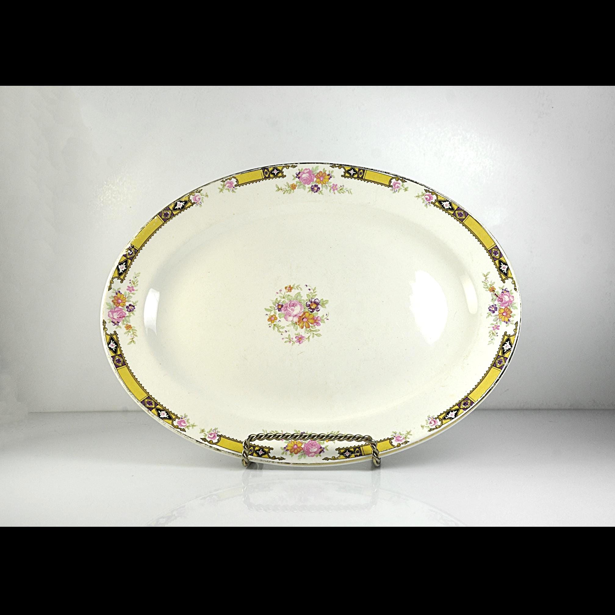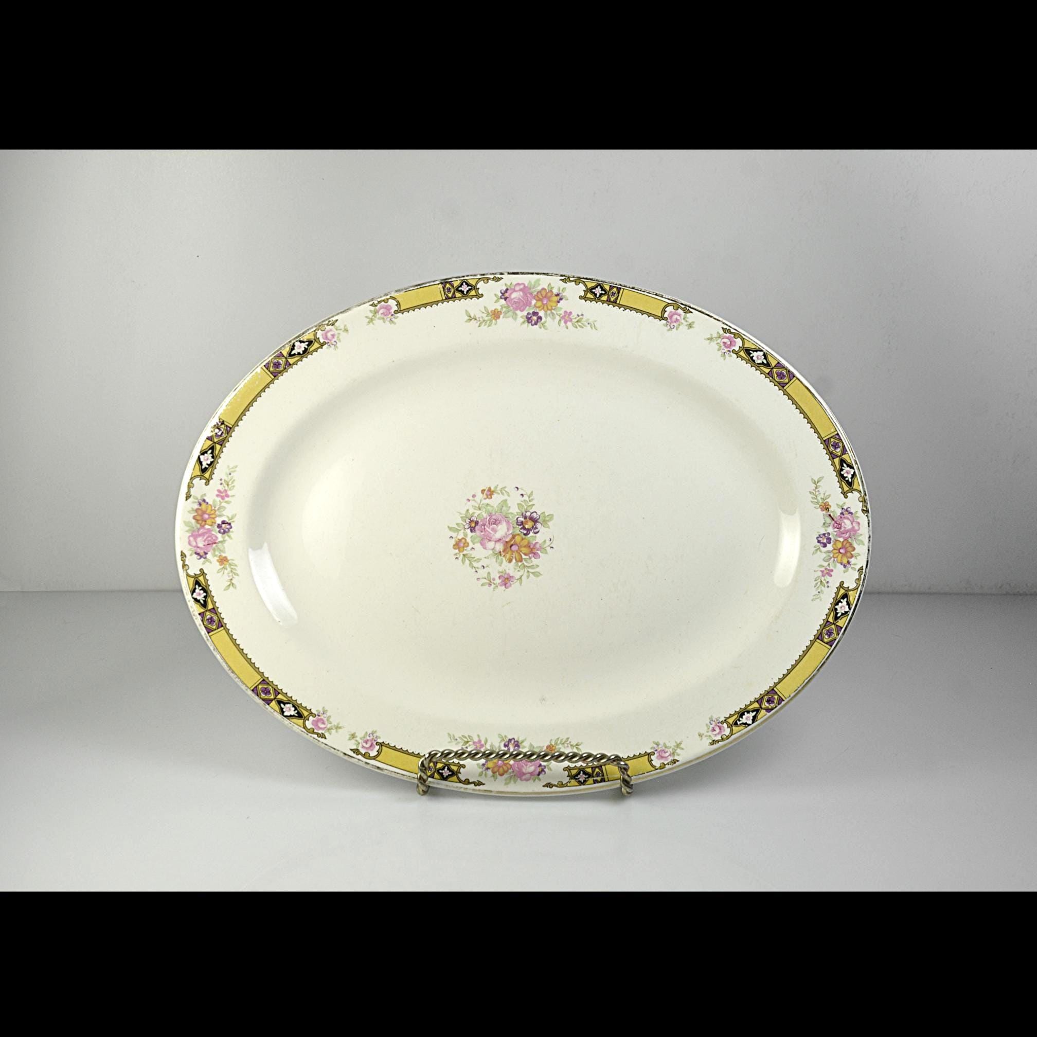 This vintage serving platter was made by the Edwin M. Knowles China Company of Newell, West Virginia, one of the well-known American china manufacturers of the early twentieth century. Pieces like this were part of dinner sets that were brought out for family gatherings, Sunday dinners, and holiday meals. The platter features a soft ivory background with a delicate floral bouquet in the center and small floral accents around the rim. Surrounding the edge is a striking geometric border in gold with black and purple accents, a design that reflects the Art Deco influence popular during the late 1930s and early 1940s. It is a beautiful example of vintage American dinnerware and would be perfect for serving meals, displaying in a china cabinet, or replacing a missing piece from an older Knowles dinner set.