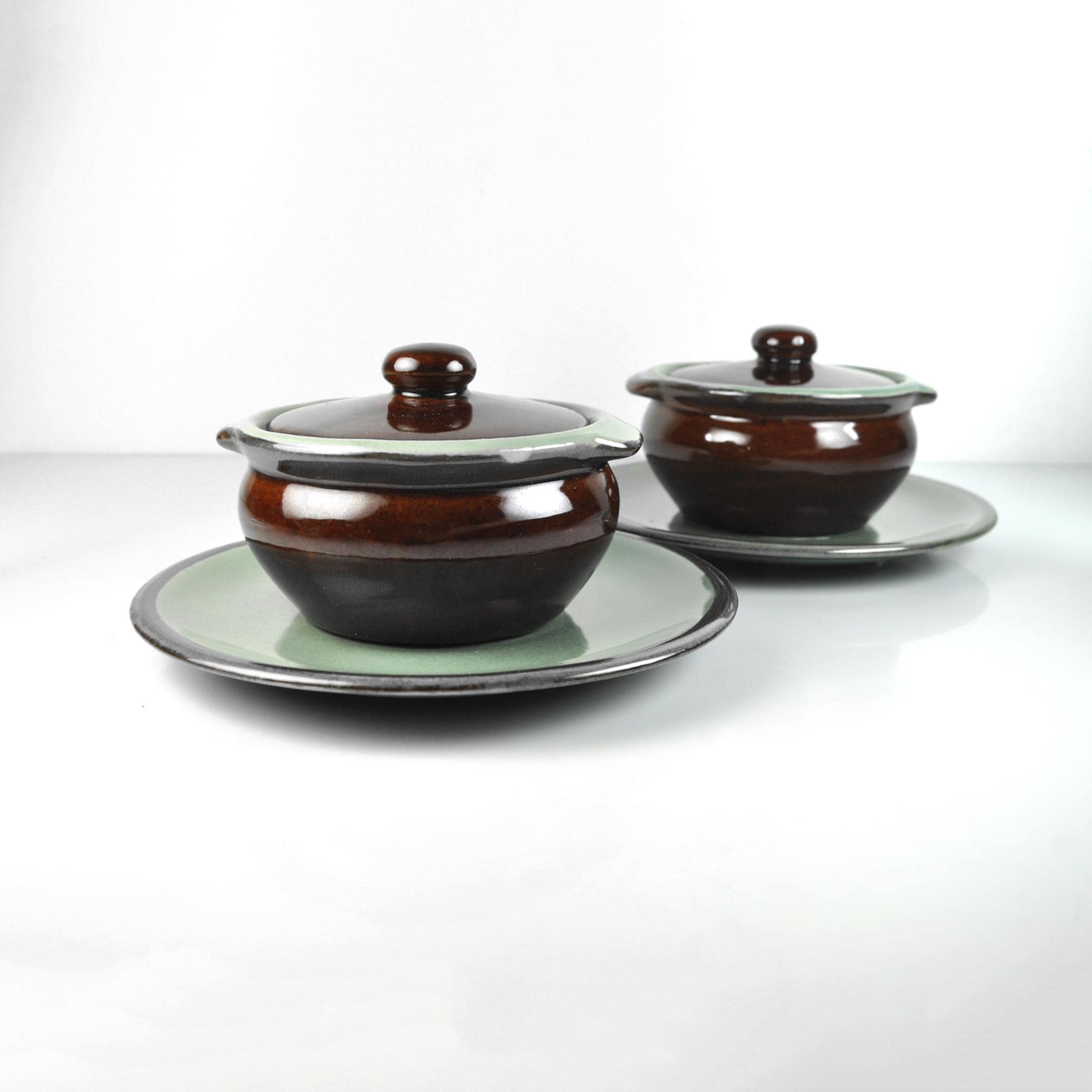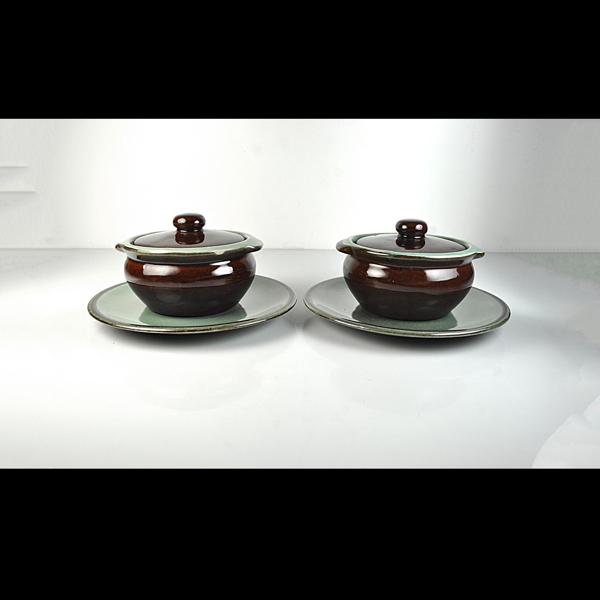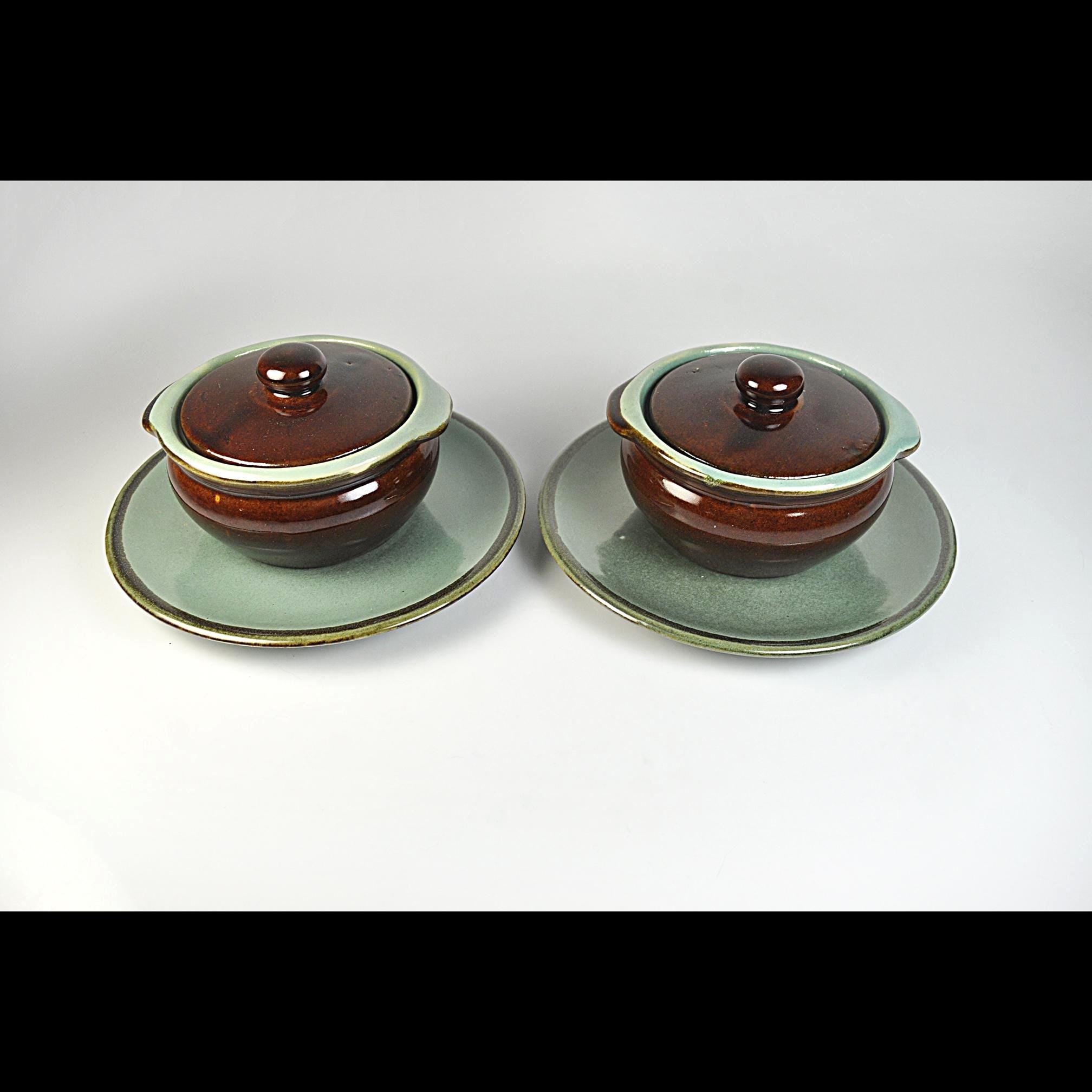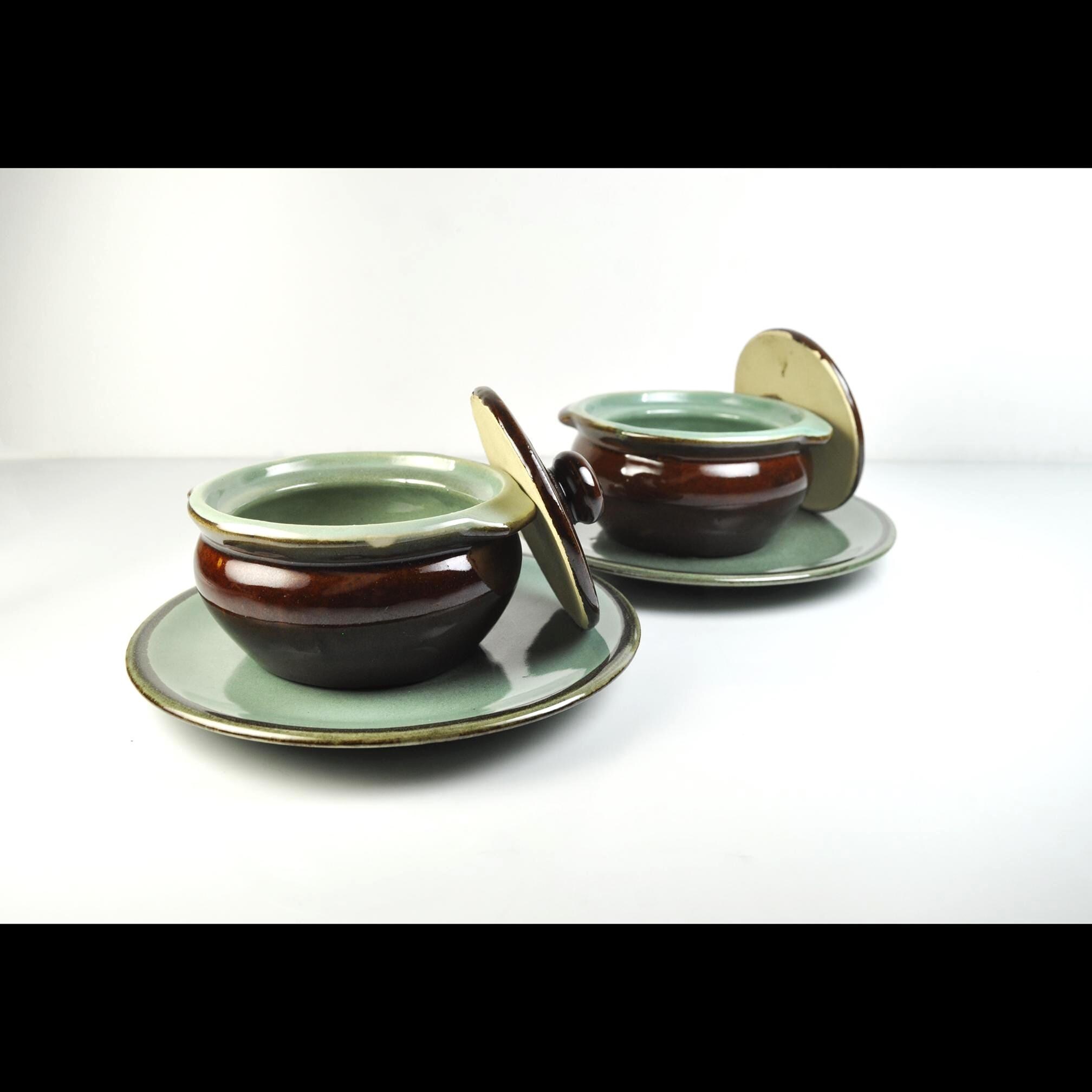 Some pieces just feel like they belong on a farmhouse table, and these little covered soup crocks are that kind of dish. Made by Red Wing Pottery in the Provincial Oomph pattern. This pair of vintage stoneware soup pots has the classic mid-century look—rich brown glaze on the outside with a soft sage green interior and rim. Each crock comes with its own lid and matching underplate, making them perfect for serving individual portions of soup, French onion, baked beans, or even small casseroles. Whether used at the table or displayed in a country kitchen, they have that warm, practical look that vintage stoneware is known for. These are sturdy little pieces, the kind that were meant to be used and enjoyed for years.
