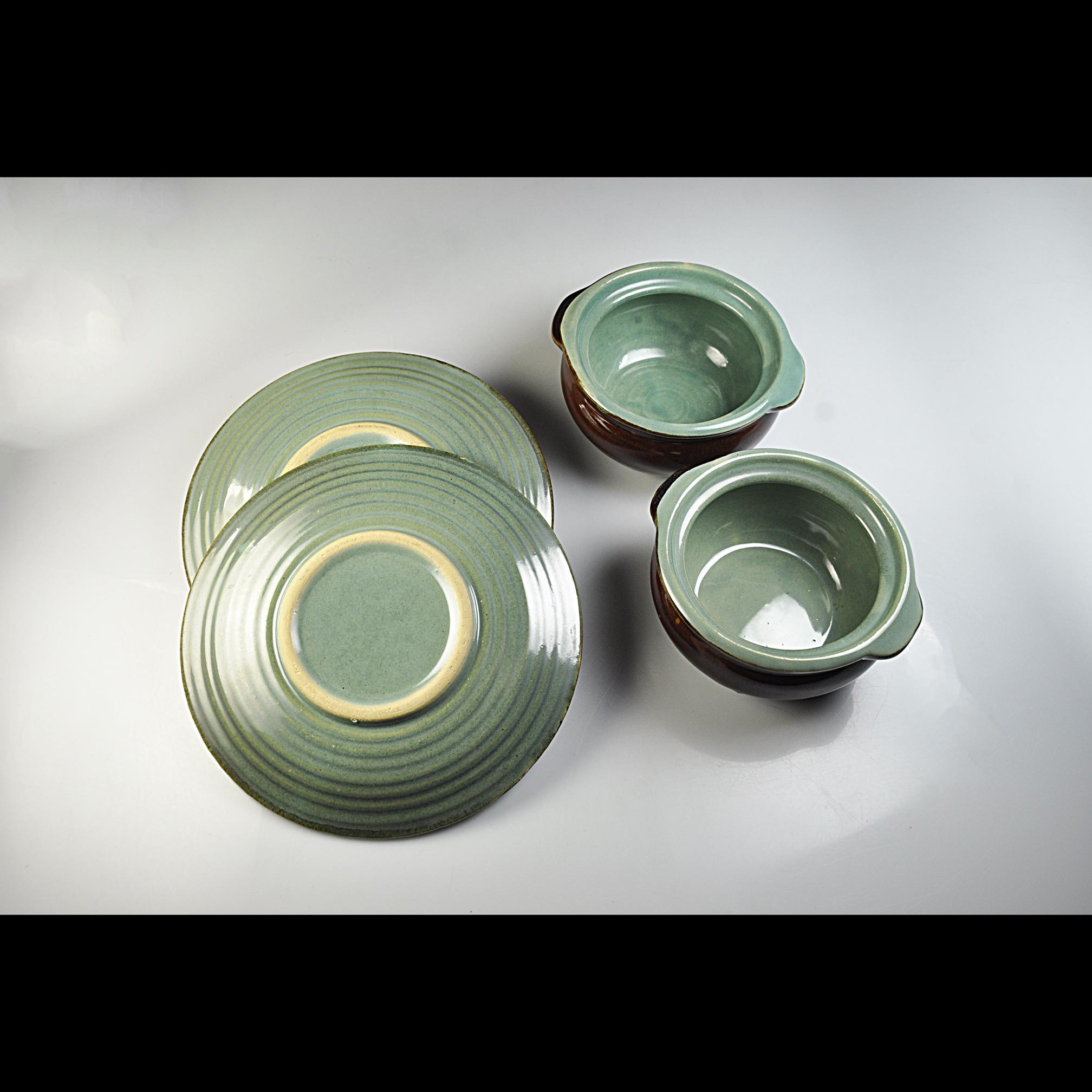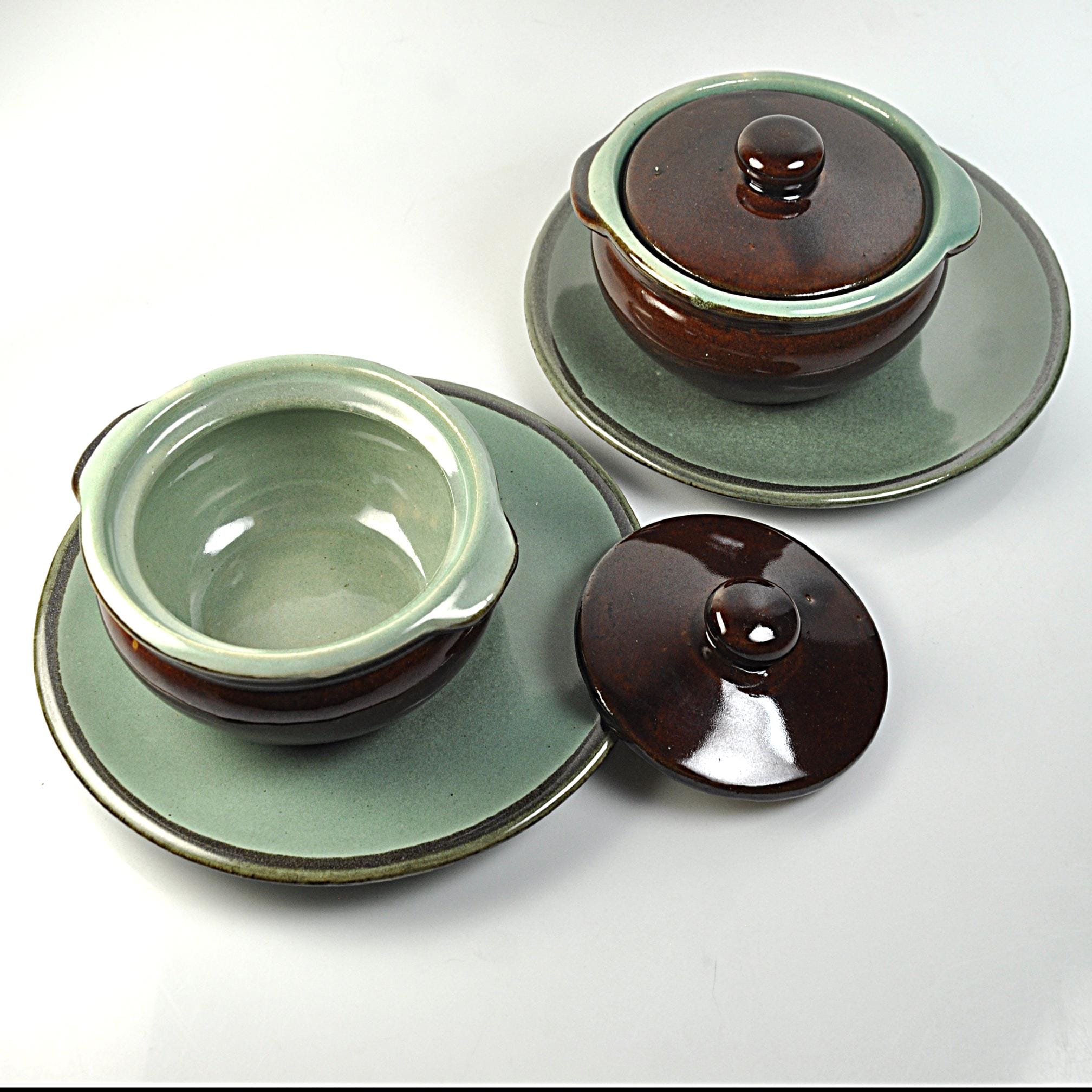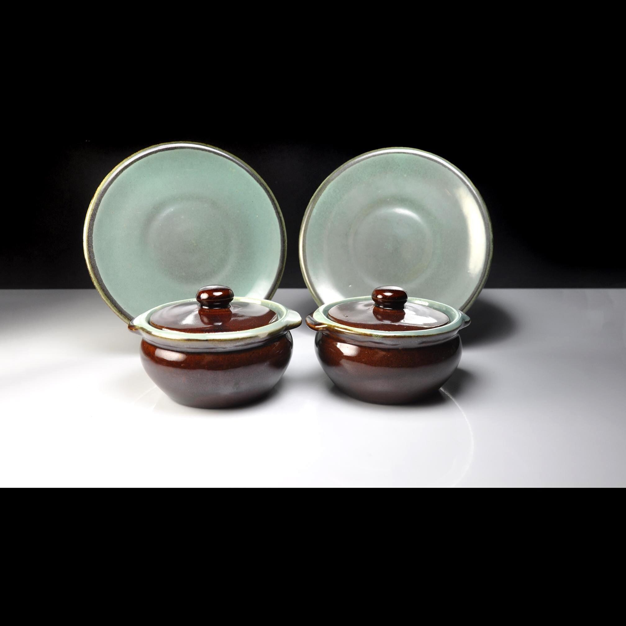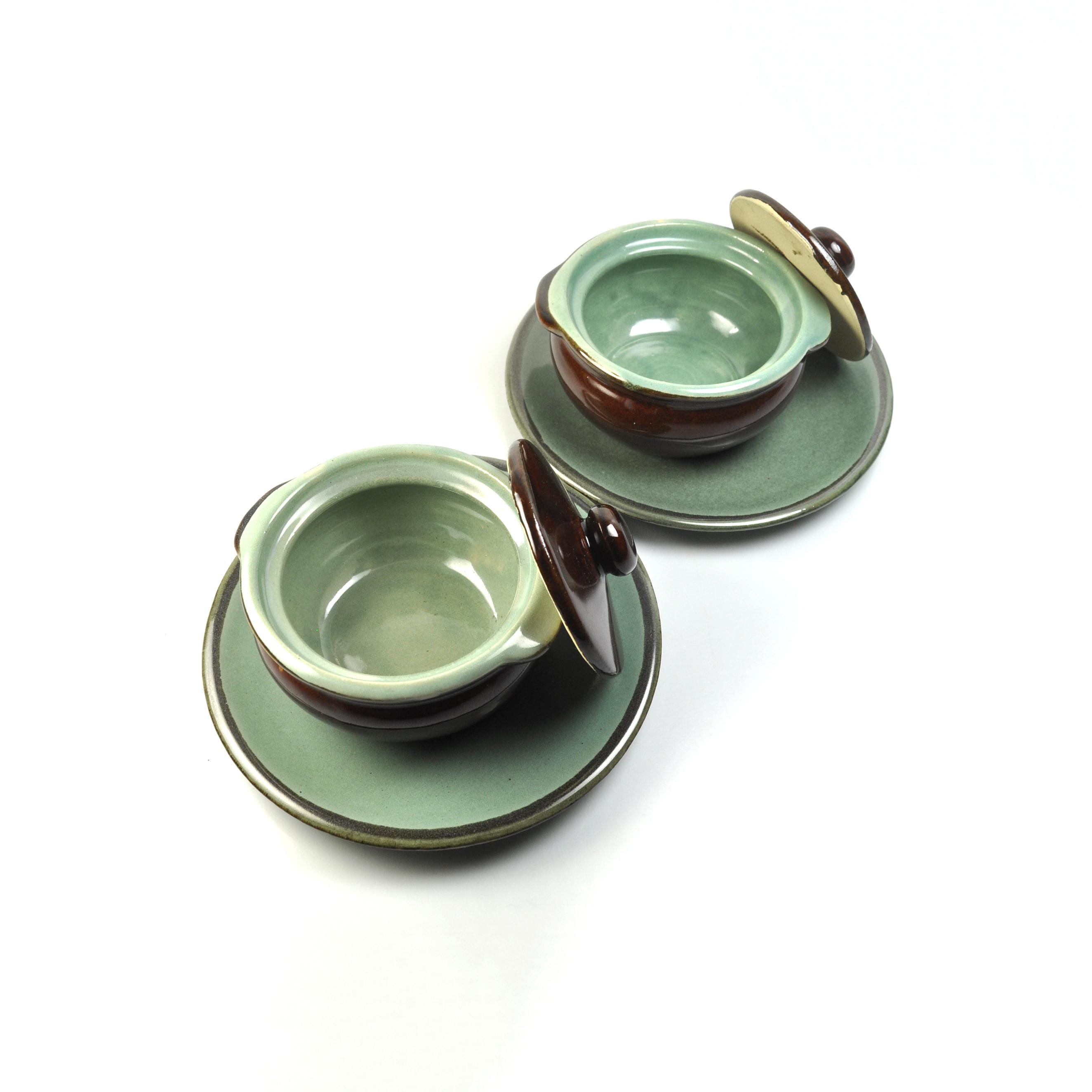 Some pieces just feel like they belong on a farmhouse table, and these little covered soup crocks are that kind of dish. Made by Red Wing Pottery in the Provincial Oomph pattern. This pair of vintage stoneware soup pots has the classic mid-century look—rich brown glaze on the outside with a soft sage green interior and rim. Each crock comes with its own lid and matching underplate, making them perfect for serving individual portions of soup, French onion, baked beans, or even small casseroles. Whether used at the table or displayed in a country kitchen, they have that warm, practical look that vintage stoneware is known for. These are sturdy little pieces, the kind that were meant to be used and enjoyed for years.