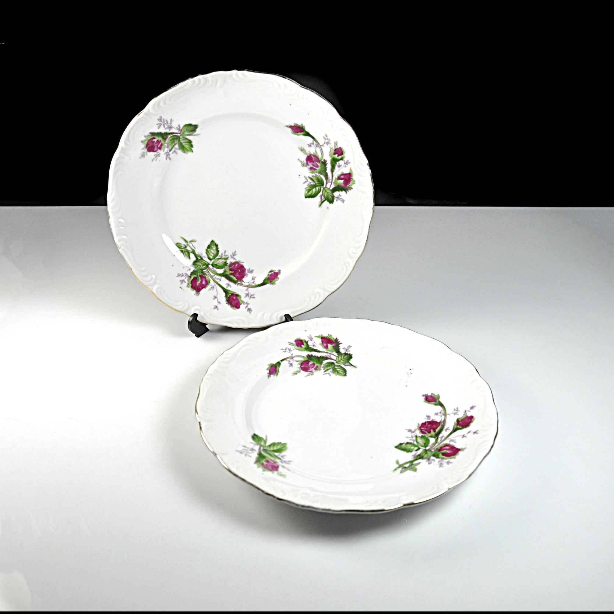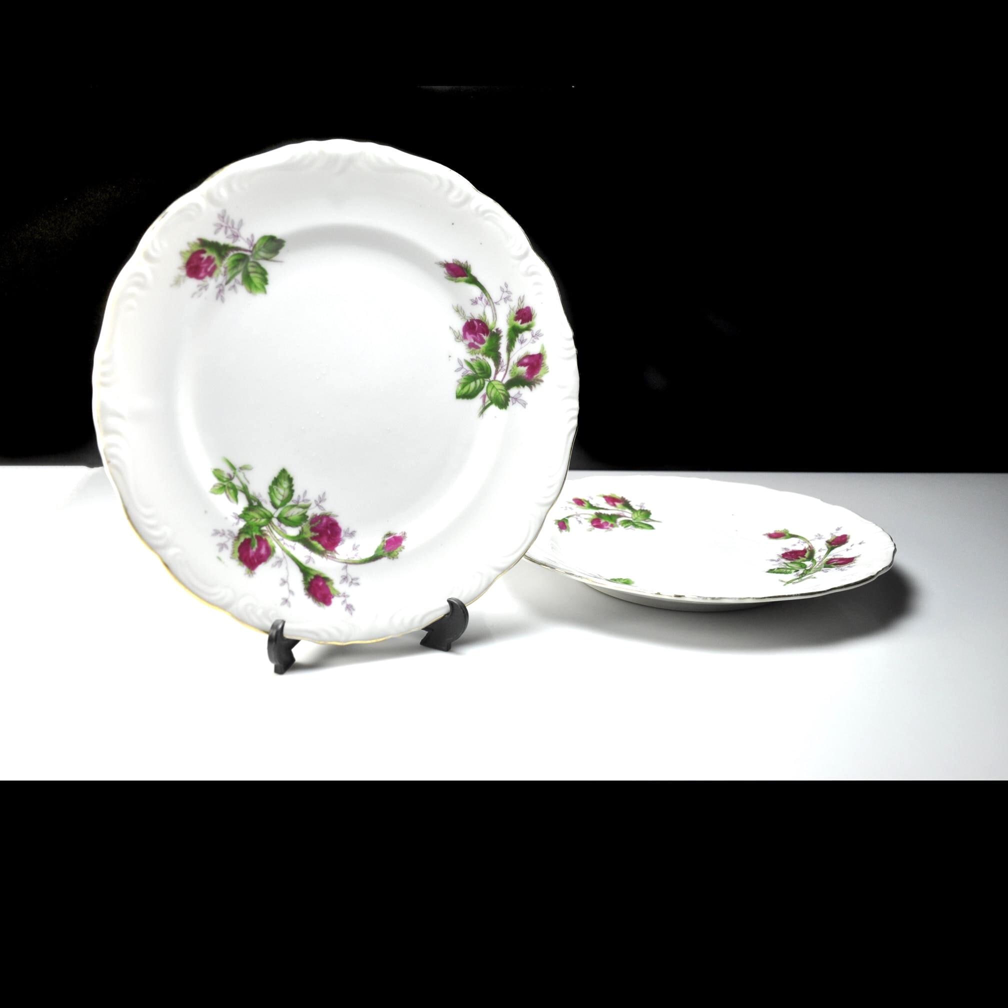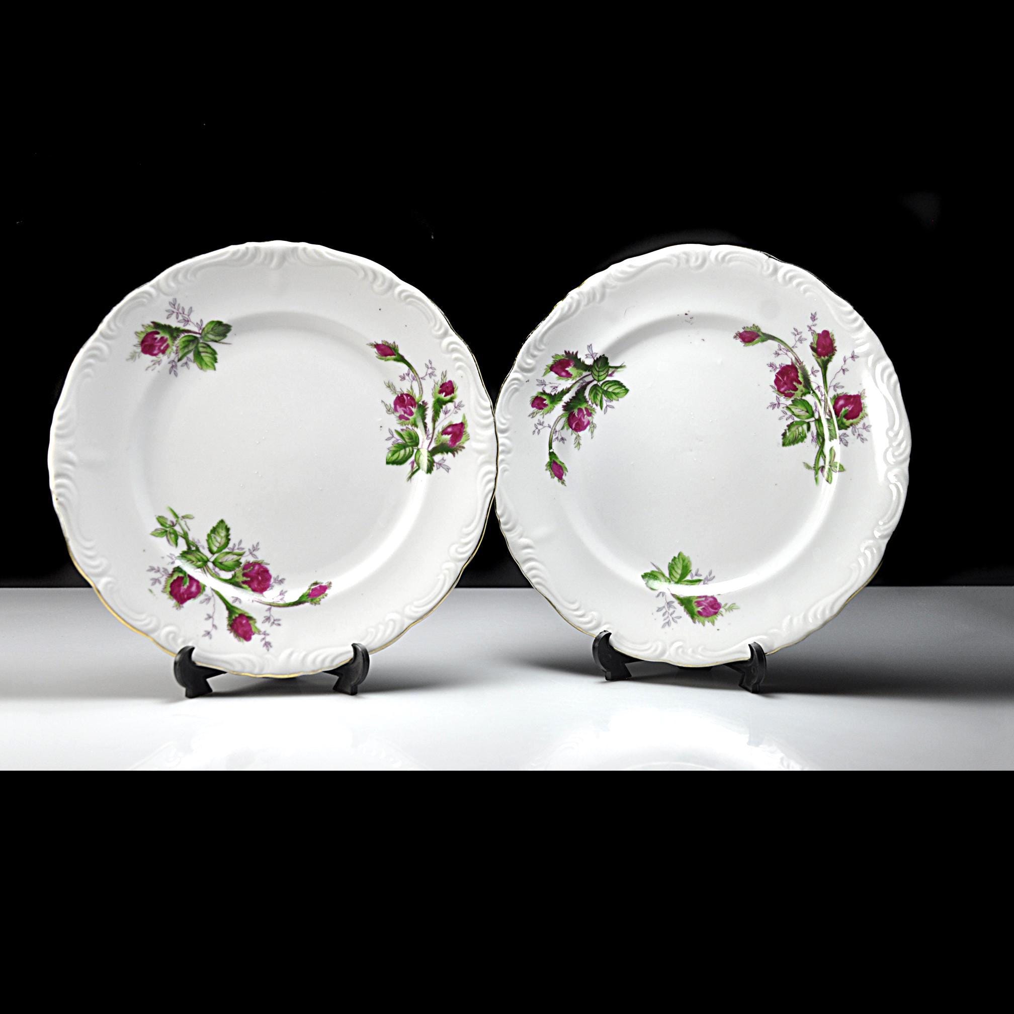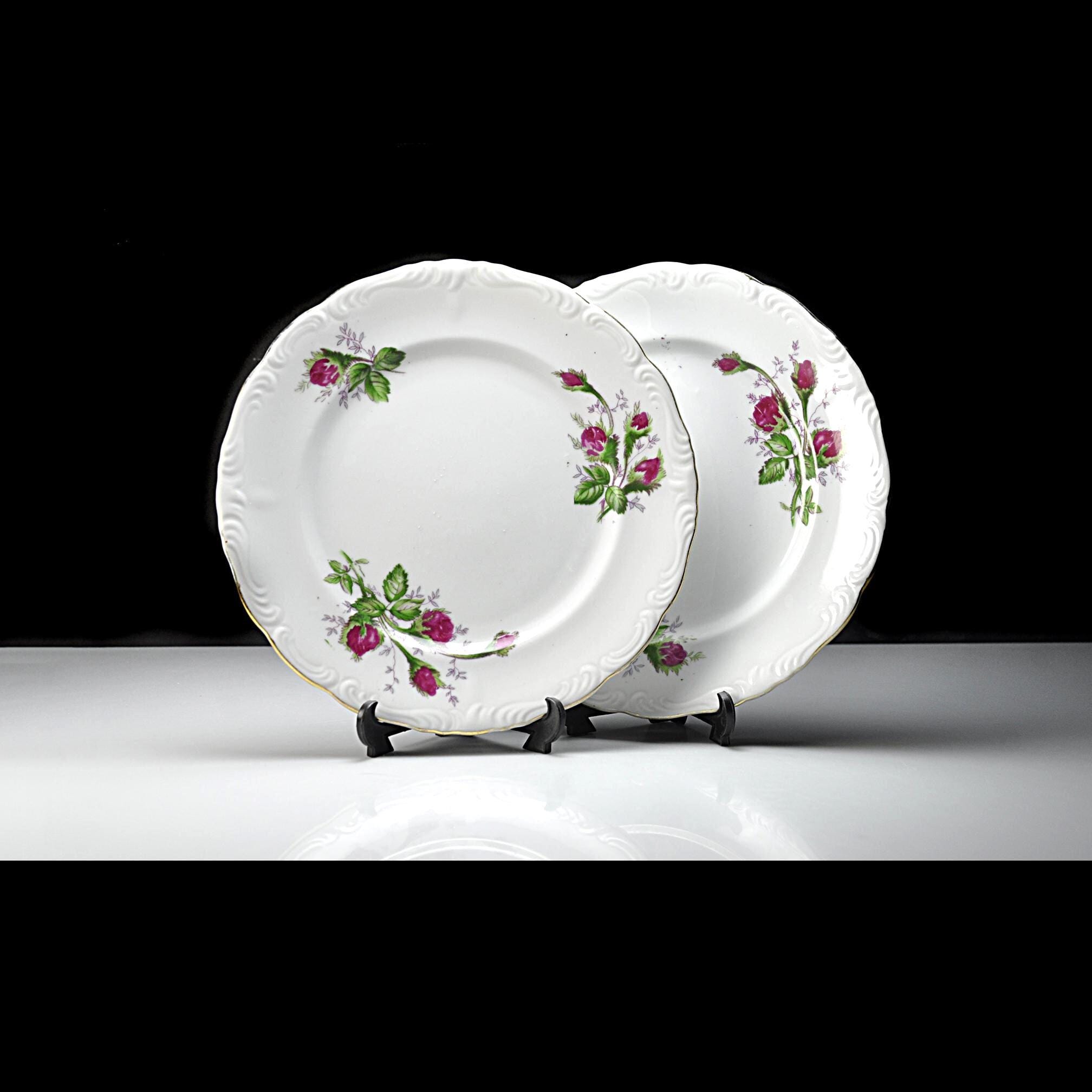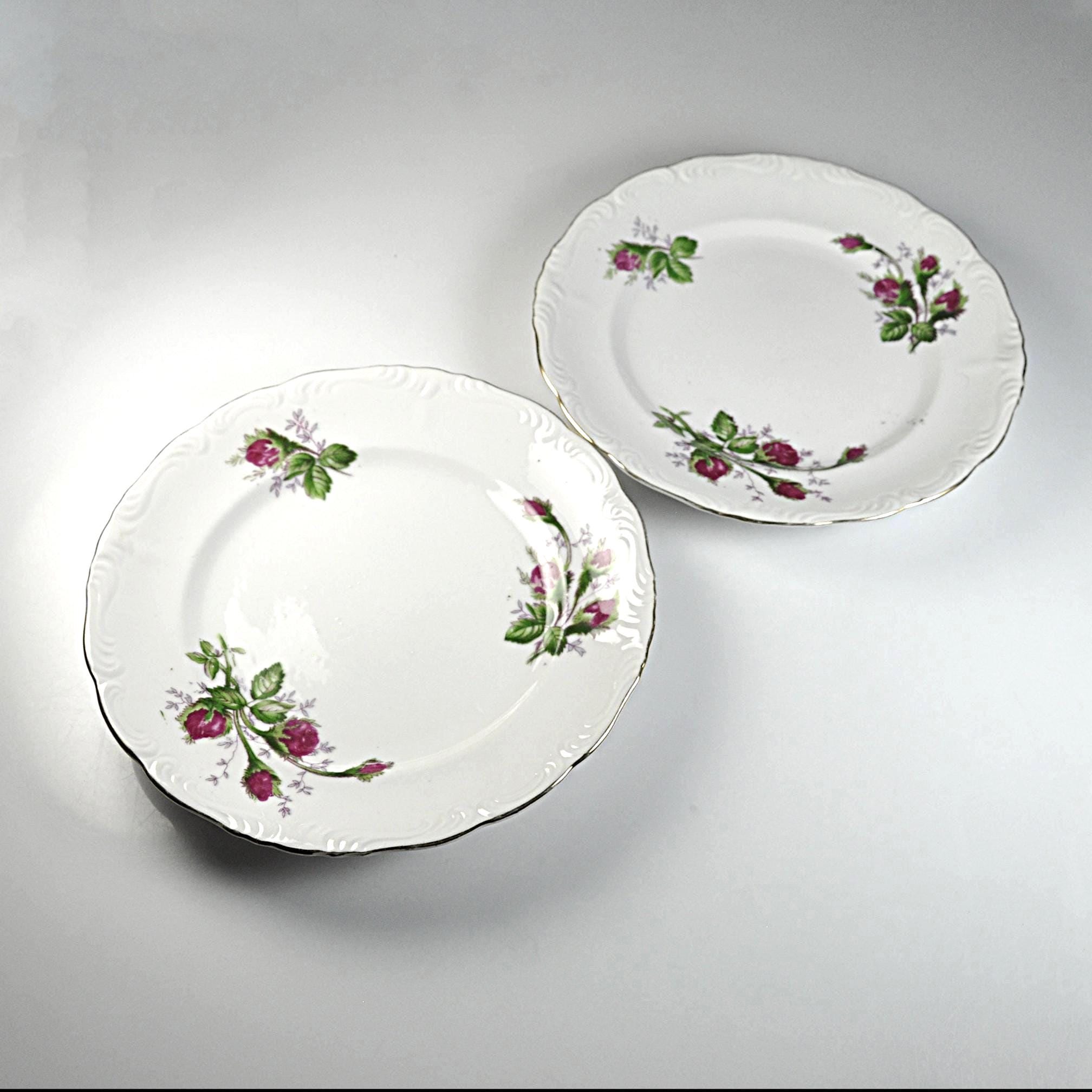 The Moss Rose design was produced by many different china companies throughout the mid-20th century. Because several makers used the same design, some pieces like these were sold without a manufacturer’s mark. These plates are perfect for replacing missing pieces in a Moss Rose set, can be used for desserts or salads, or simply adding a little vintage charm to your table.