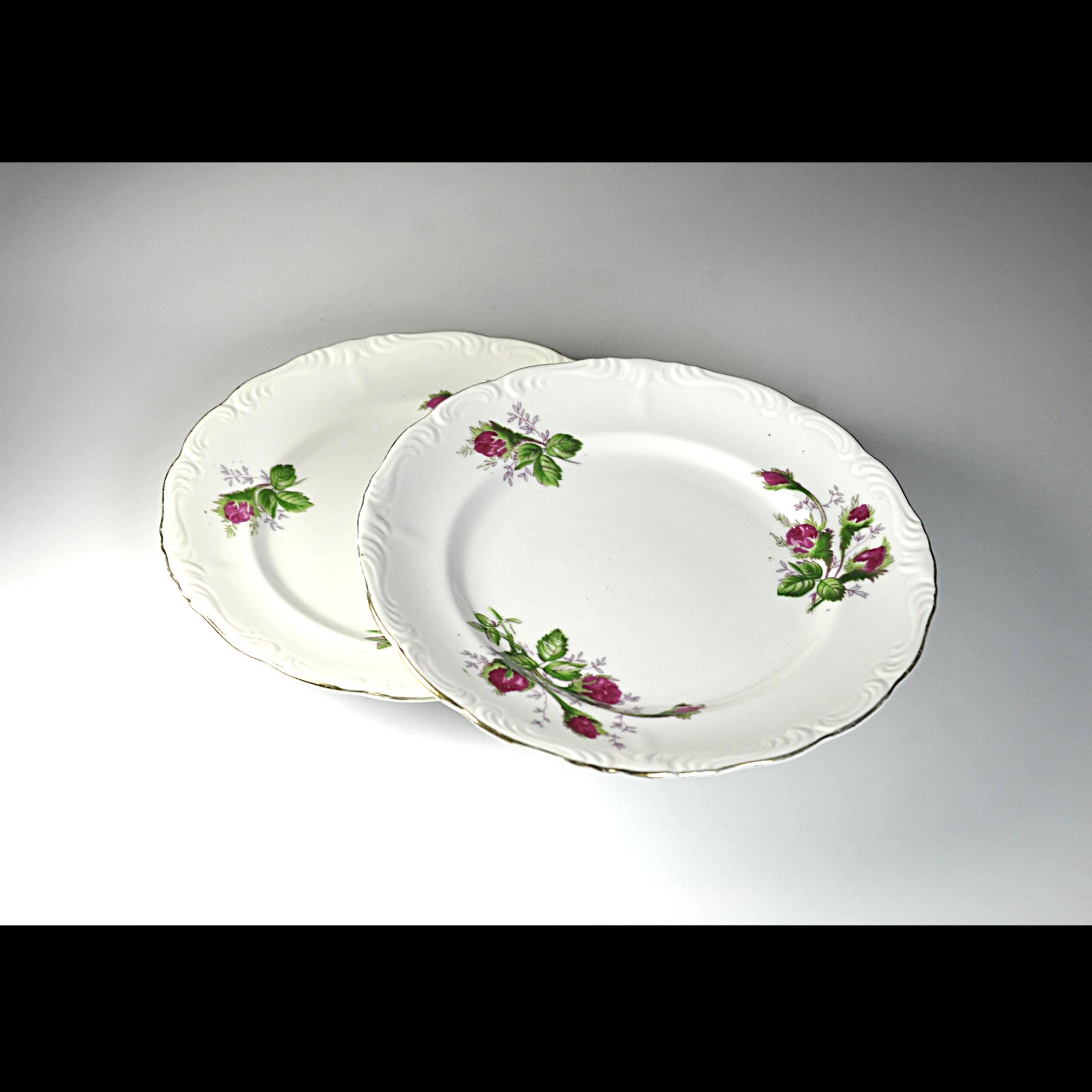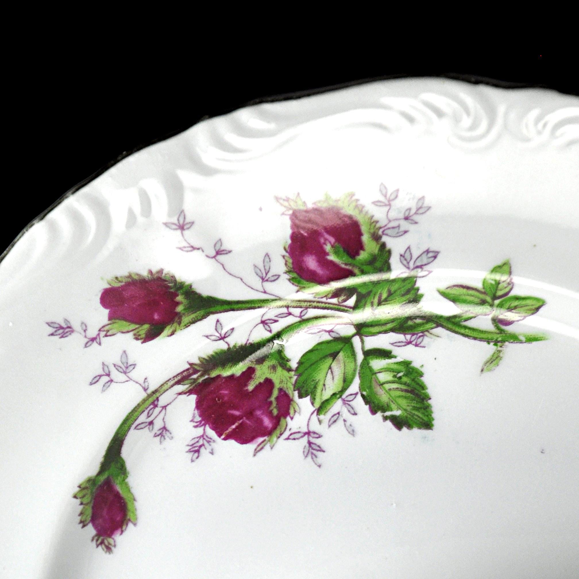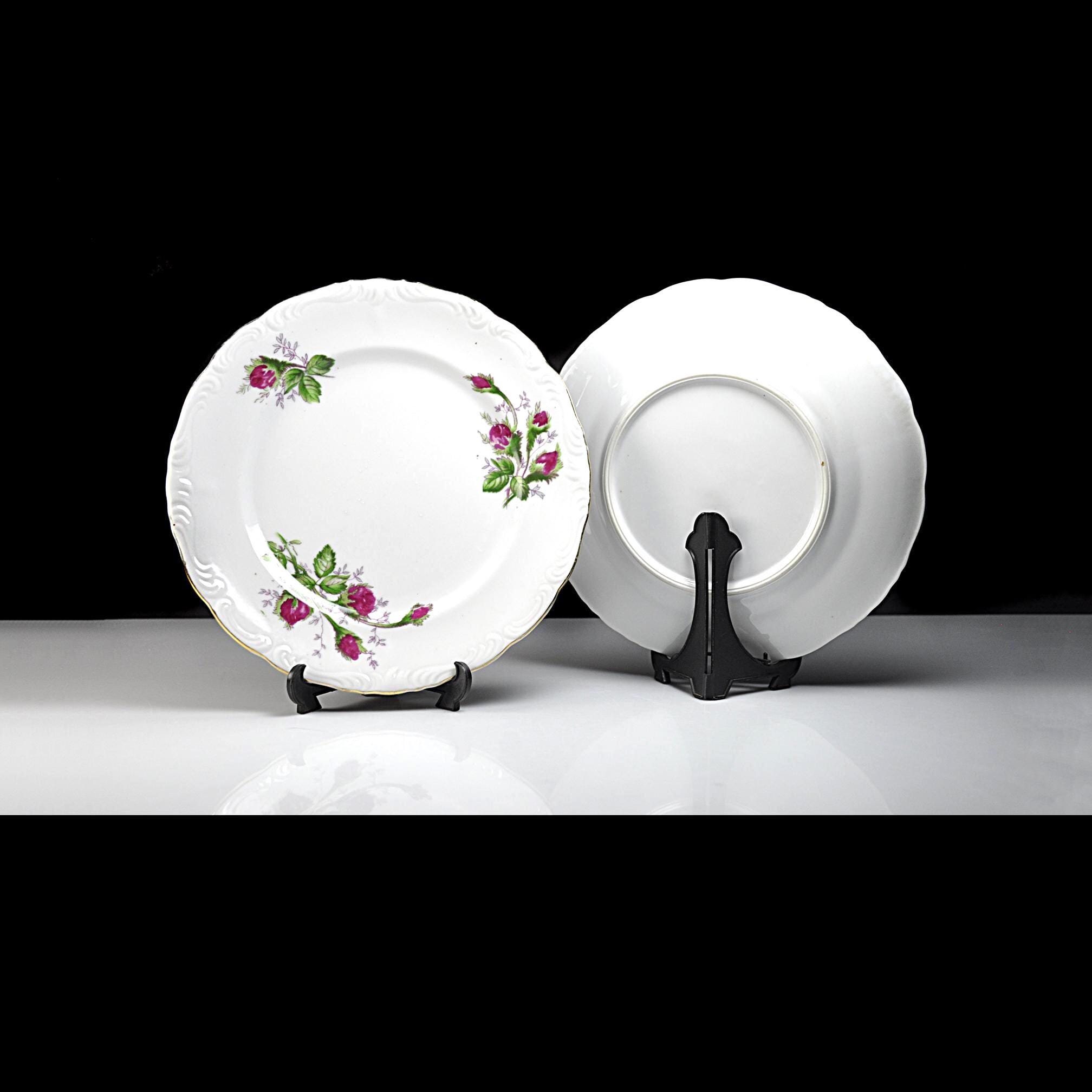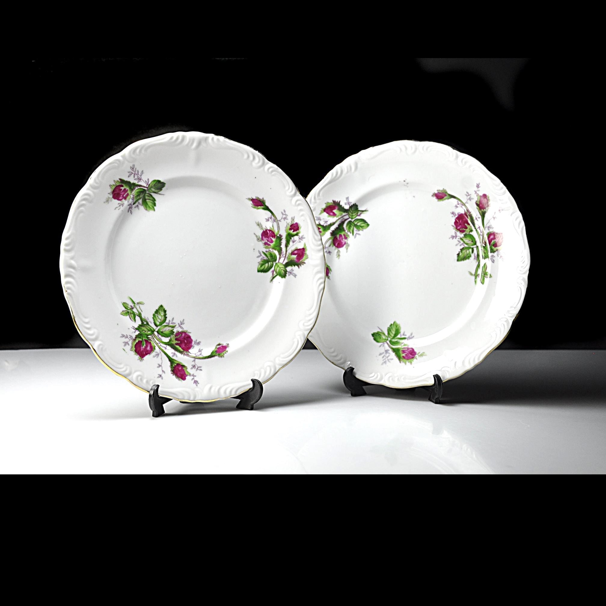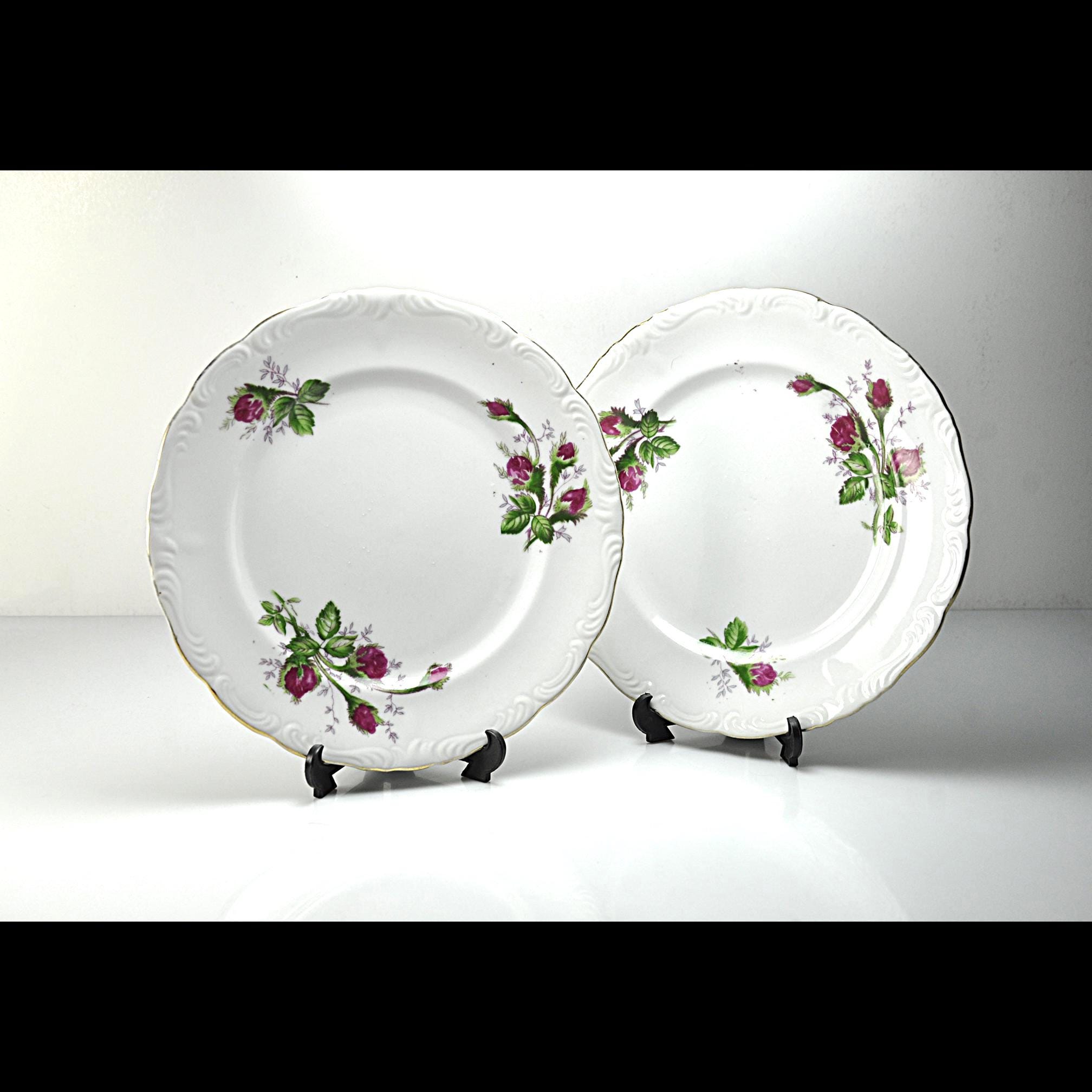 The Moss Rose design was produced by many different china companies throughout the mid-20th century. Because several makers used the same design, some pieces like these were sold without a manufacturer’s mark. These plates are perfect for replacing missing pieces in a Moss Rose set, can be used for desserts or salads, or simply adding a little vintage charm to your table.