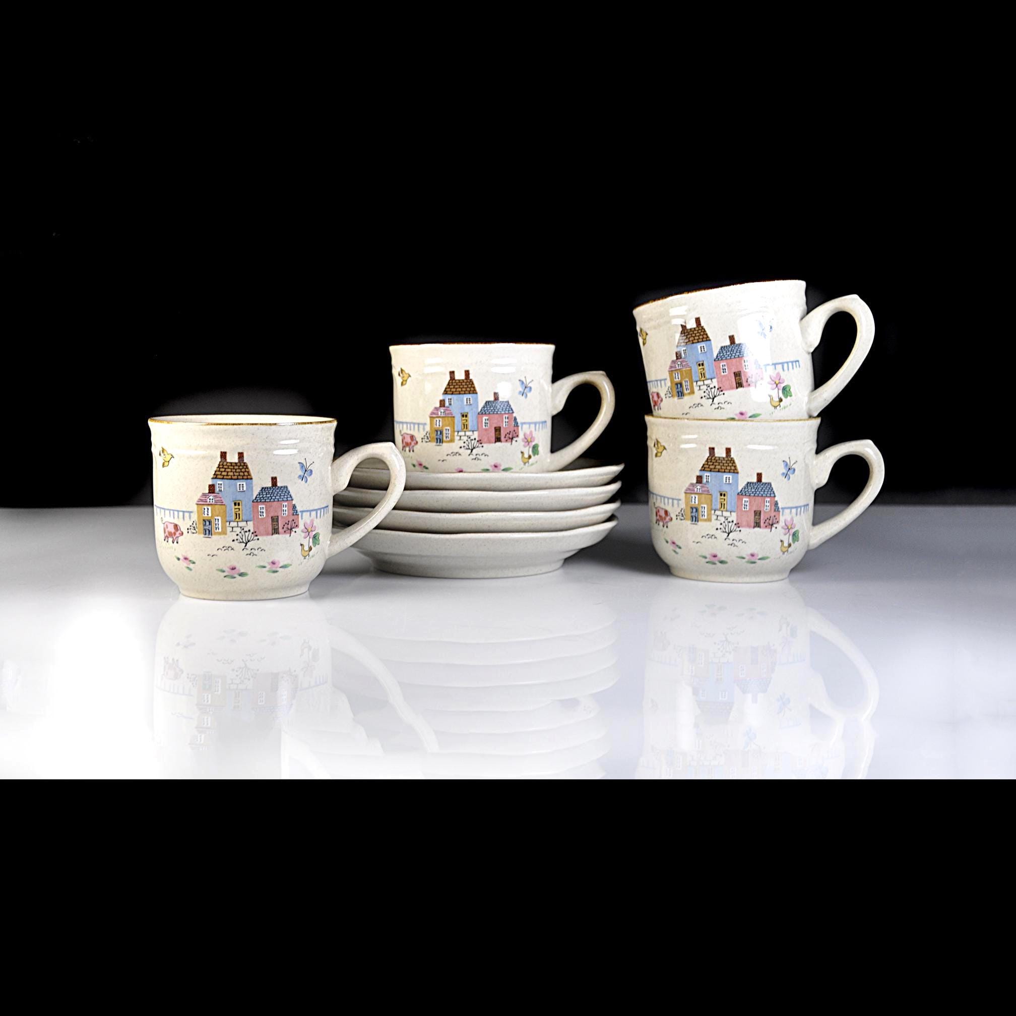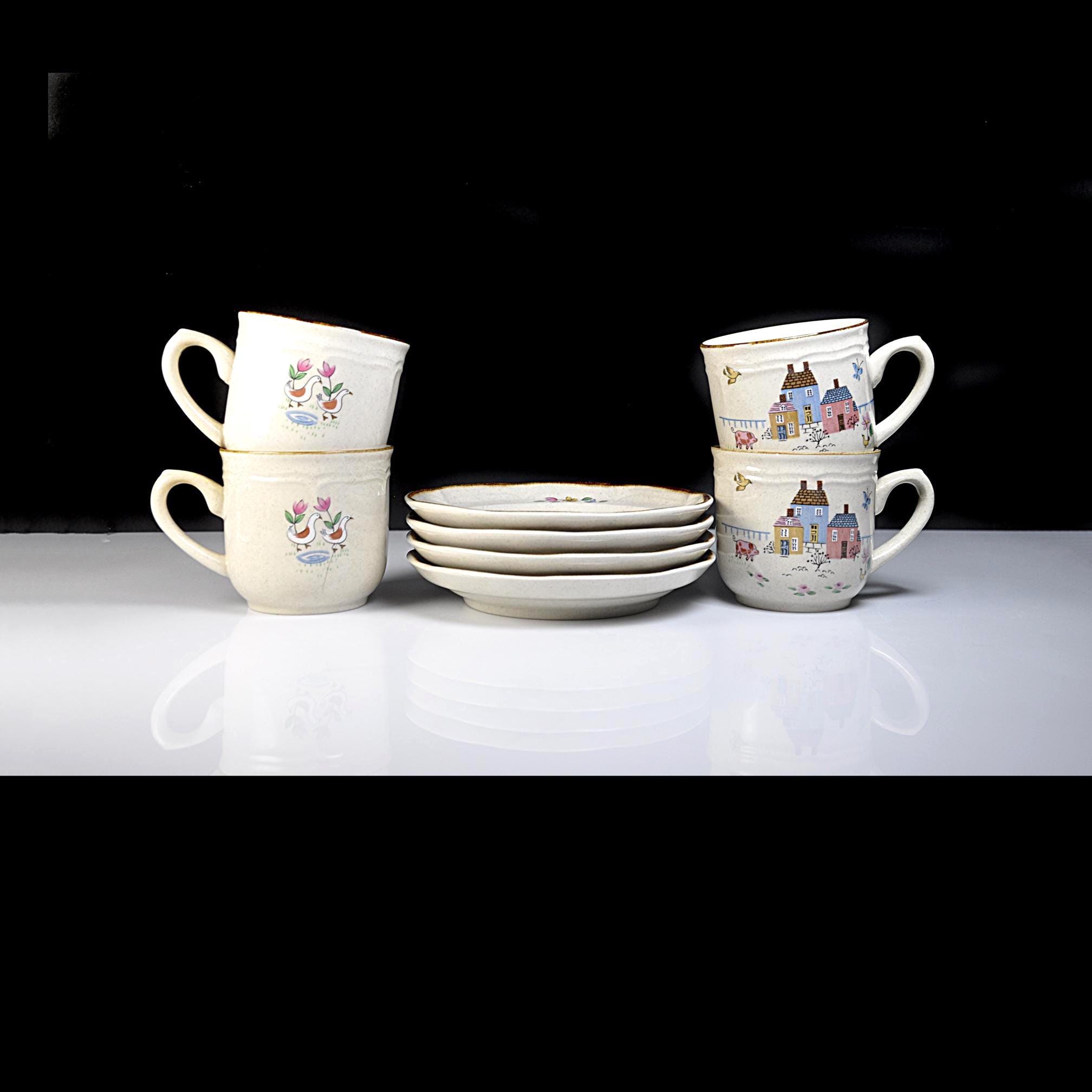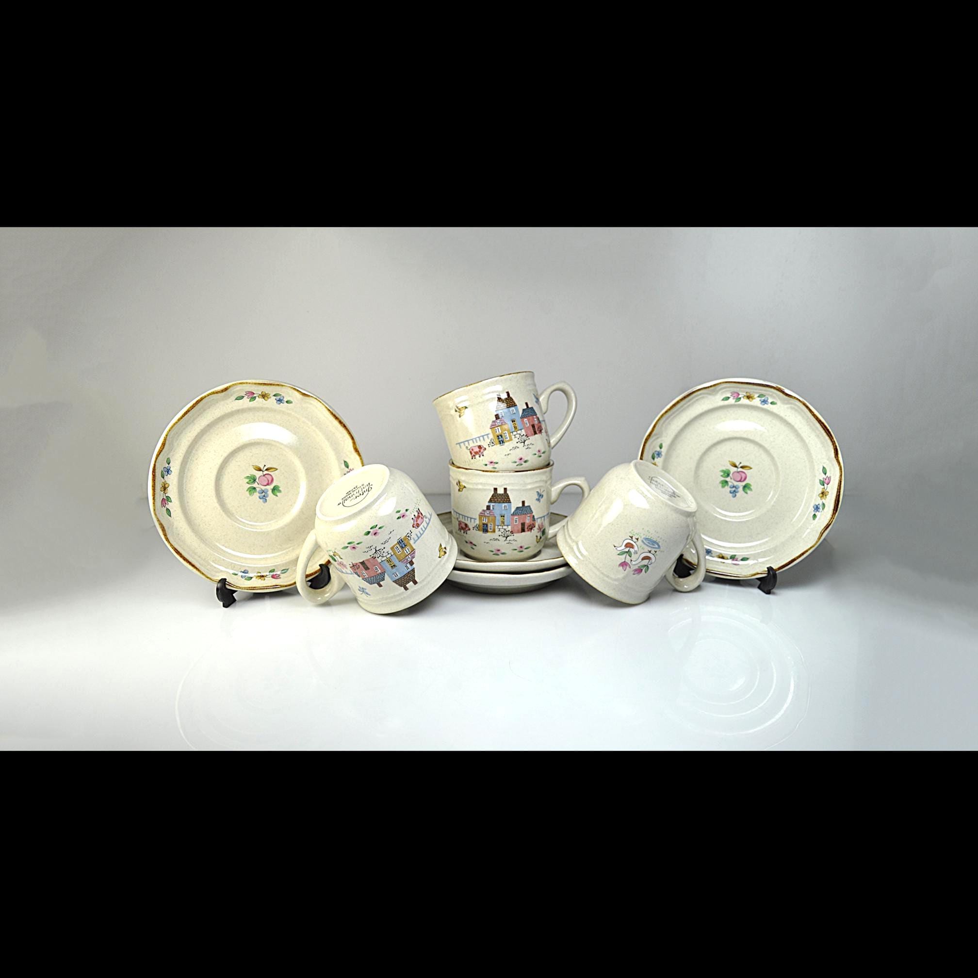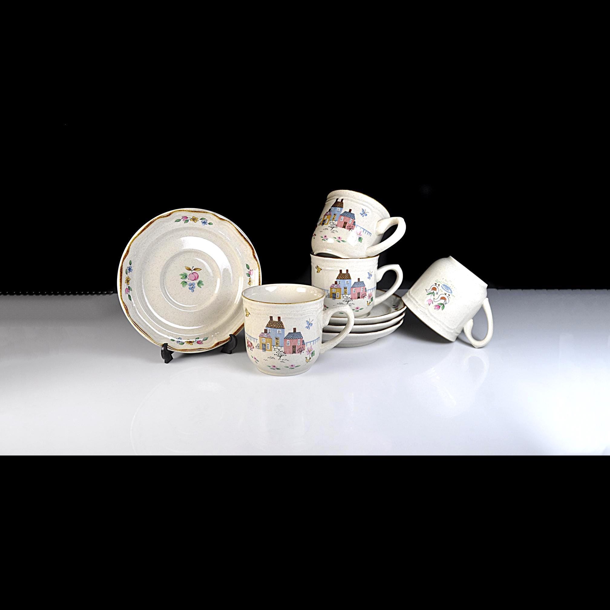 This set of four cup and saucer pairs are made by International Stoneware of Japan in the Heartland pattern — and they look like they’ve barely been used. The brown painted trim is clean and sharp, the speckled glaze is bright, and the cottage scenes are crisp and cheerful. Each cup features a sweet little village — pastel houses, flowers, birds — that classic country kitchen look that never really went out of style. Not flashy. Not fussy. Just warm and inviting. These aren’t delicate teacups. These are solid, everyday 8-ounce coffee cups — the kind you reach for in the morning.