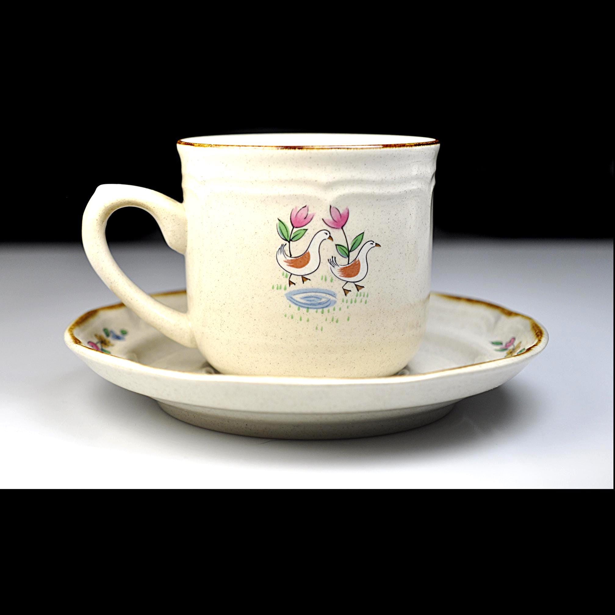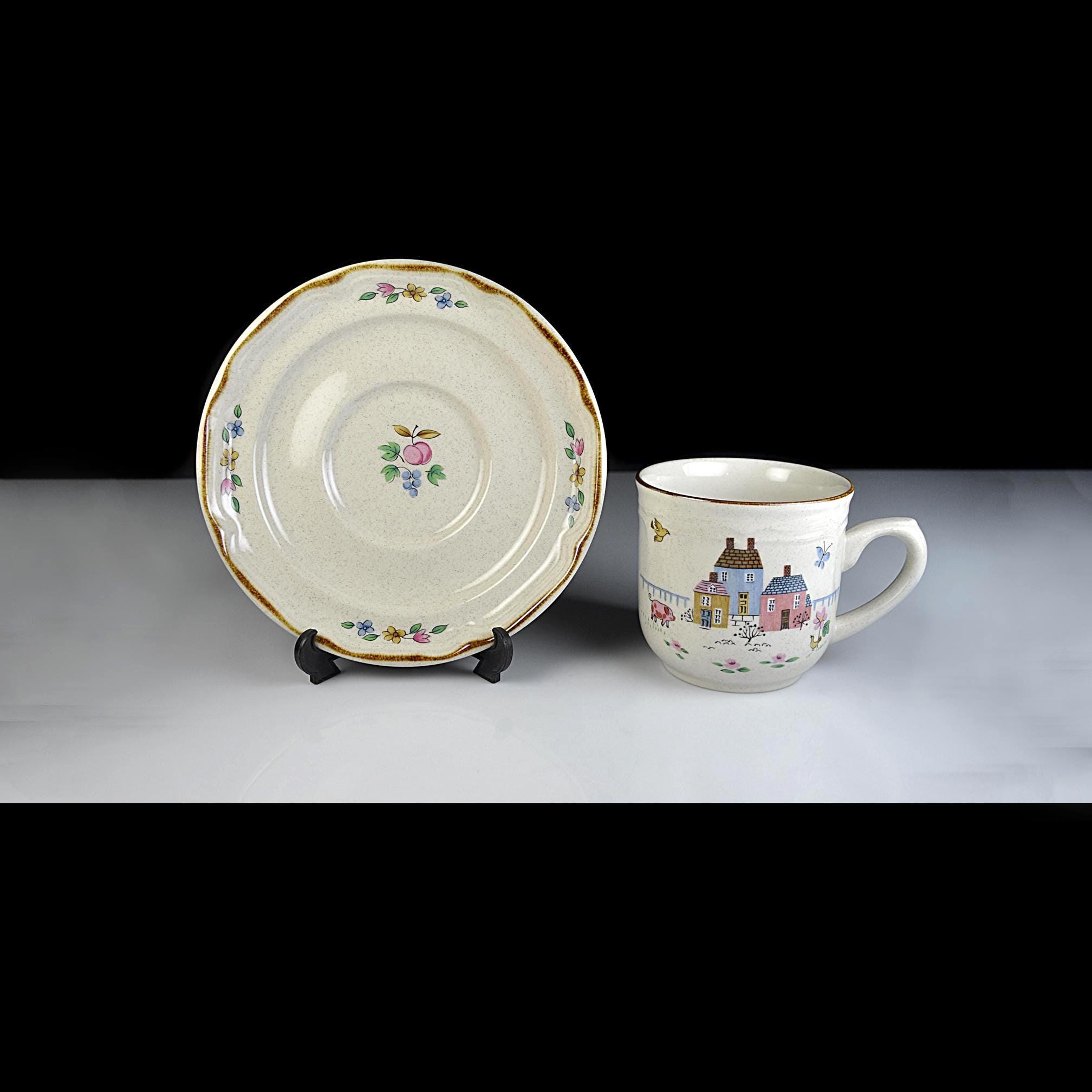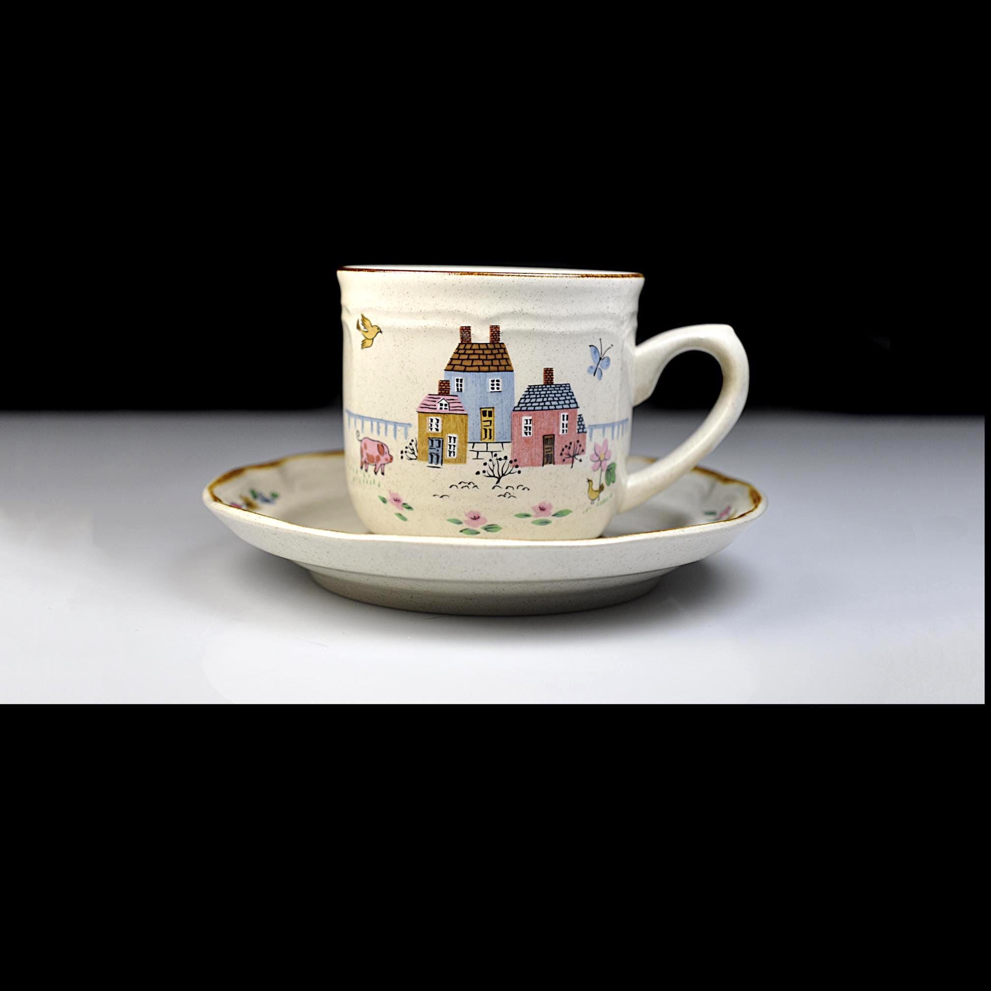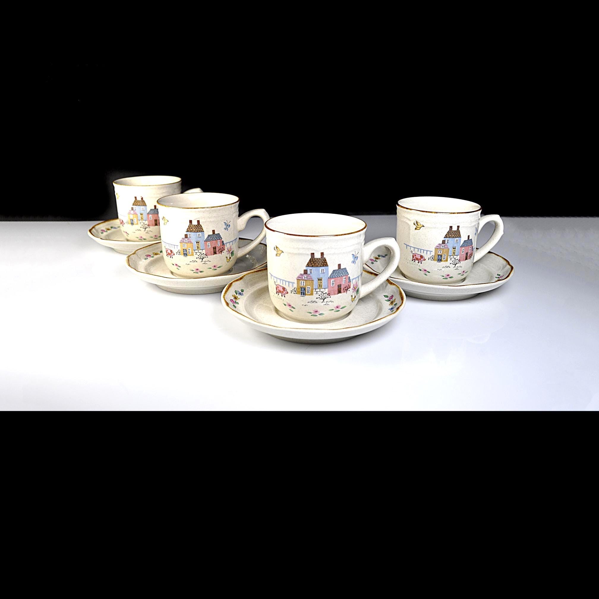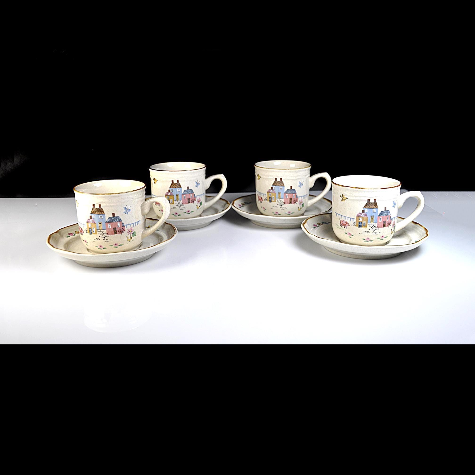 This set of four cup and saucer pairs are made by International Stoneware of Japan in the Heartland pattern — and they look like they’ve barely been used. The brown painted trim is clean and sharp, the speckled glaze is bright, and the cottage scenes are crisp and cheerful. Each cup features a sweet little village — pastel houses, flowers, birds — that classic country kitchen look that never really went out of style. Not flashy. Not fussy. Just warm and inviting. These aren’t delicate teacups. These are solid, everyday 8-ounce coffee cups — the kind you reach for in the morning.